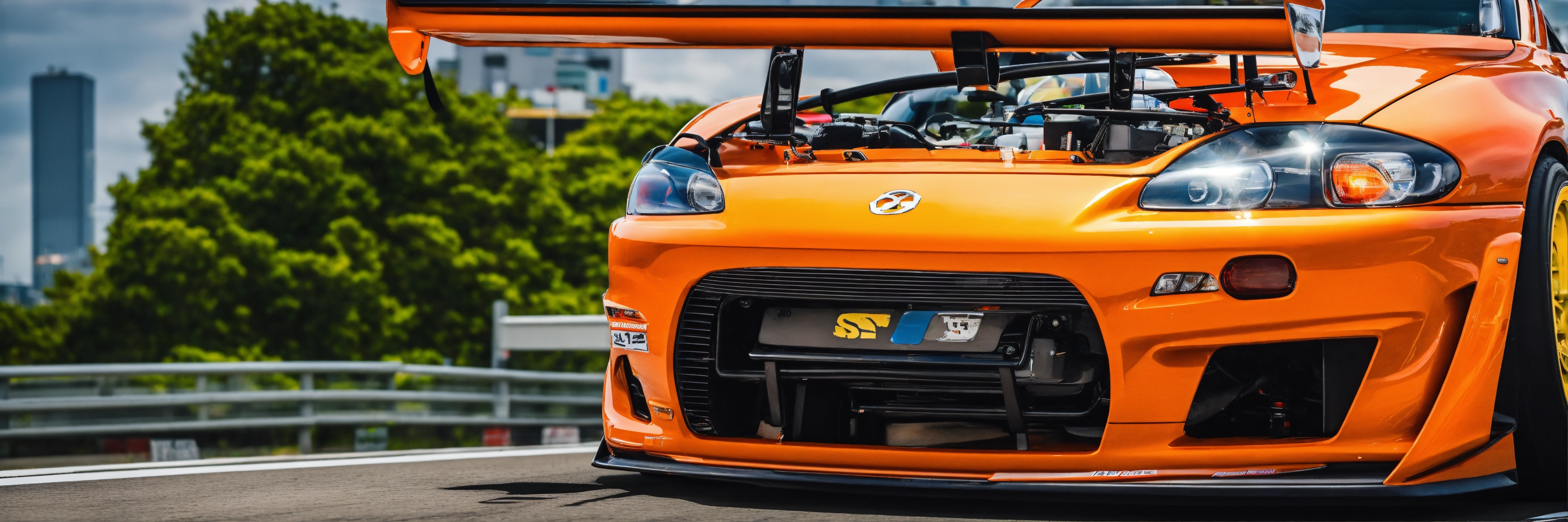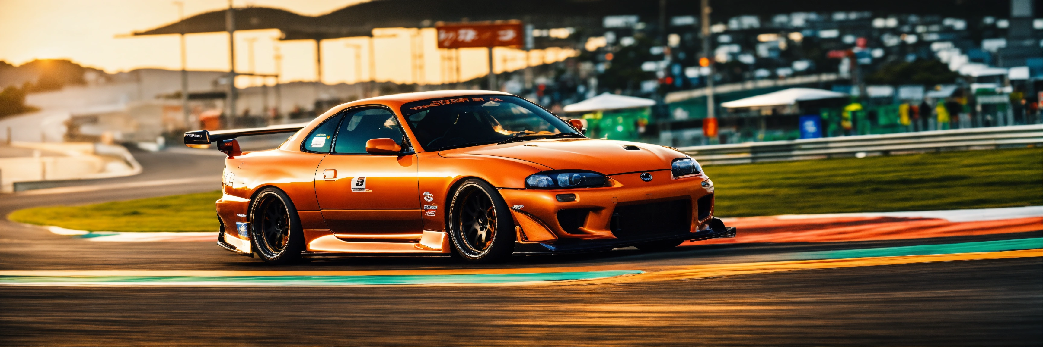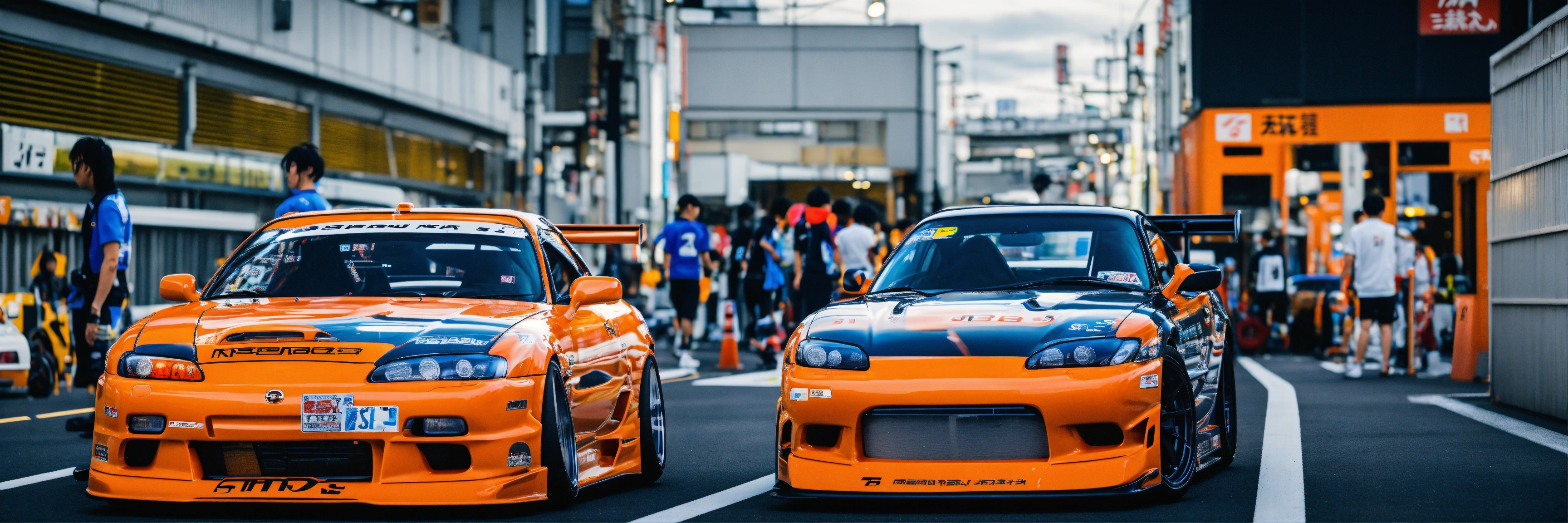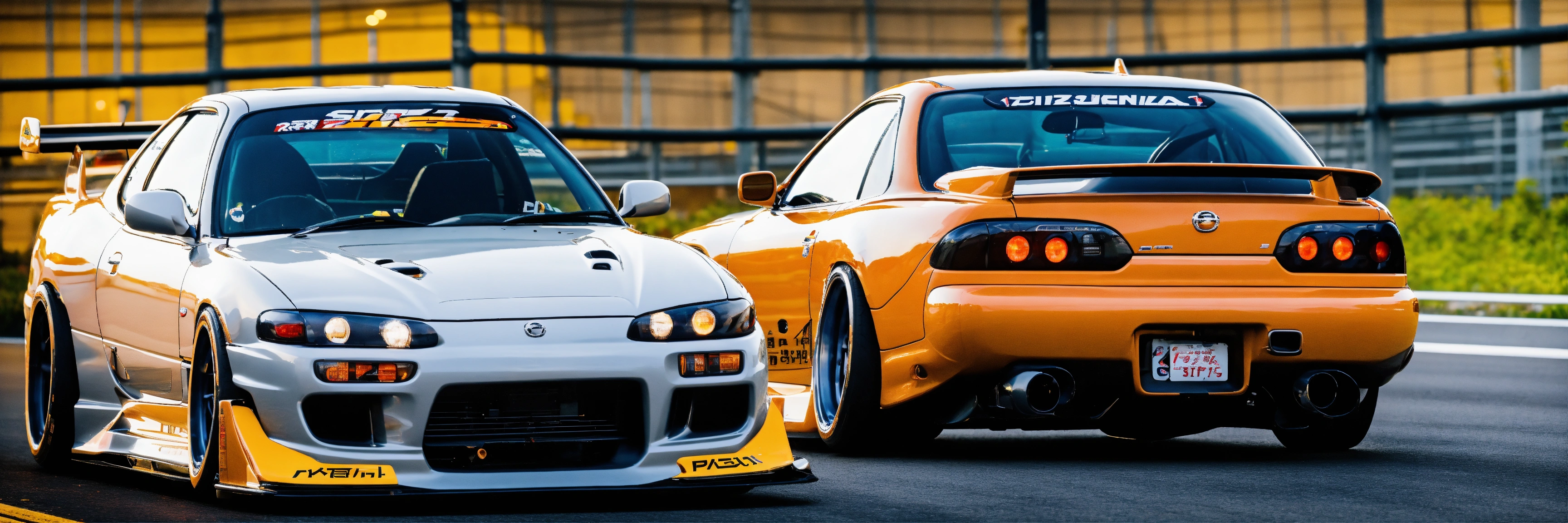 A colorful orange nissan silvia s15 with a wide-body kit racing a white mazda rx7 in tokyo highway