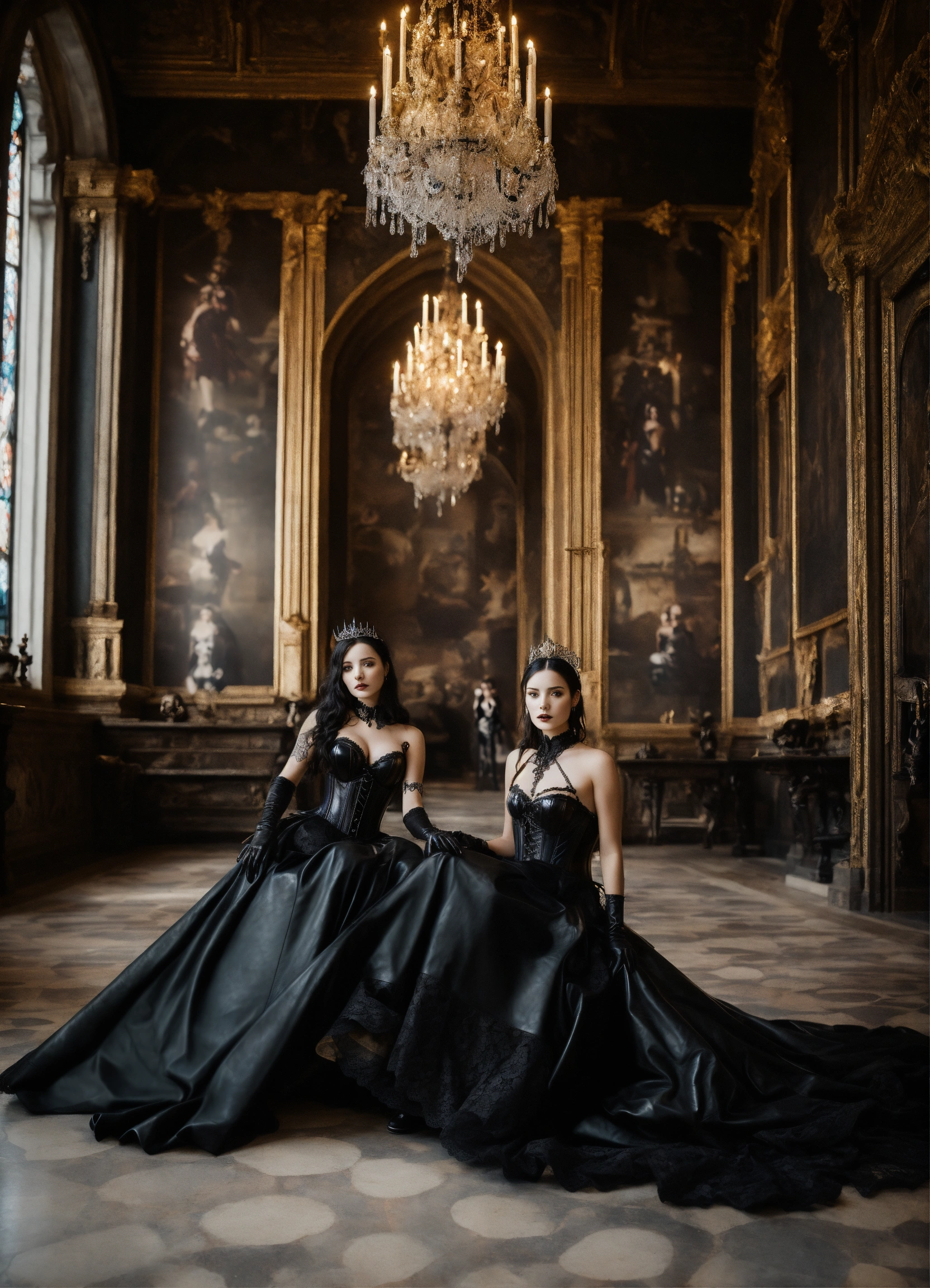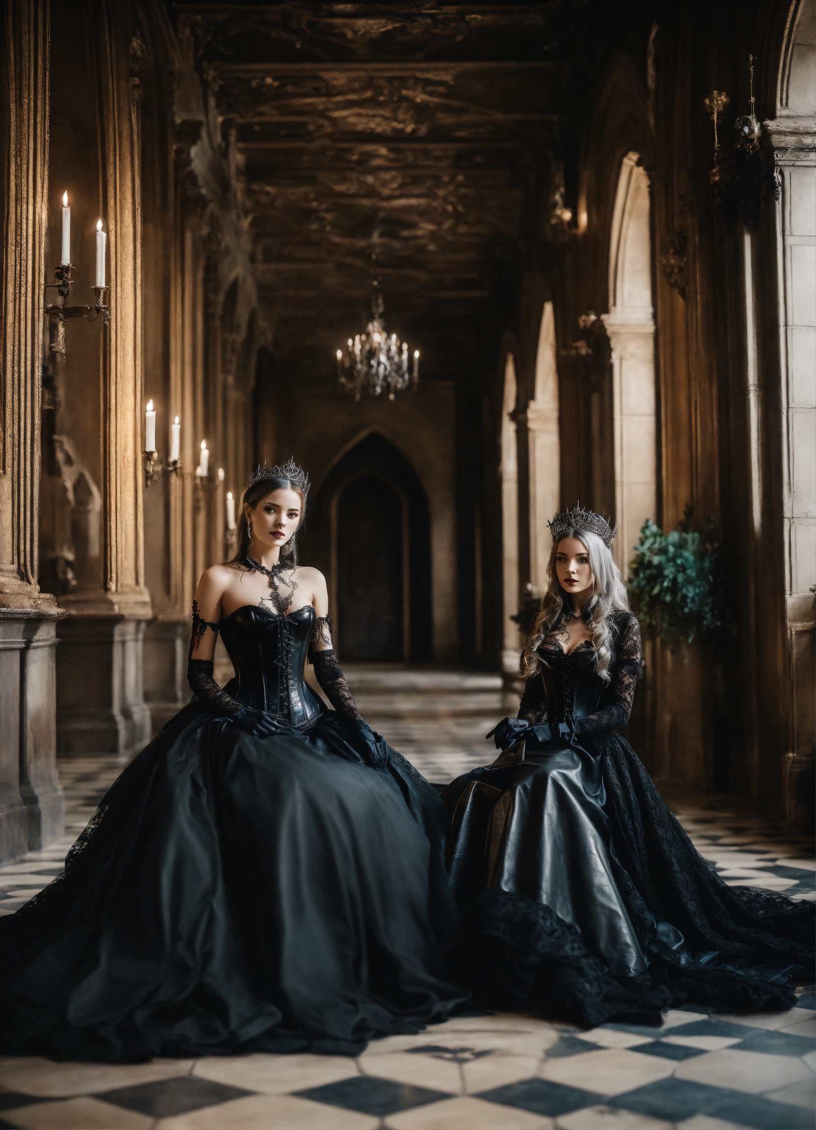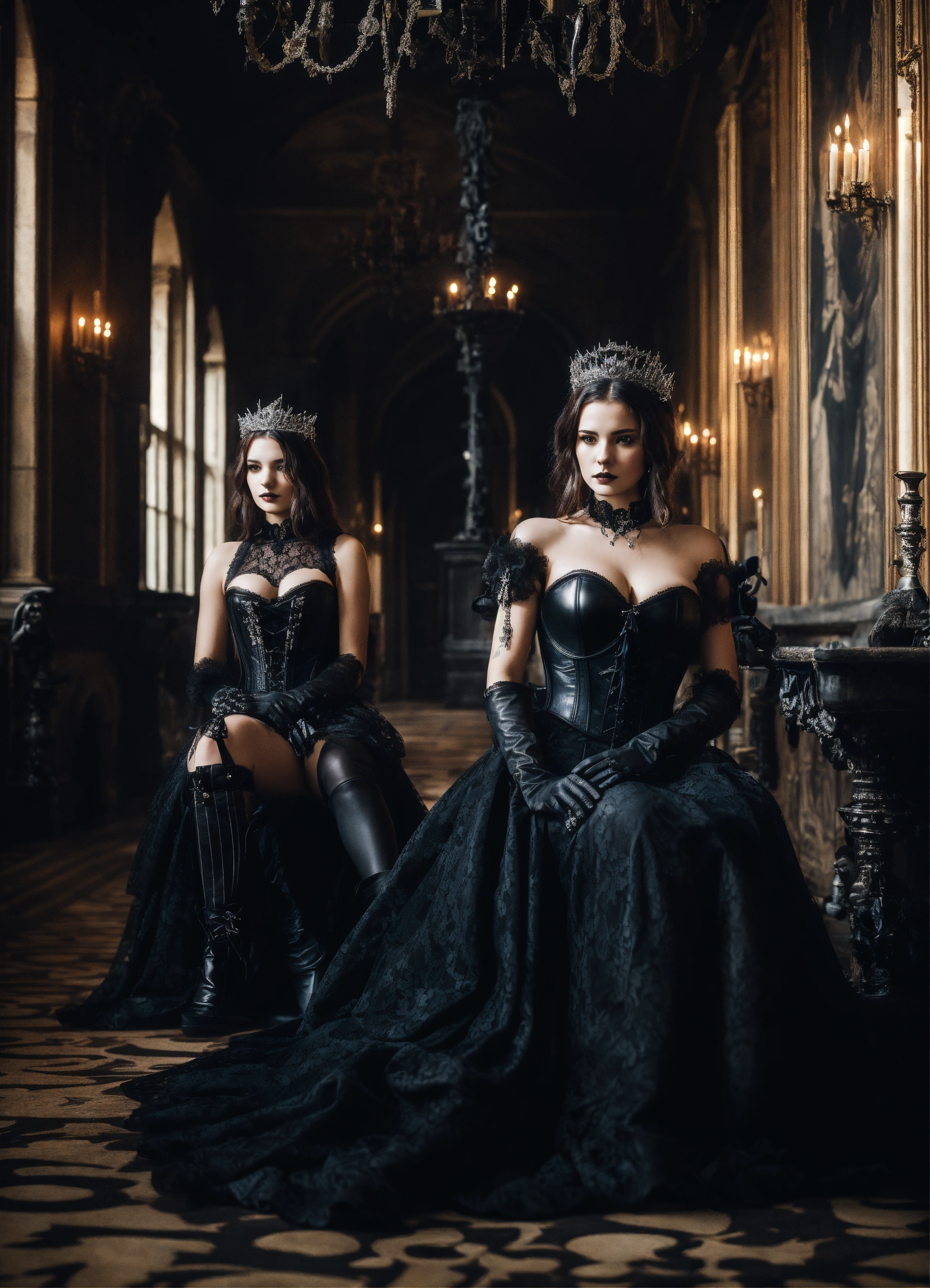 Two stunning young gothic women sitting on thrones in a castle hallway wearing a black leather corset and black lace dresses black leather gloves silver tiaras, hyper-realistic, photographic portrait floor strewn with skulls and bones