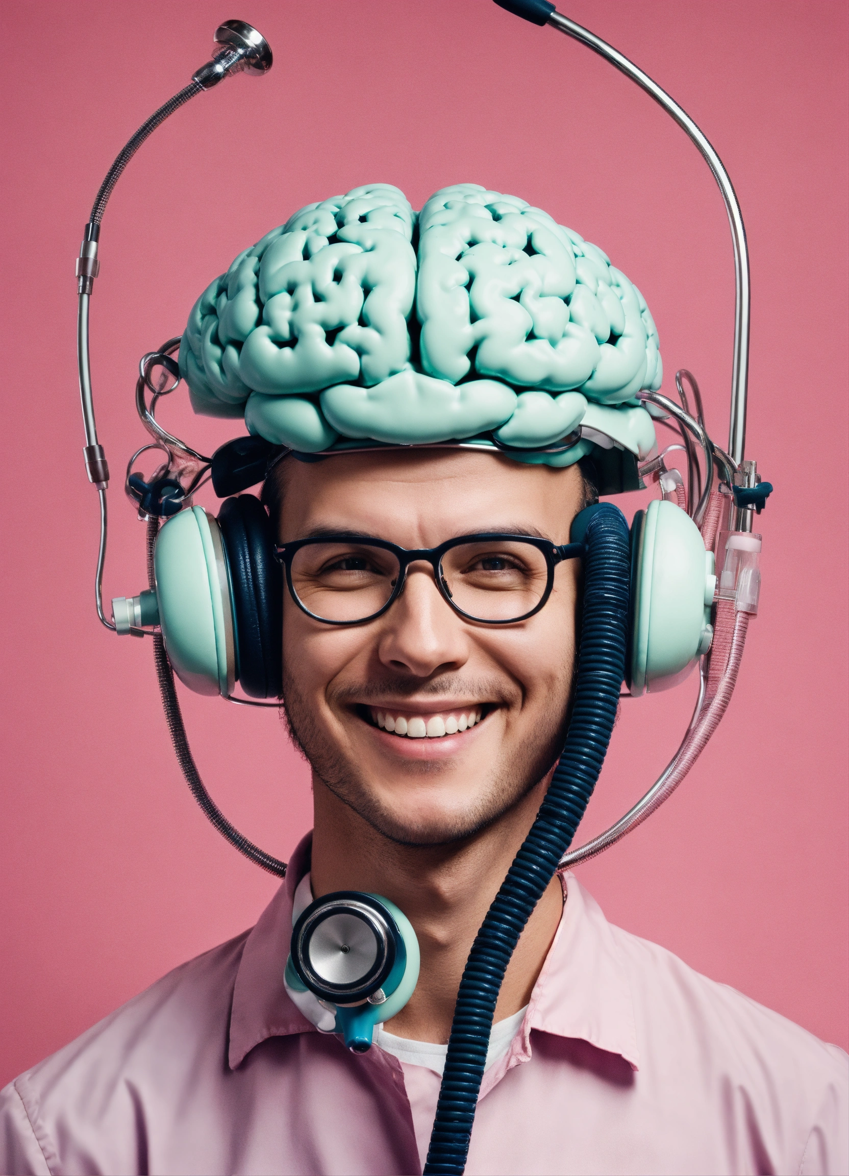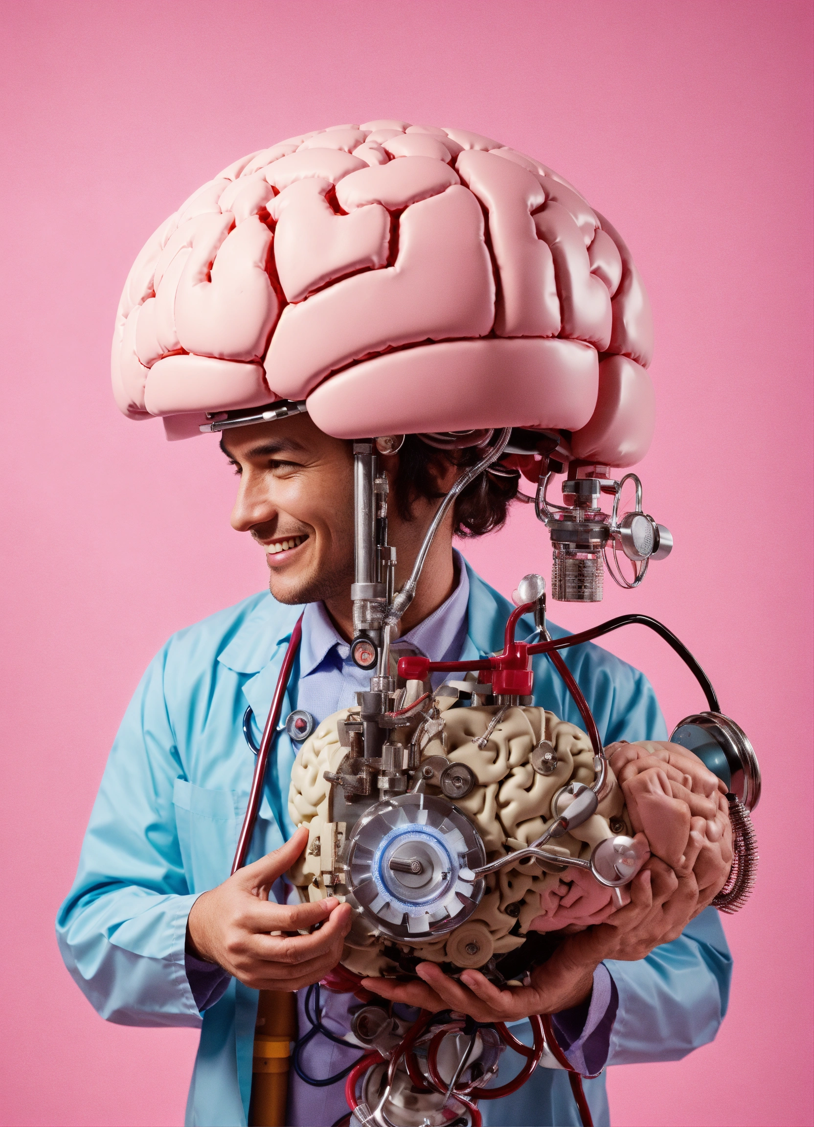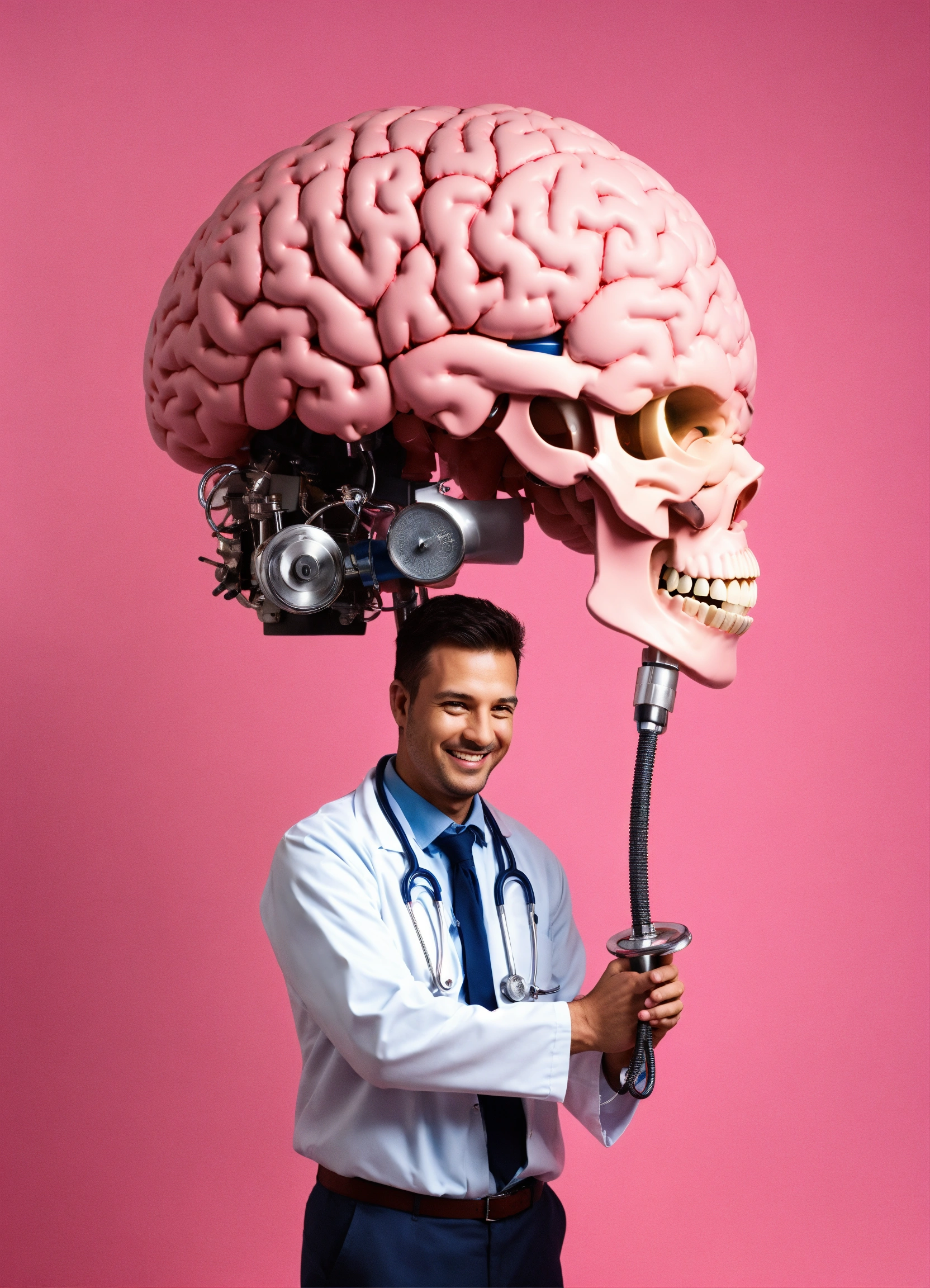 A smiling doctor use his stethoscope on a huge mechanical brain