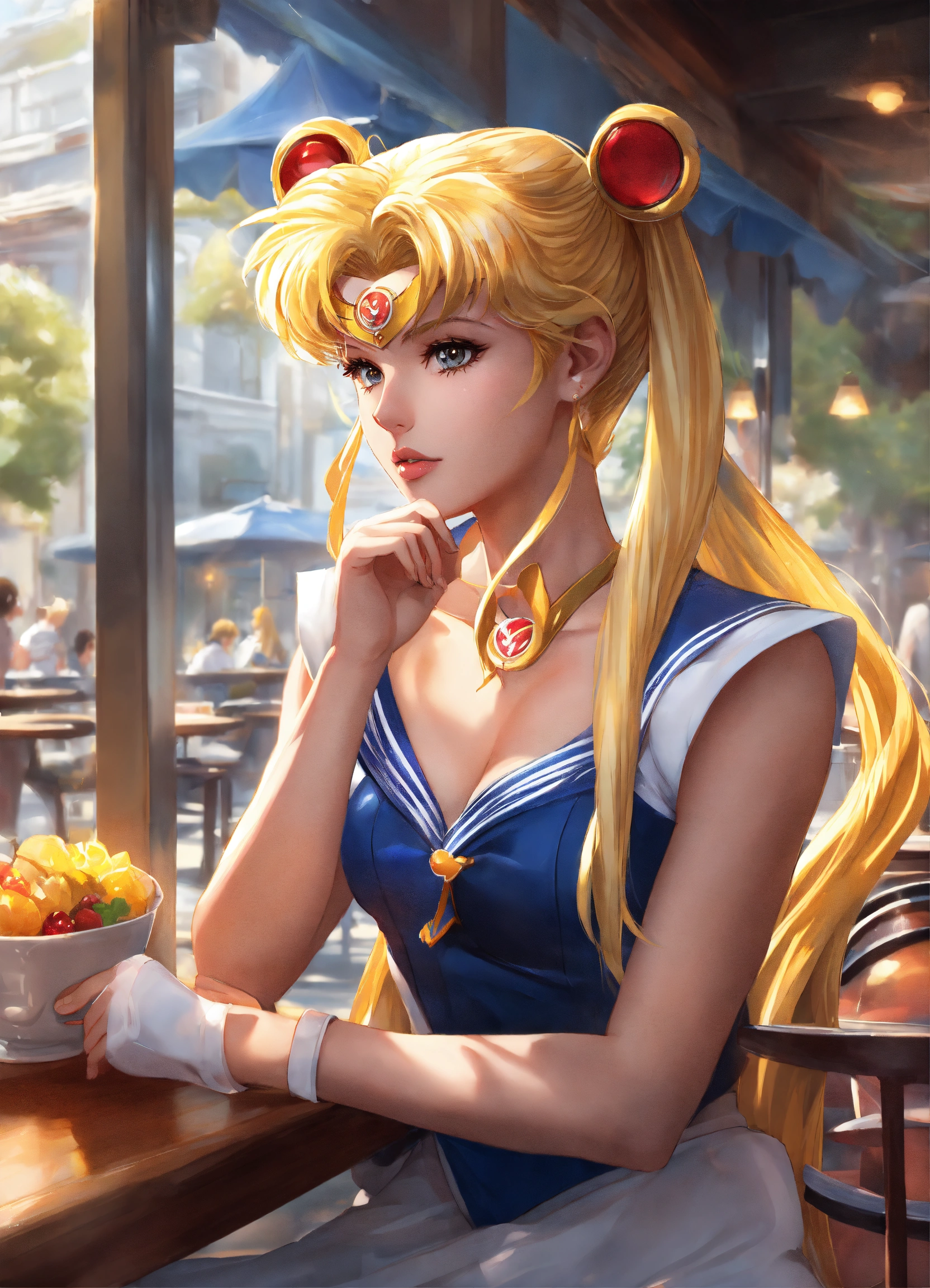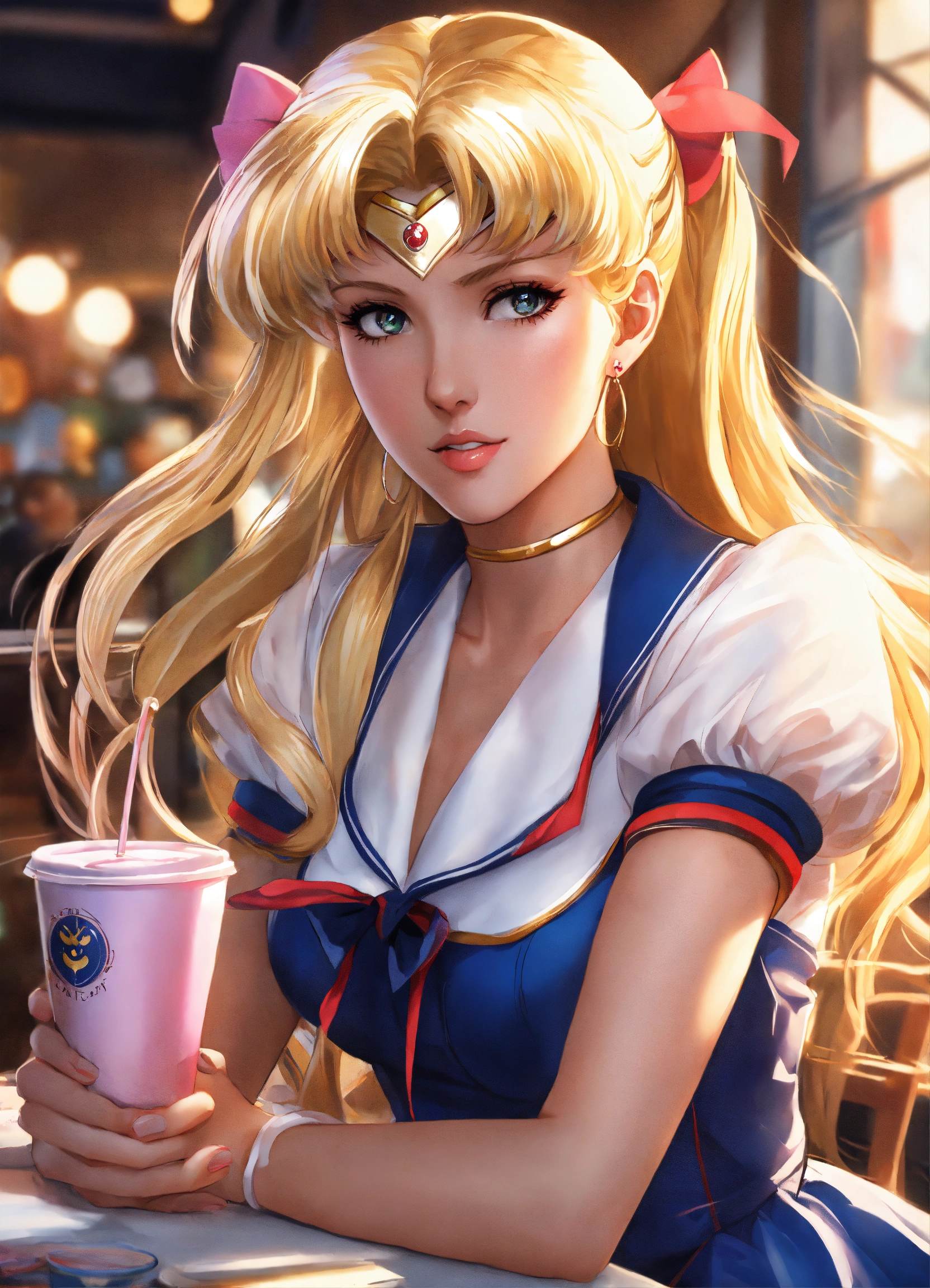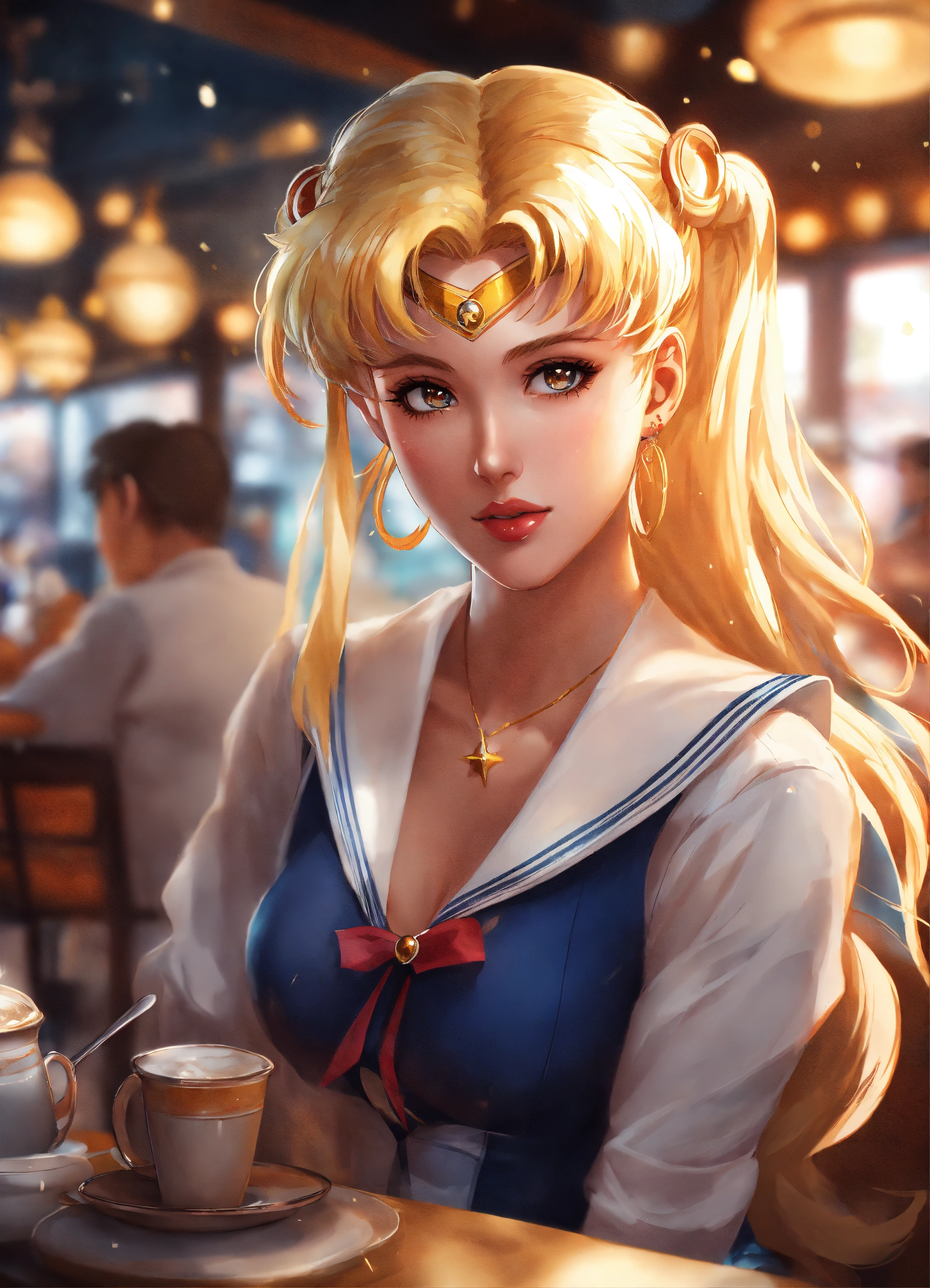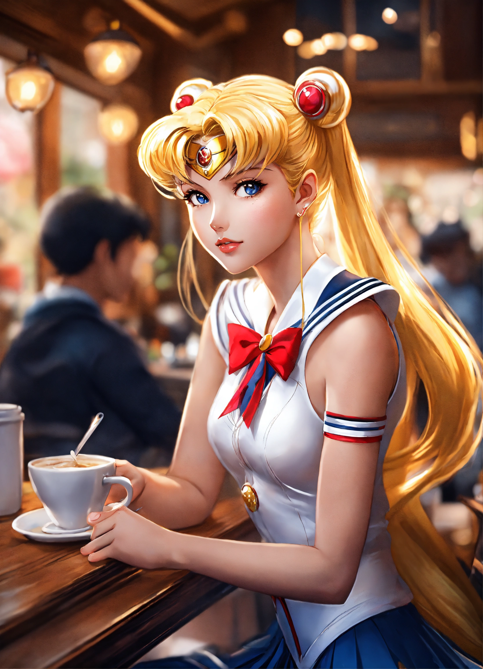 Sailor moon with blond hair at the cafe, stunning anime art by artgerm, 8k, detailed, sharp lines, intricate details, action mode