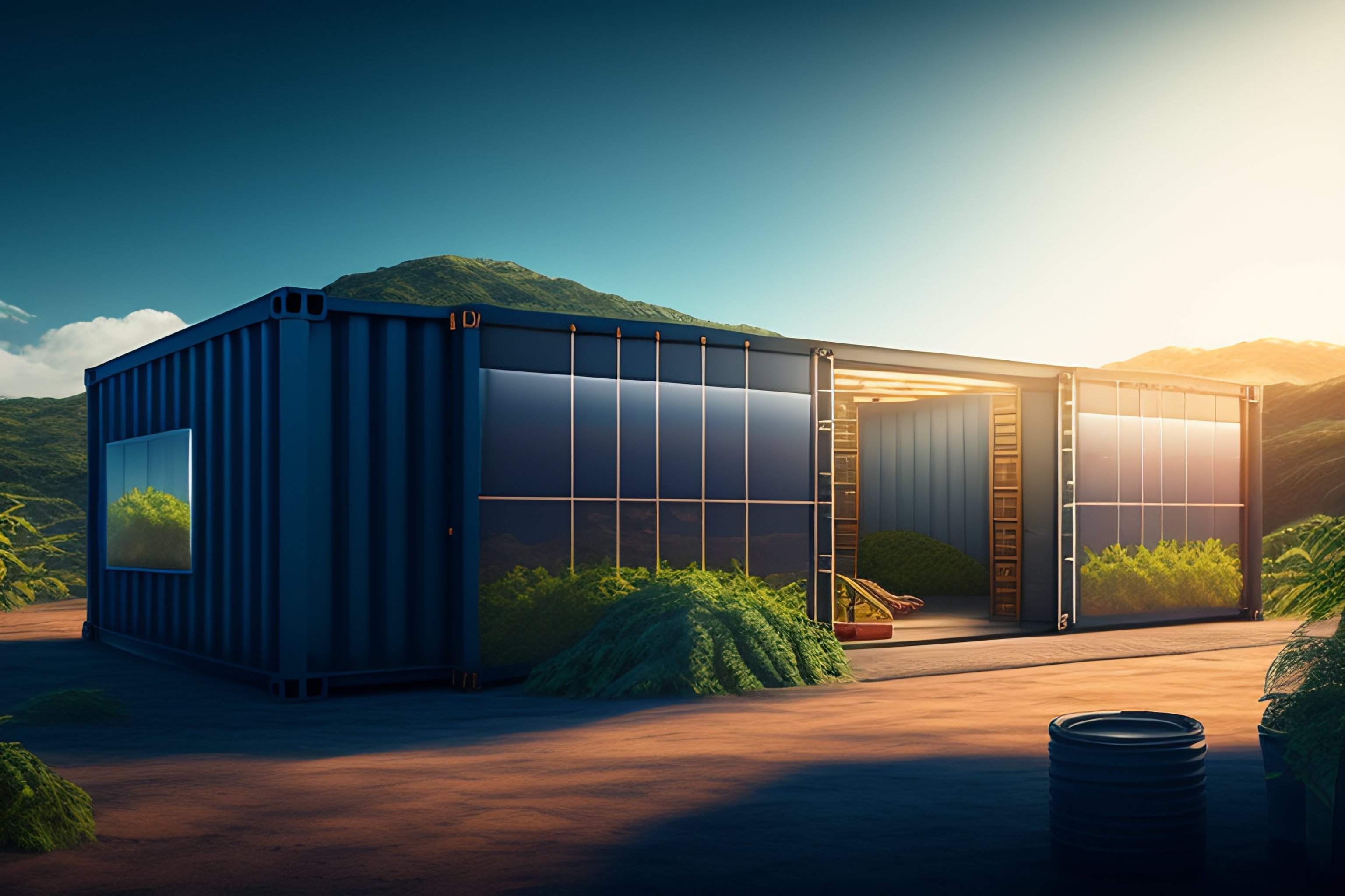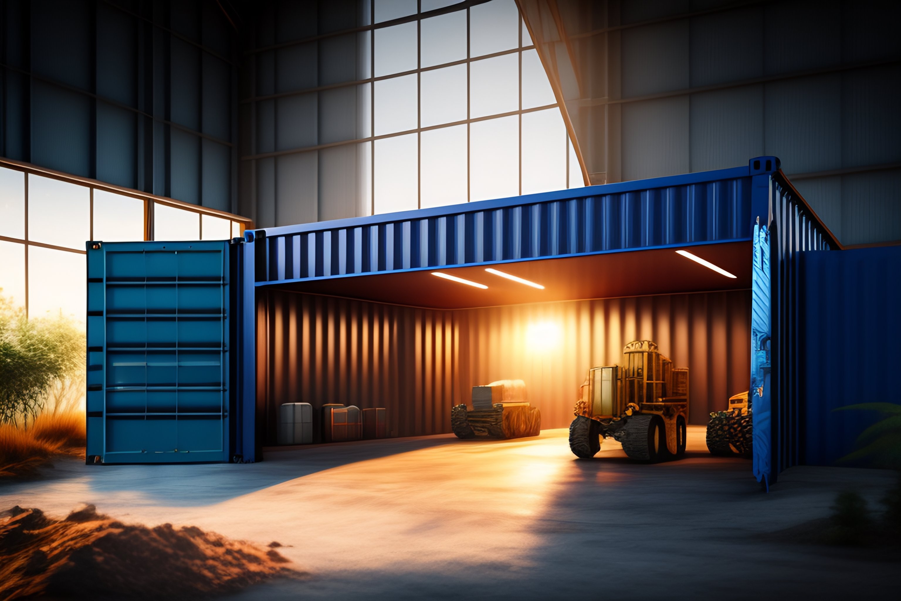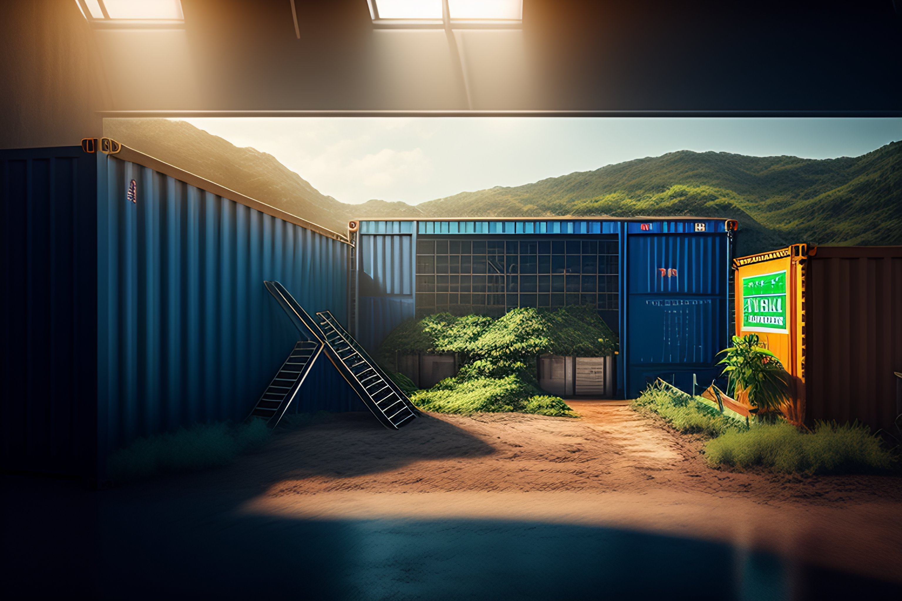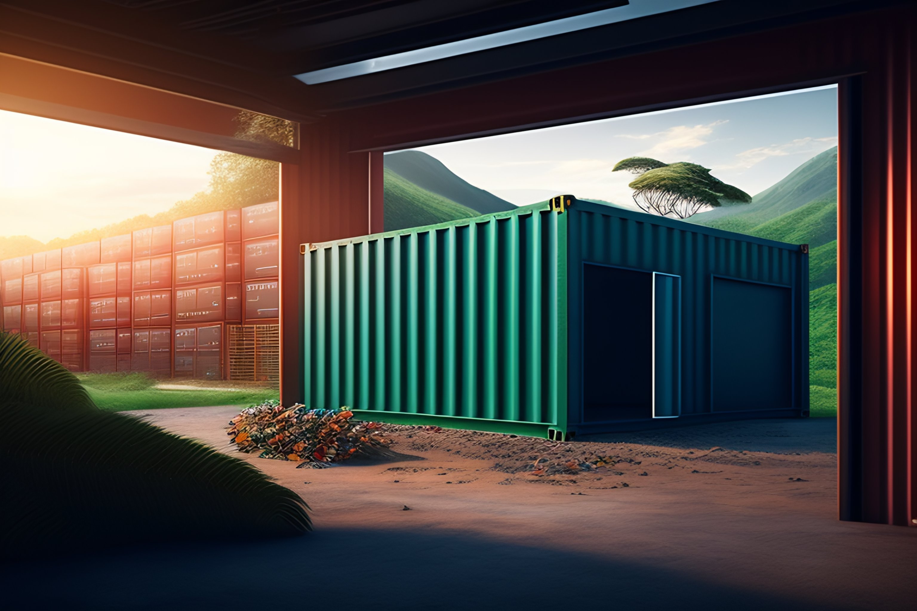 A recycling plant inside a glass shipping container, photo realistic, studio lighting, jurassic world