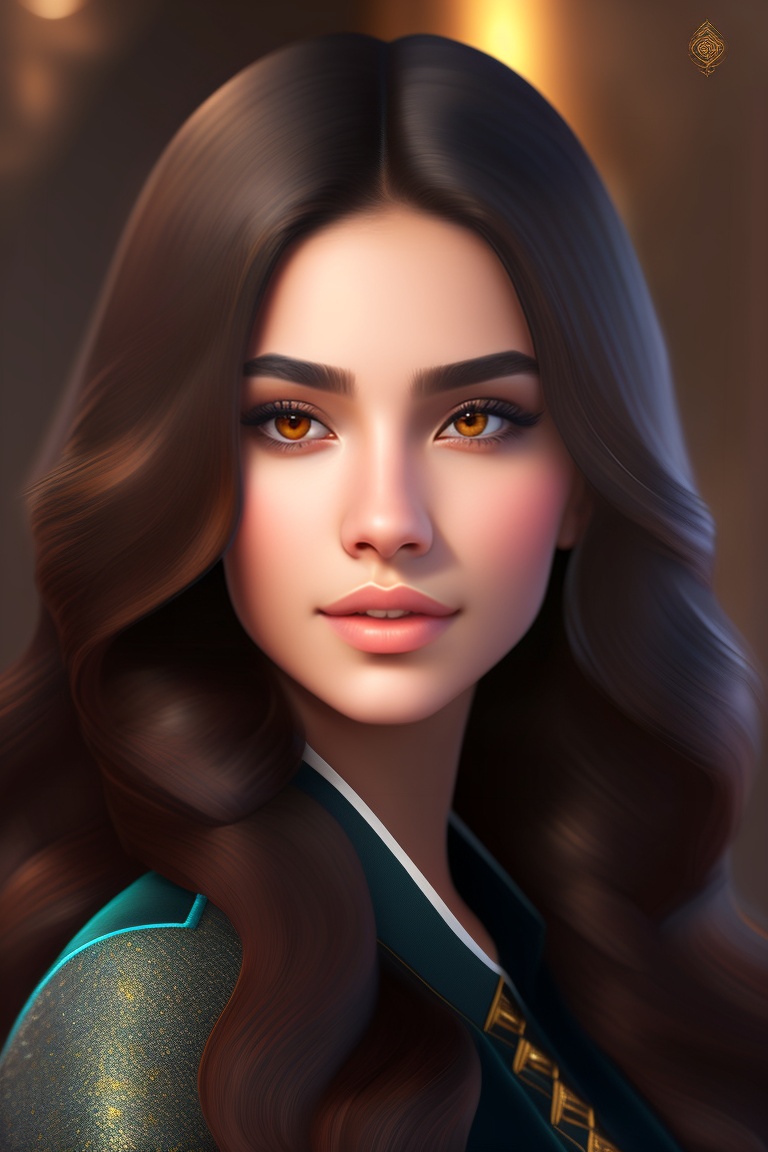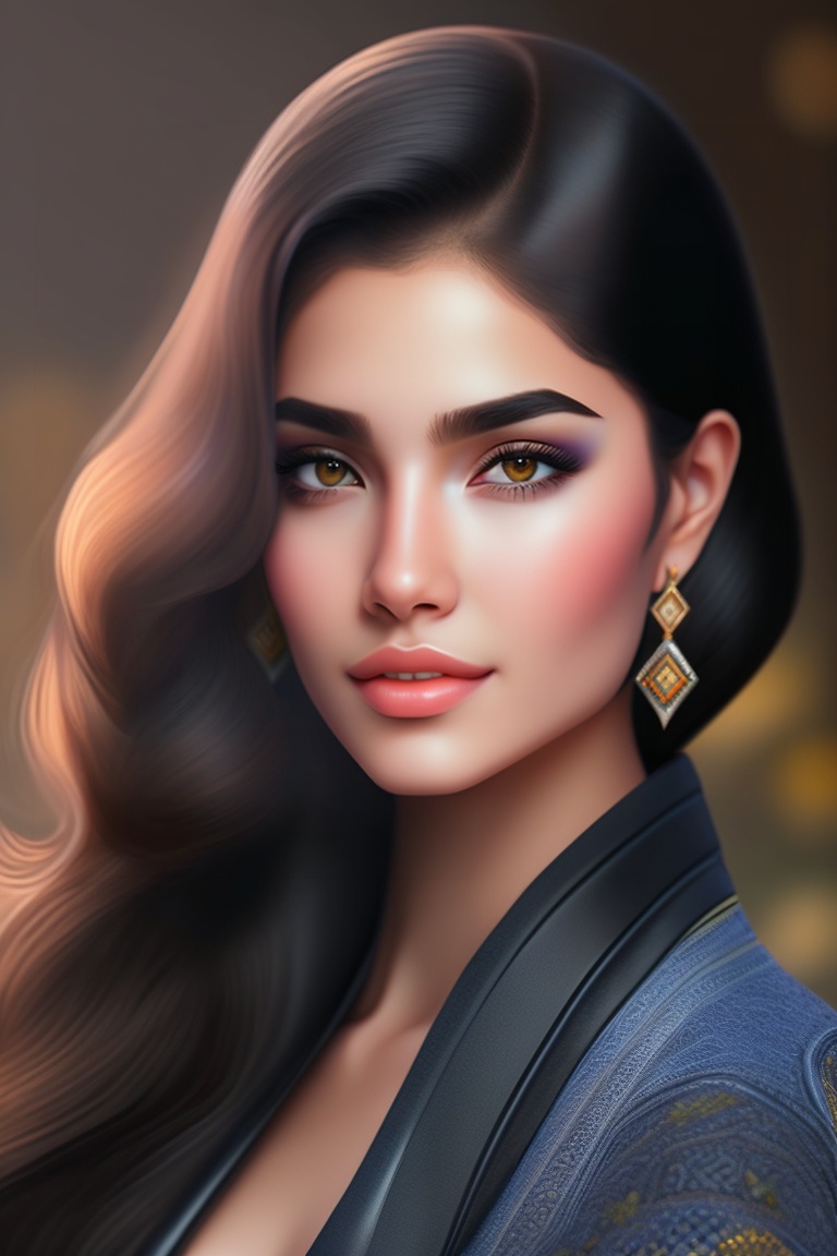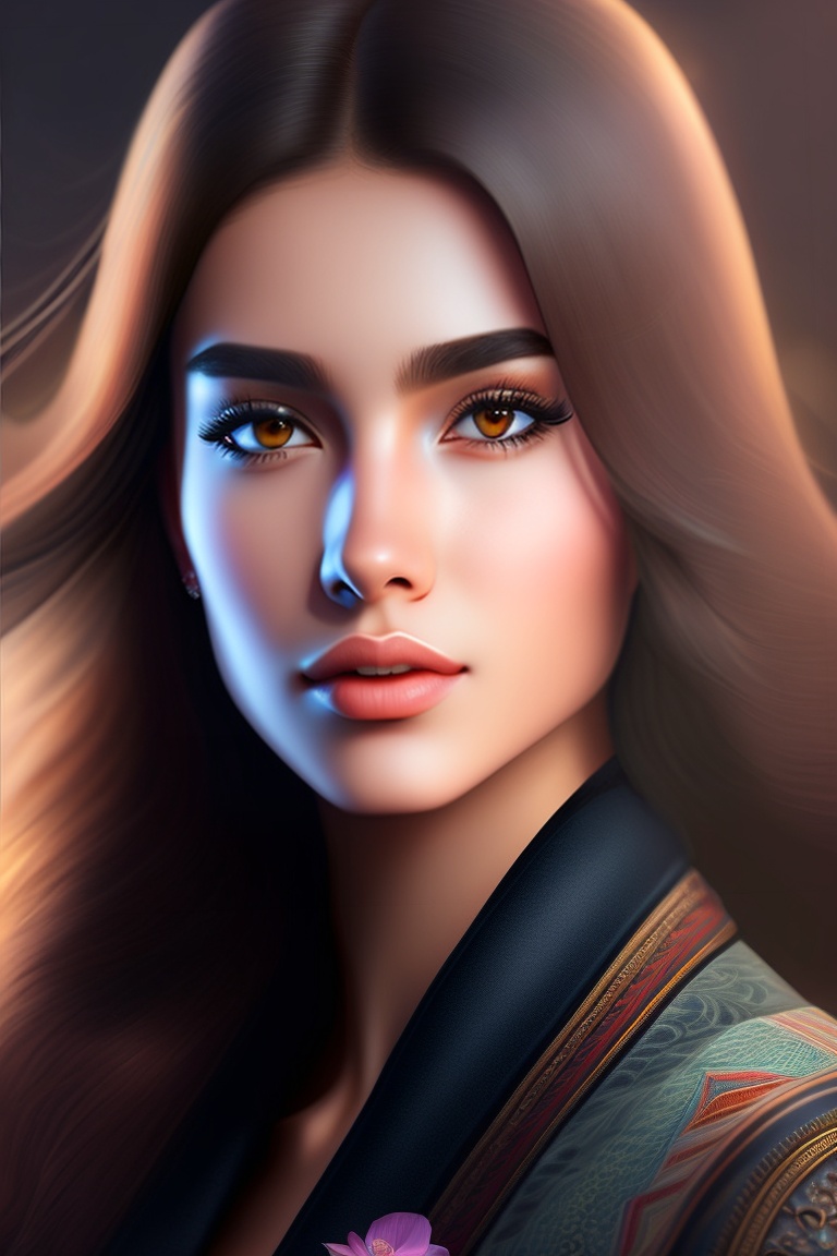 A beautiful iranian girl with black eyes and eyebrows, medium nose, relatively big lips, inclined downwards, long eyelashes, round forehead, long straight black hair