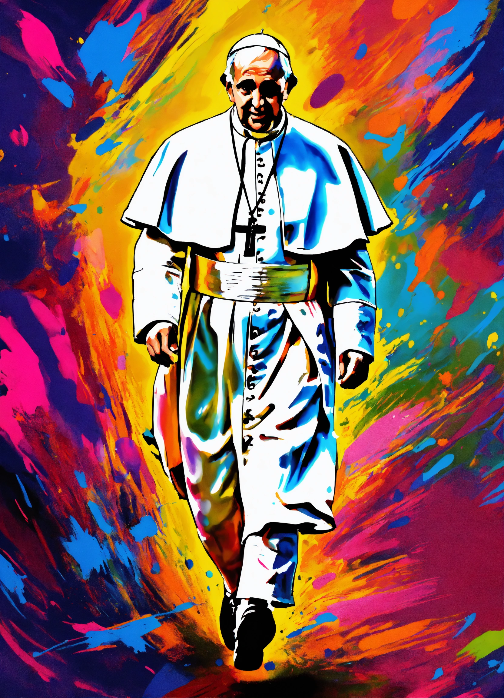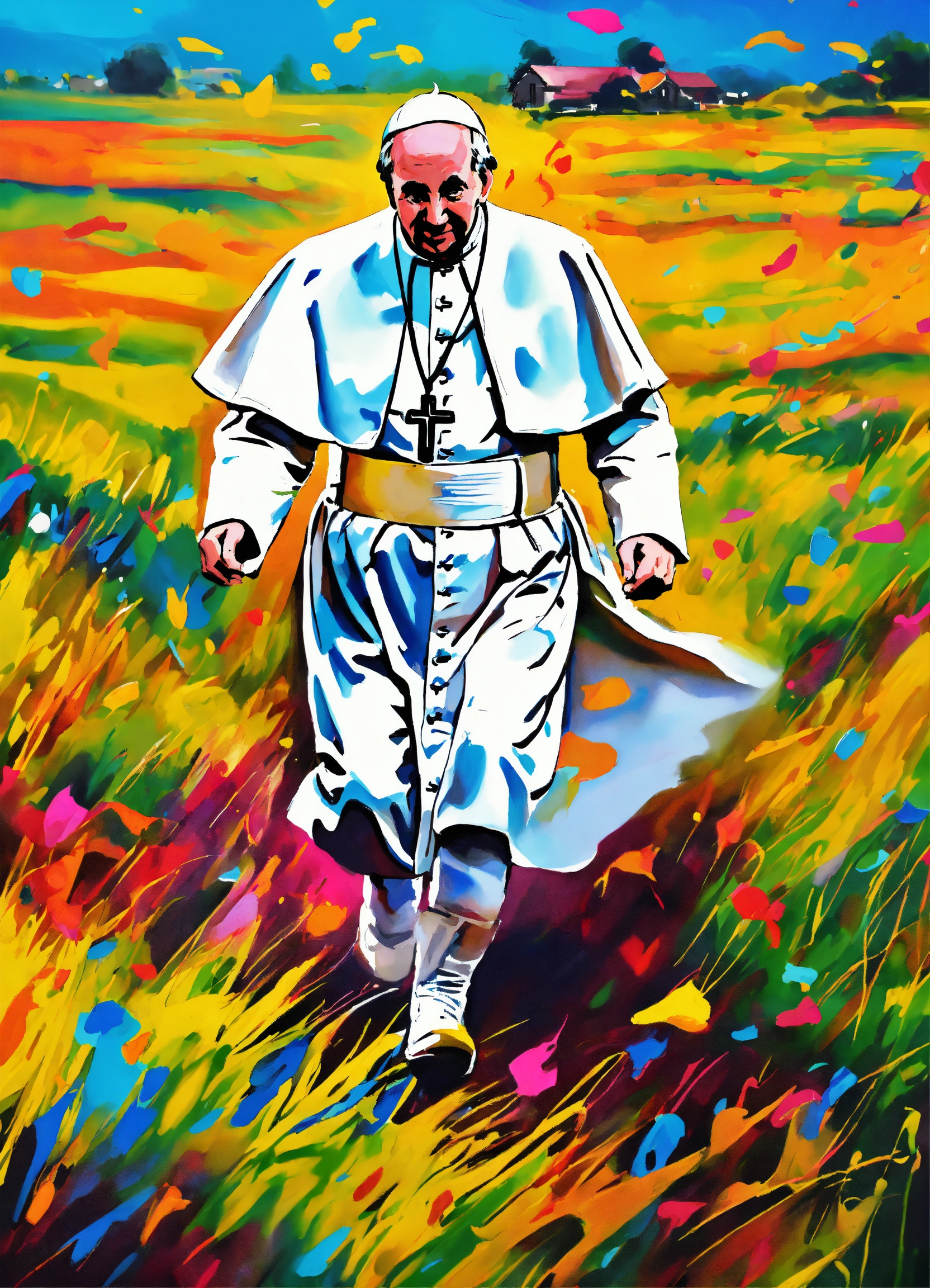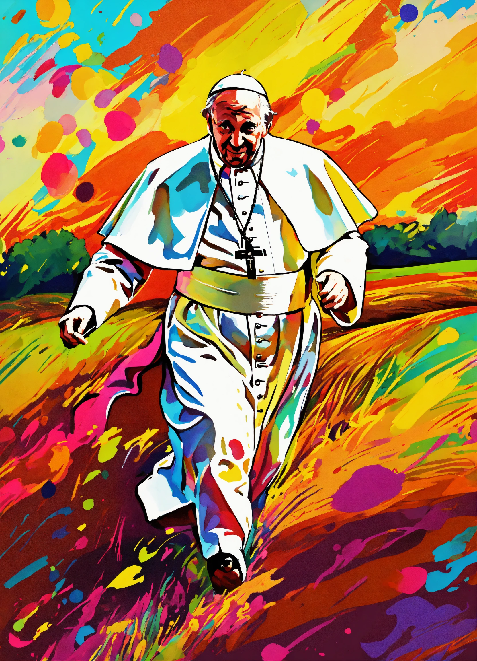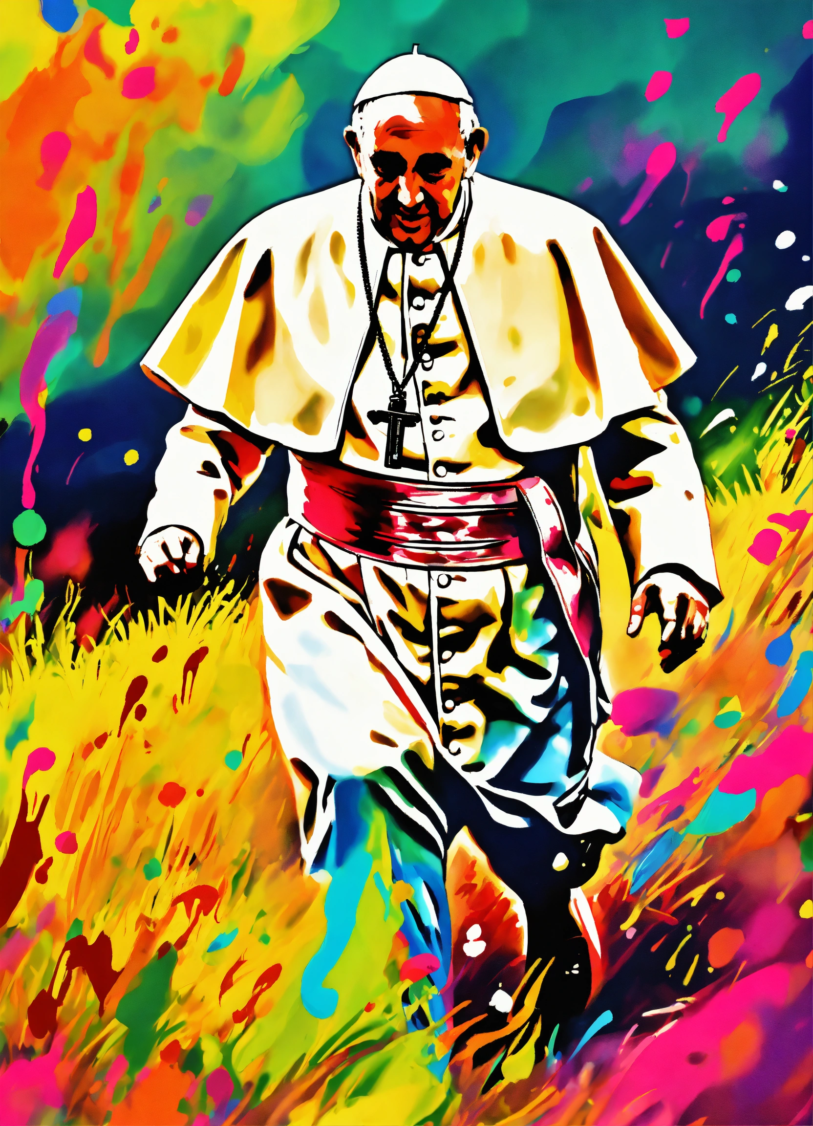 A painting of pope francis' running in a field, trend in behance hd, cmyk portrait, multi colored, defiant and beautiful, cmyk, expressive eyes!! intricate, 🐎🍑, beautiful iphone wallpaper, medium [ graffiti ], by sun kehong, 16 colors, splashes of liquid