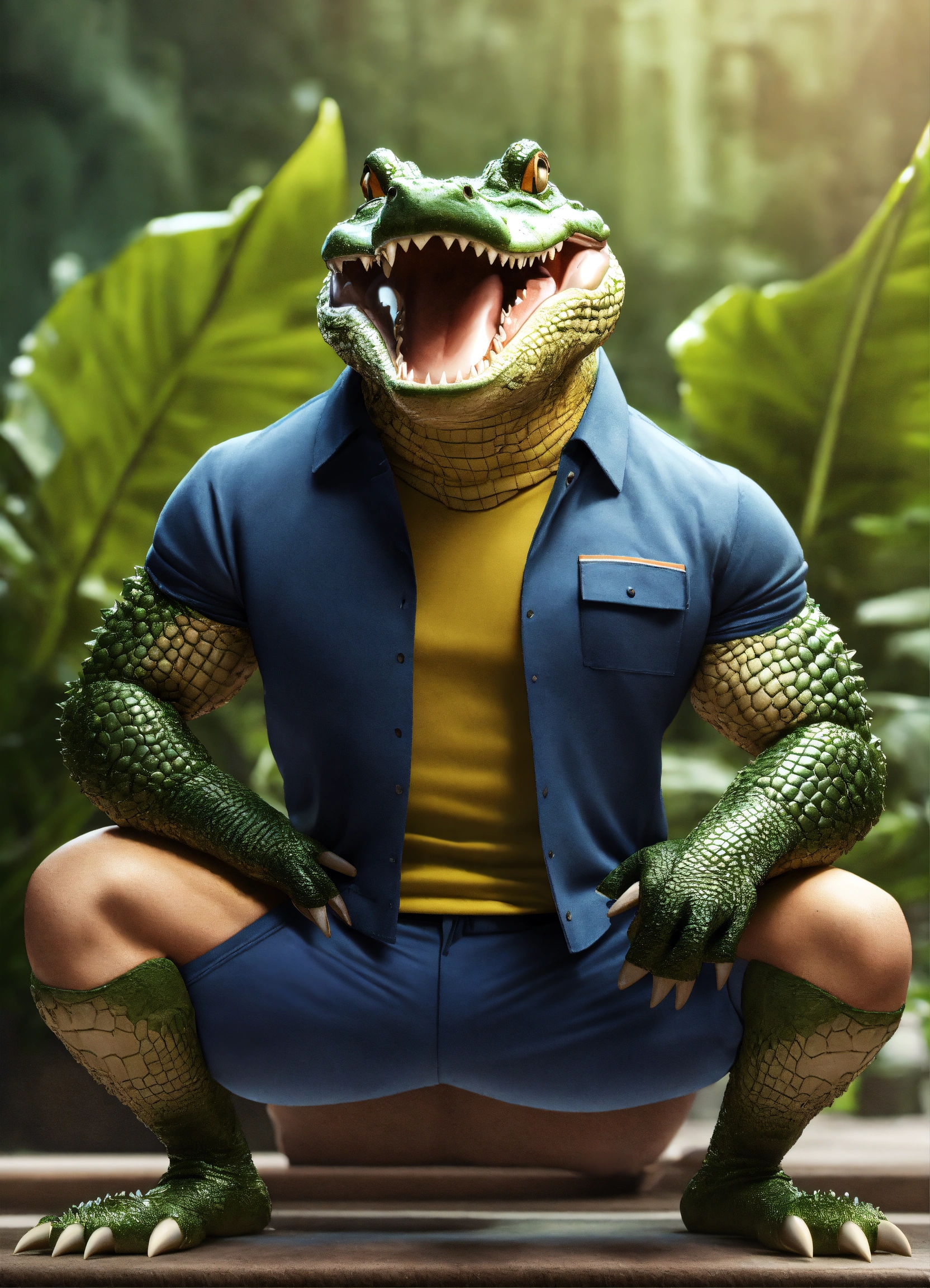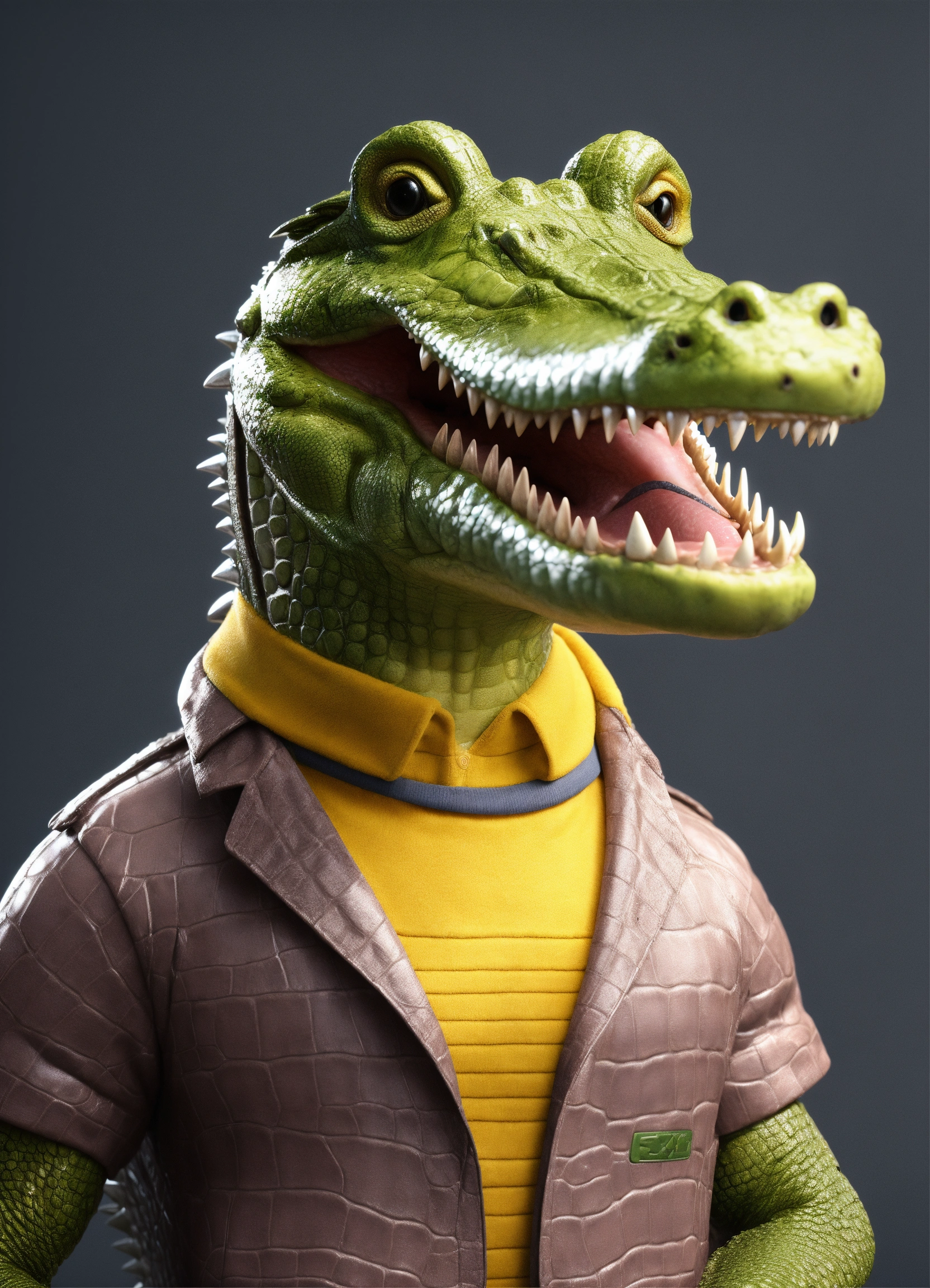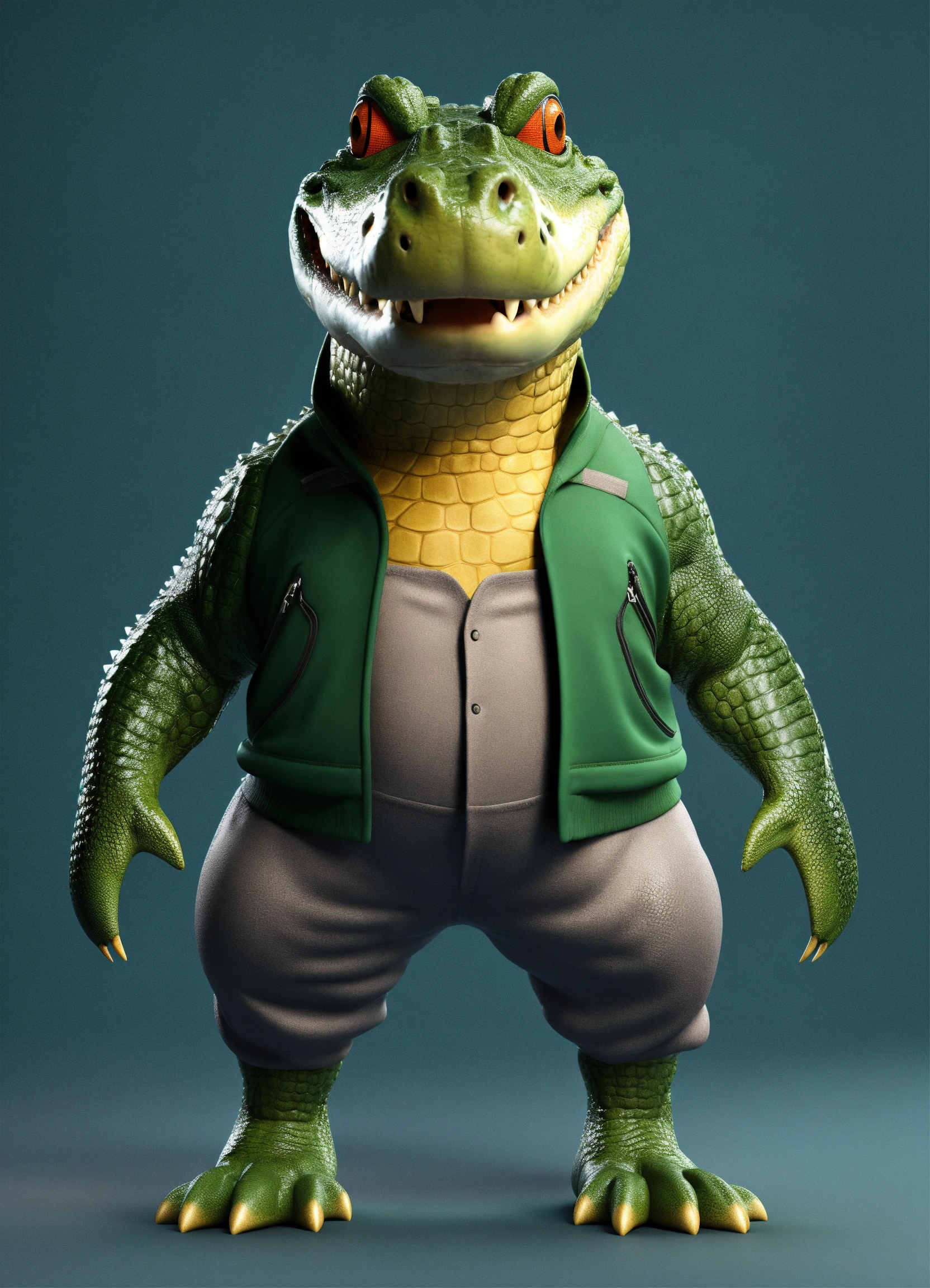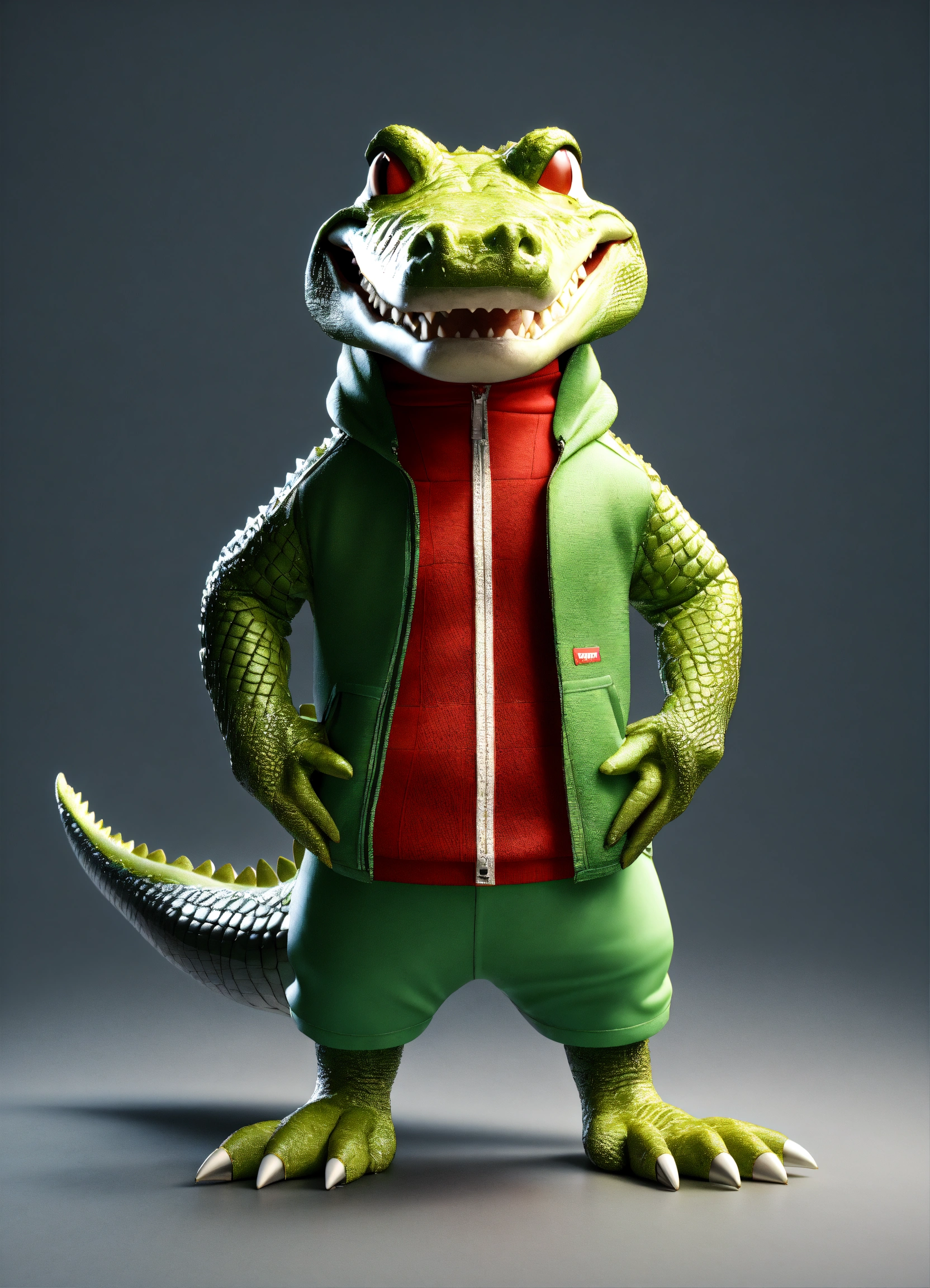 A crocodile with fitness wear, like a man, front view, studio photo, hyper realistic, fashion, photorealistic, 3d render, disney style.