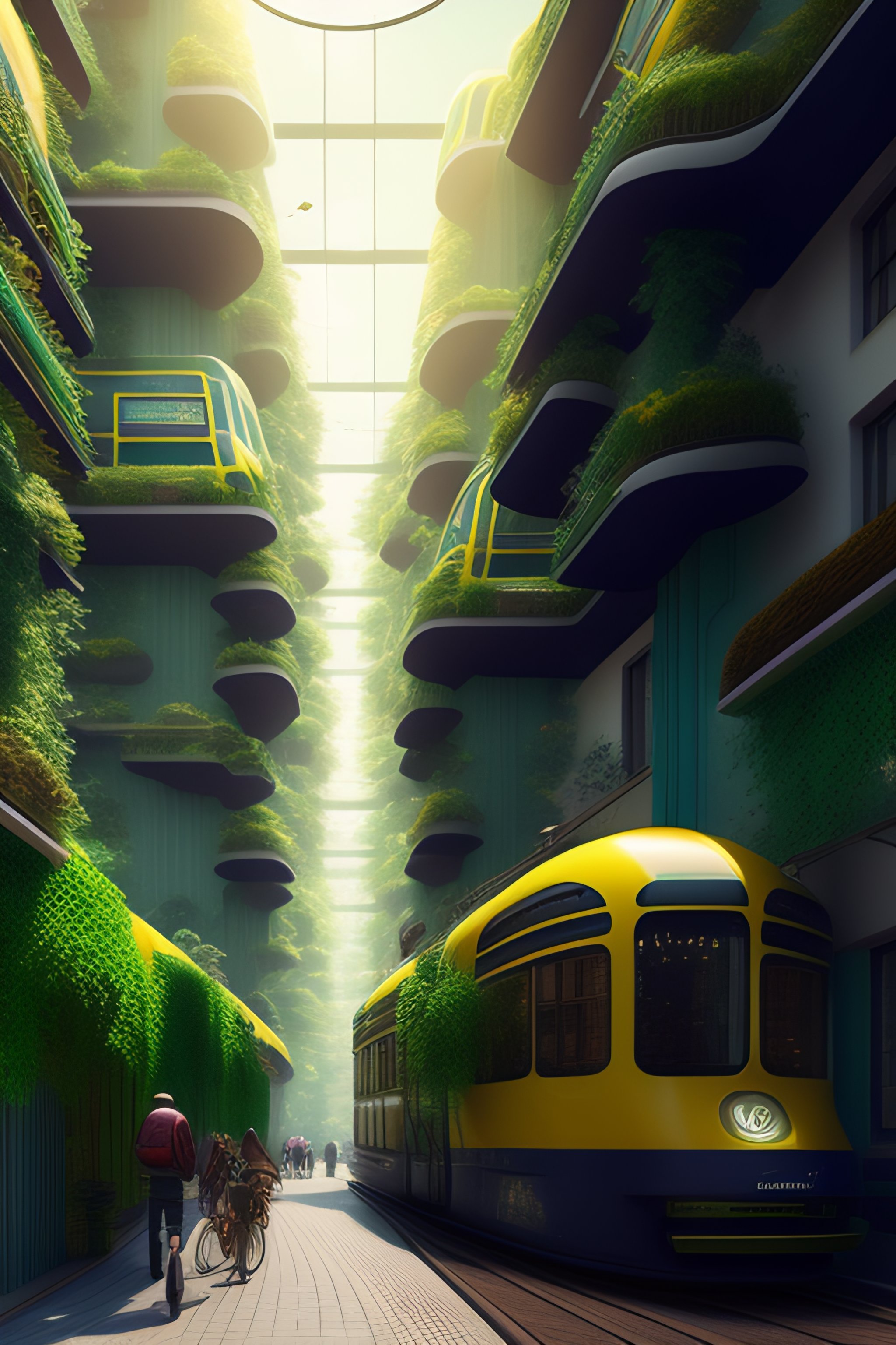 Solarpunk street, 3 story buildings, large amounts of lush greenery, solar panels on roofs, bikes, trams