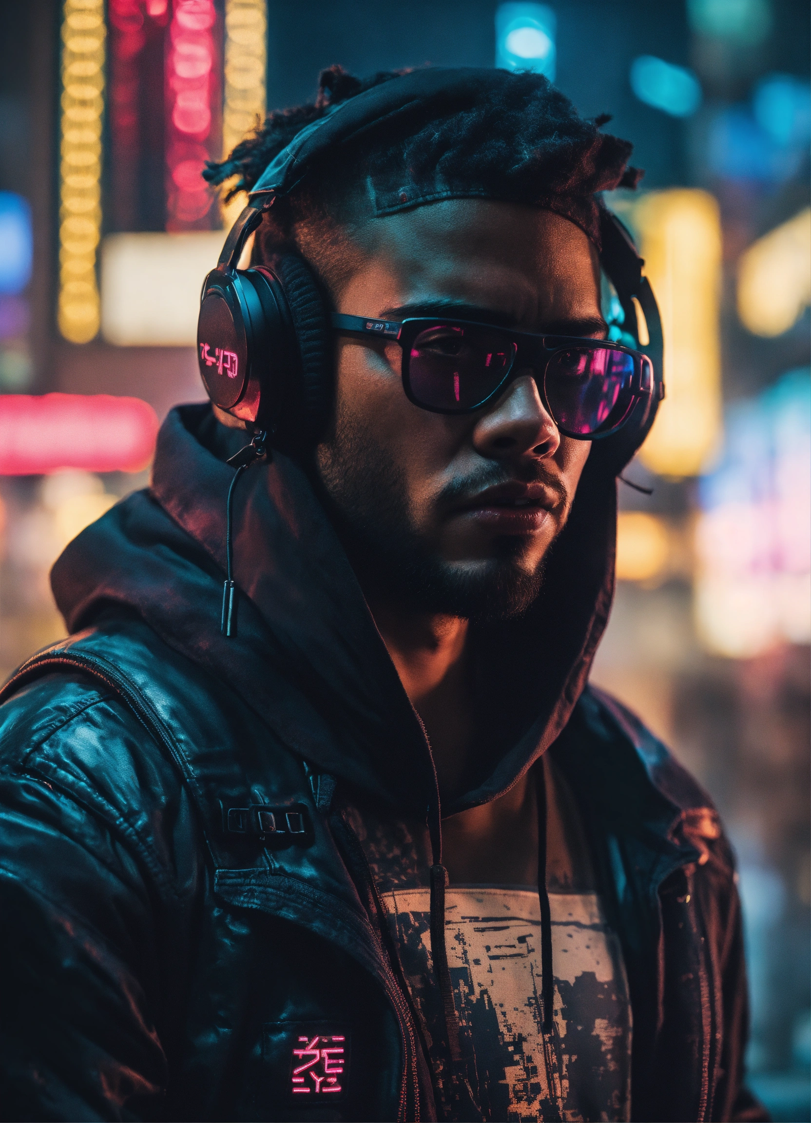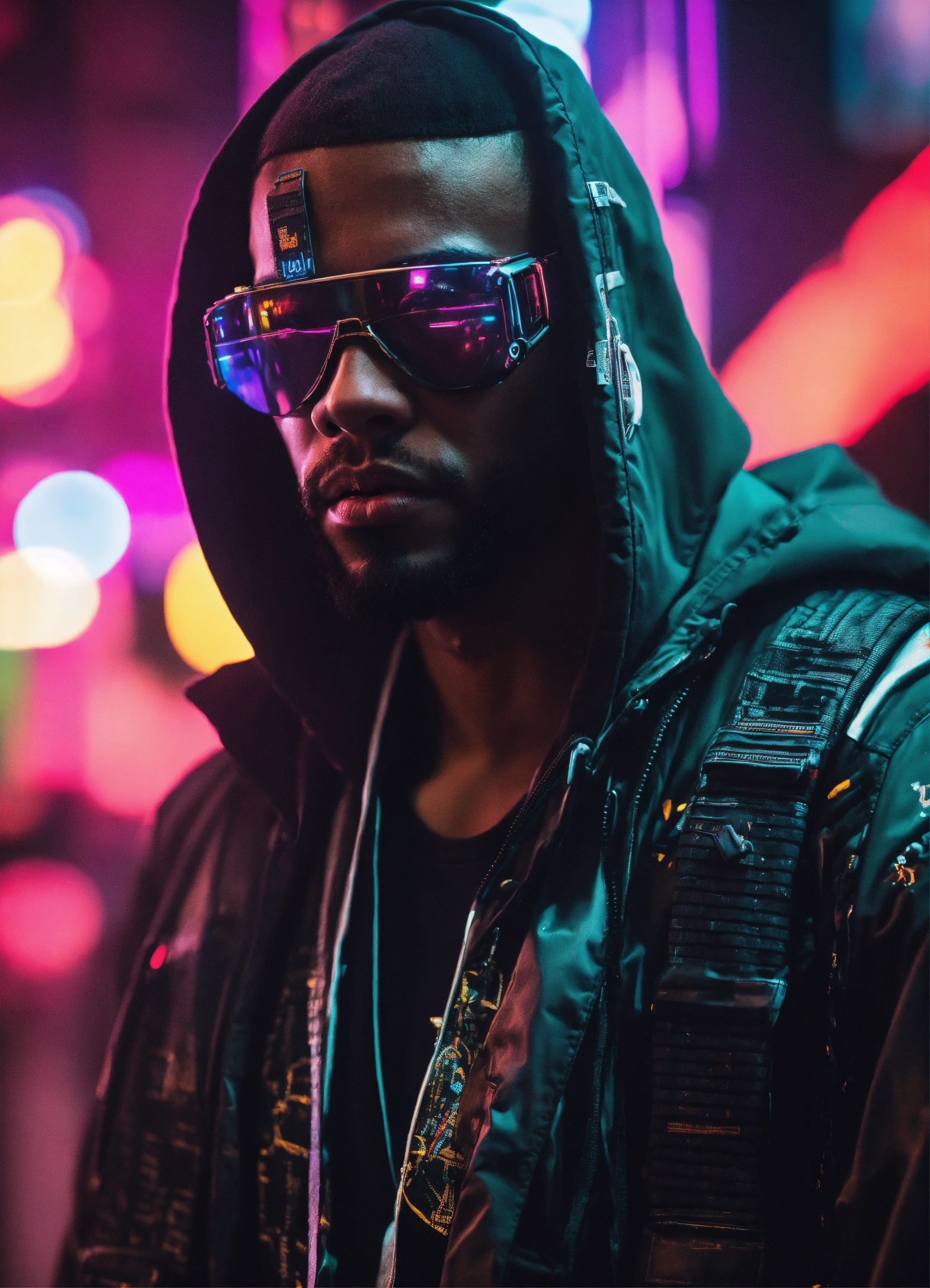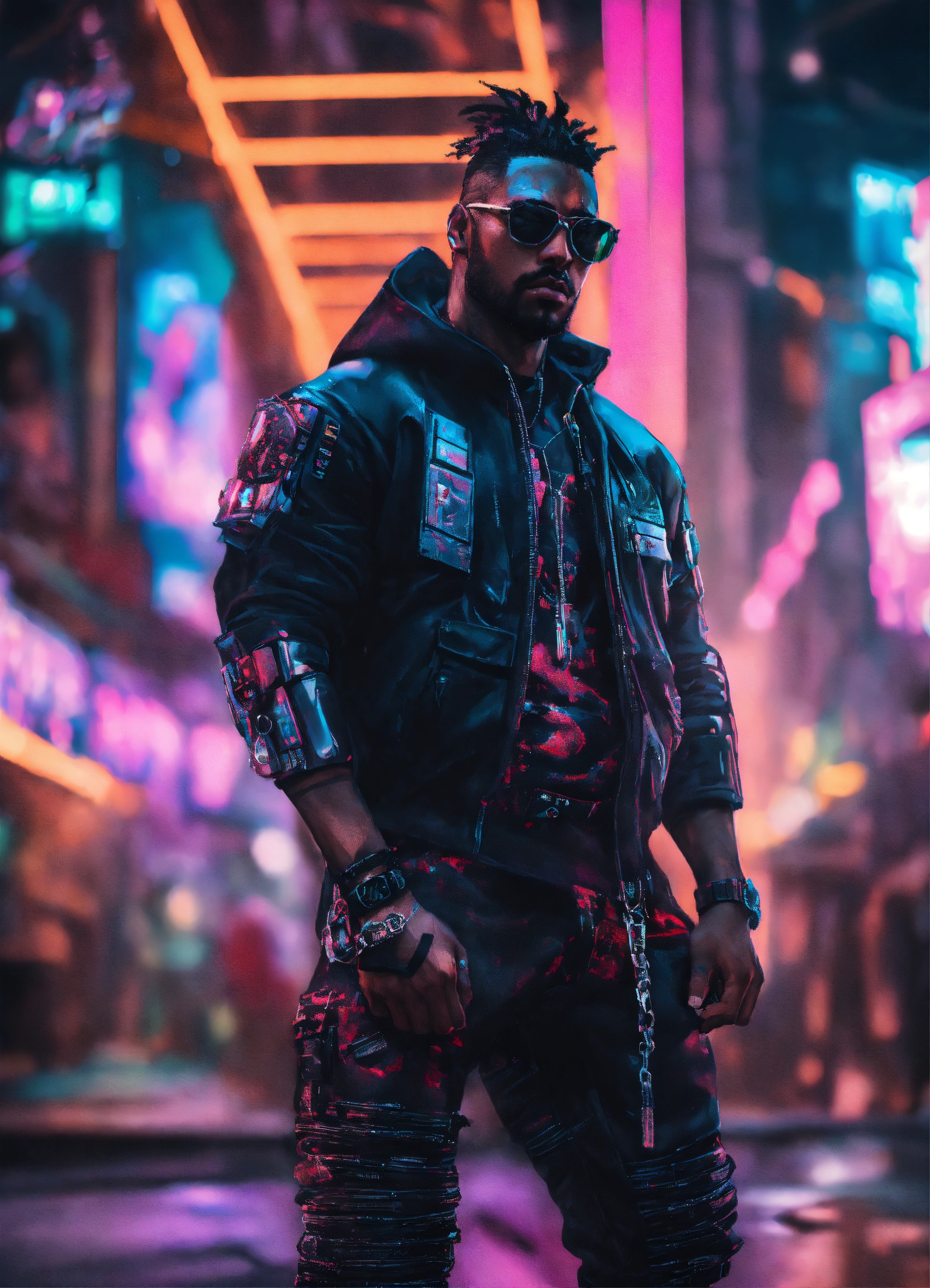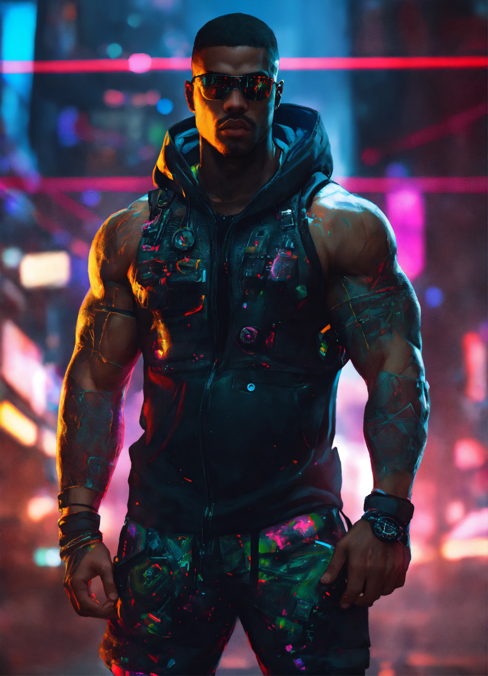 Highly detailed portrait of cyberpsycho, big, muscles, black streetwear, cyberpunk, realism, grunge aesthetic!!! bokeh