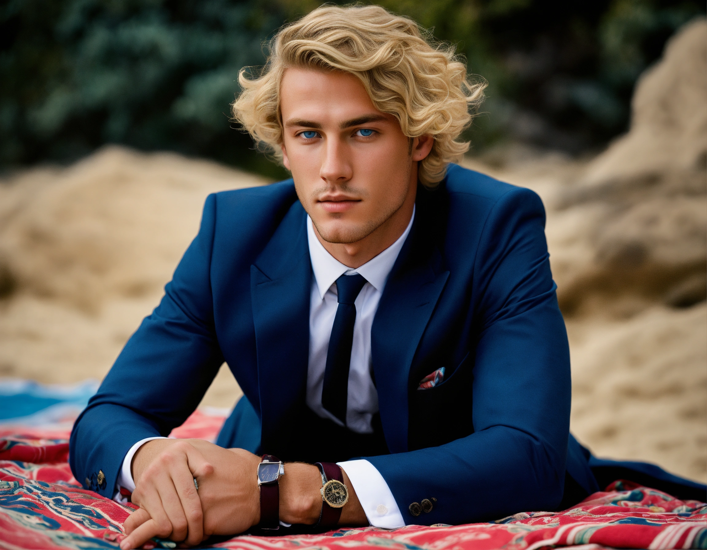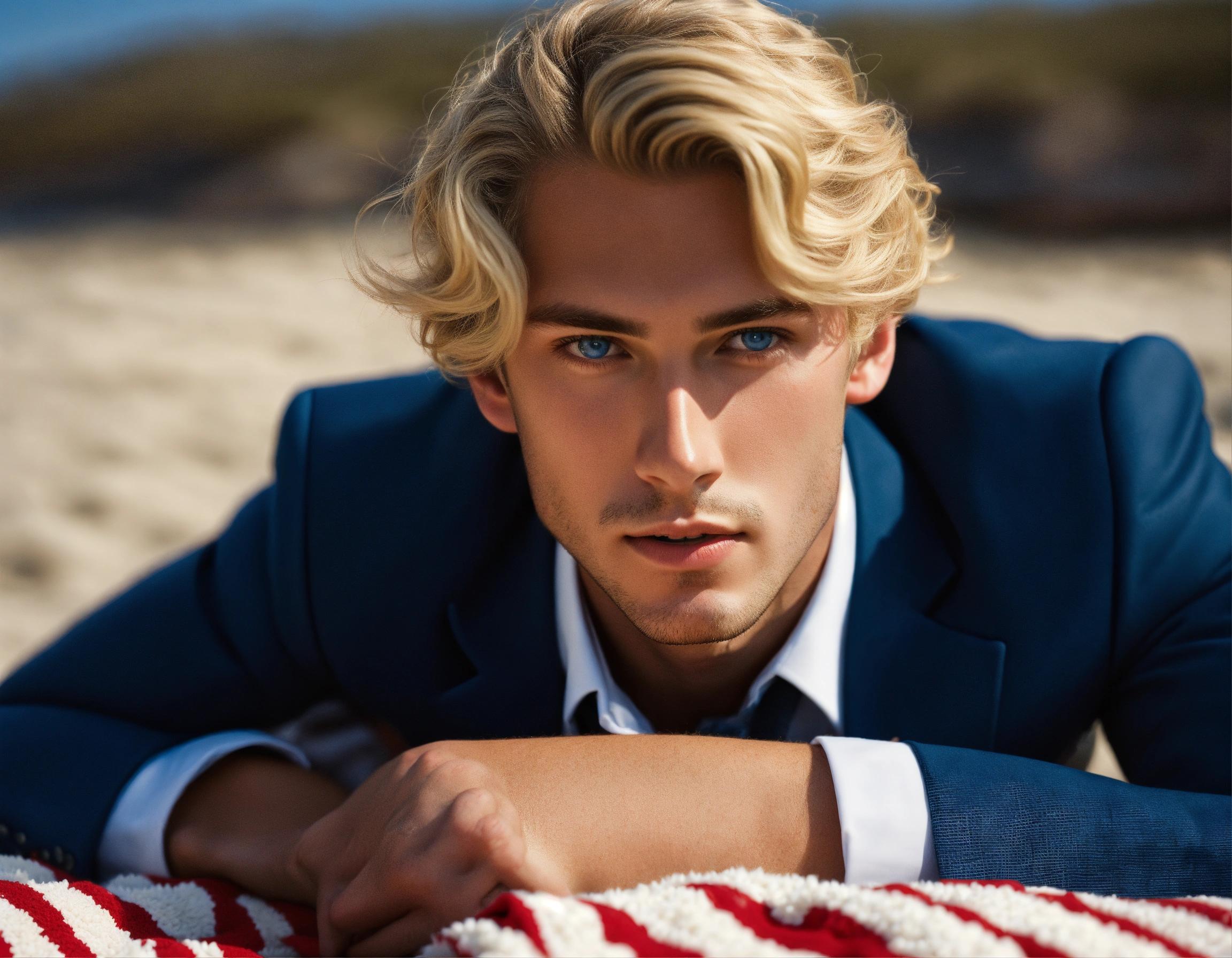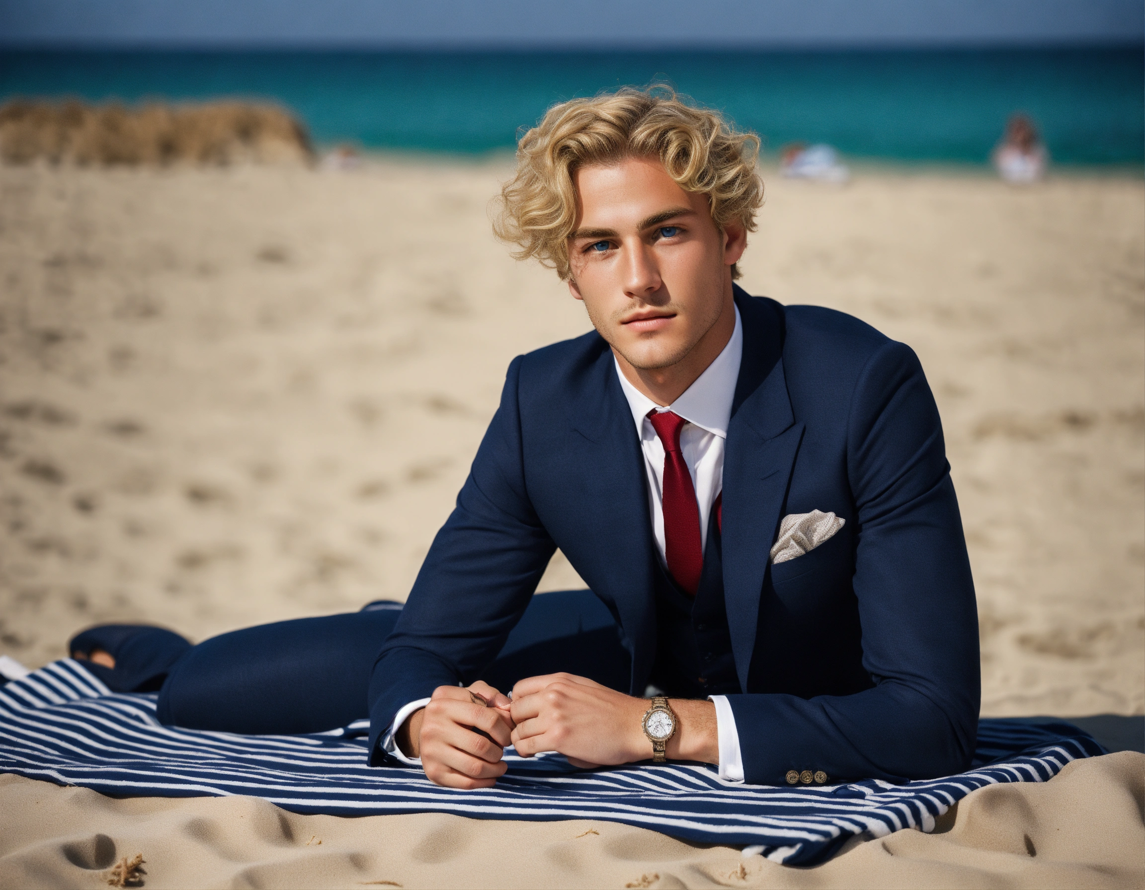 A young italian gentleman, blue eyes, blonde curled hair, navy suit and tie, lying prone on a beach towel