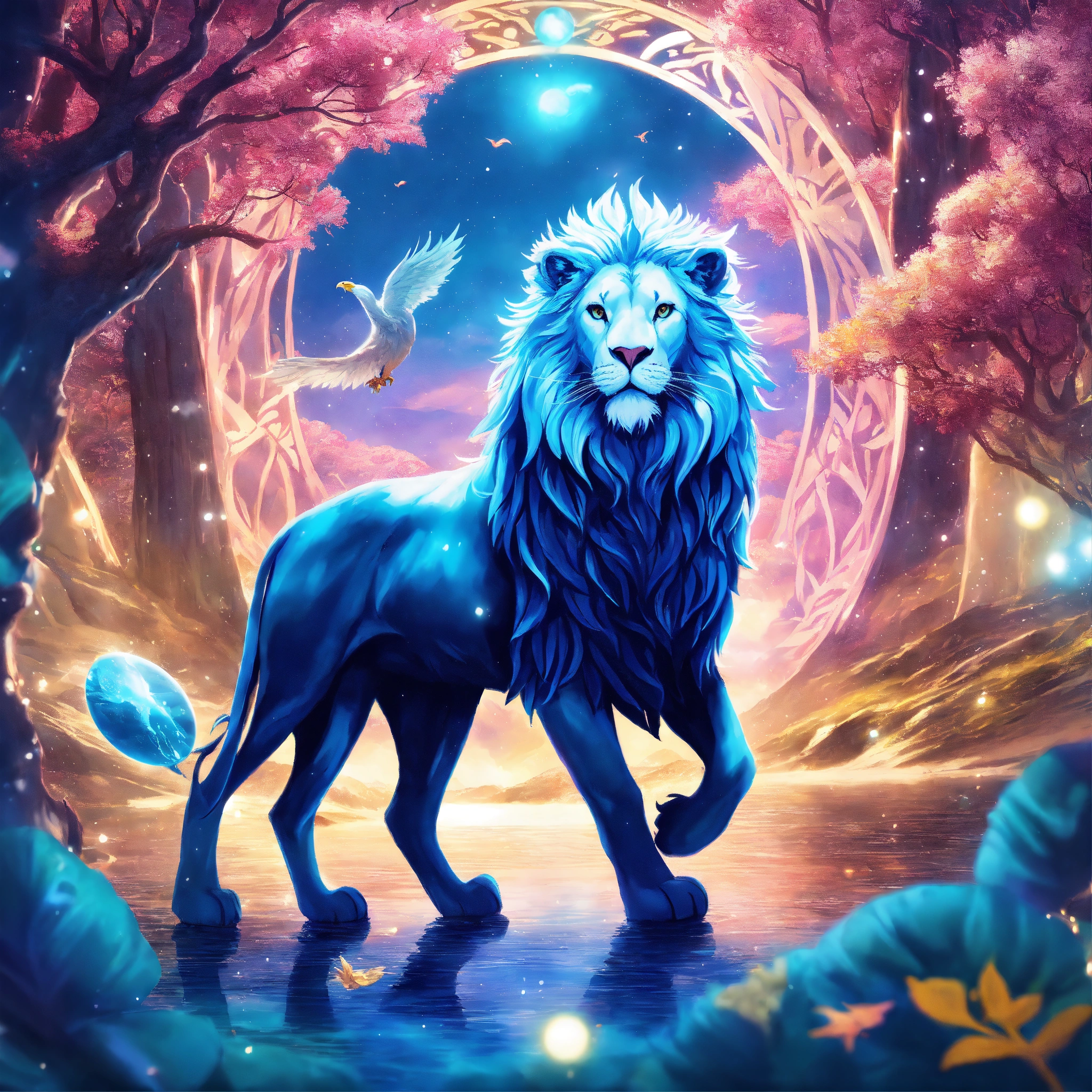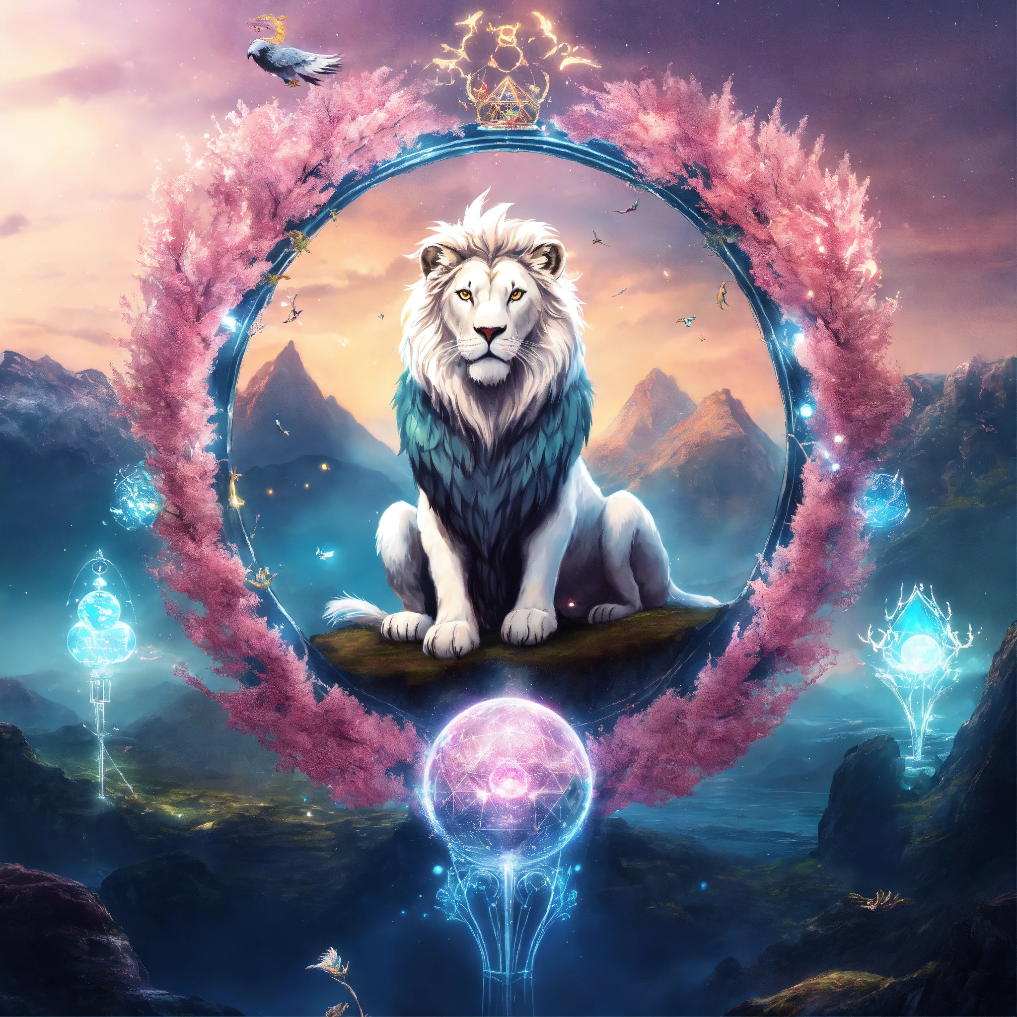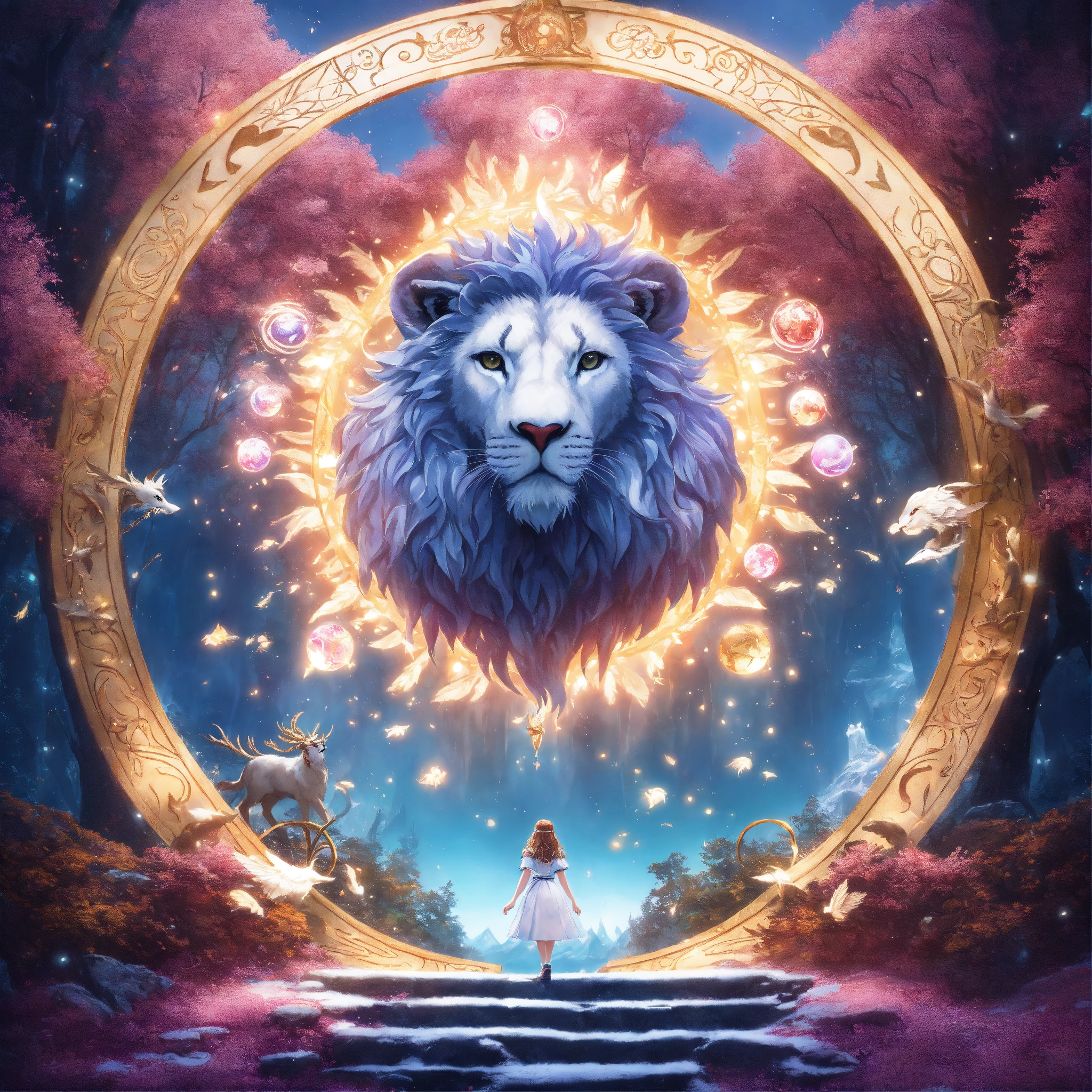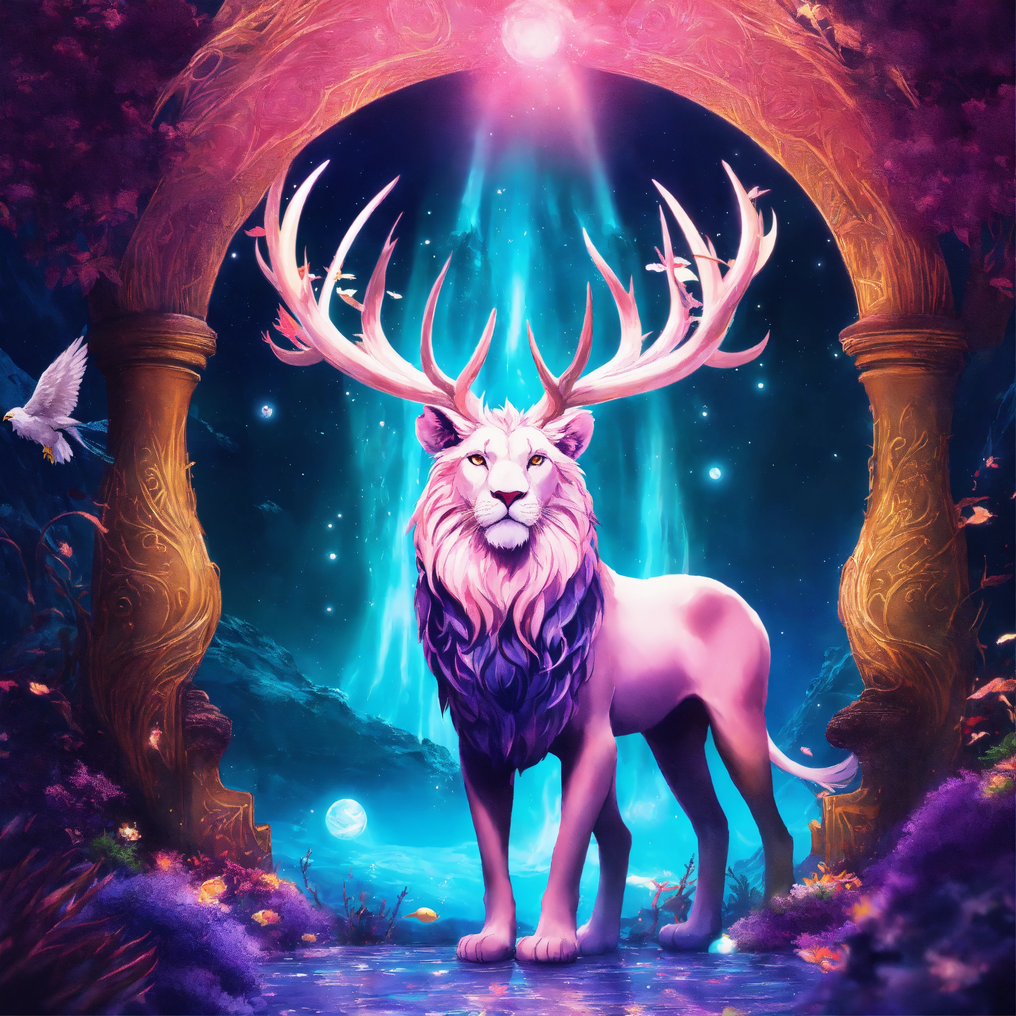 Underwater long exposure photography style, cartoon style, white giant lion elk antler, eagle wings flying in the cosmos with orbs and portals, x-ray style, in the style of tim burton, lion king, the chronicles of narnia, beauty and the beast, and peter pan. with sacred geometric patterns on the body. enchanting aura. the chronicles of narnia, wizard of oz, and alice in wonderland background with snow mountains, and trees with pink leaves.