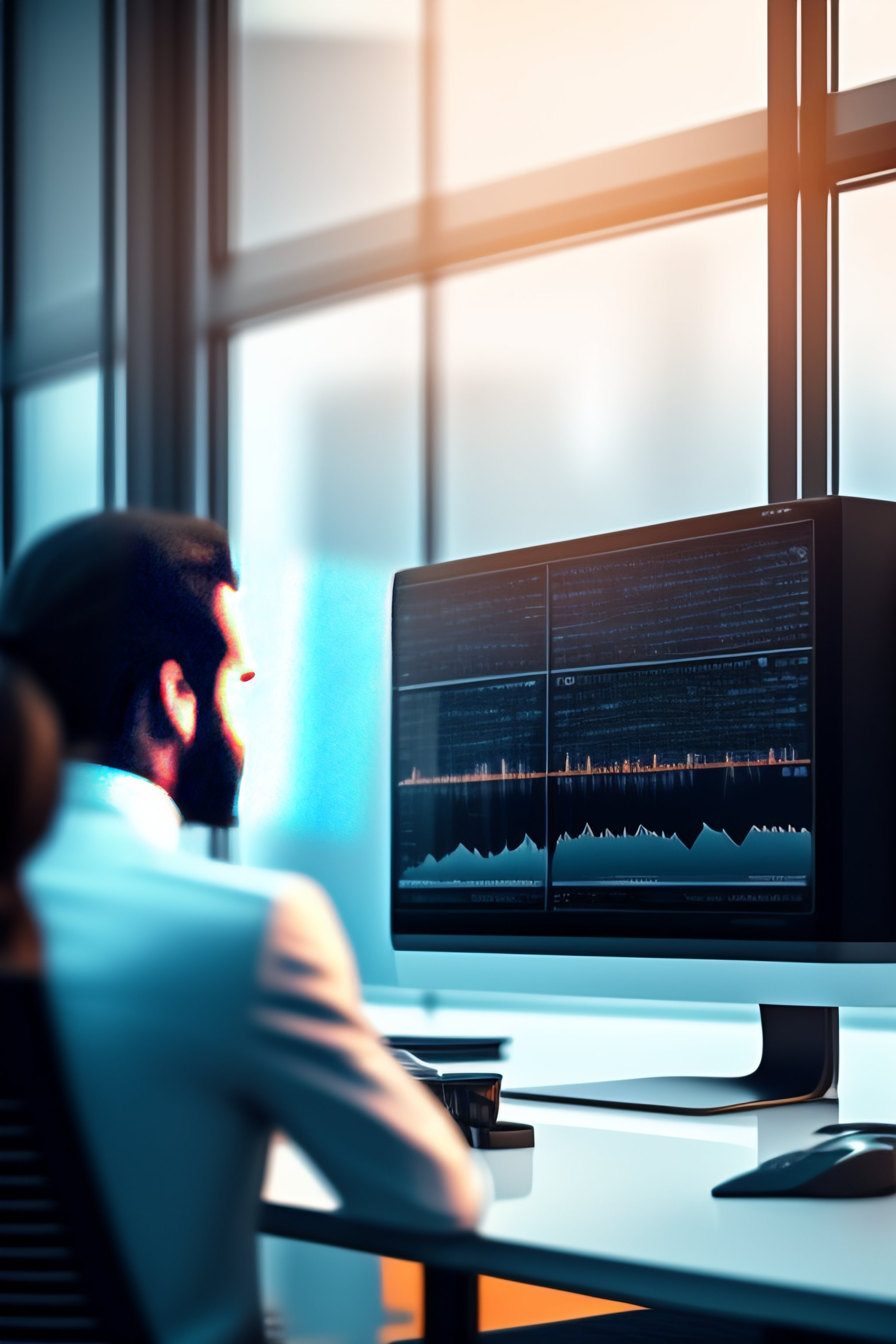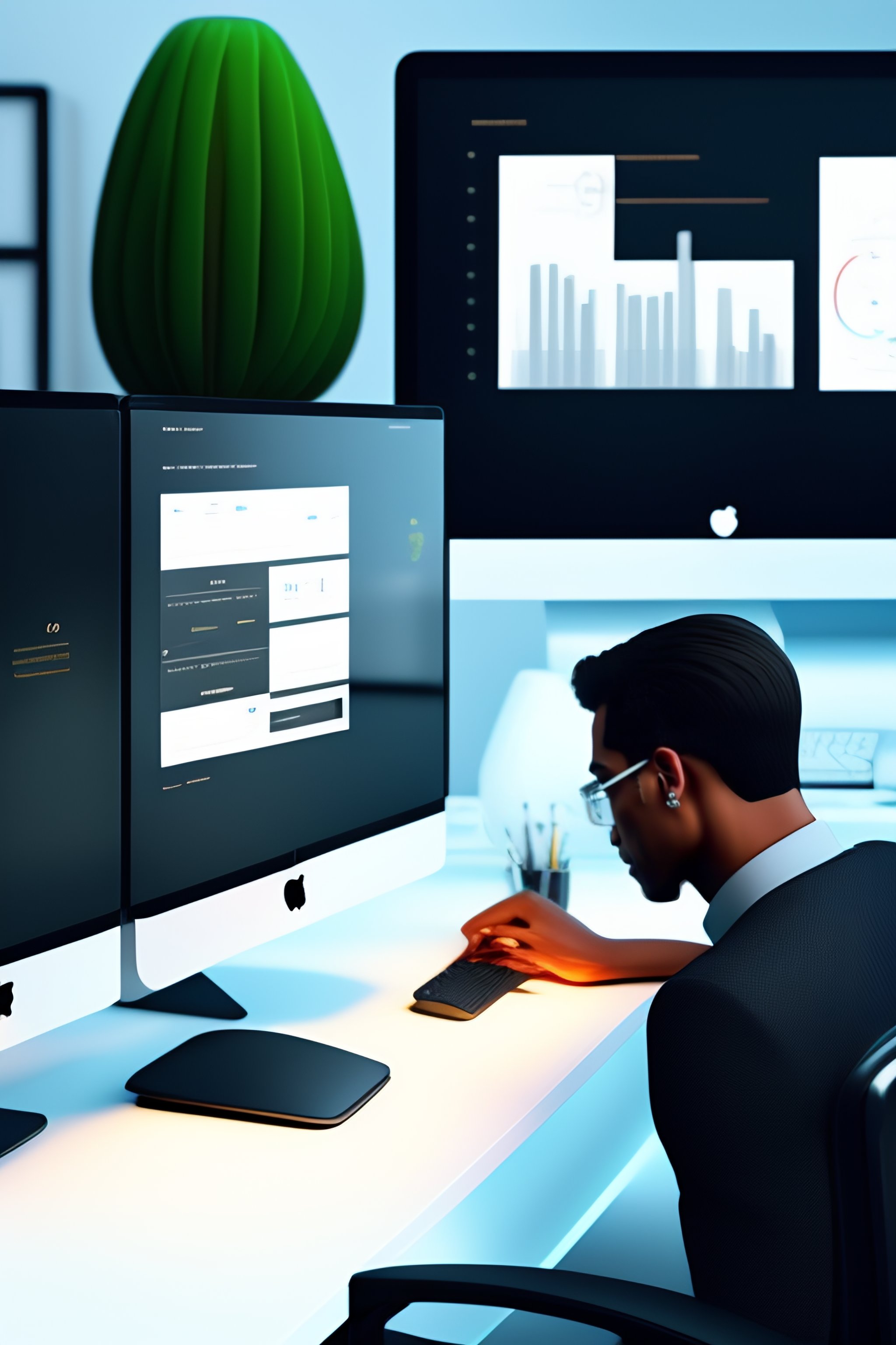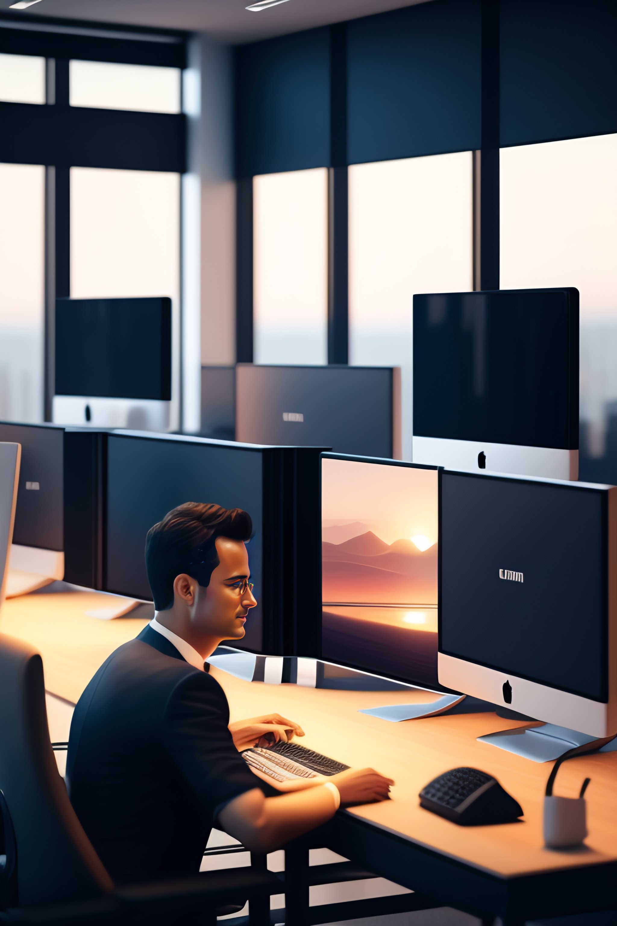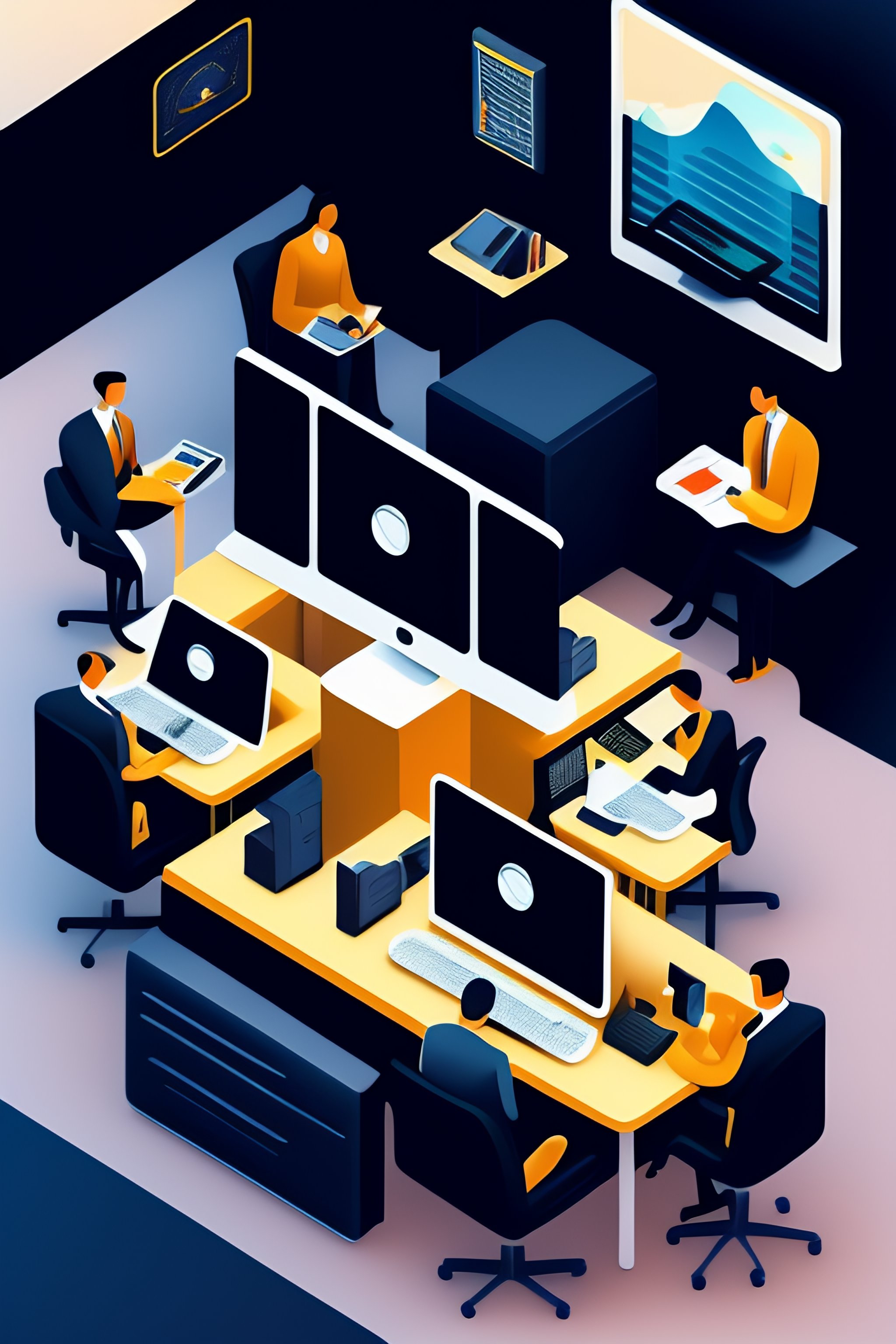Imagine an office environment where employees working with their office computers, black and whitecolors, 4k illustration