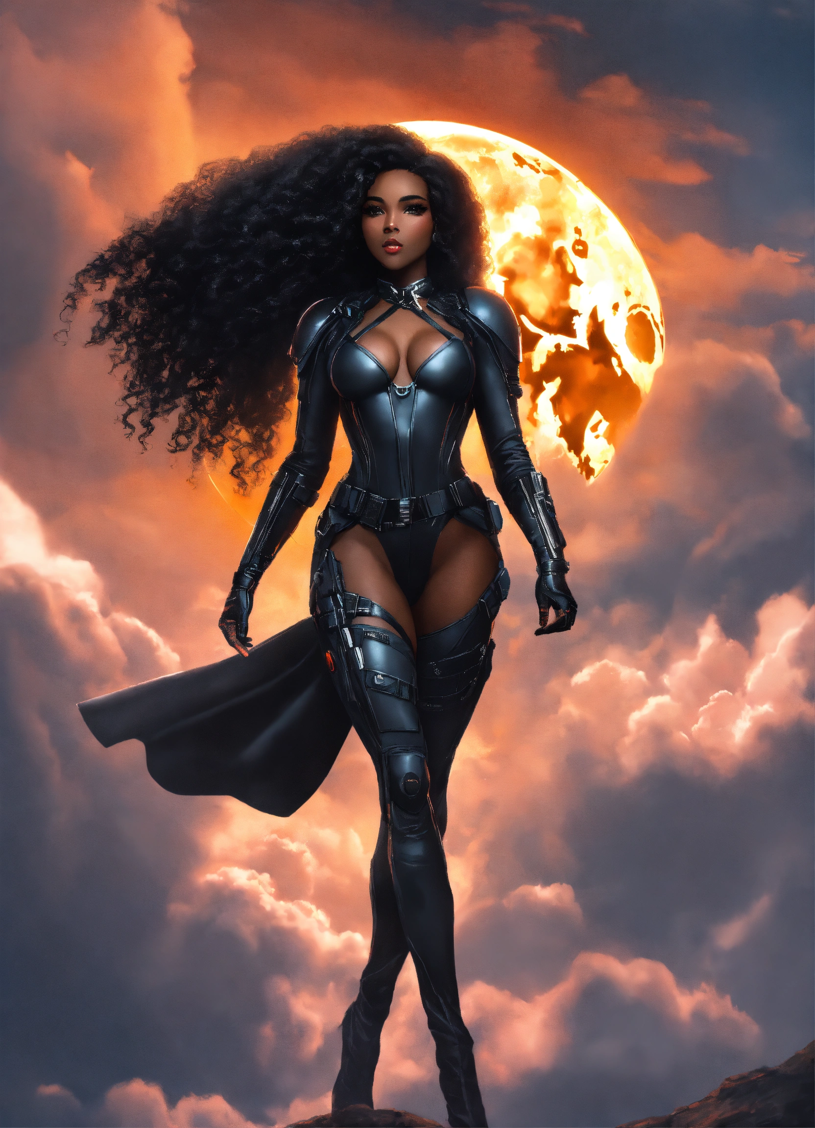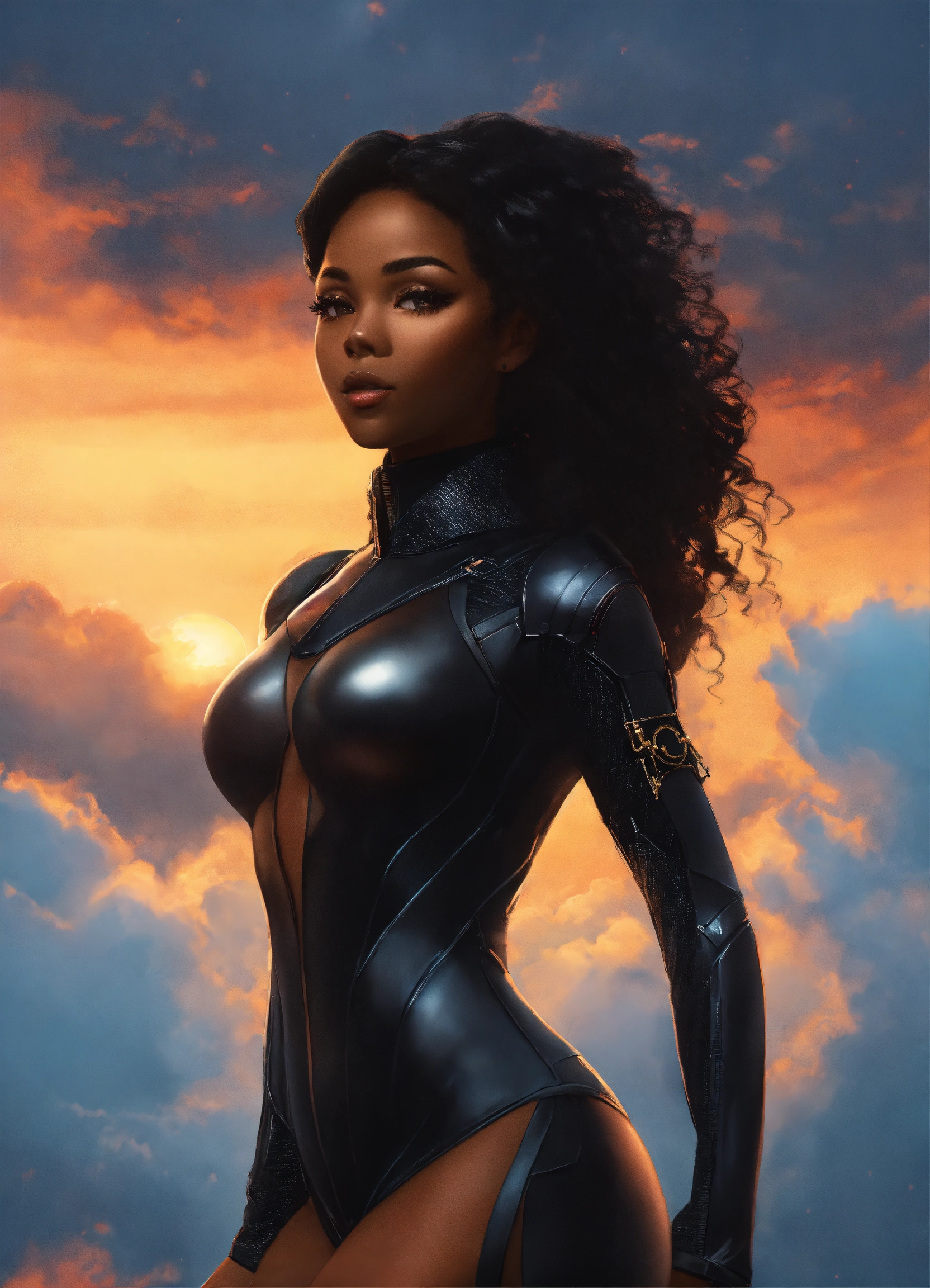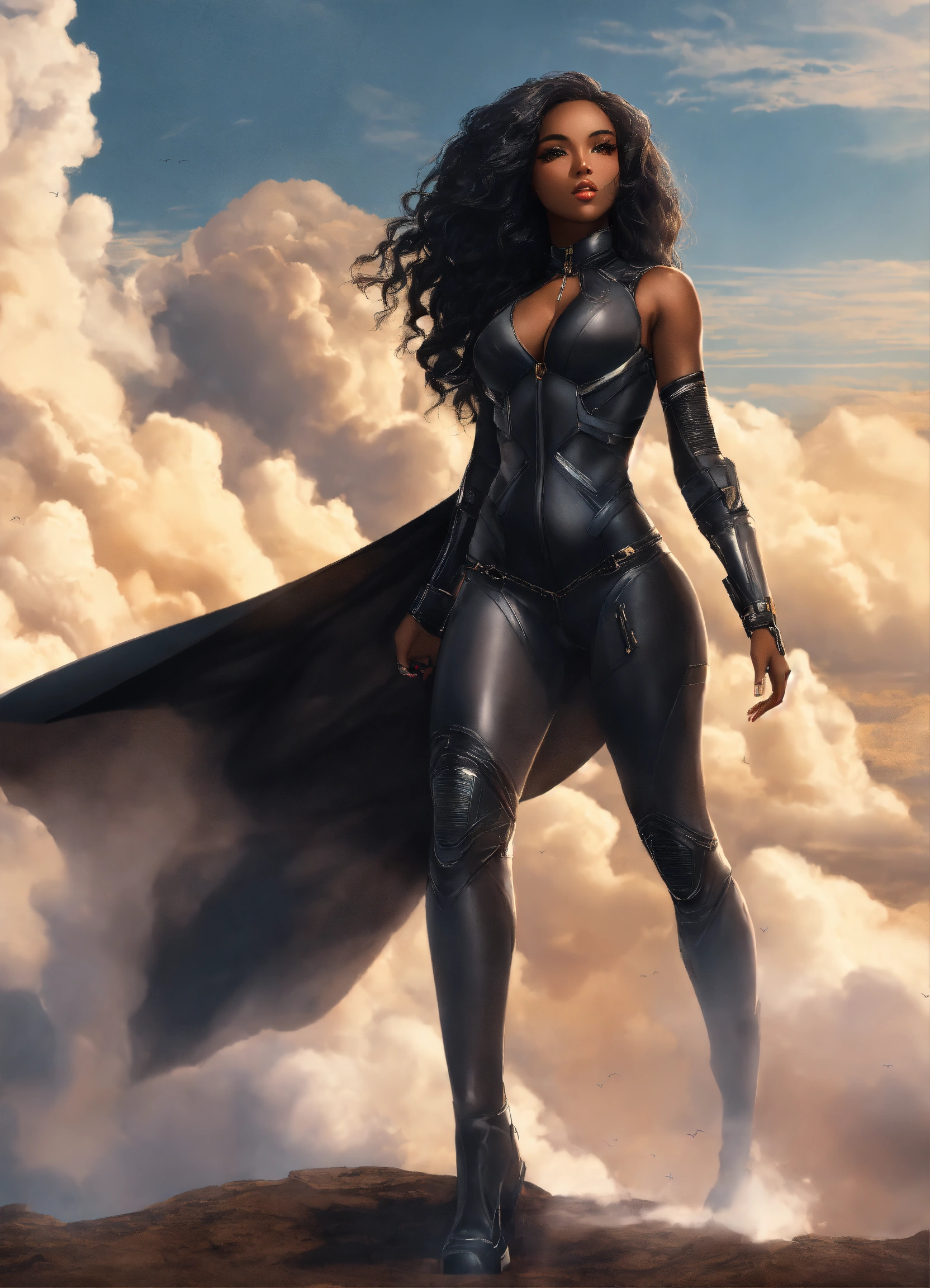 A beautiful black girl goddess, a hottie, perfect face perfect figure, shapely beautiful goddess with long dark hair hour-glass figure wearing a black spy stealth suit, walking in the clouds, resolution 8k, insanely detailed