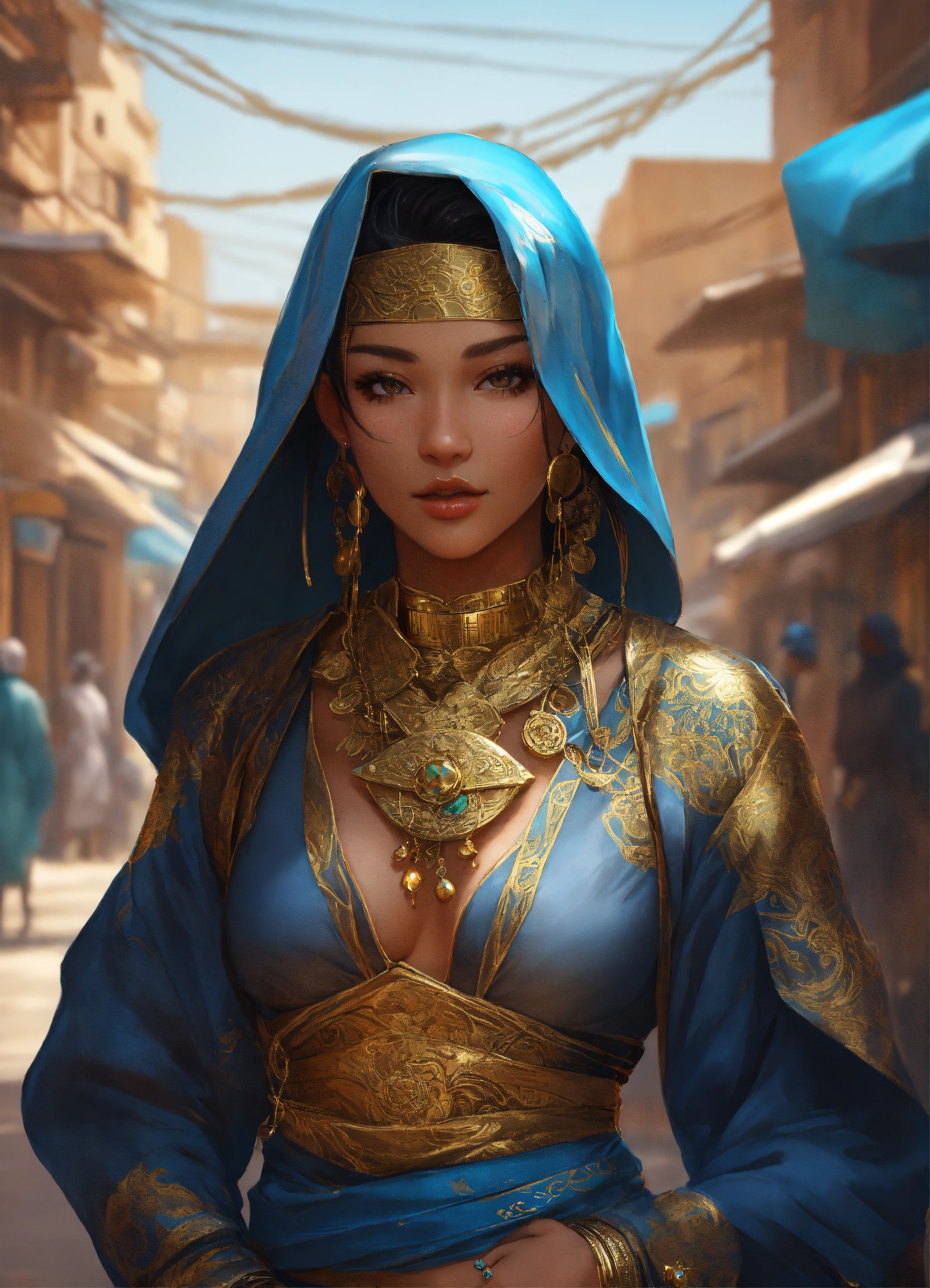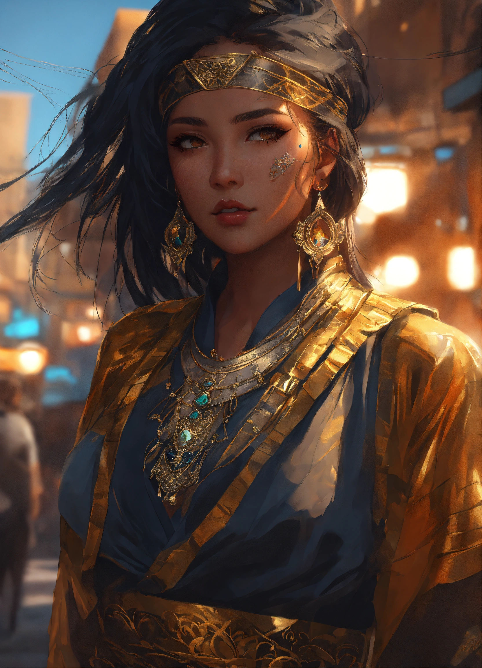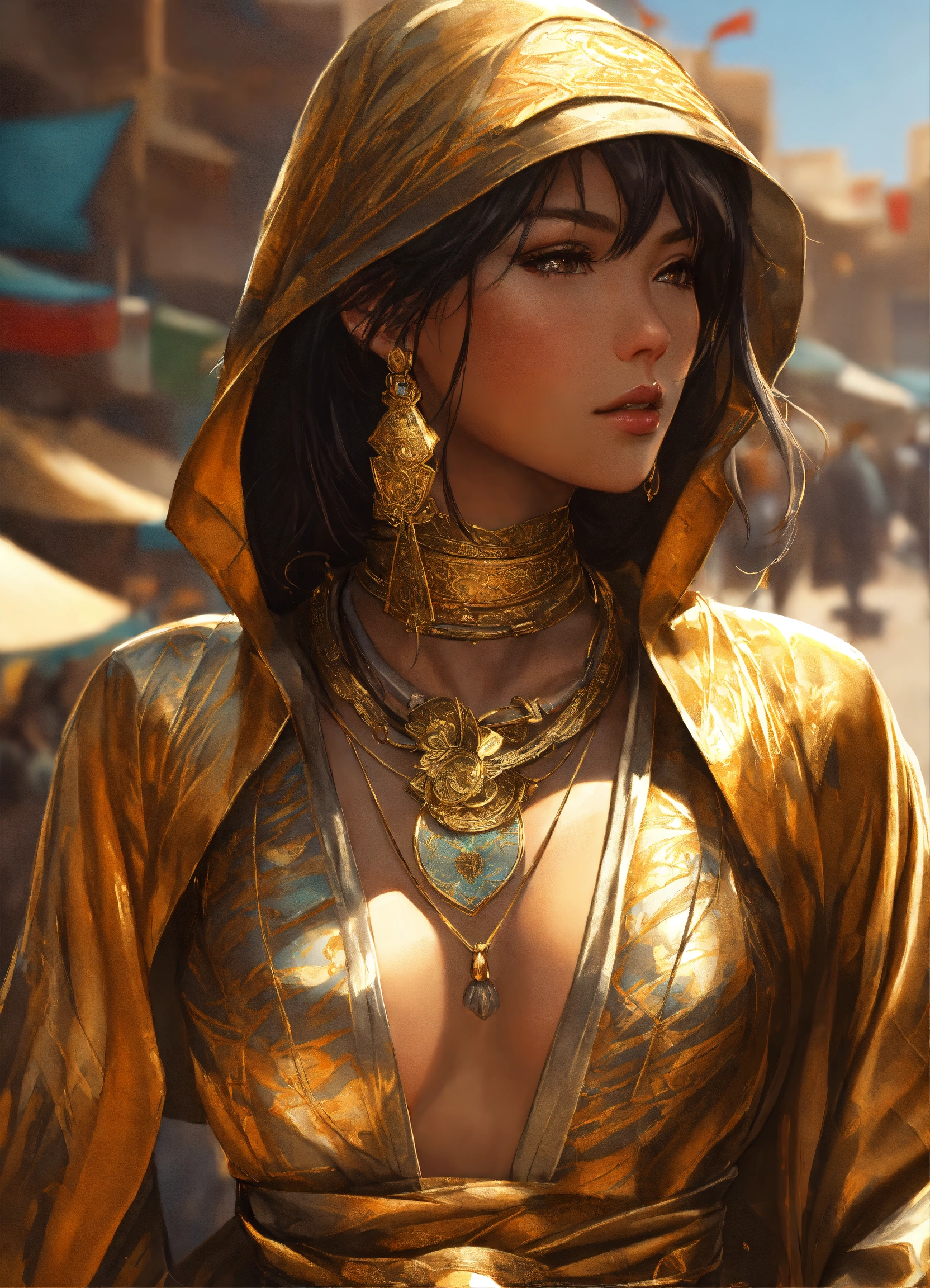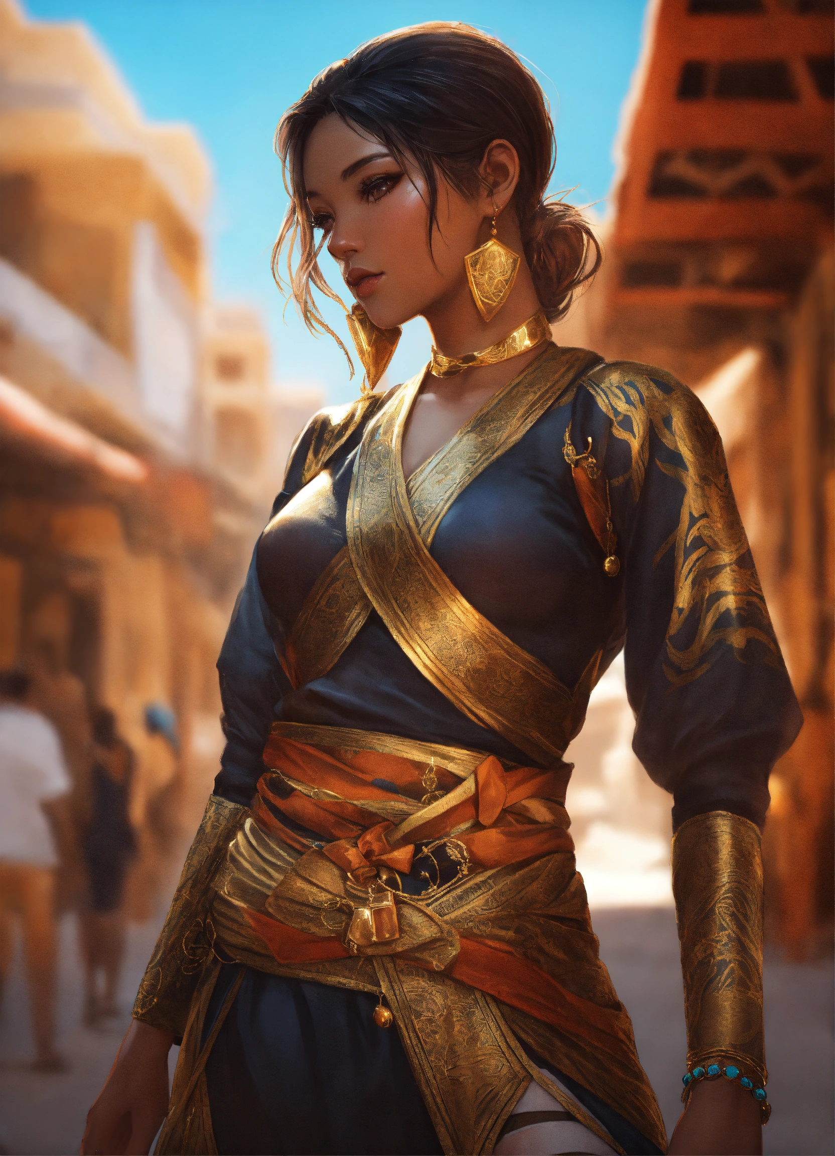 8k wallpaper of a mysterious kunoichi wearing gold jewelry in the streets of a city in the western sahara, by artgerm, intricate detail, trending on artstation, 8k, fluid motion, stunning shading, by wlop