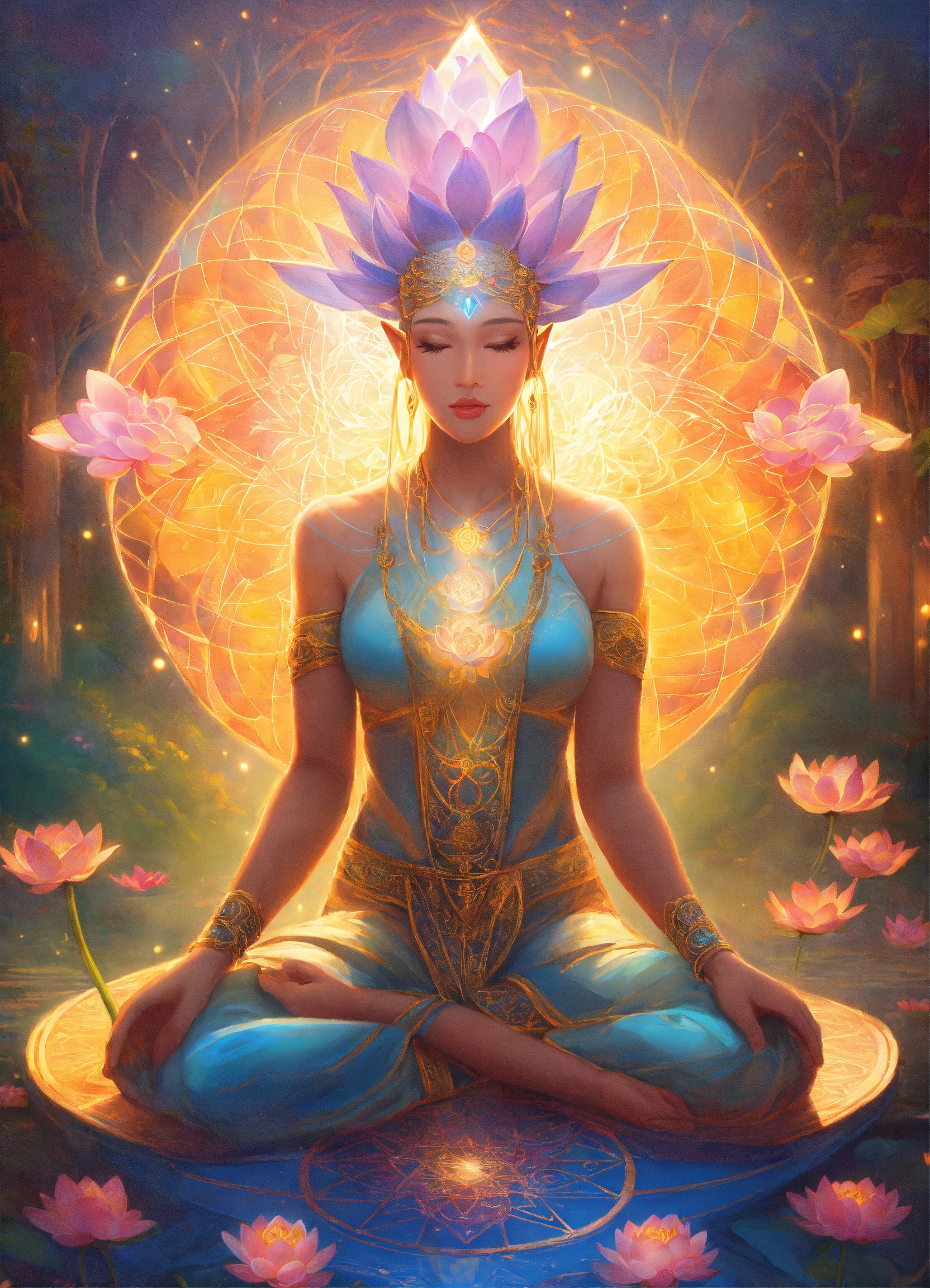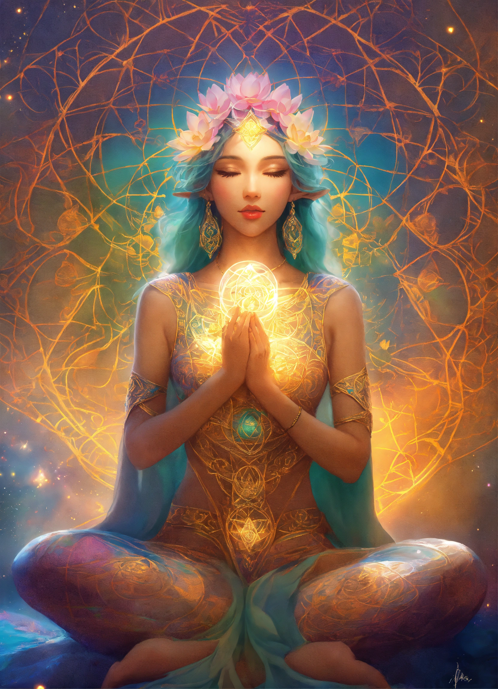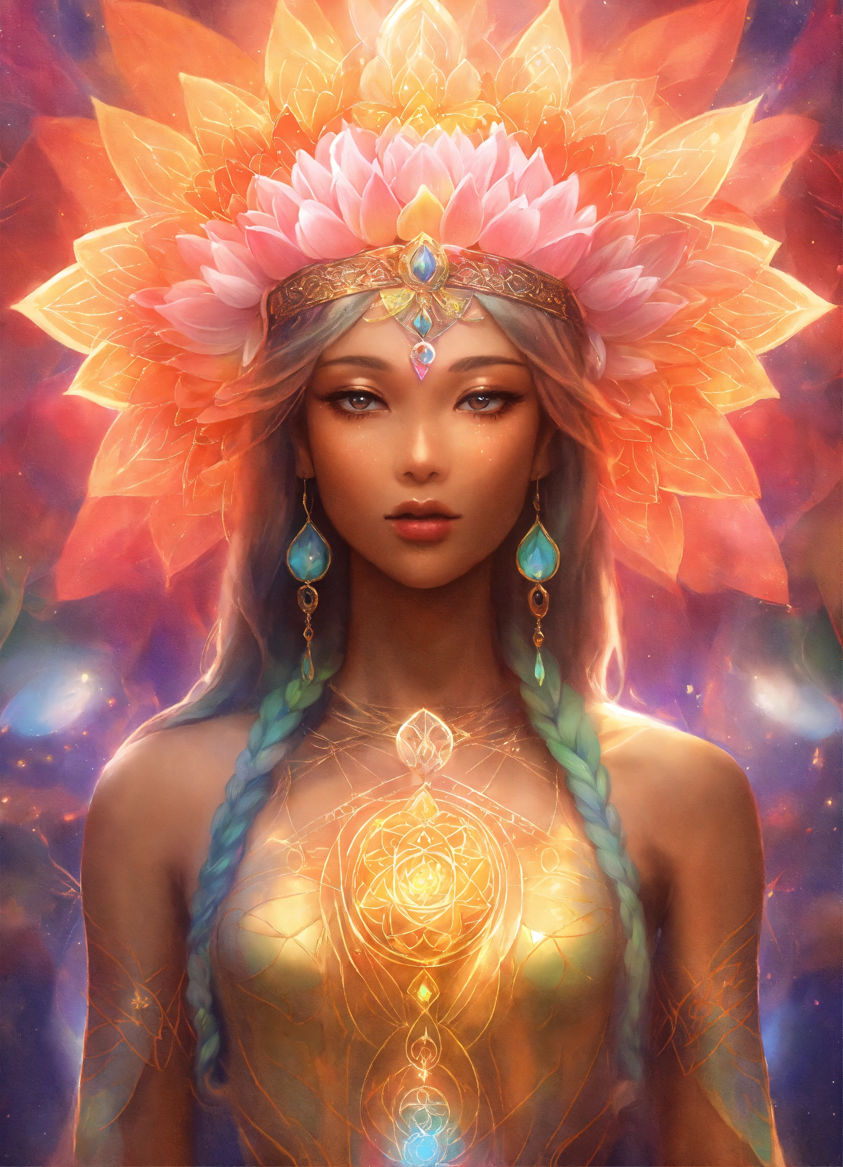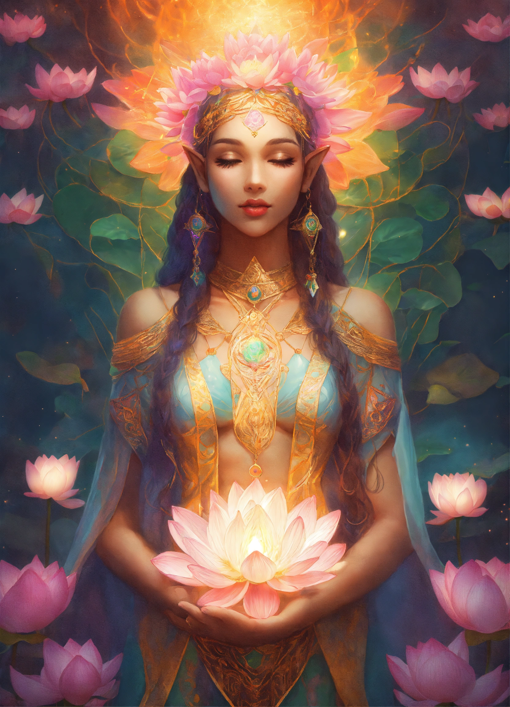Elf goddess of lotus flowers, multi cultural beautiful, arms open, symbole spirituel, adn, connected to other universes, to the invisible worlds, pastel colors, shinning light, sacred geometry