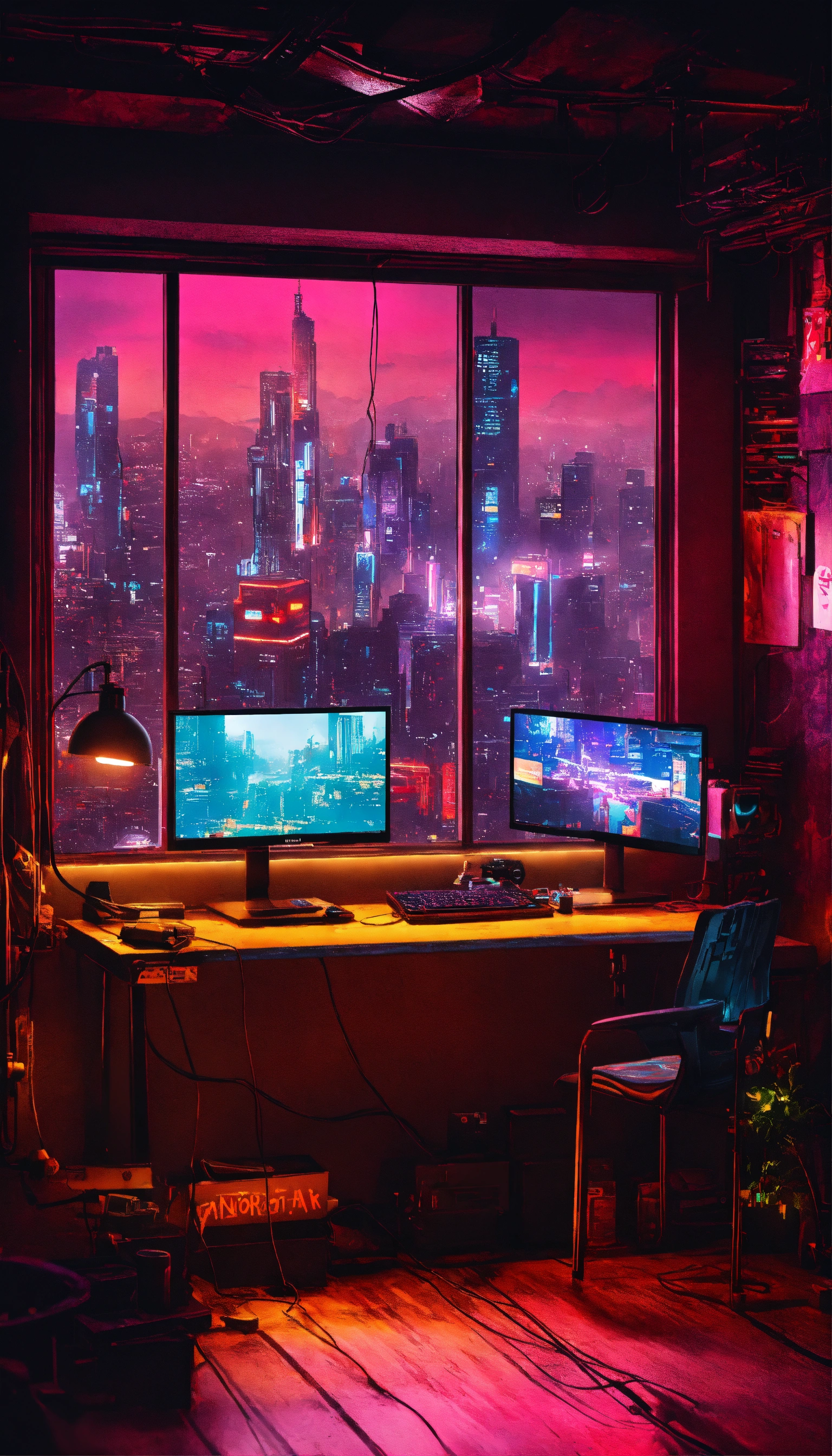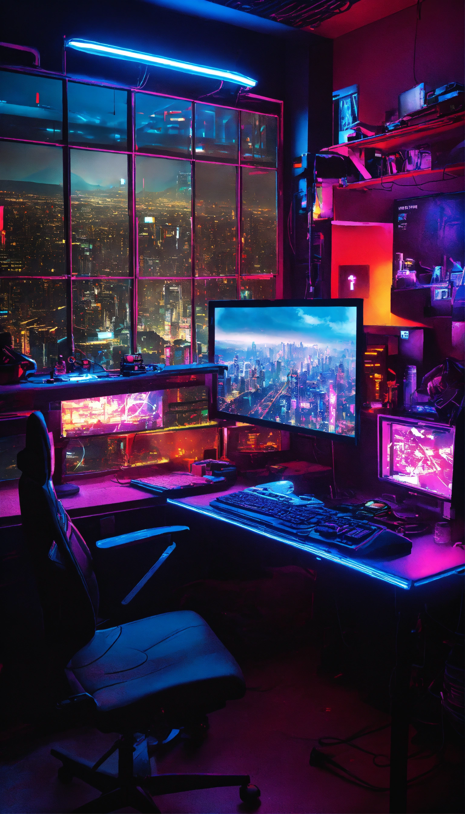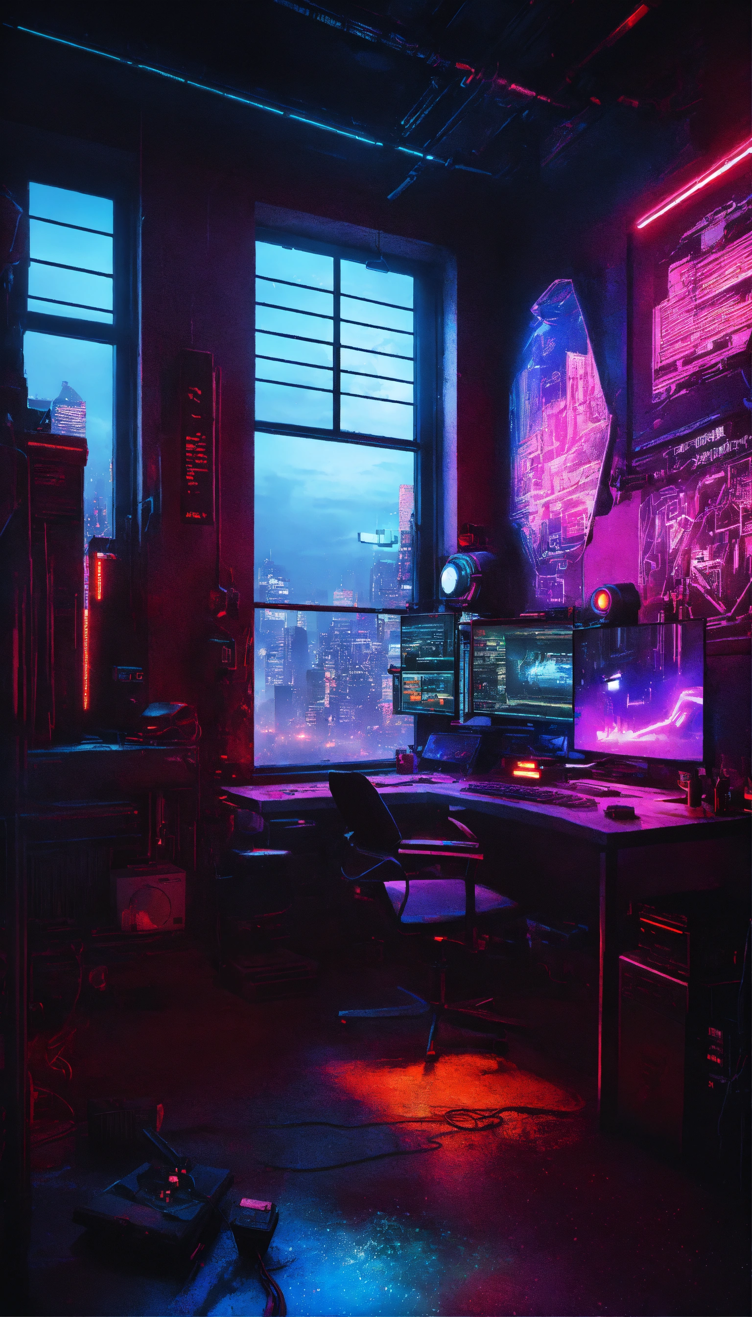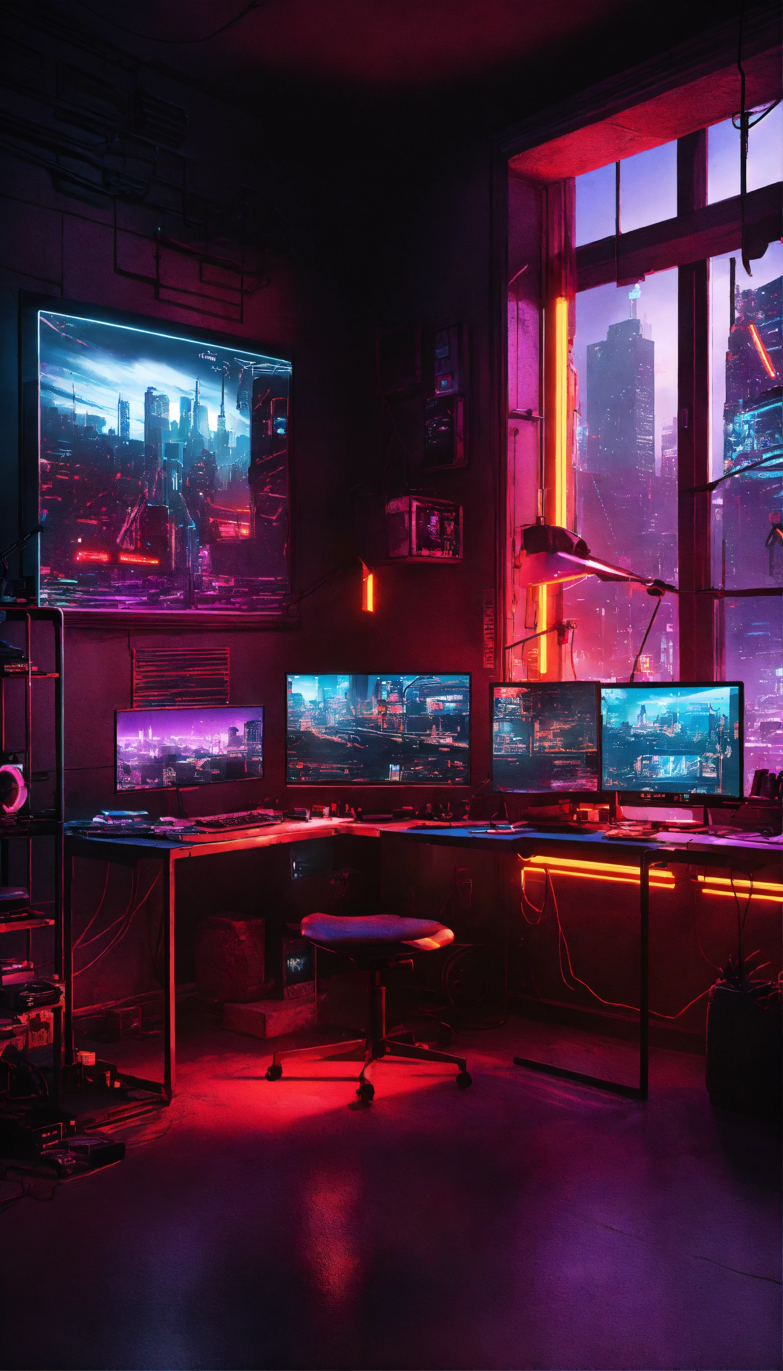 A cyberpunk room with a pc setup that has a stark aesthetic. start with a dark, metallic desk where an led-lit pc resides, a beacon of neon light creating a mix of shadows and brightness. project screens hover in the air as cutting-edge tech, while gritty graffiti decals pepper the walls to set the gritty urban mood. for more immersion, position a wall-sized poster of a cyberpunk cityscape to mimic a window view, amplifying the futuristic feel. play with the contrasts of neon lights and deep shadows to hit the perfect striking cyberpunk atmosphere. cityscape for your window view. remember, focus on rich details, and play with light and shadow to enhance the atmosphere.