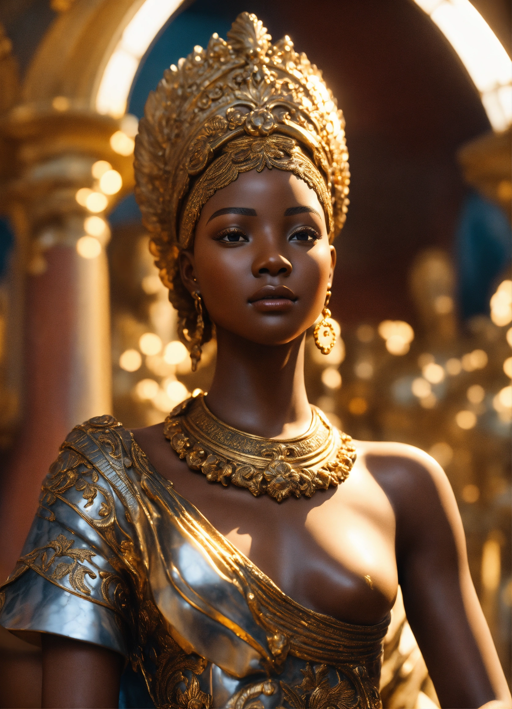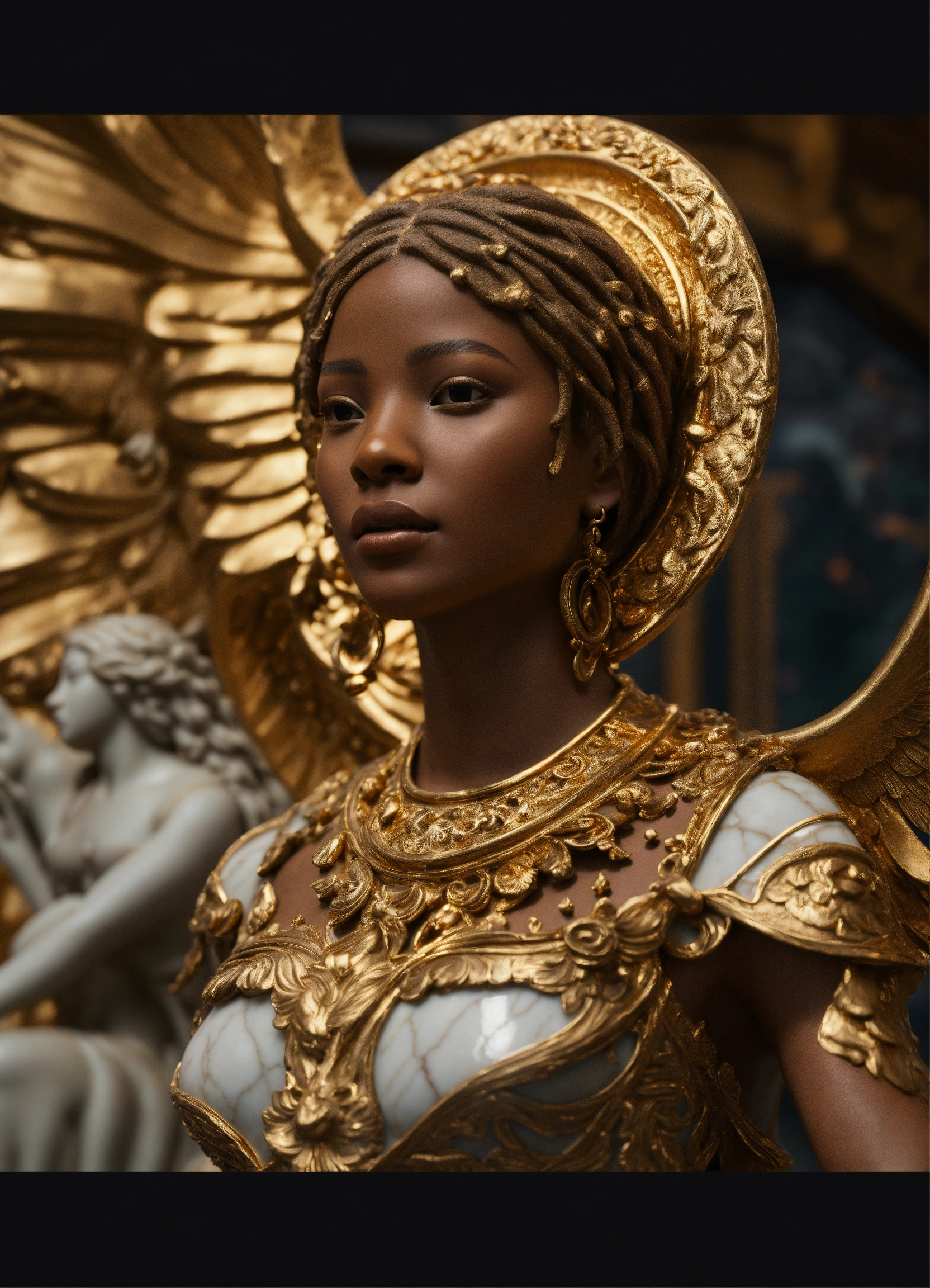 African with african facial features, halle bailey, marble and gold statue of a goddess with angels, renaissance art, hyperdetailed, 8k, hyperrealistic, close up, intricate details, masterpiece, unreal engine render, stunning lighting, beautiful shadows