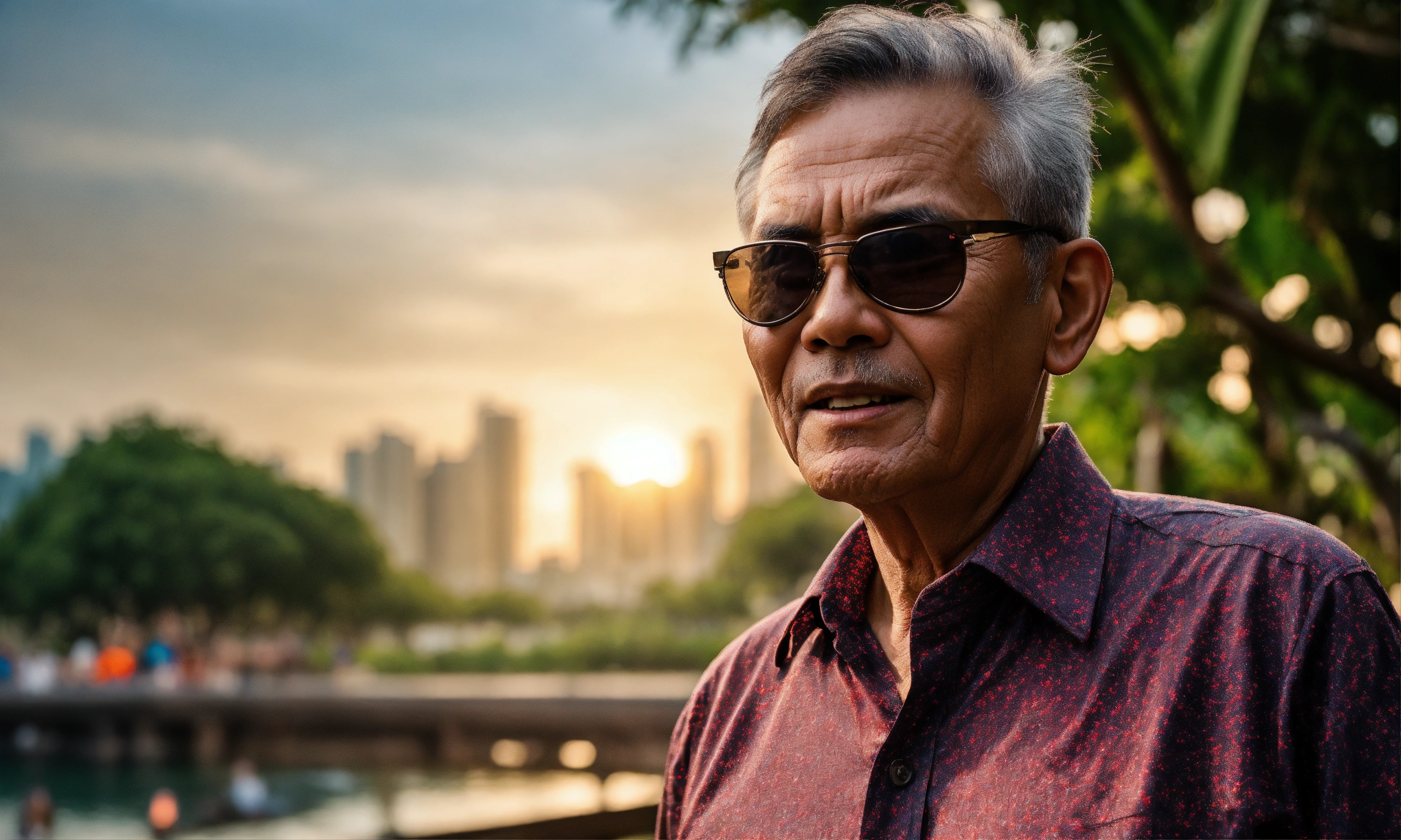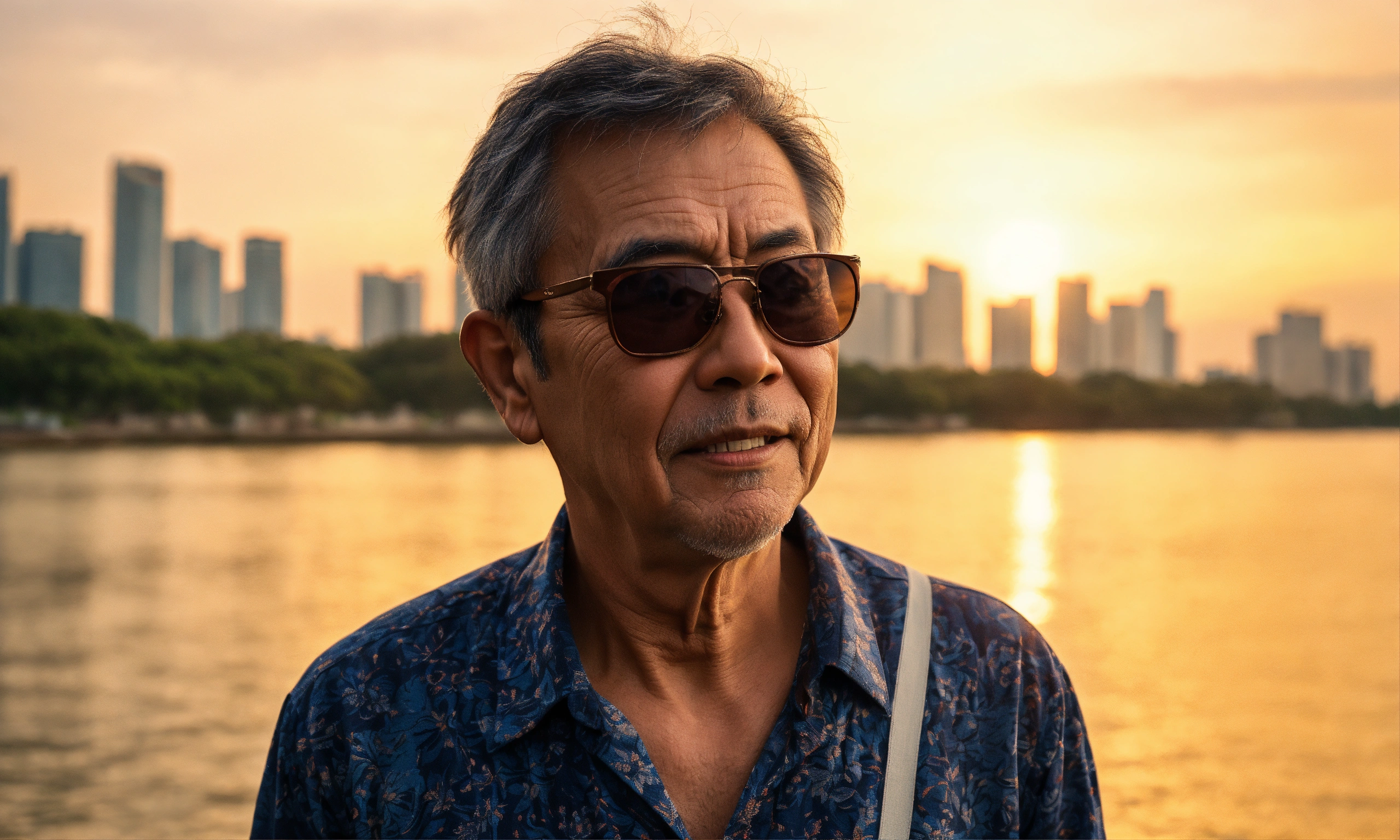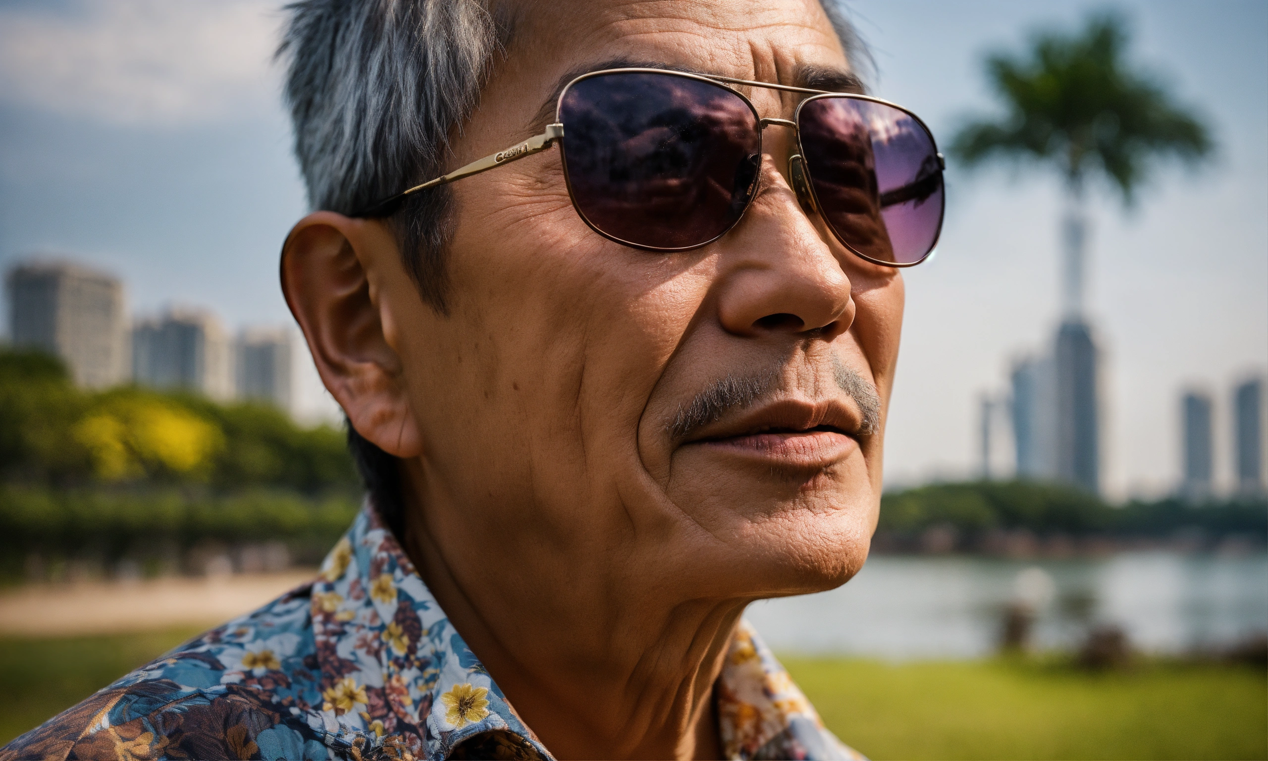 Afternoon sun, ultra-realistic close-up photo of a blind 60-year old man standing with confidence and grace, singing a heart felt song, at singapore east coast park, cinematic quality, his face, etched with the wisdom of years, passionate, dressed with a buttoned-up shirt, slacks, and a pair of sunglasses covering his sightless eyes. behind him, the skyline of residential estates rises, a juxtaposition of the urban environment against the serenity of the park, themes resilience, the transcendence of music, the merging of urban life with nature's embrace. the image, captured with a lens emphasizing clarity and emotion, uses a film that intensifies the scene's rich contrasts and deep hues, captured with a canon eos r5 using a 24mm f/1.4 lens, the scene emphasizes the complexity of emotions on her face