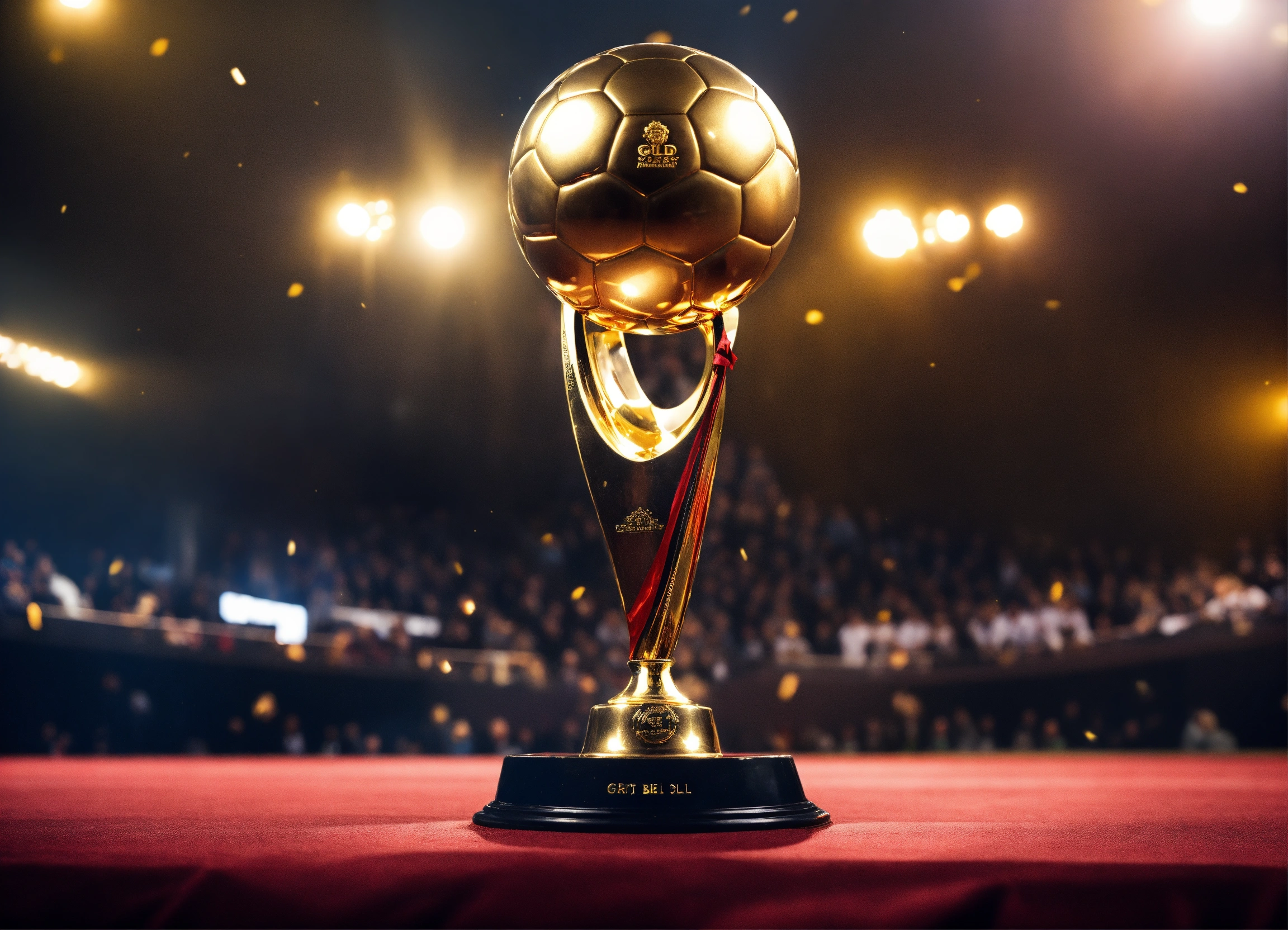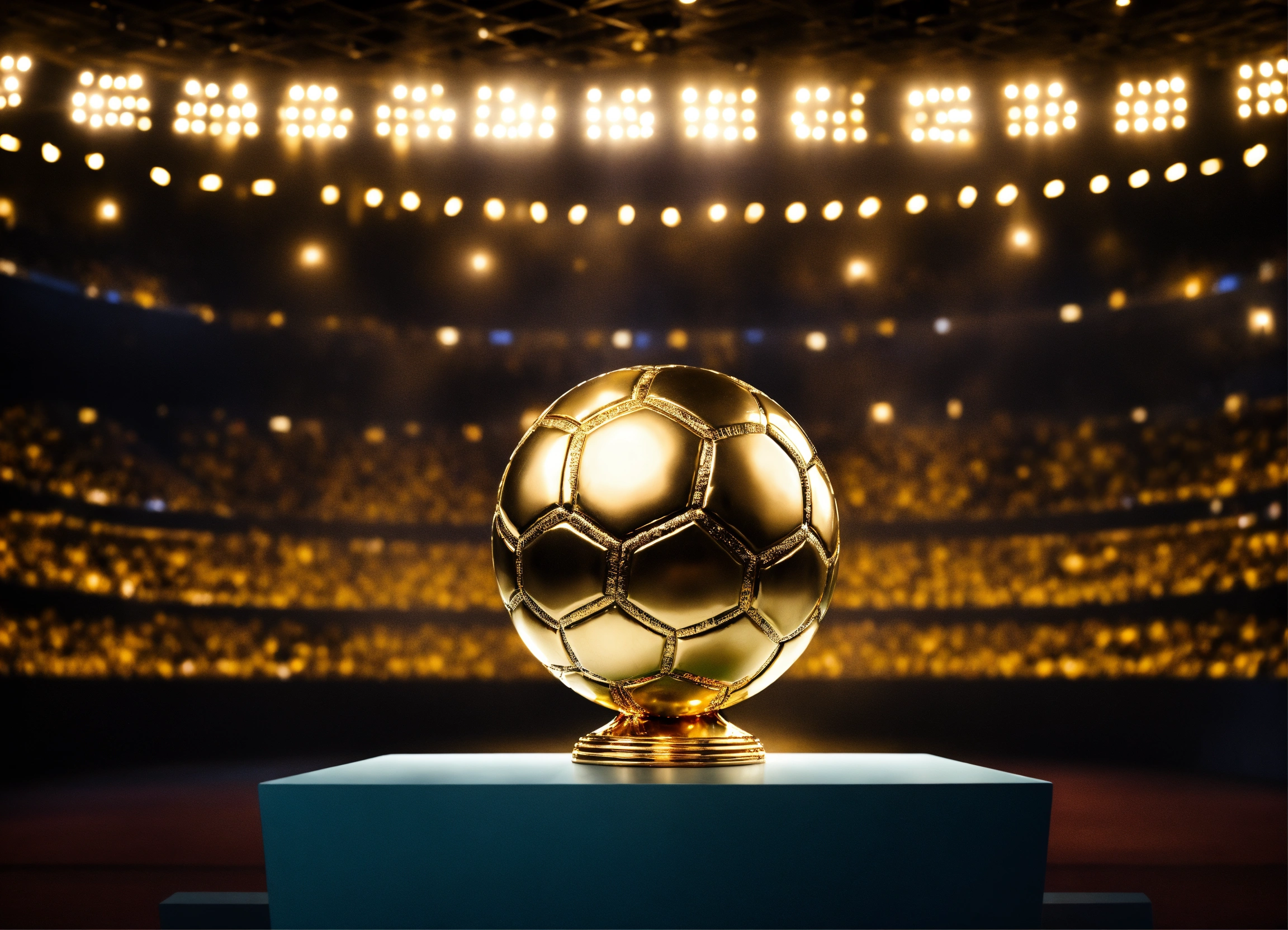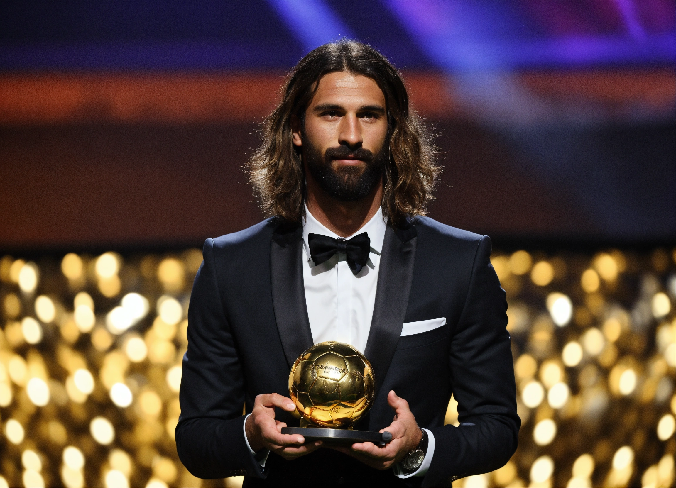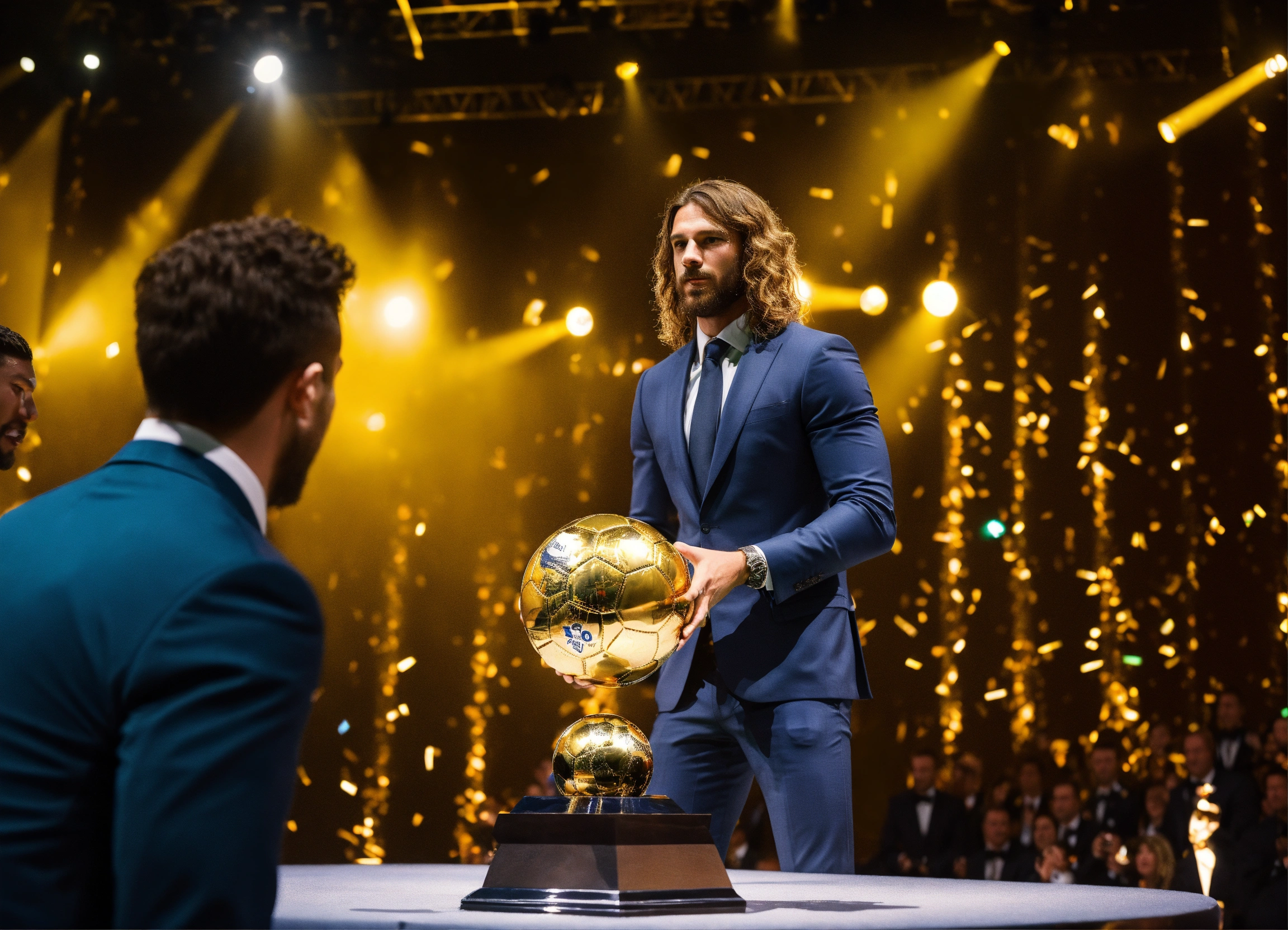 Awarding the golden ball to the best football player, on stage, half of the body is visible, a man in a suit, long hair