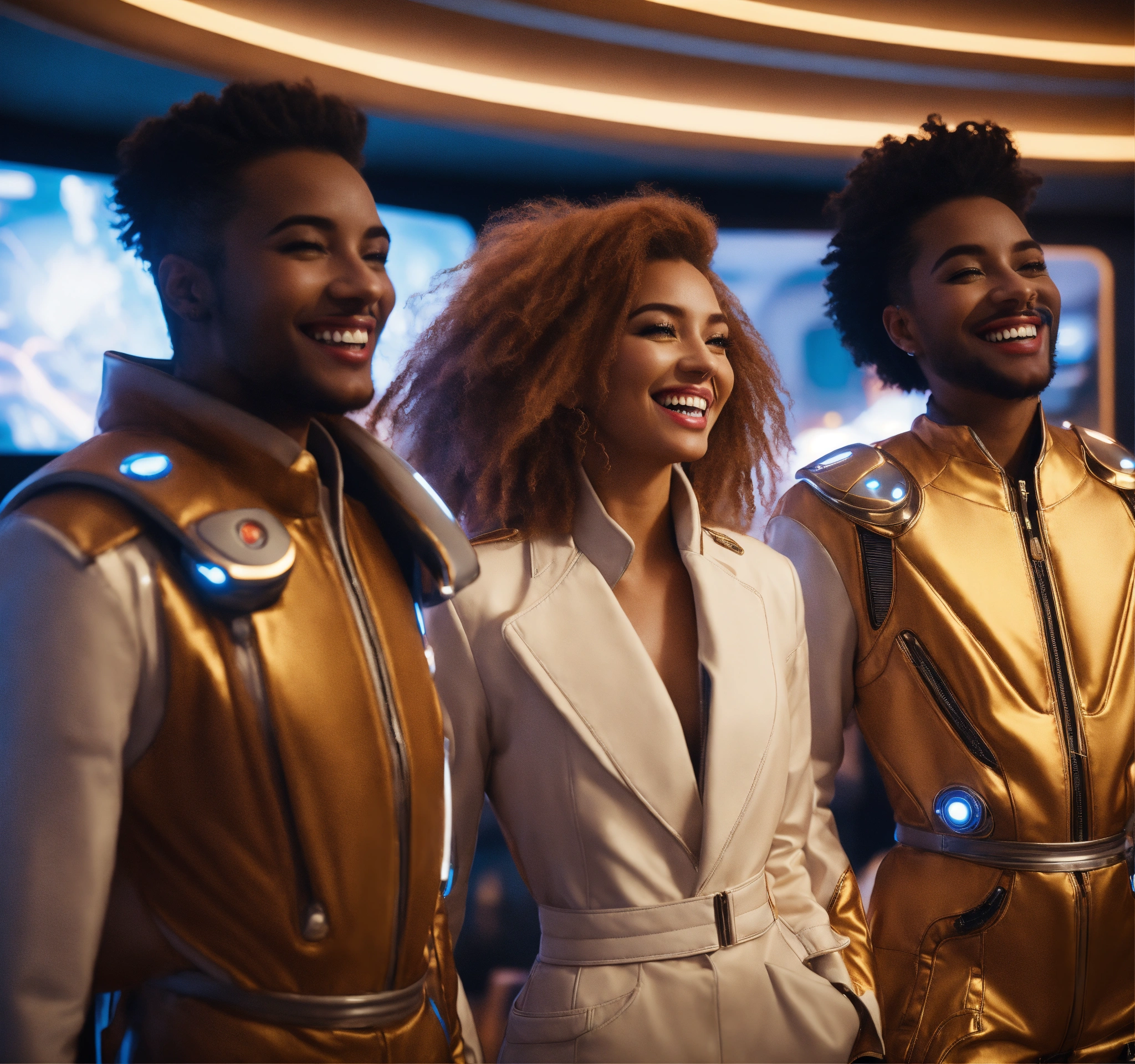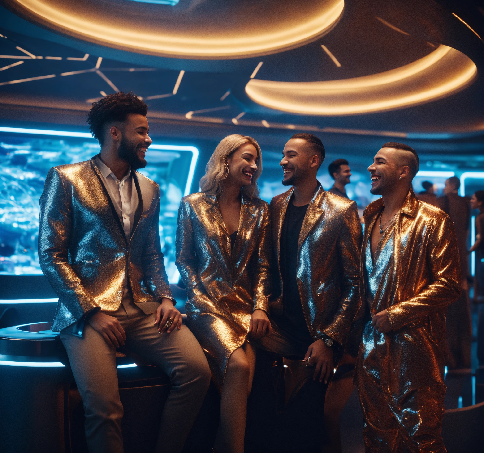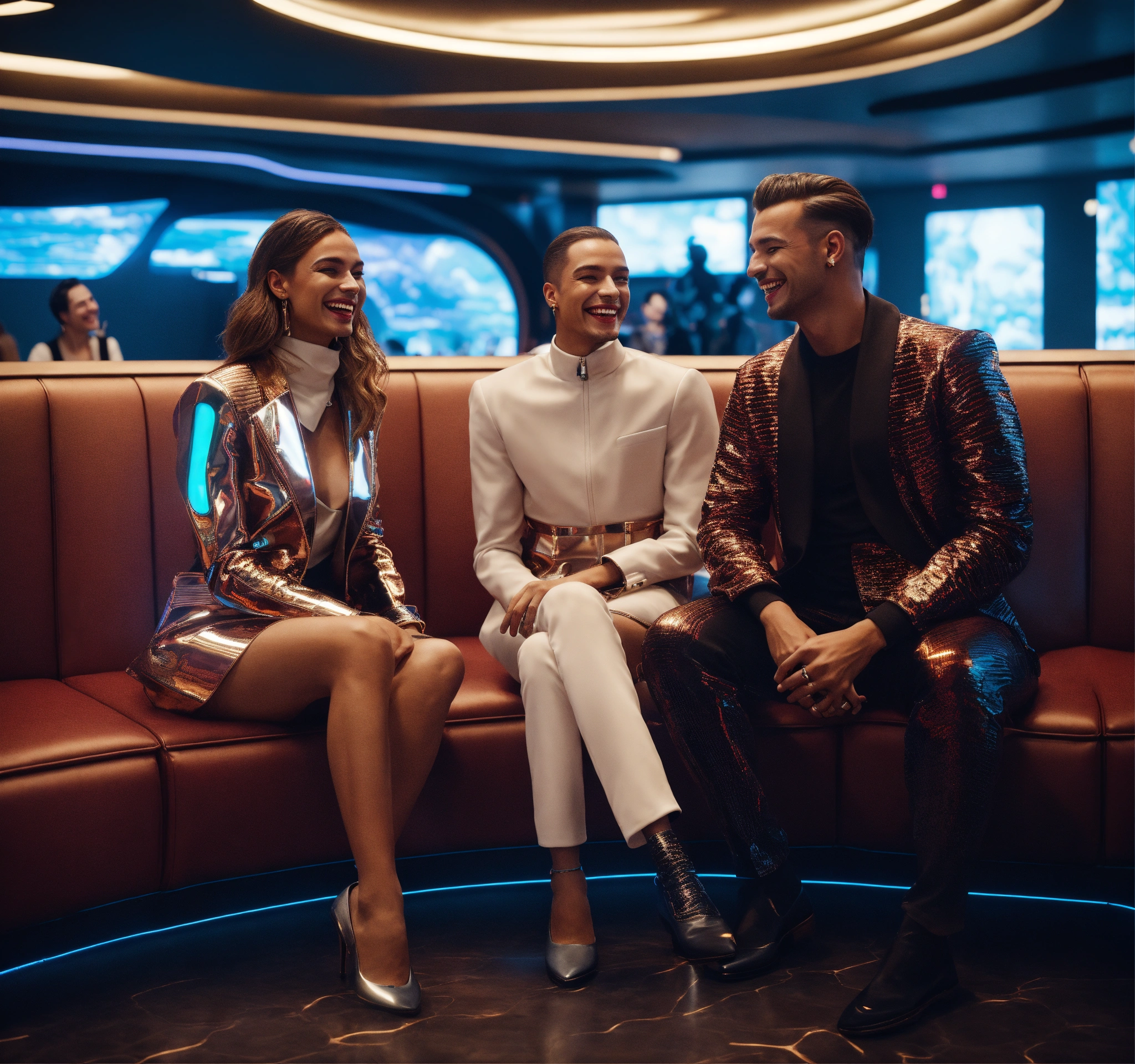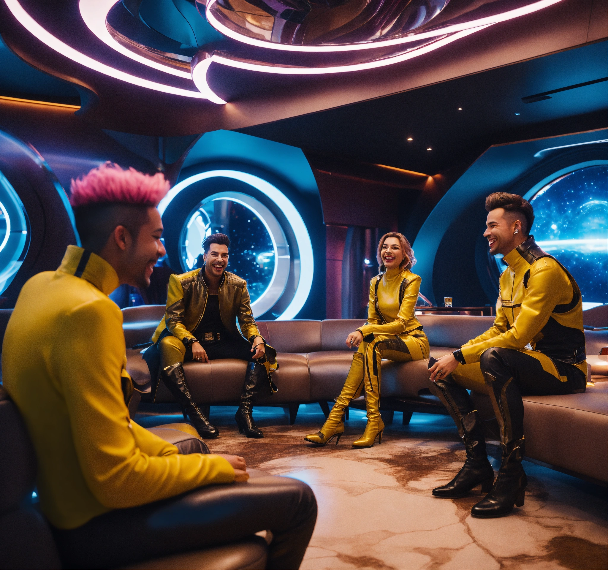 Close up of 5 beautiful male and female travelers wearing stylish futuristic clothes that are laughing and having fun and relaxing in a luxurious space port hotel lounge reception area, realistic, futuristic, sci-fi, 8k, unreal engine, pixar, disney, zaha hadid