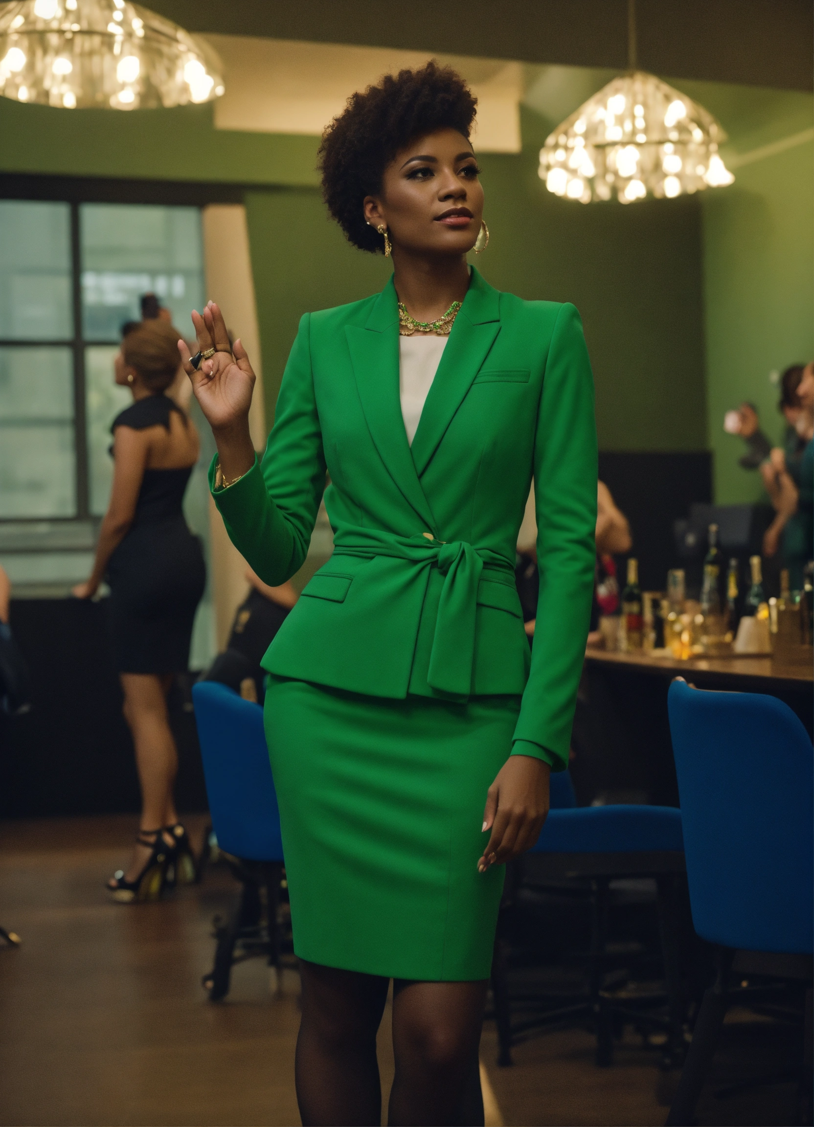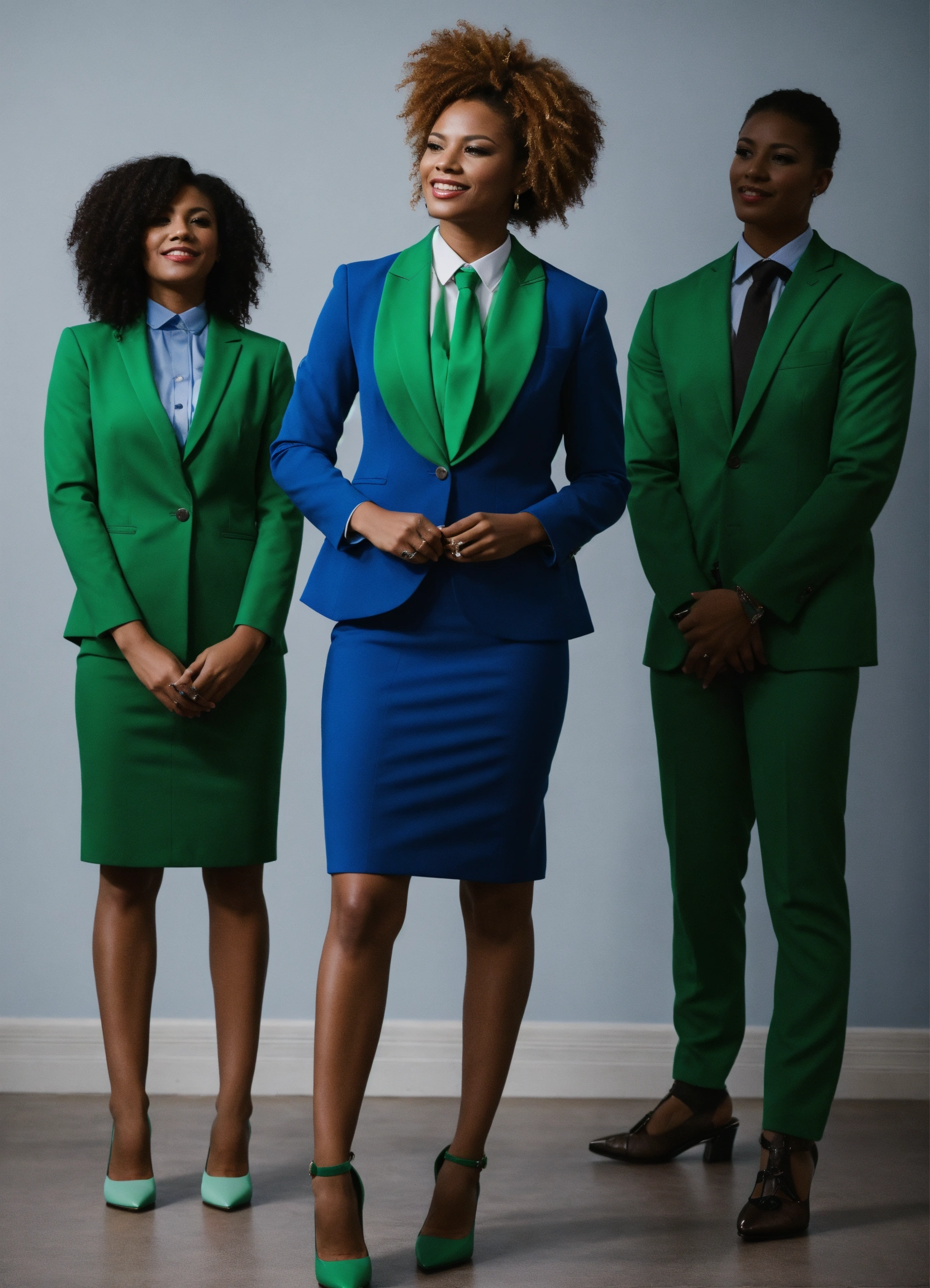 A genderfluid team member with their team applauding for them, high heels professional, business attire, inspiring, blues and greens, 4k
