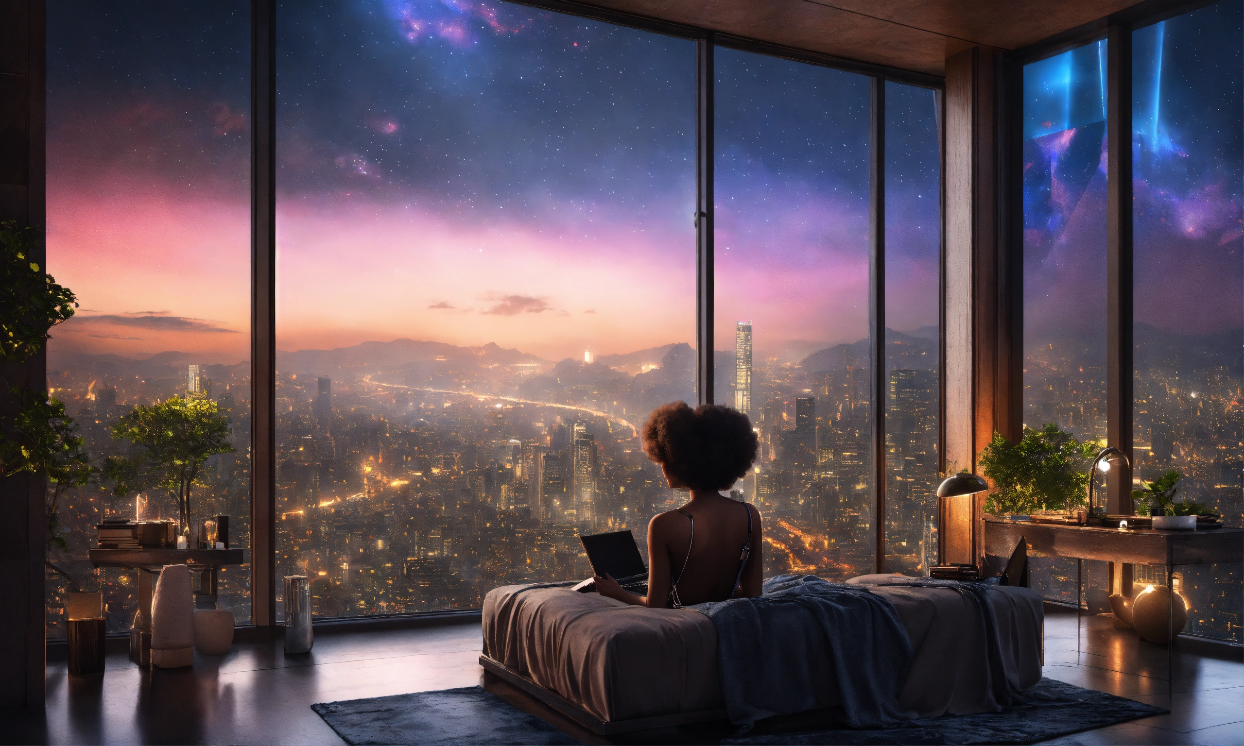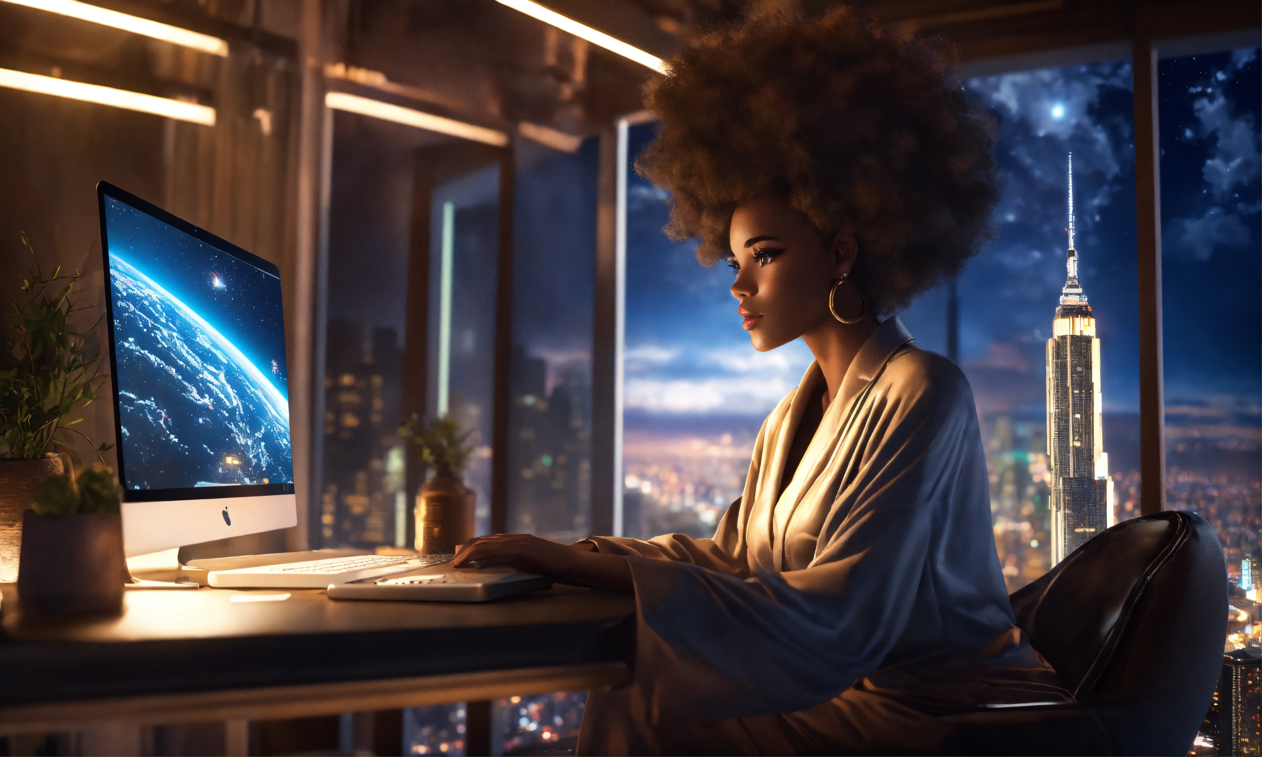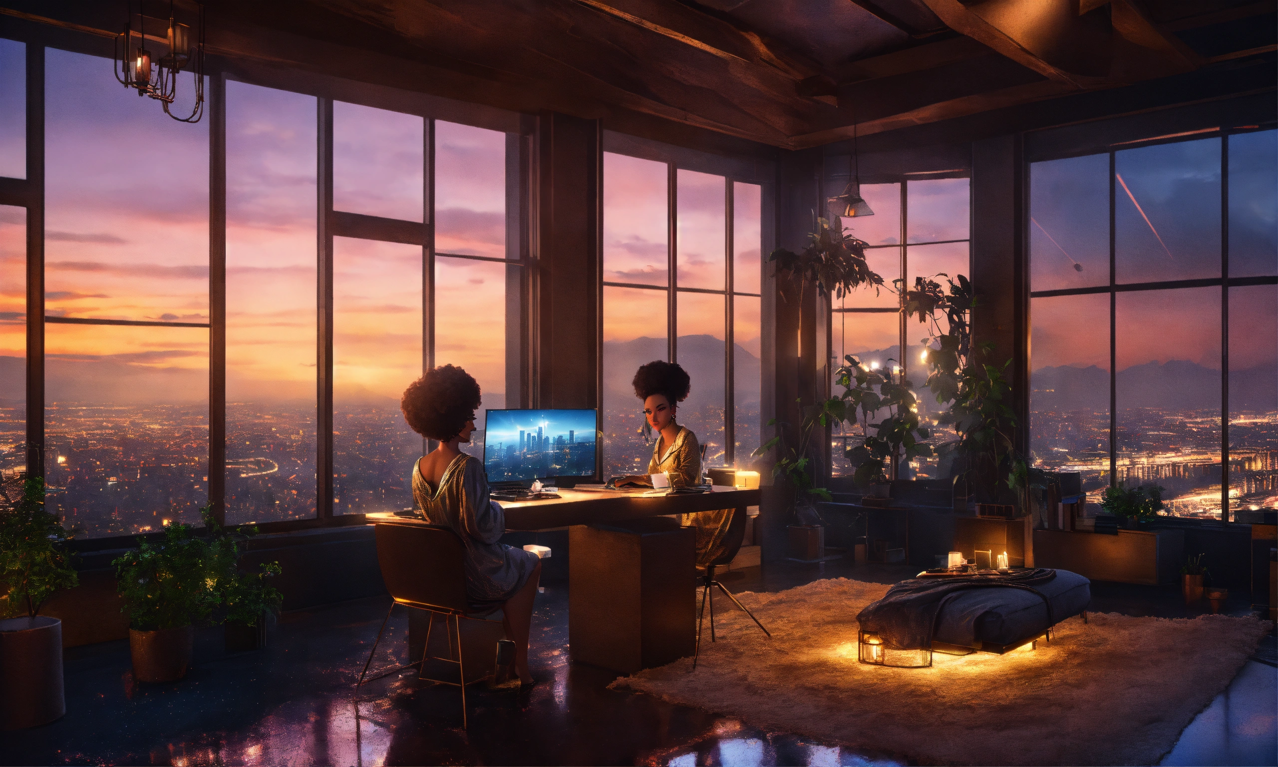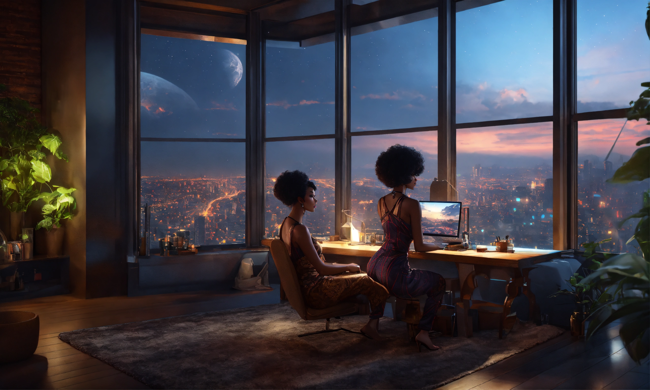 Professional gorgeous black women on laptop, dark-skinned, cozy pajamas, photo of lush luxurious loft with high windows and breathtaking view, home office, night sky, hyperrealistic face, bustling megacity, dark retrofuturism, afrohair reflections, vray, cgi render, gorgeous, raytracing, intricate