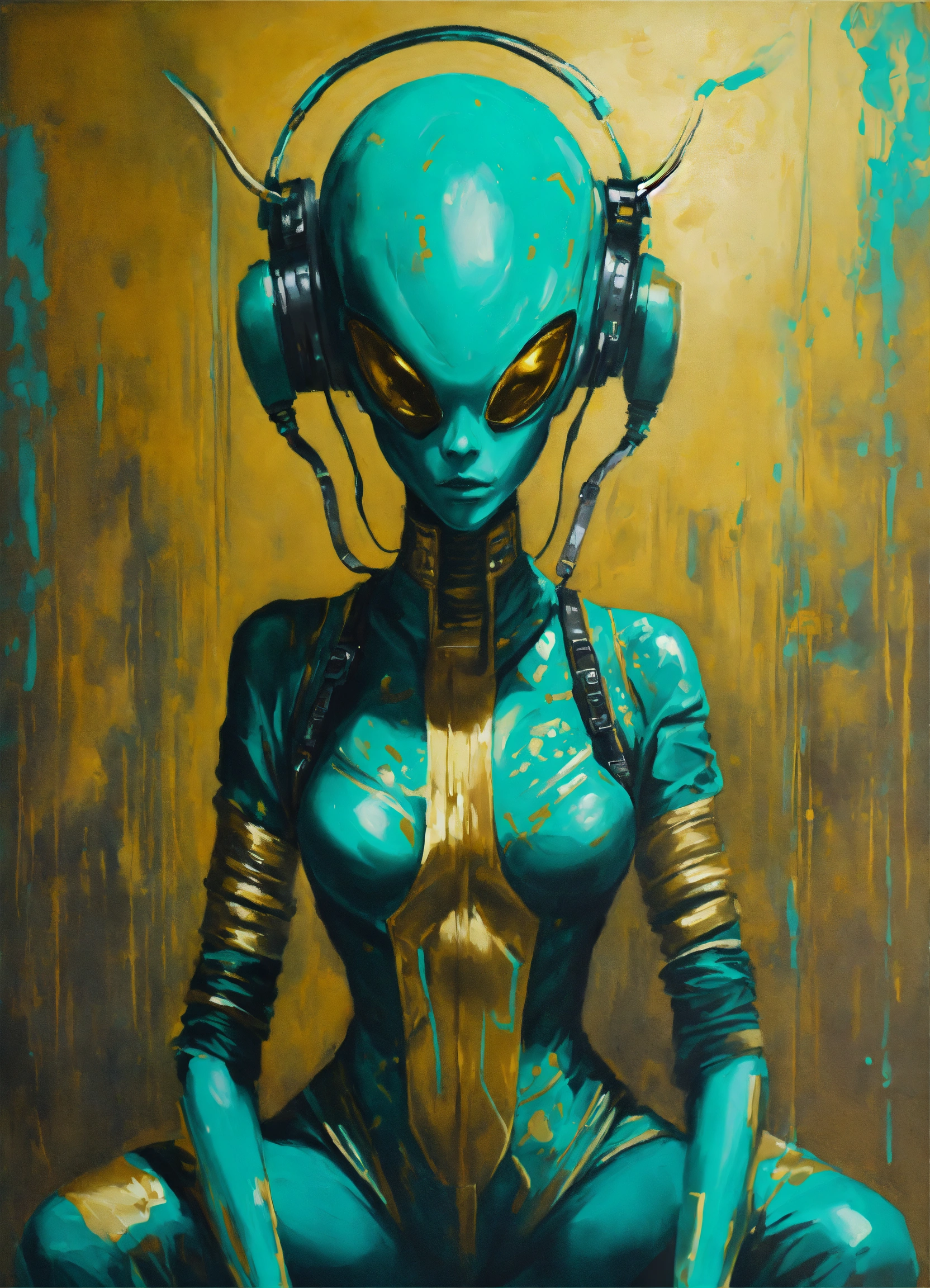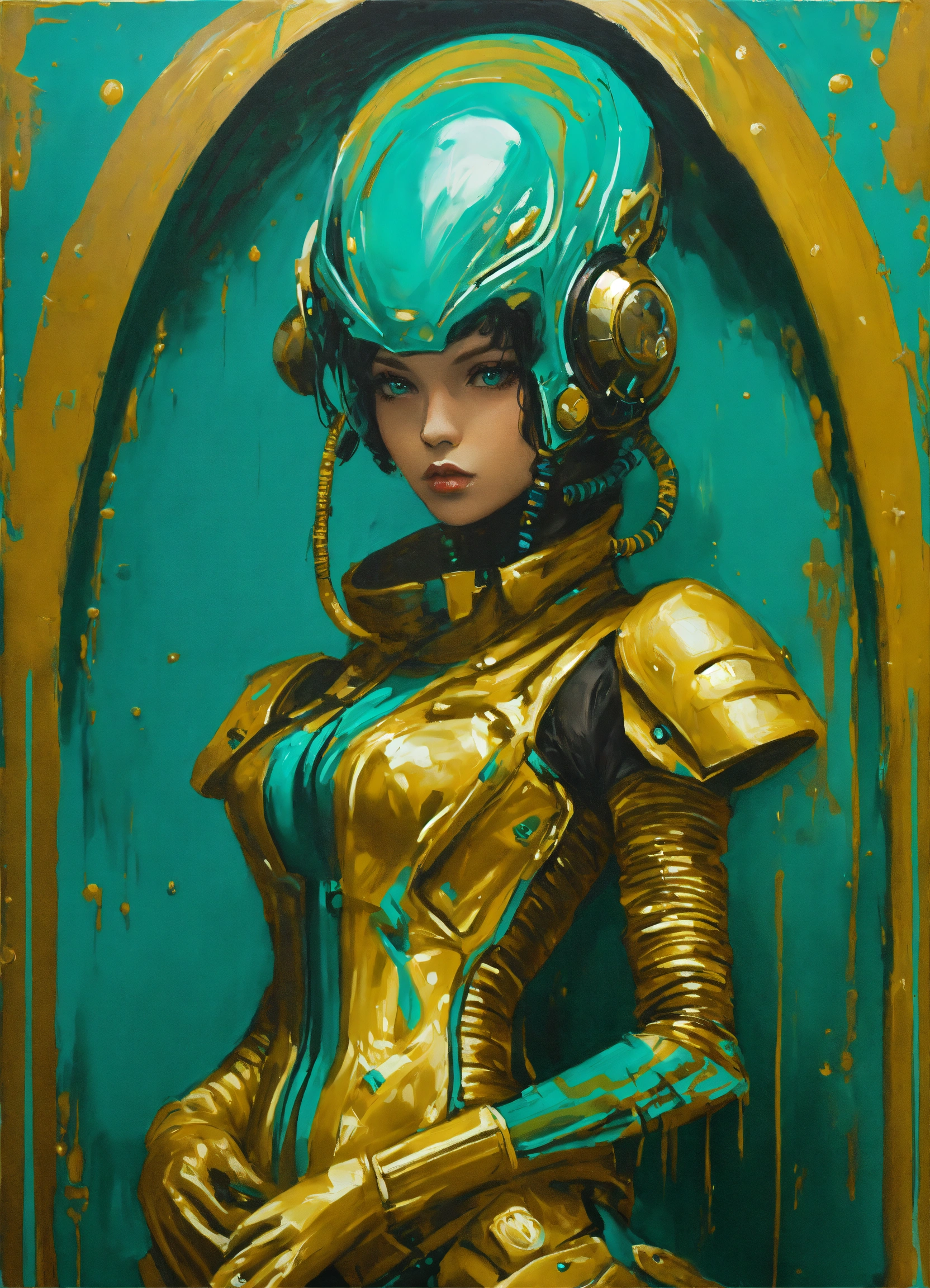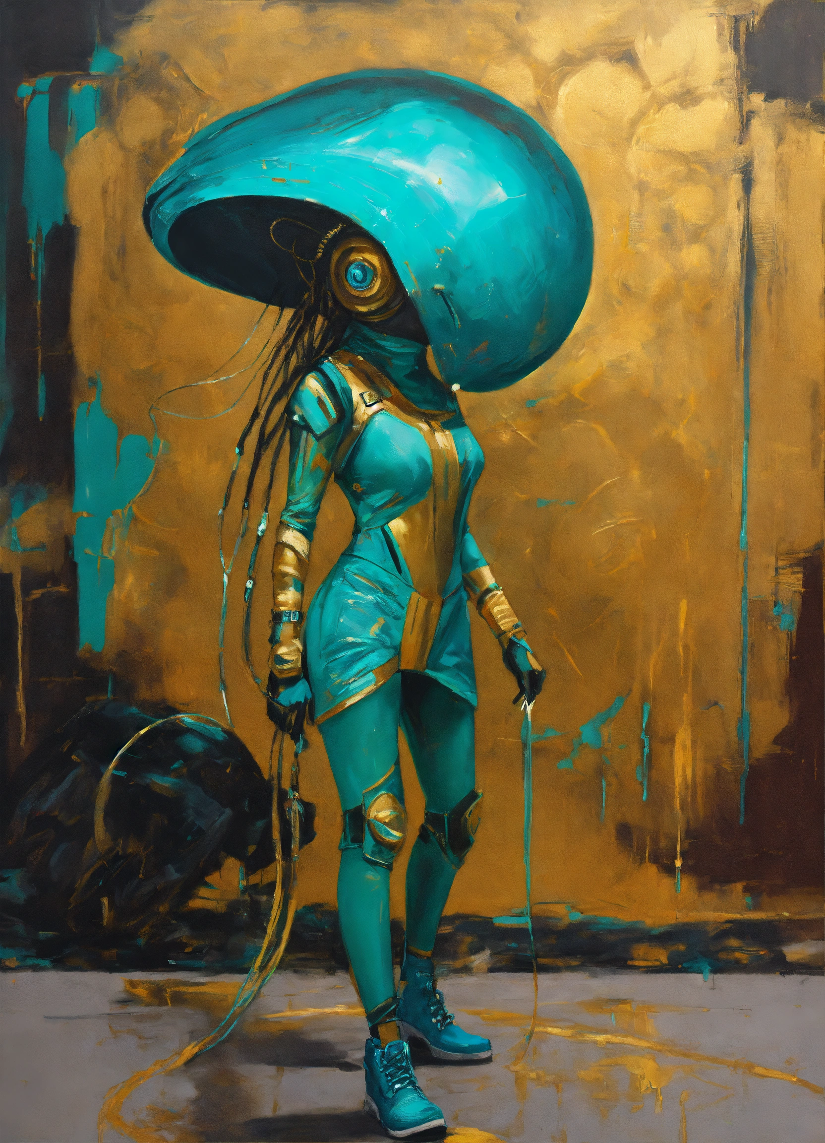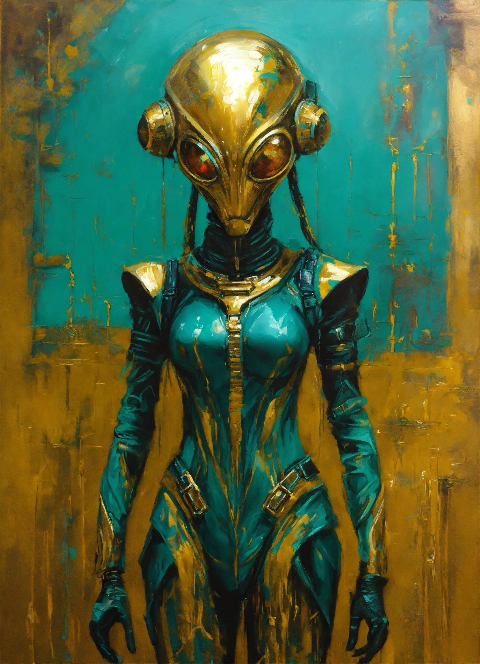 Alien race, full body wide shot cybergoth fashion clothings painting oel on canvas, in the style of teal and gold, heavy use of palette knives