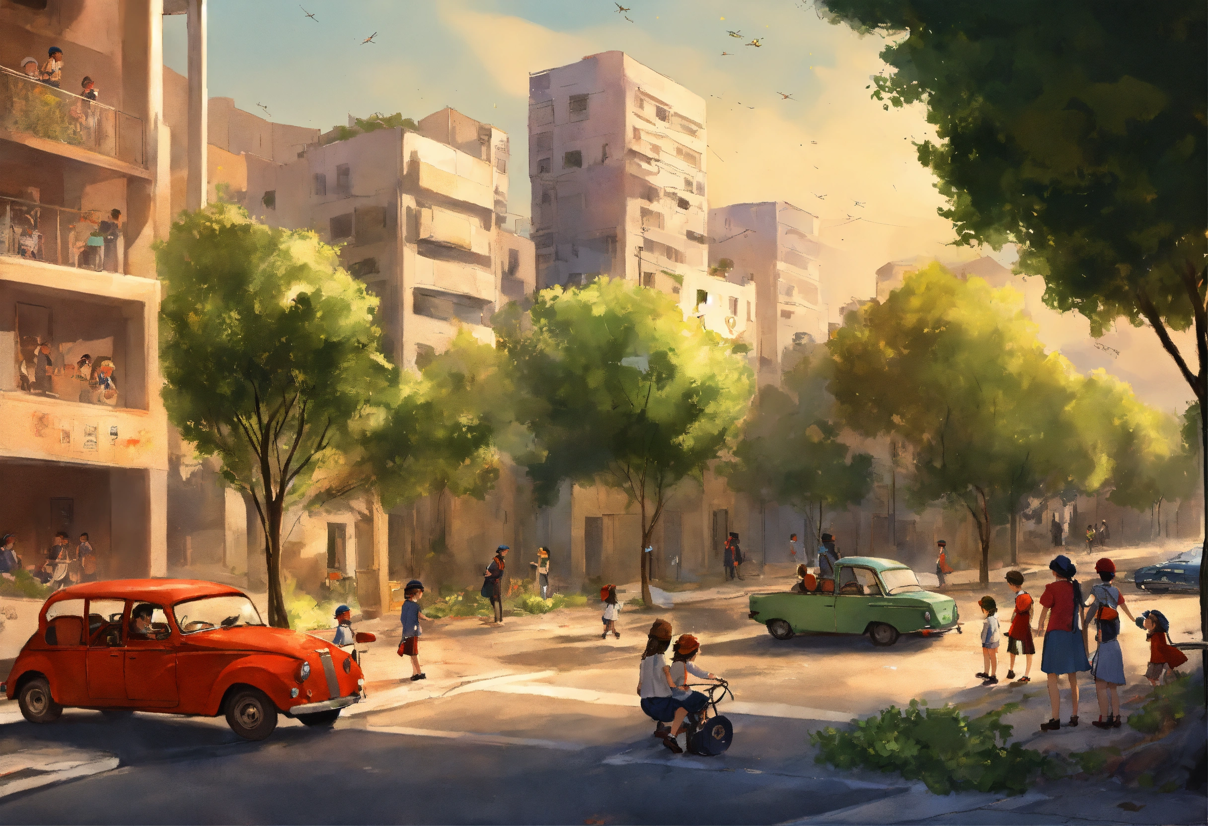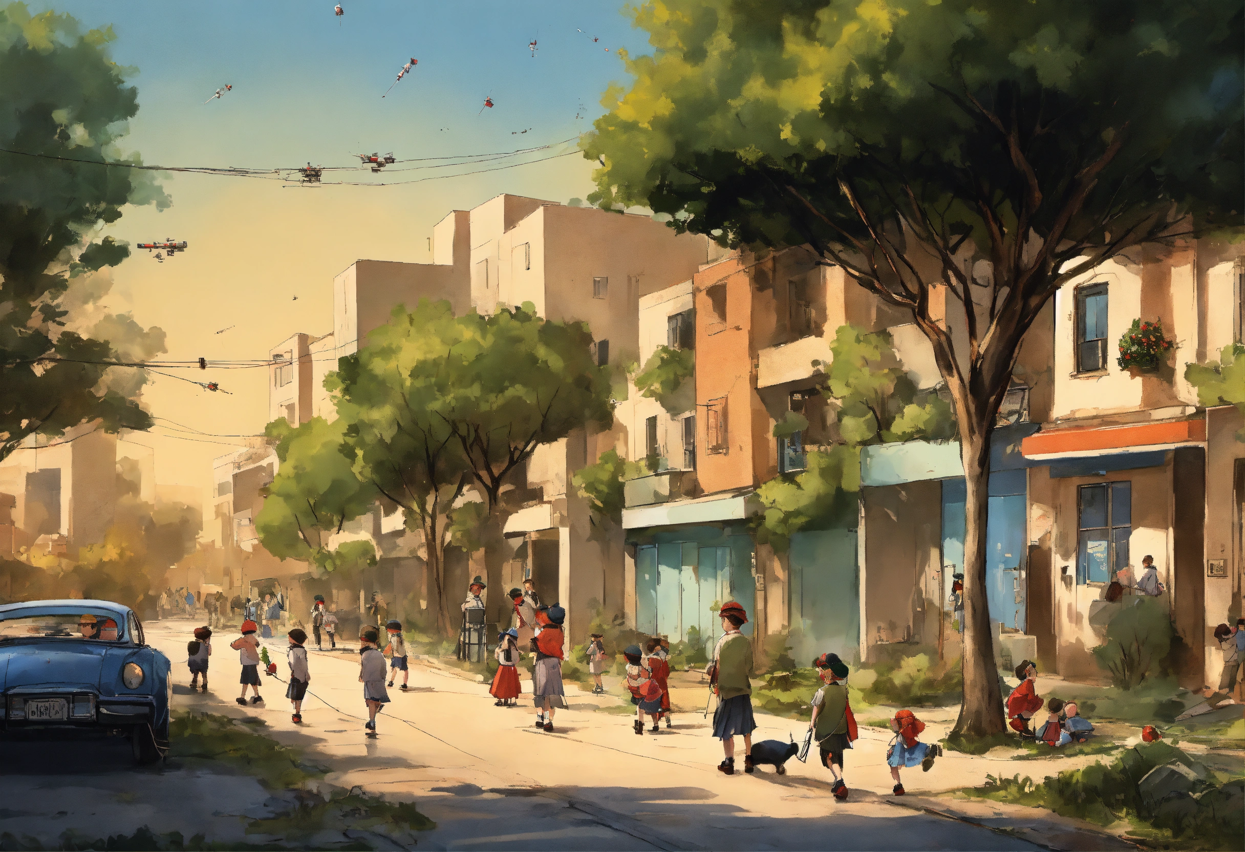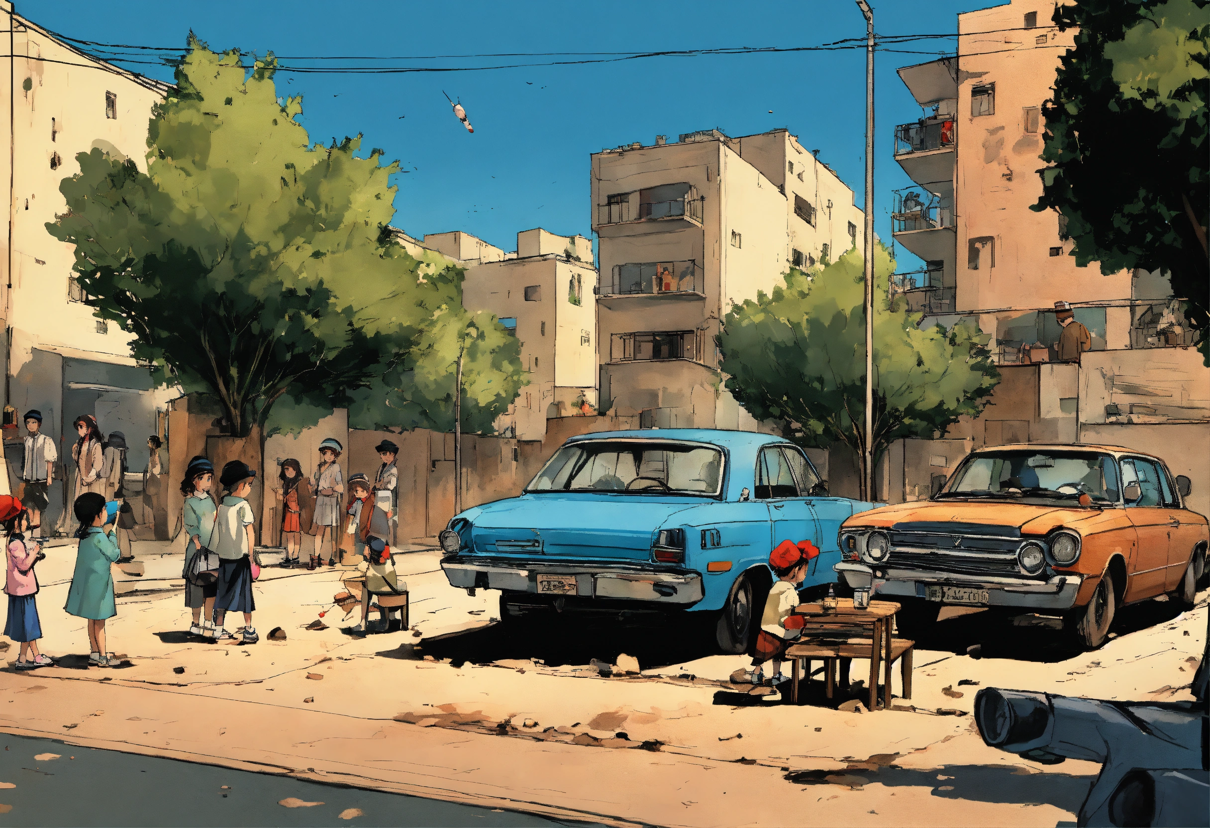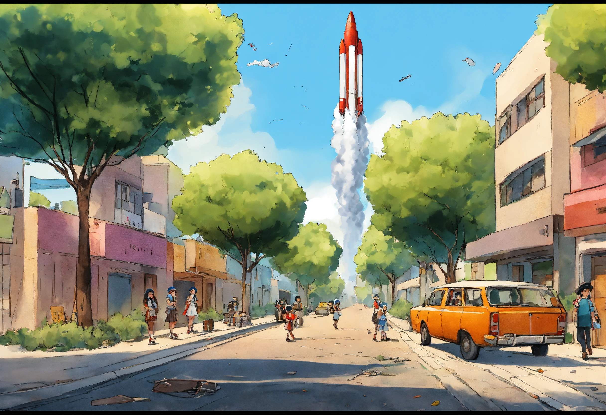 Comic illustration instructions the israeli perspective during a rocket attack definition modern israeli street scene with contemporary buildings, cars and greenery. the sky is supposed to be clear of day, but is disturbed with the ominous sight of incoming rockets. children of israel depicts several young children, both boys and girls. boys should wear kippahs (a traditional jewish head covering), while girls may have modest dresses or skirts. modern urban environment show parked cars, street lights, benches and trees. to emphasize the suddenness of the event, you can show a few items that have fallen to the ground draw it as a complete contrast to the peaceful street. the sky should be filled with smoke trails of incoming rockets, emphasizing the threat. the rocket trajectories should make it clear that they are aimed at the area where the children are one of the rockets falls and damages the street and the children cry