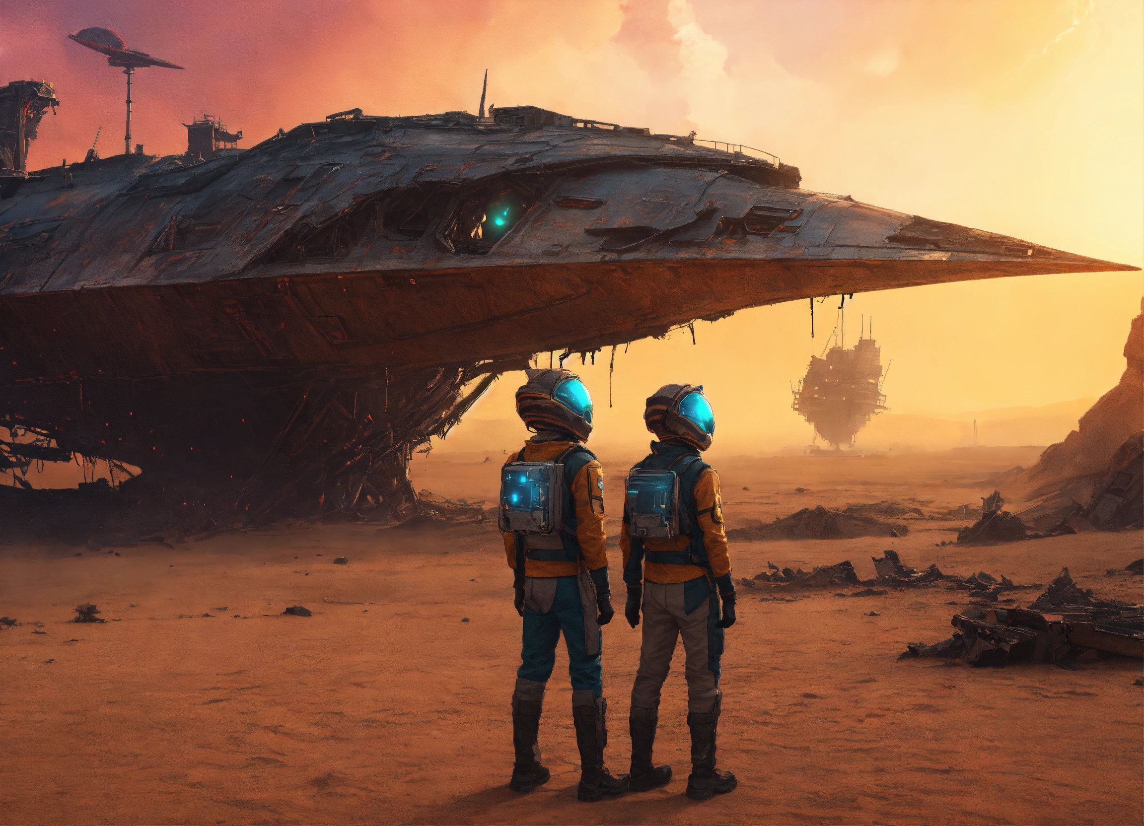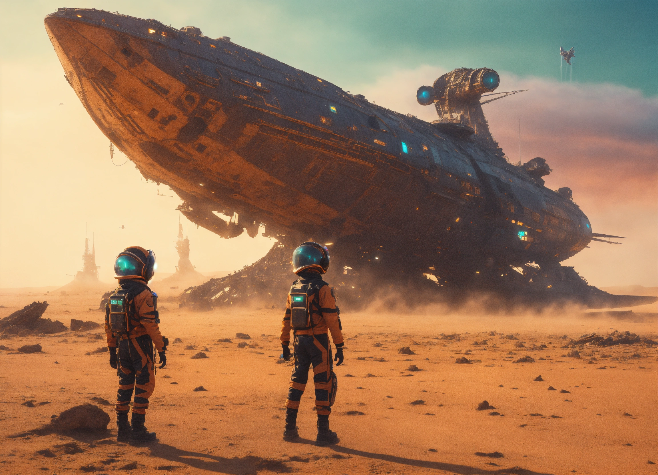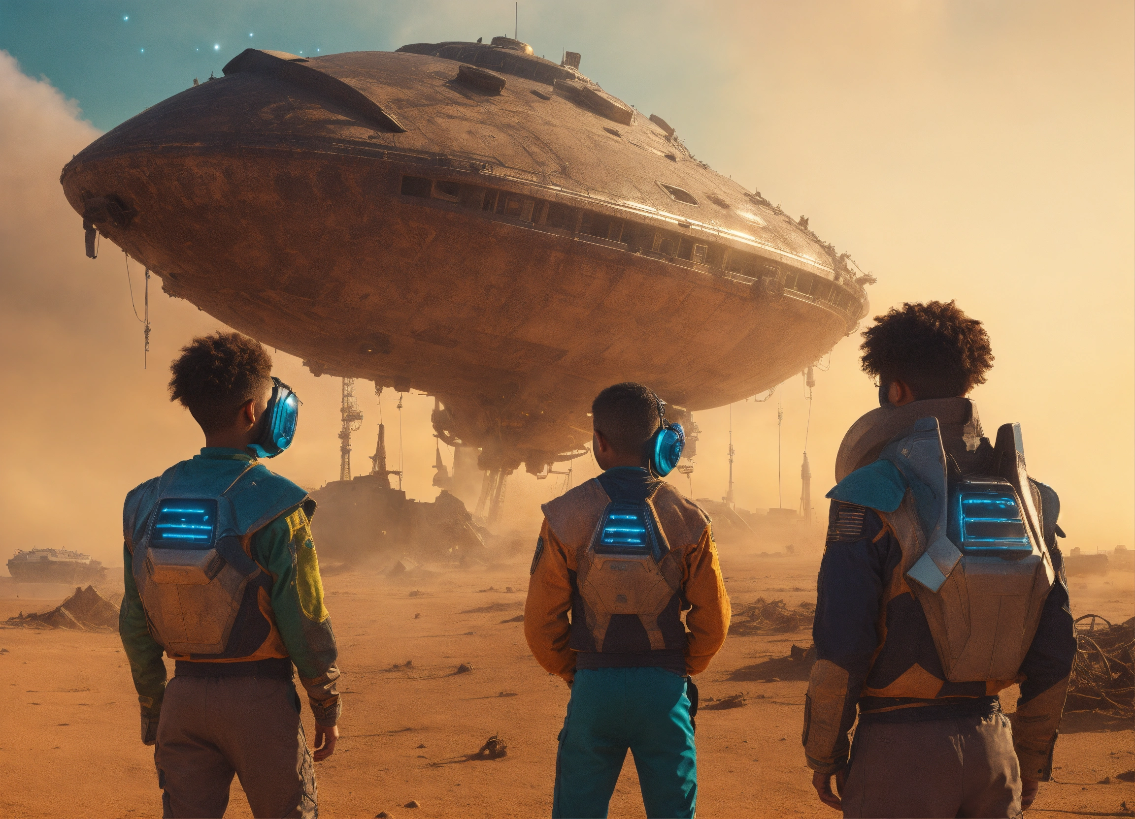 Zoom out of a 3 boys standing outside a wrecked star ship wearing detailed alien ear antennas with futuristic clothing, sandstorm, colorful sky, futuristic, sci-fi, realistic, 8k