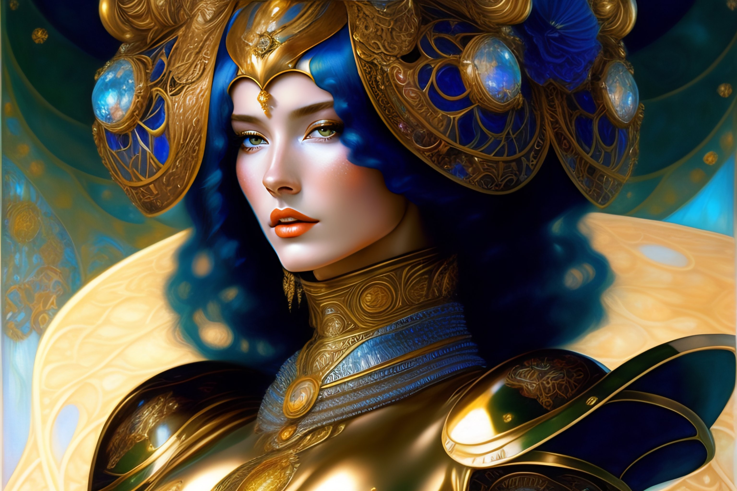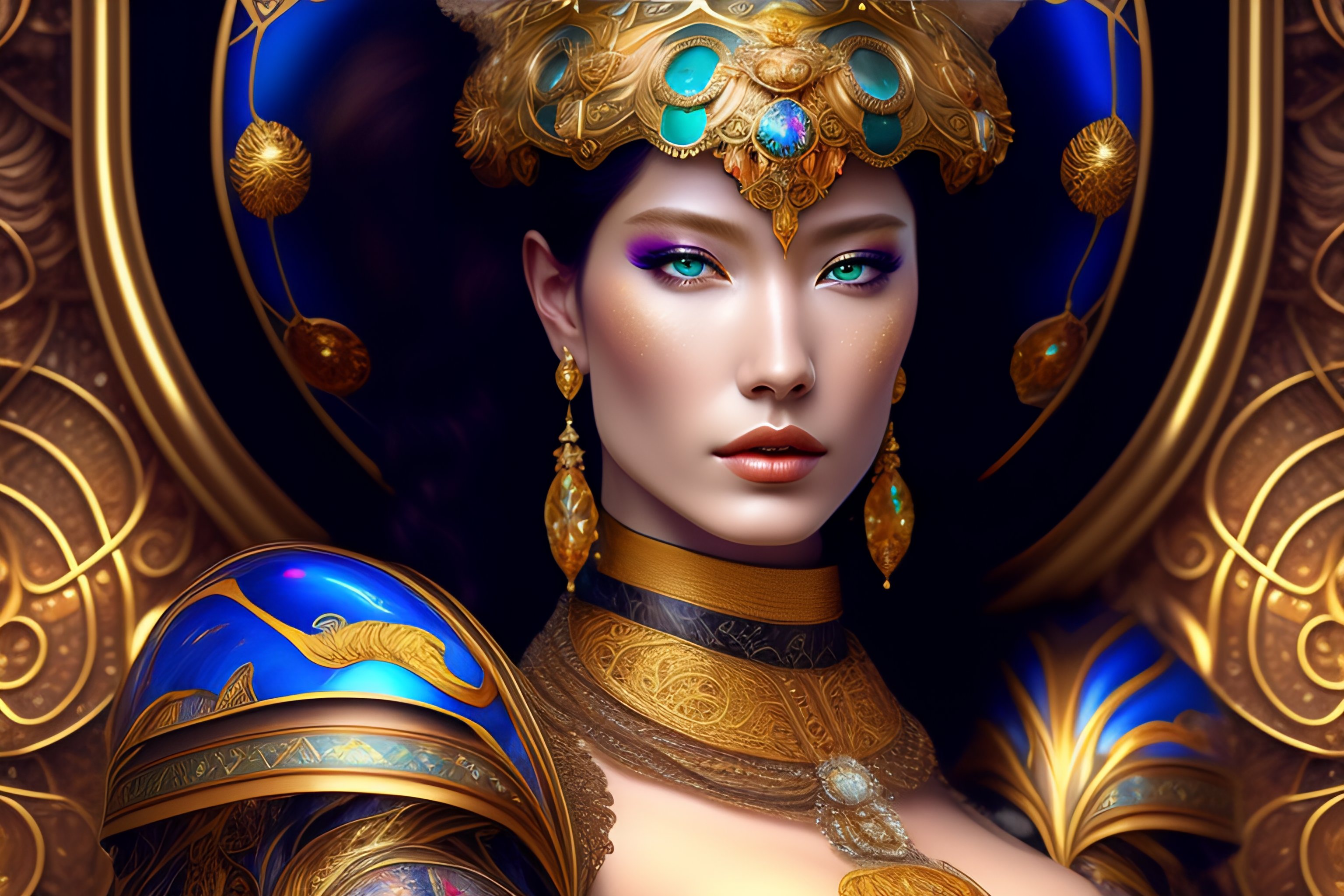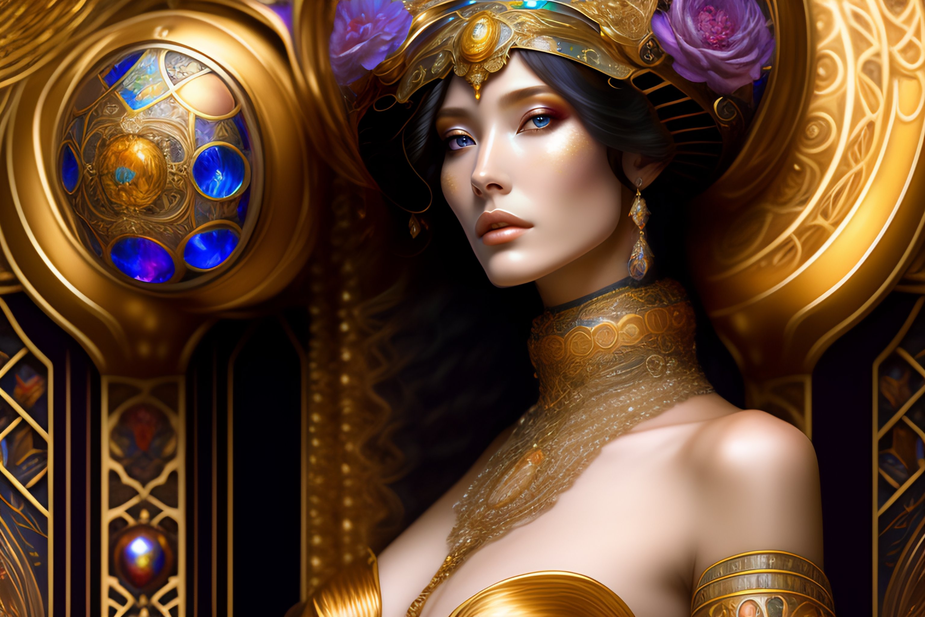 Realistic detailed portrait of a beautiful futuristic italian renaissance queen in opulent alien glass armor by gustav klimt, alphonse mucha, ayami kojima, amano, greg hildebrandt, and mark brooks, female, feminine, art nouveau, ornate italian renaissance cyberpunk, iridescent venetian blown glass, neo - gothic, gothic, character concept design