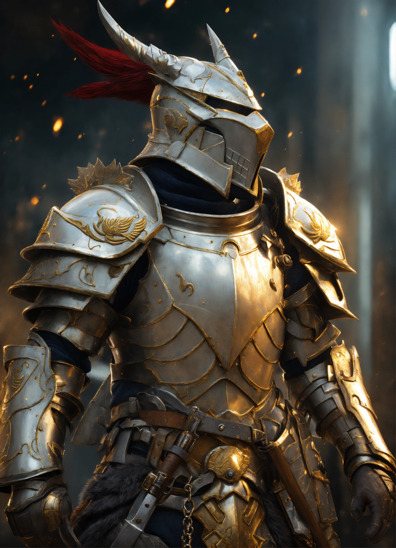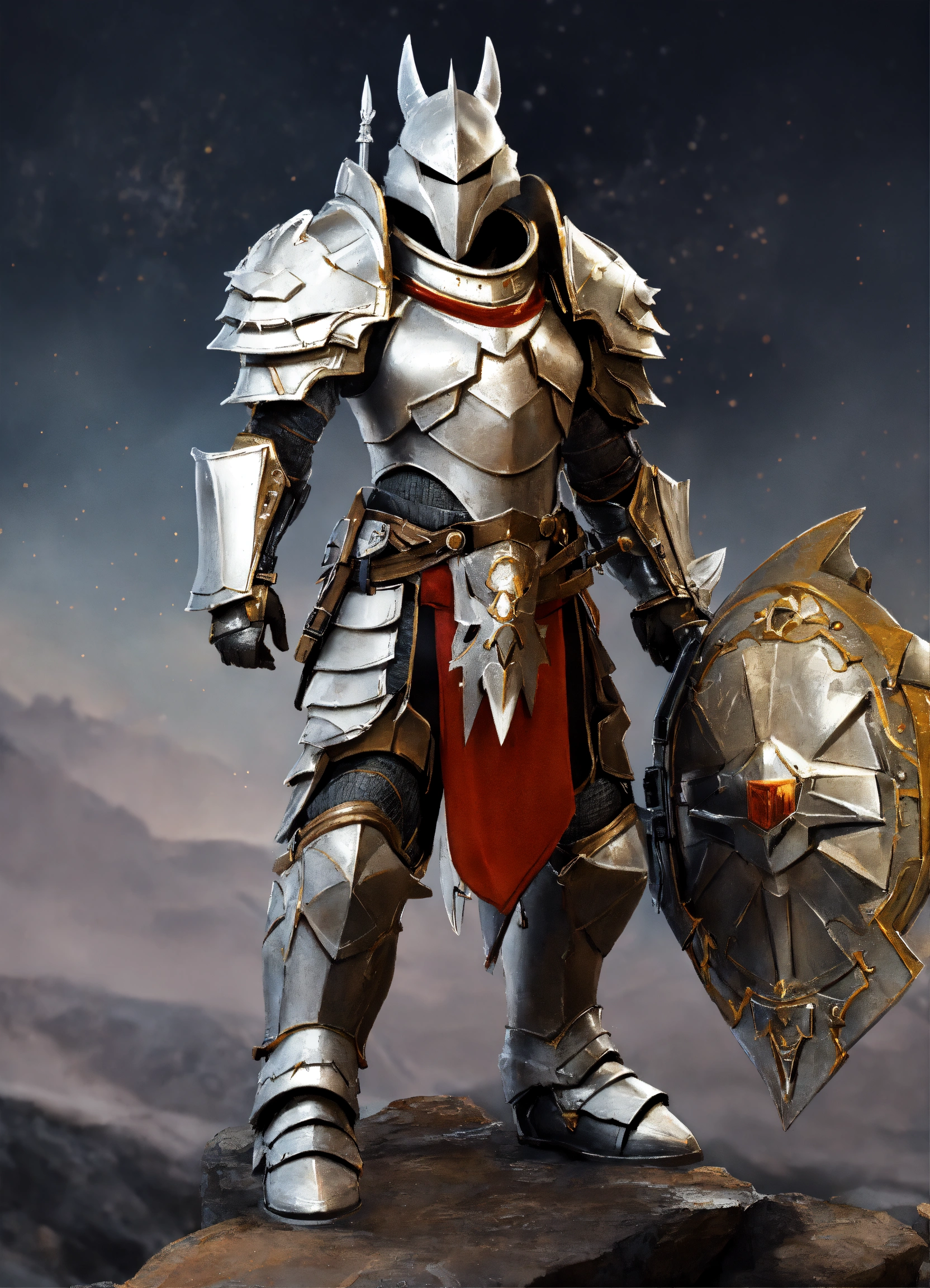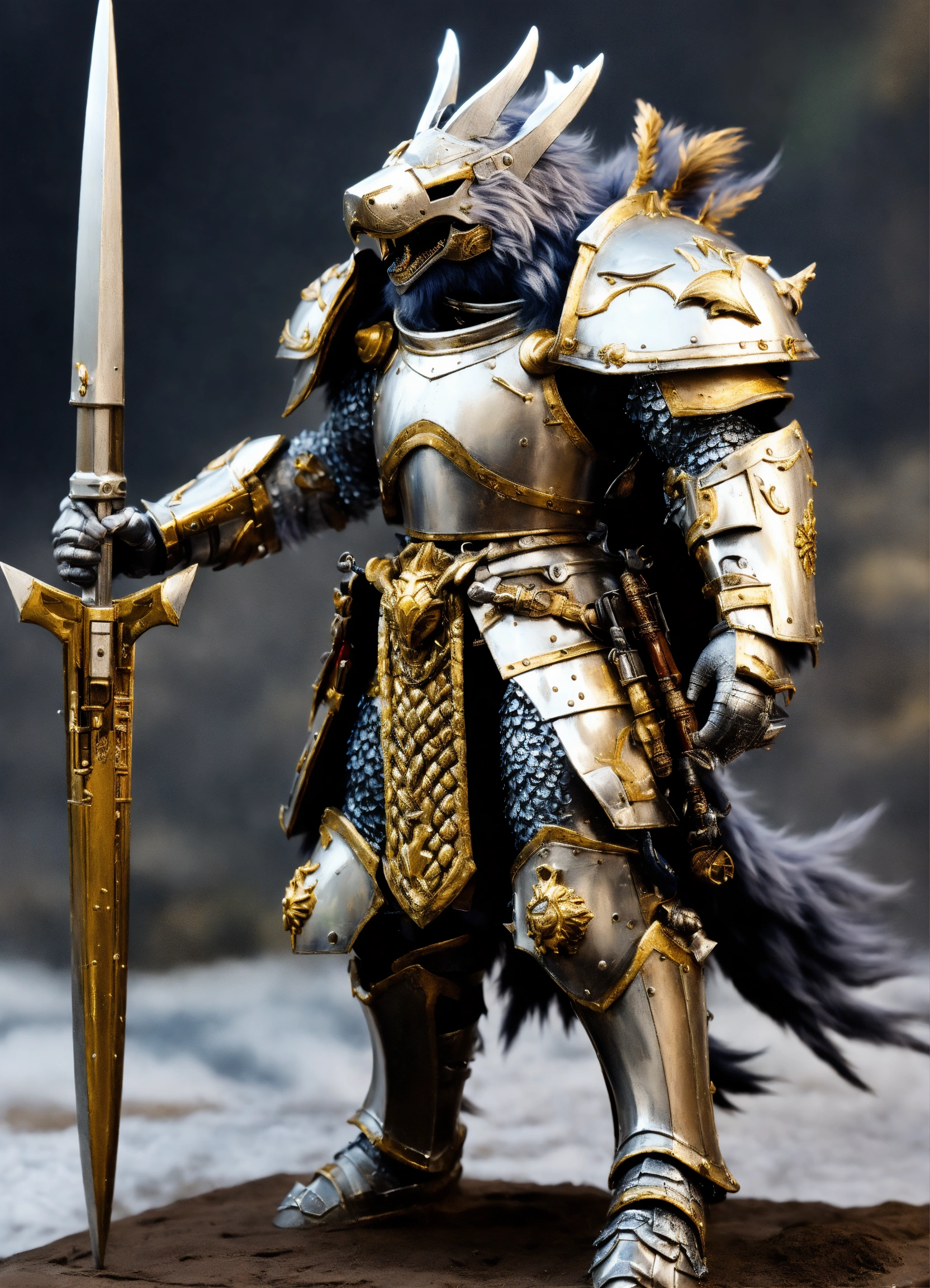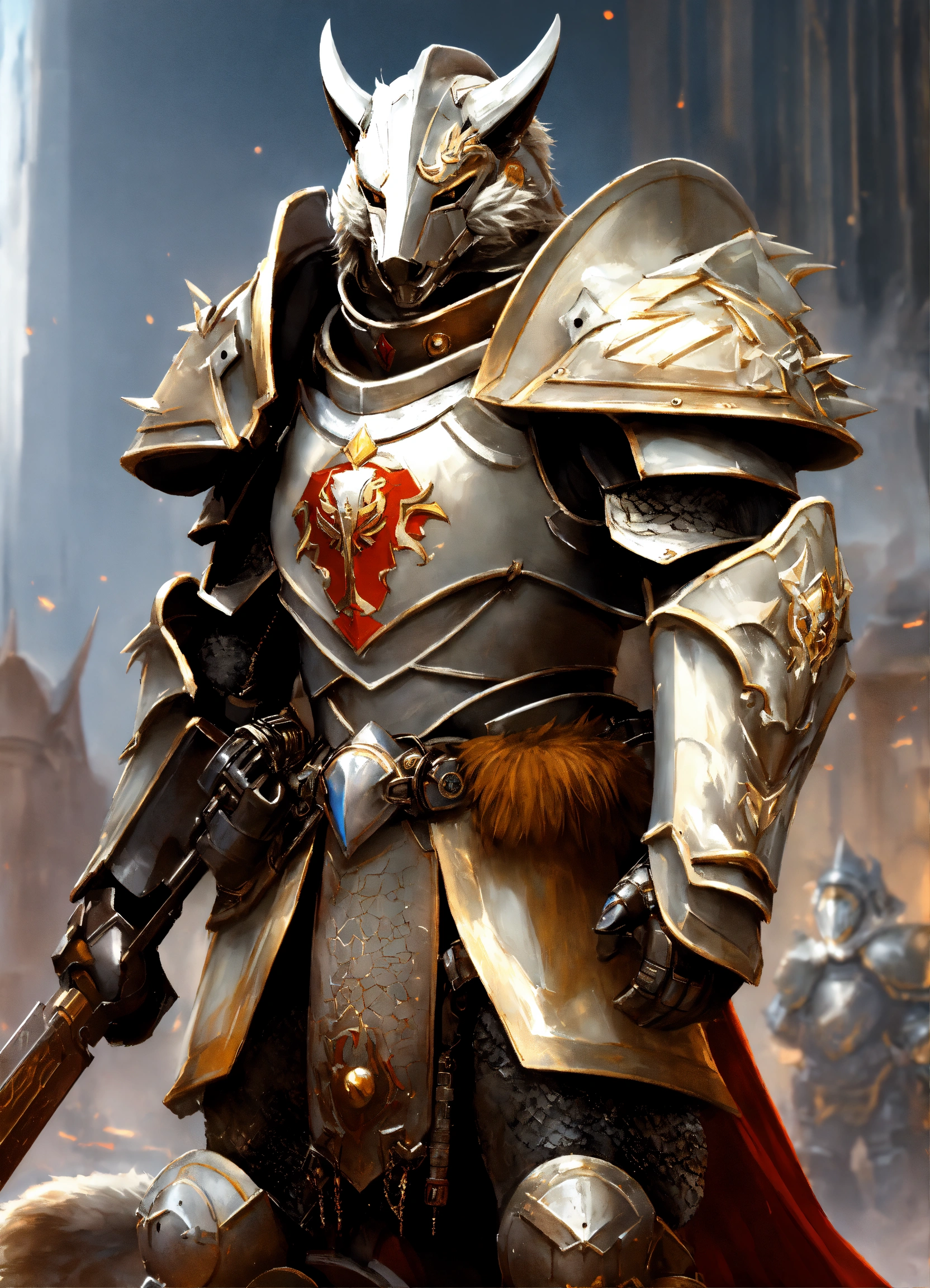 Space warrior knight in silver bulky armor, fur collar and sergal head helmet, warhammer stormcast art