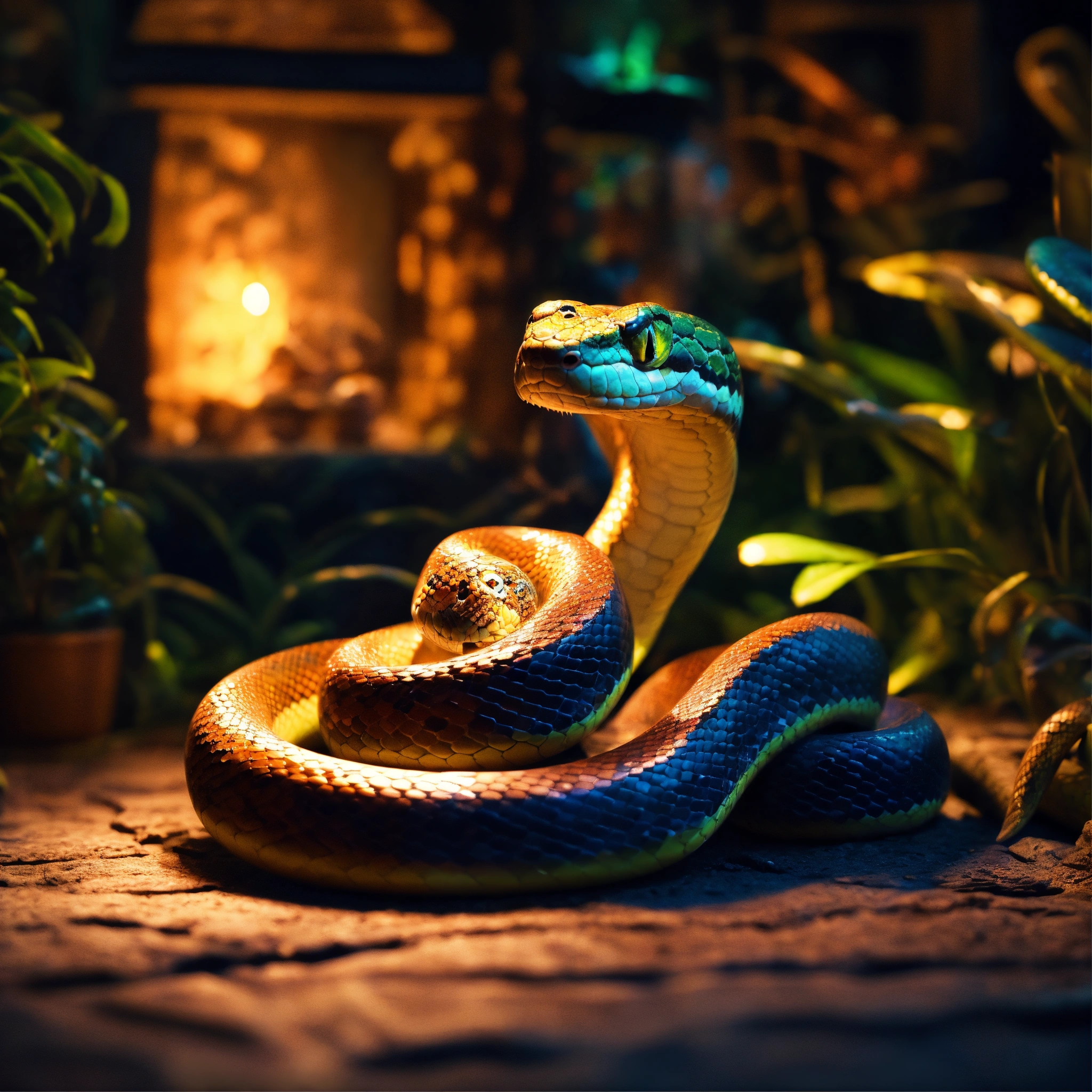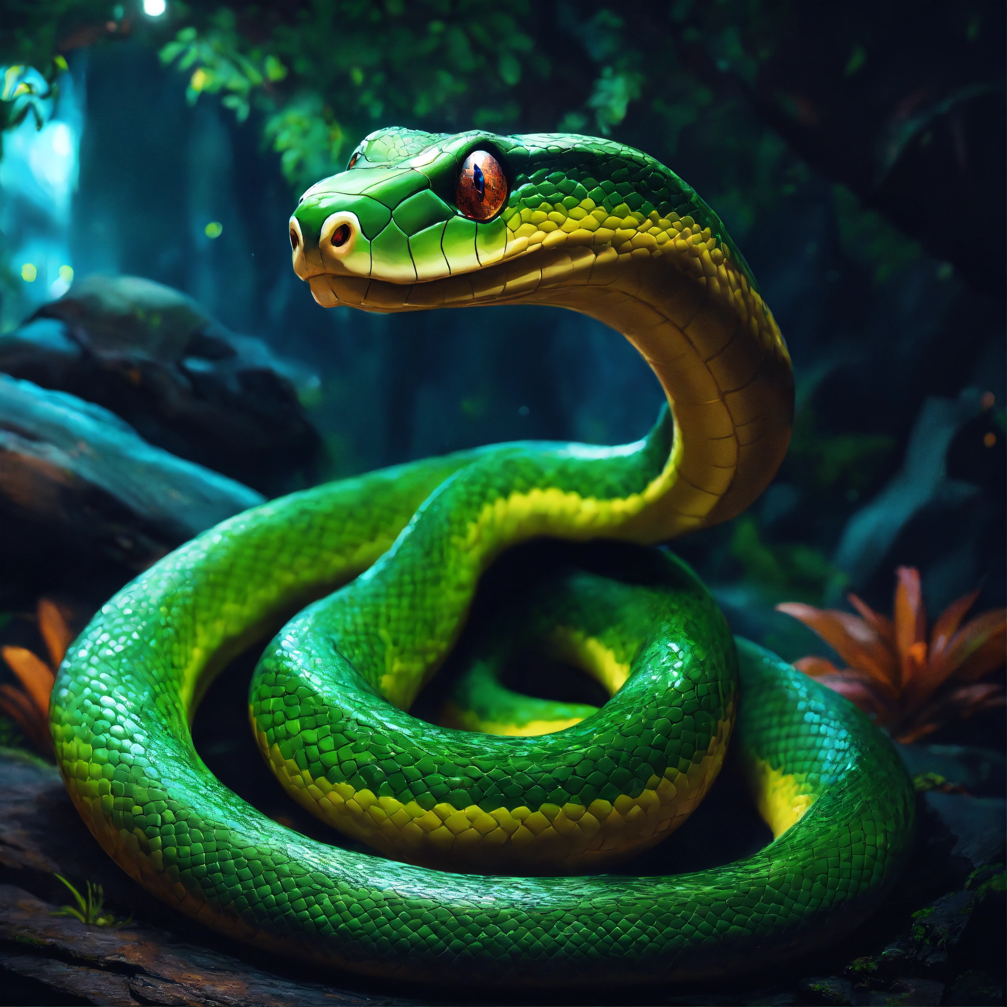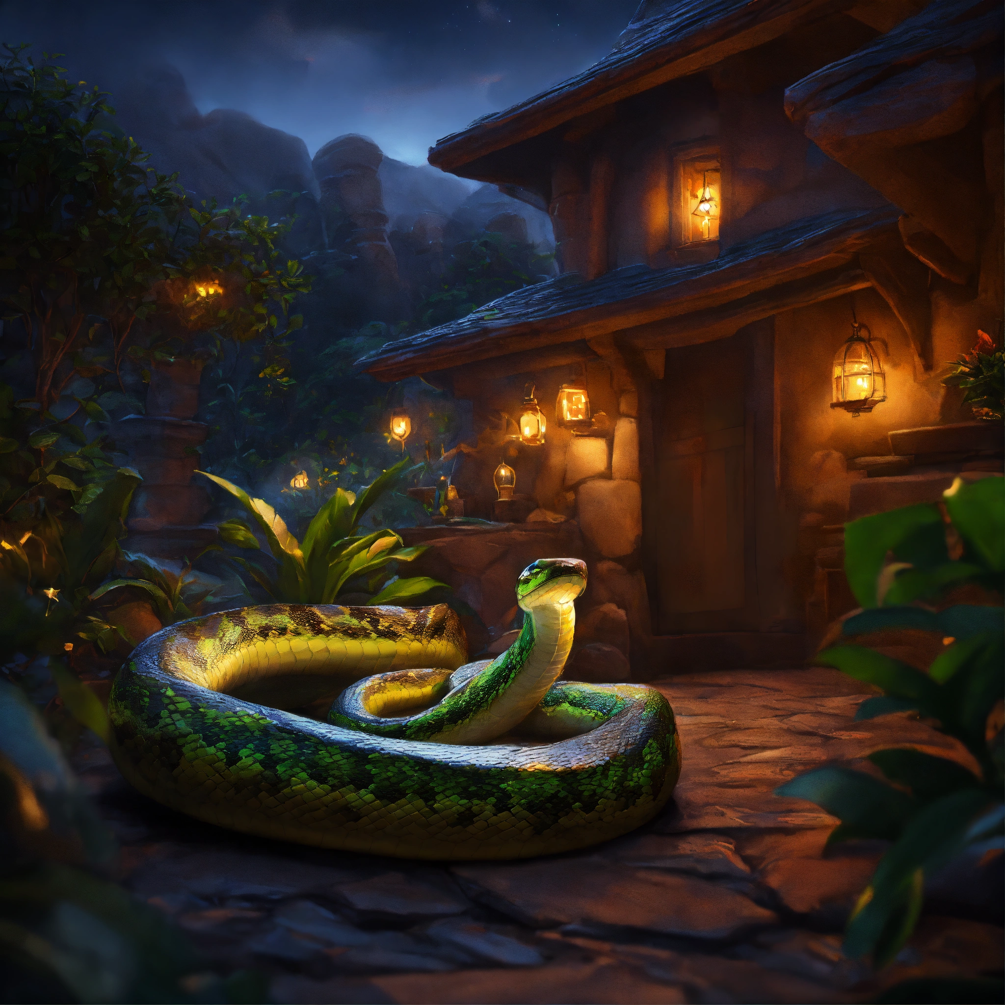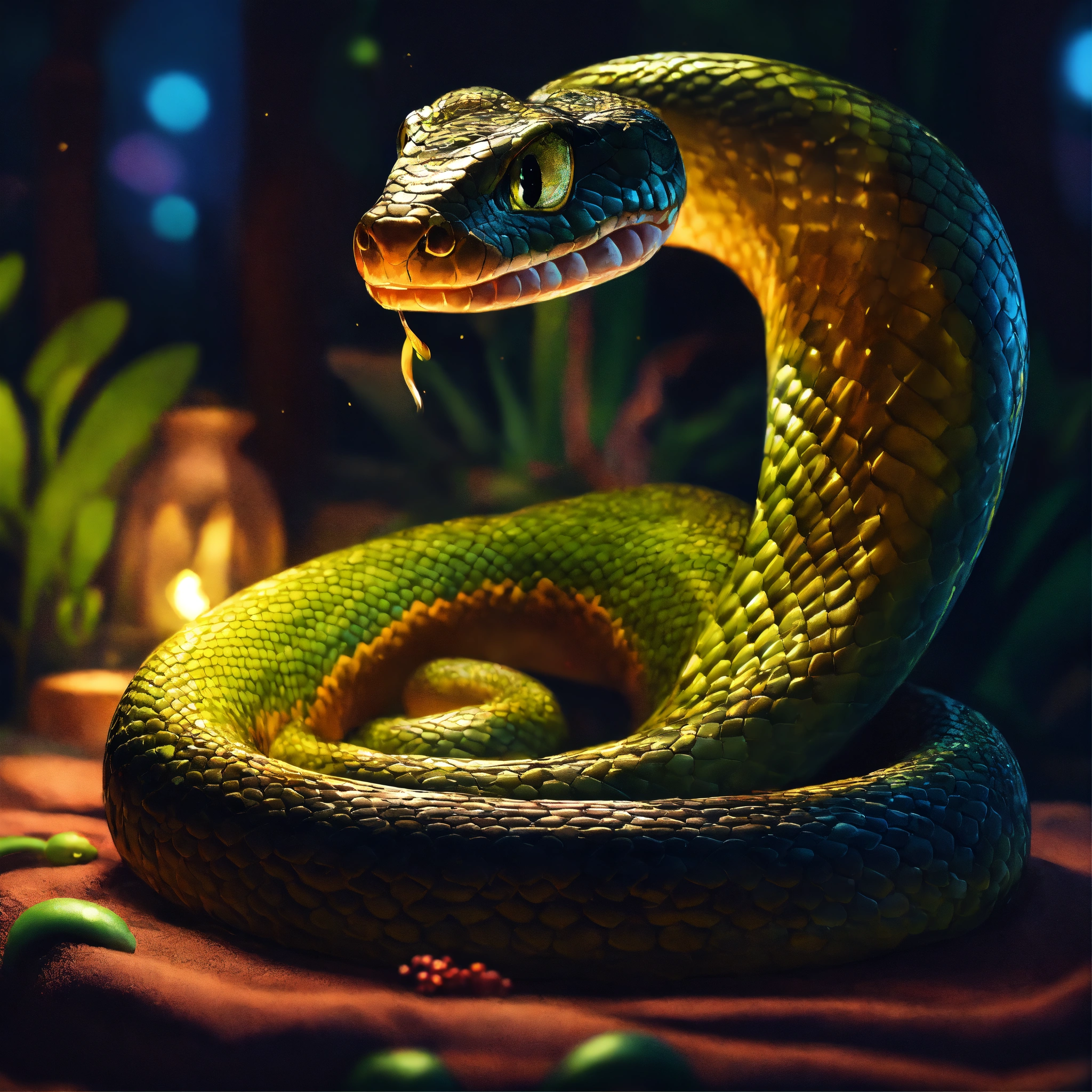 Epic beautiful shot of disneys snake kaa, hypnosis, sleepy evening atmosphere, dark background, ultra cozy, luminous, digital painting, little photorealistic, sharp focus, ultra cozy and inviting, wish to be there. very detailed, arty, should rank high on youtube for a dream trip.