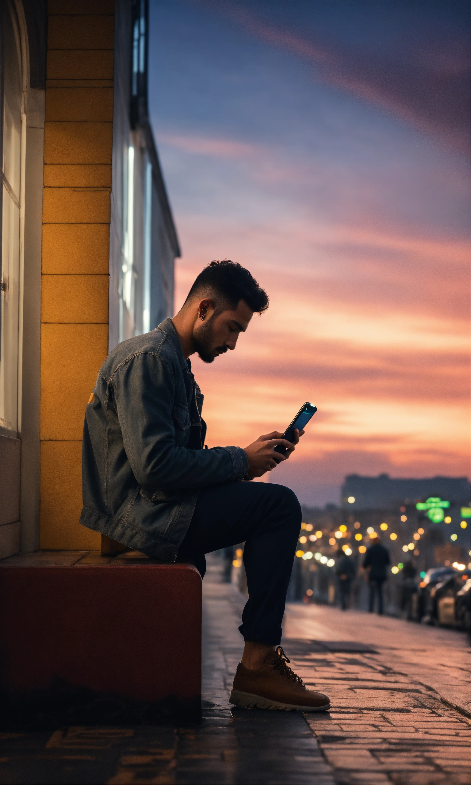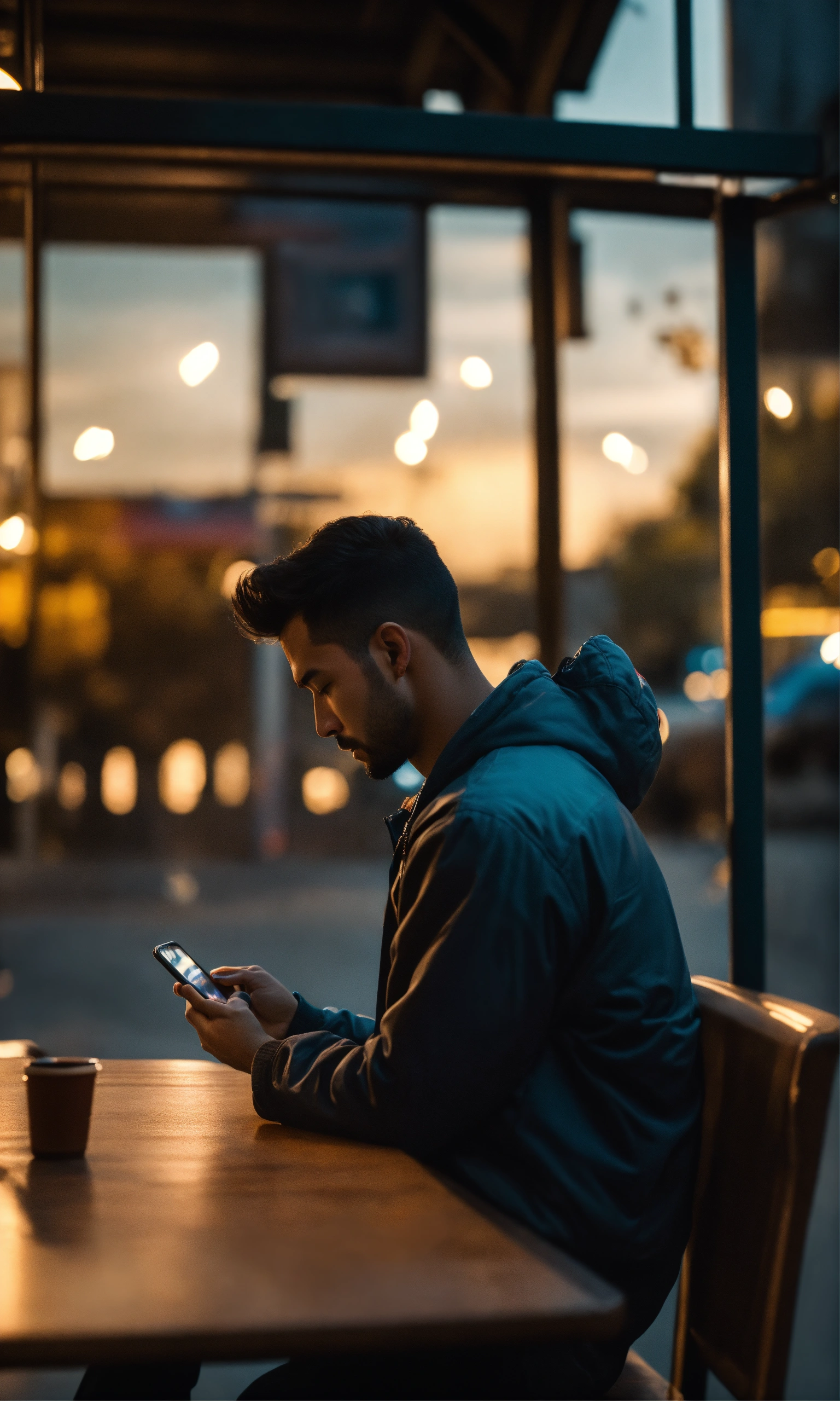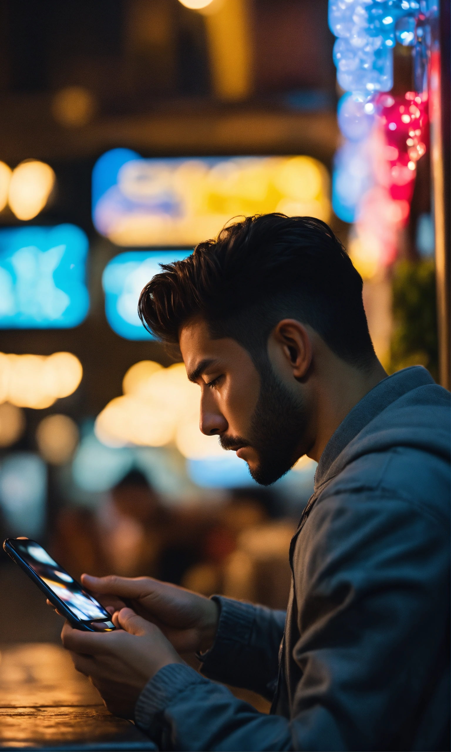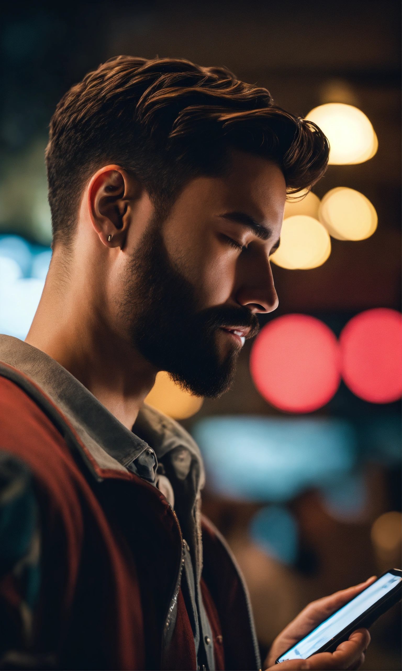 Cinematic photo side view of man looking at cell phone in love high resolution, realistic details, ultra 8k