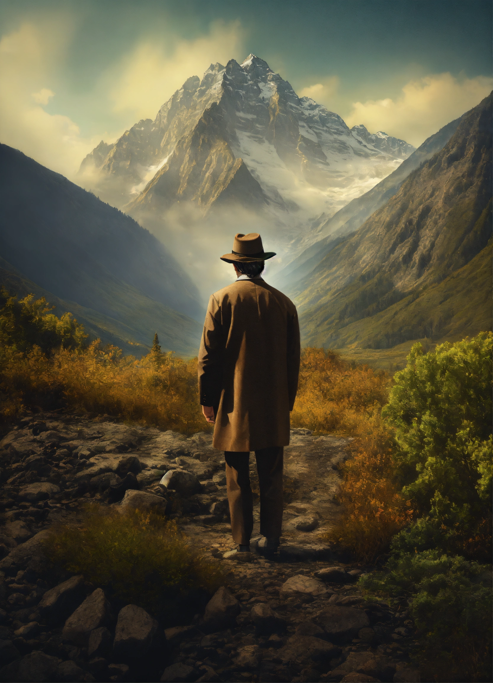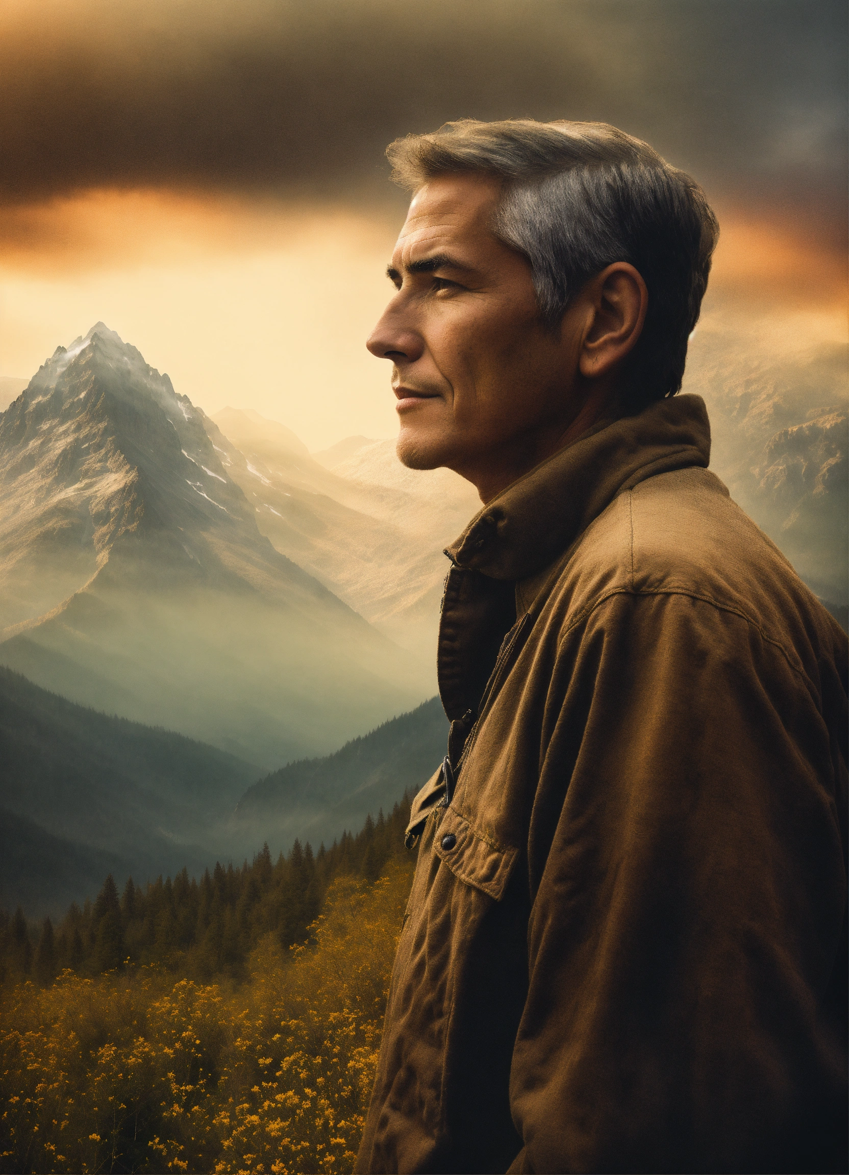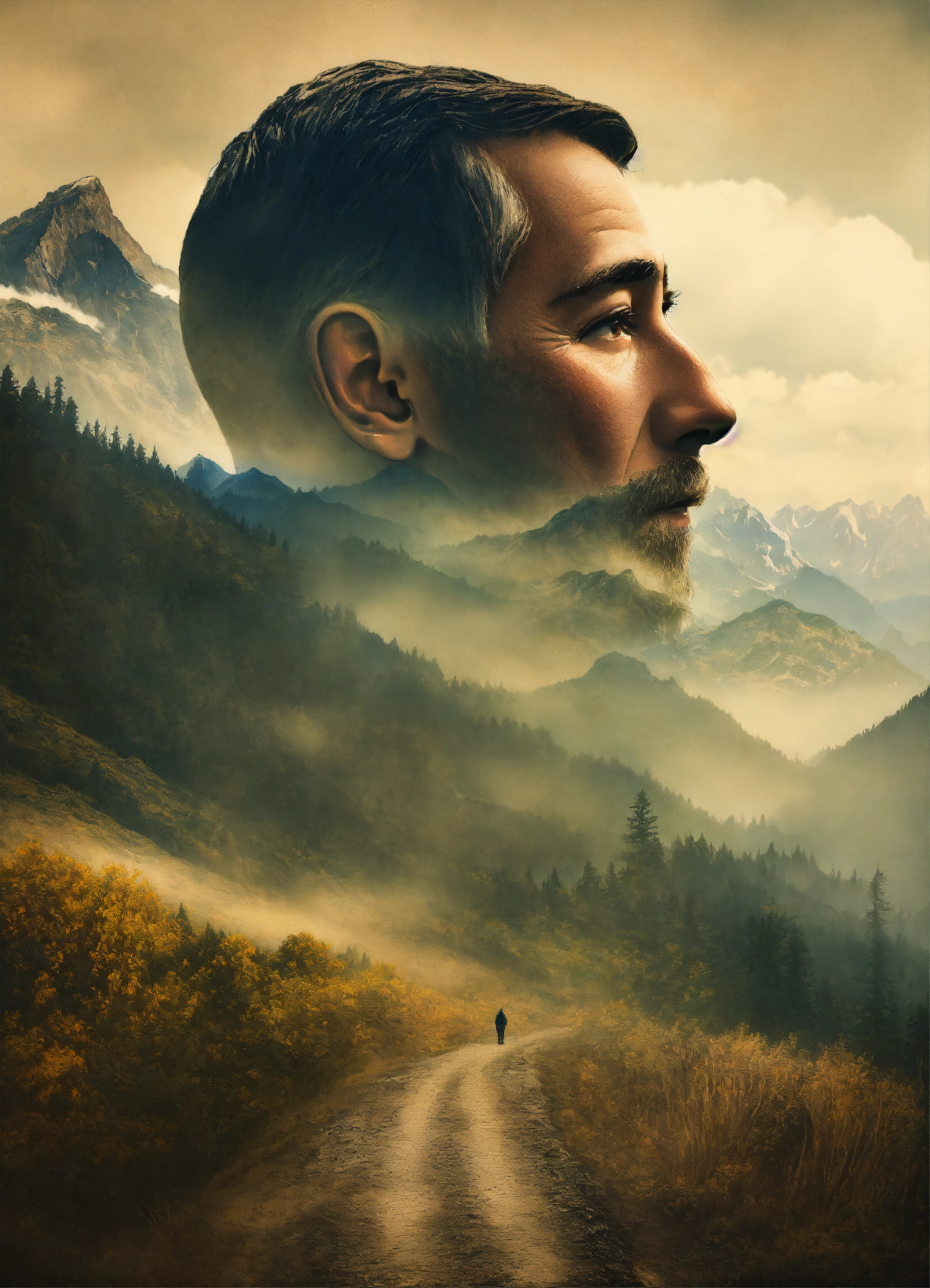 Double exposure man and mountain echoes, whispered features, land's legacy, integrating the majestic peaks of mountains with the subtle nuances of a portrait, evoking the legacy of the land within the human spirit, reminiscent of galen rowell, annie leibovitz, and dorothea lange.