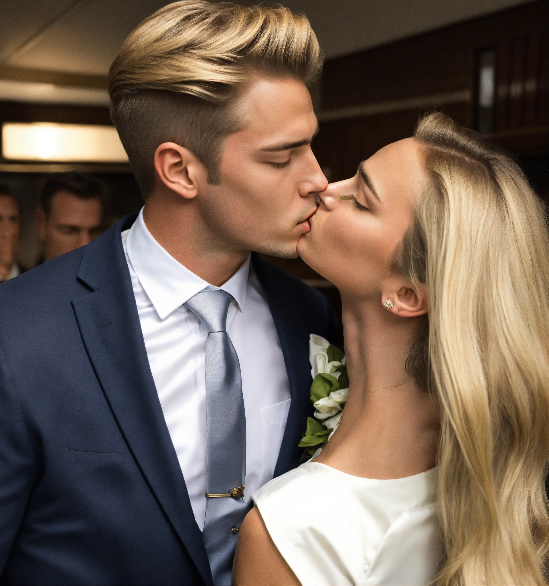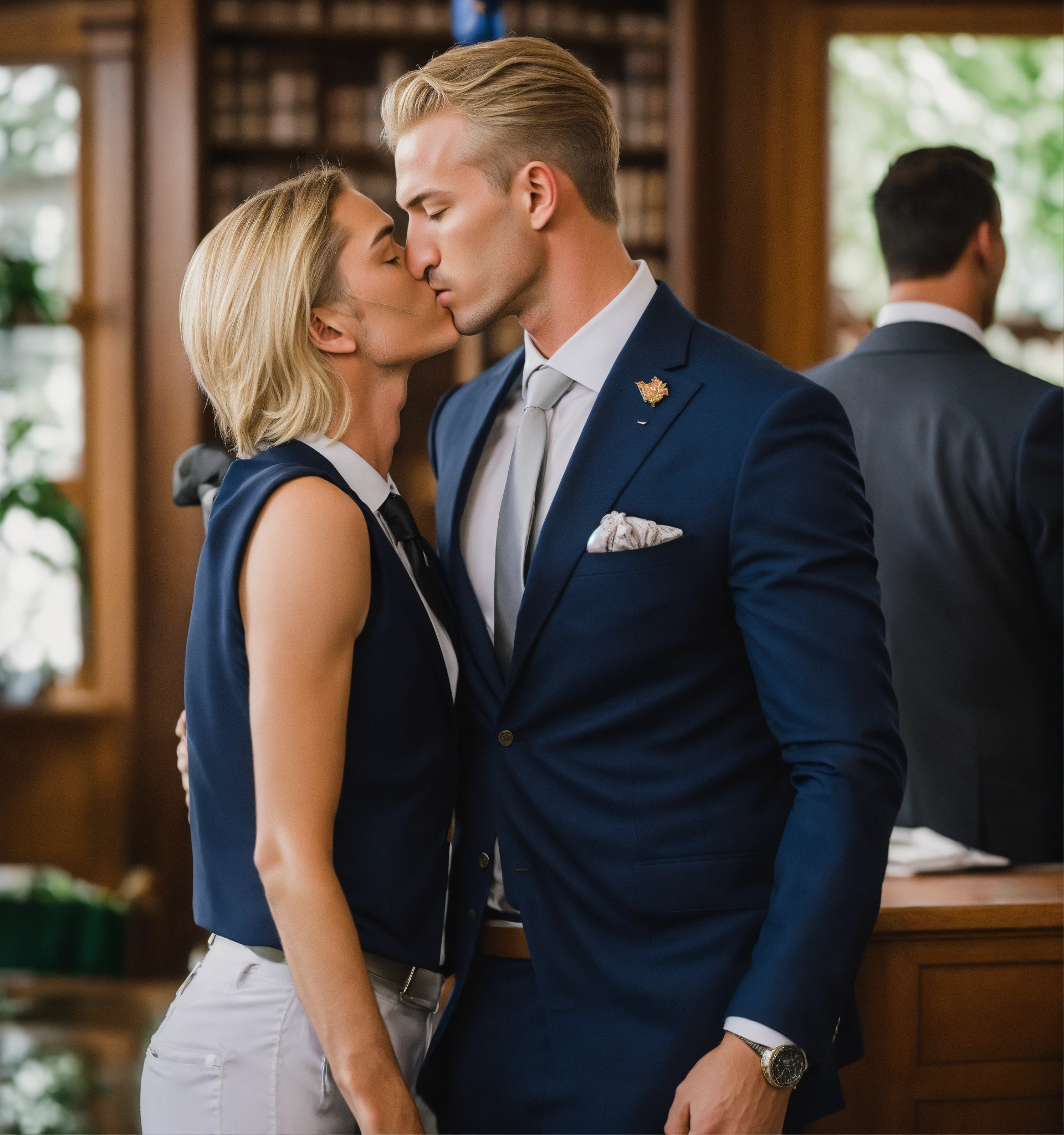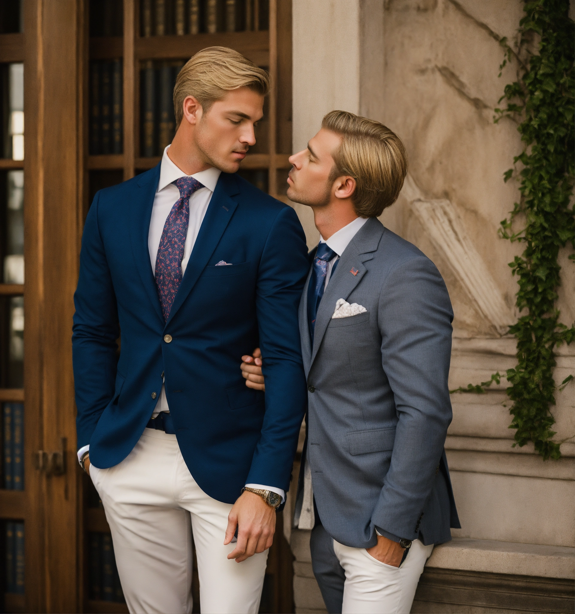 A preppy blonde male gentleman in navy blazer, white pants, club tie, kissing an italian businessman in grey vested suit, in a law school