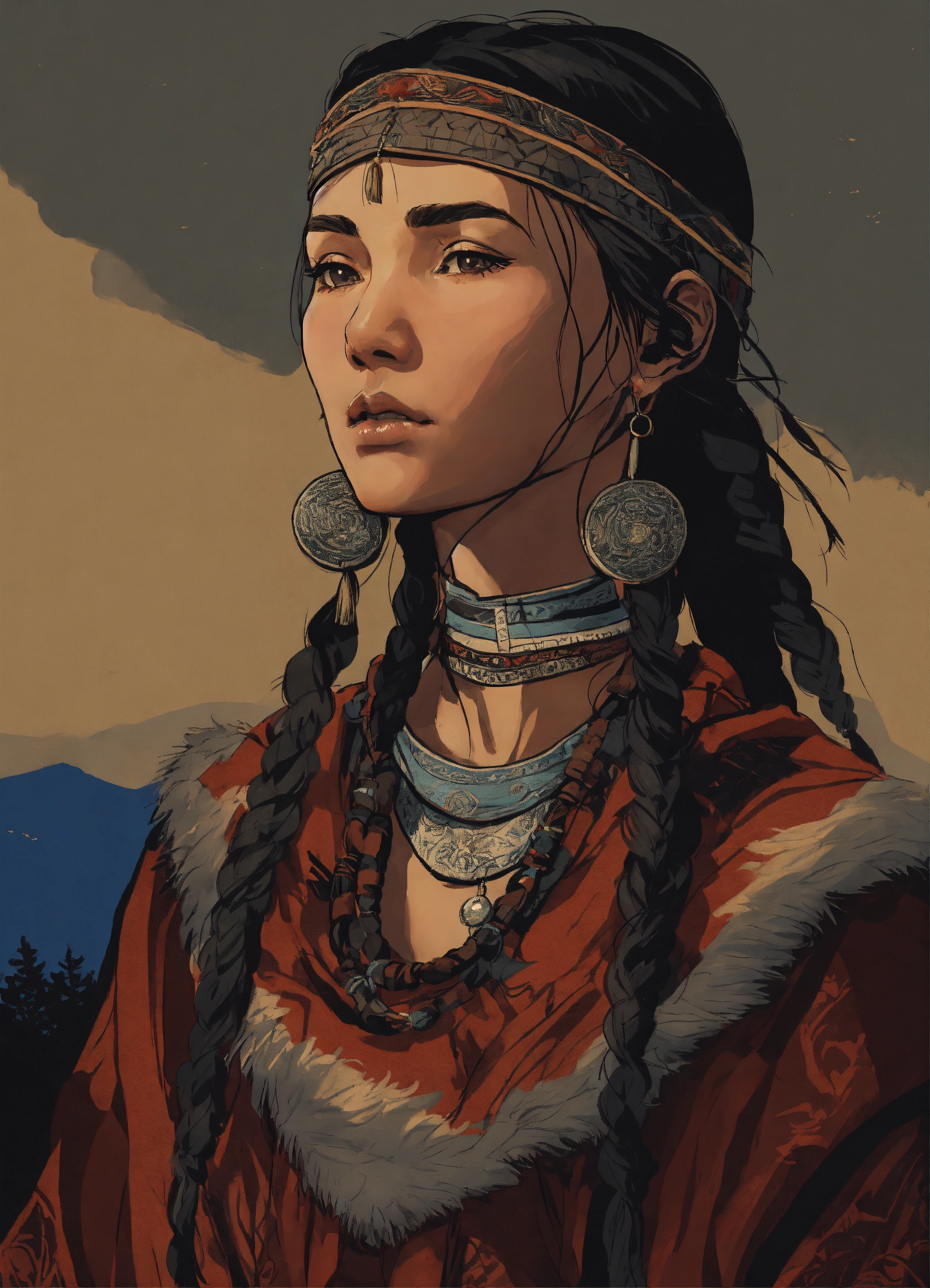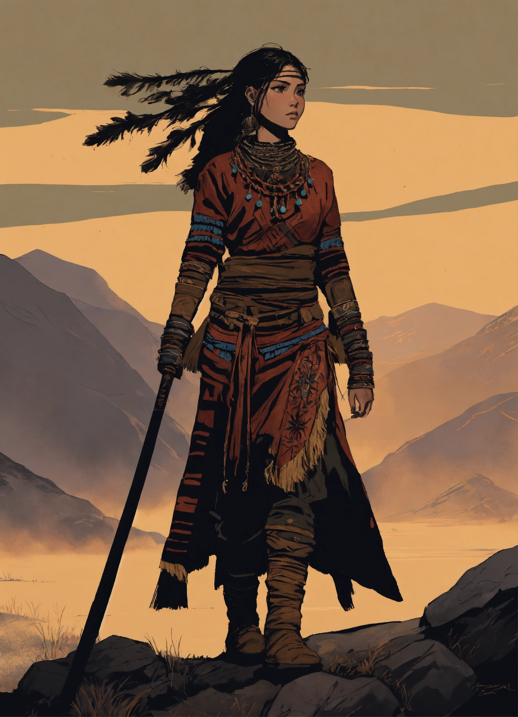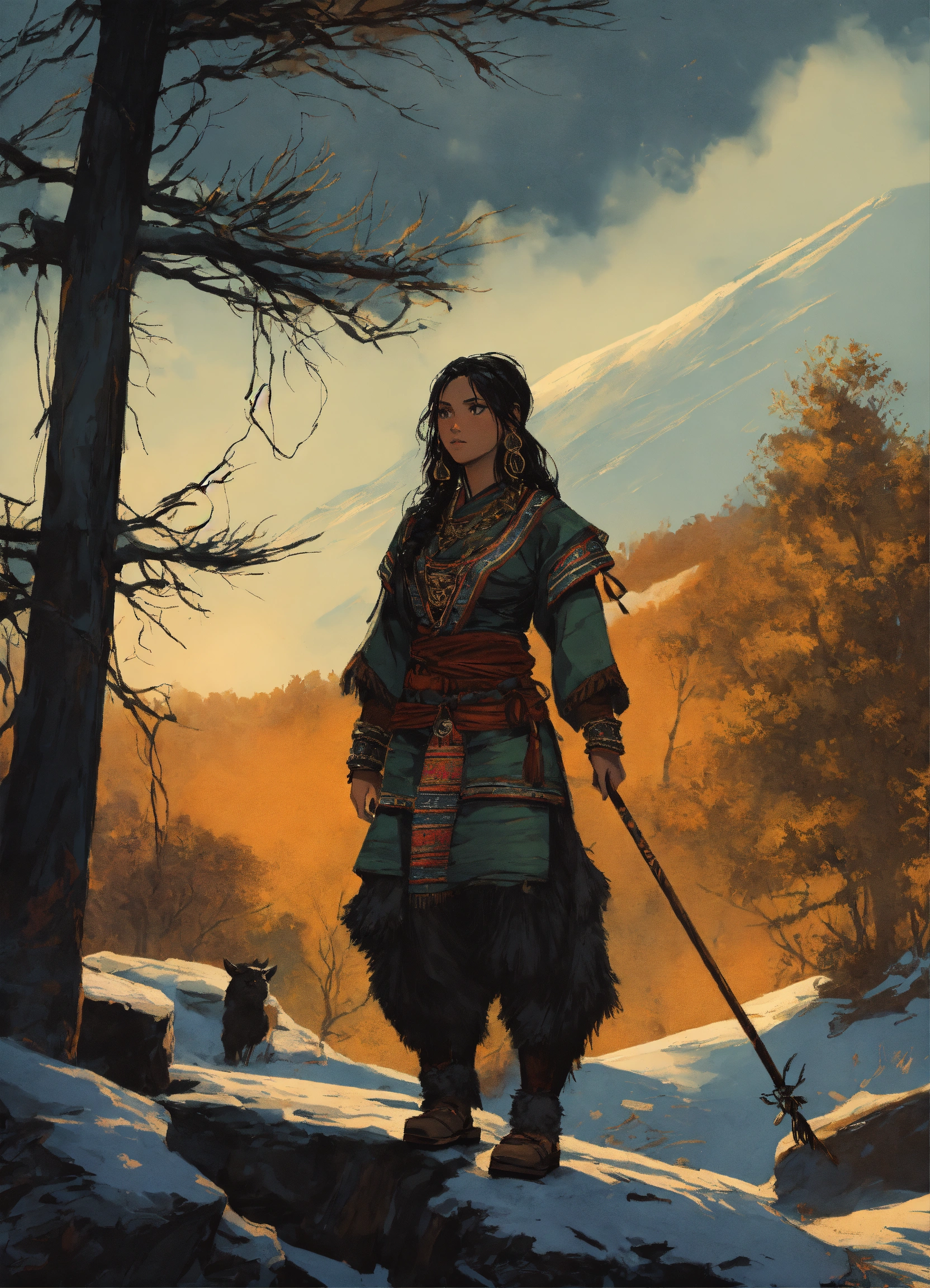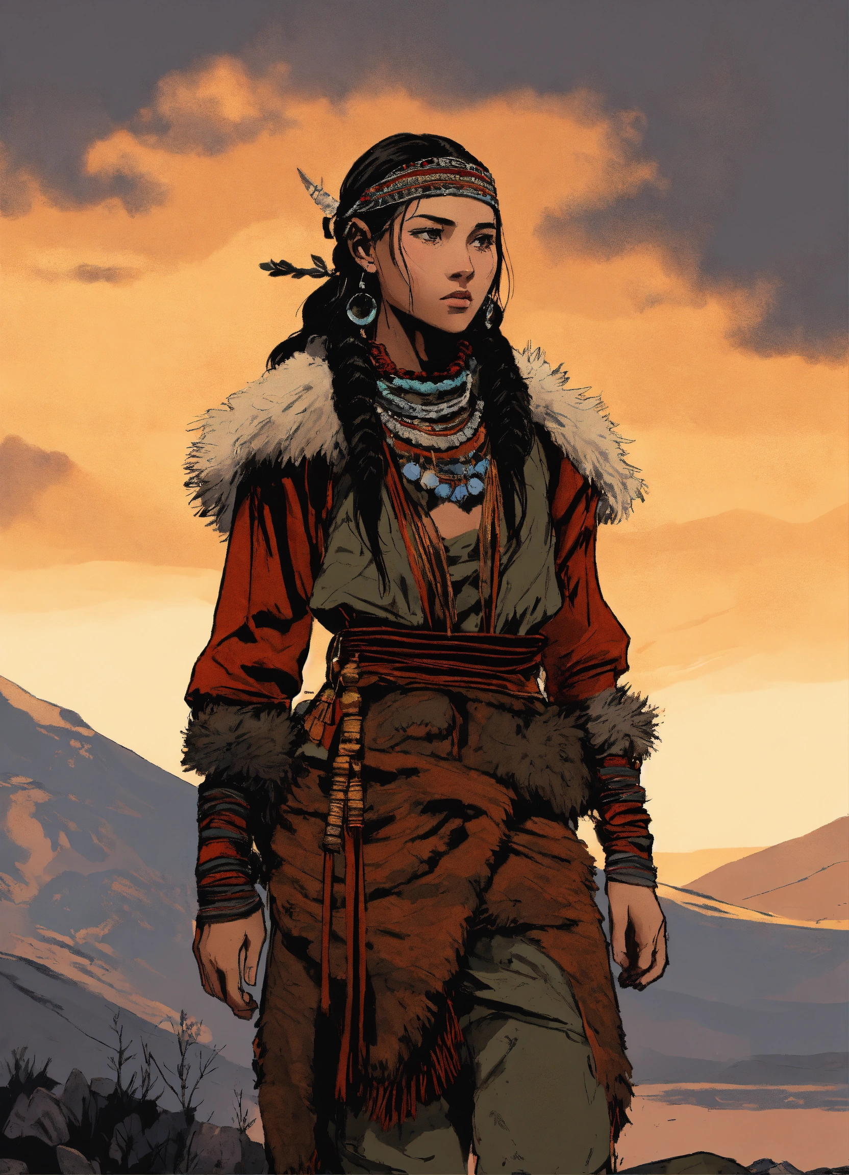 Illustration of a young sámi woman in the style of bernie wrightson. olive skin, black hair, mongolian phenotype, tribal sámi clothing, tribal adornments, full body. gloomy and depressing atmosphere. dark hues color palette, composition balance, drawing, outlined silhouettes, shadows, highlights, intricate details, dark fantasy, narrative-rich illustration, visual compellingness in the style of bernie wrightson. inspired by senua's hellblade and horizon zero dawn.