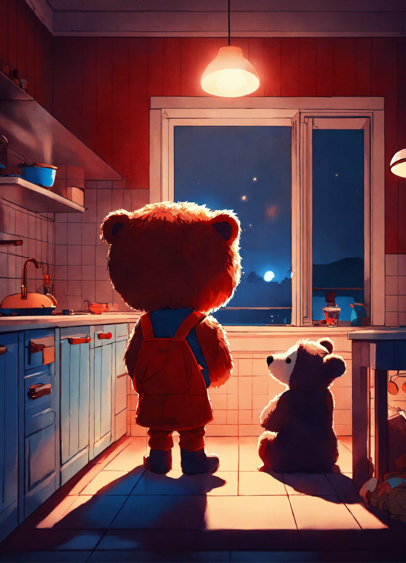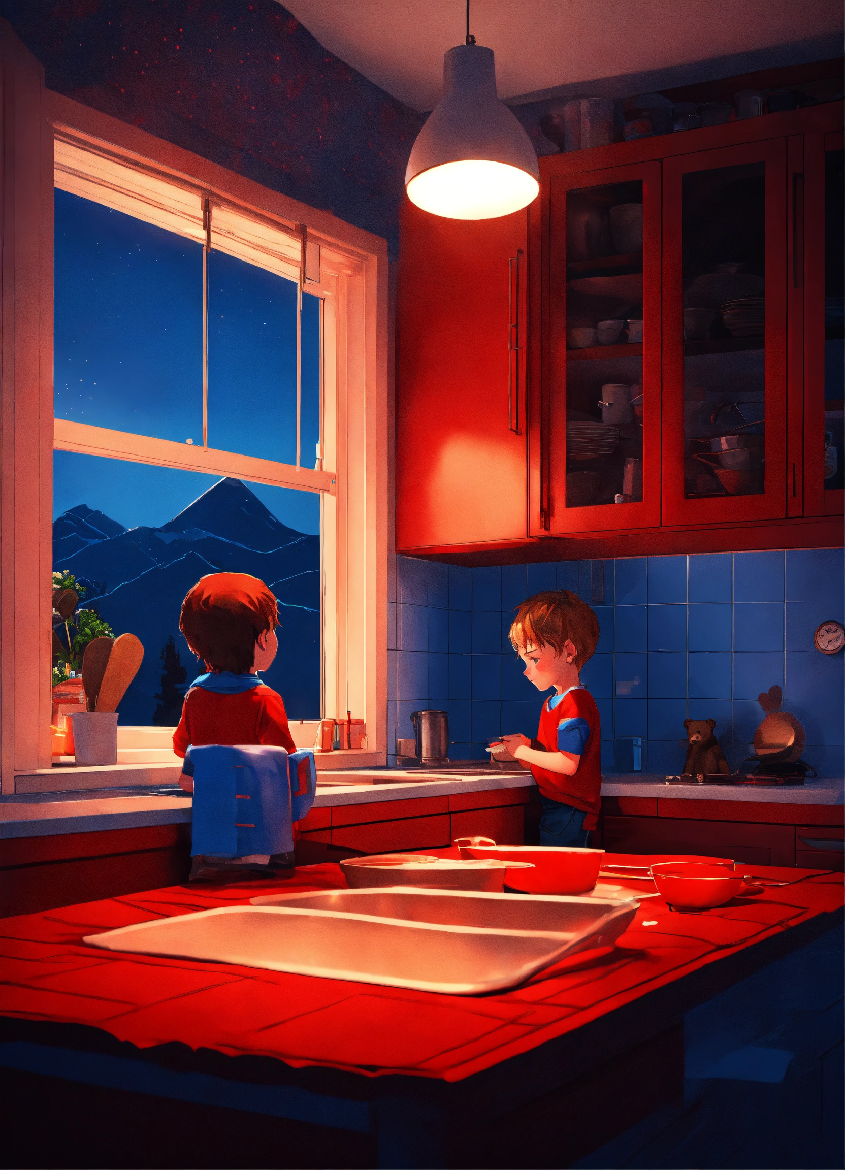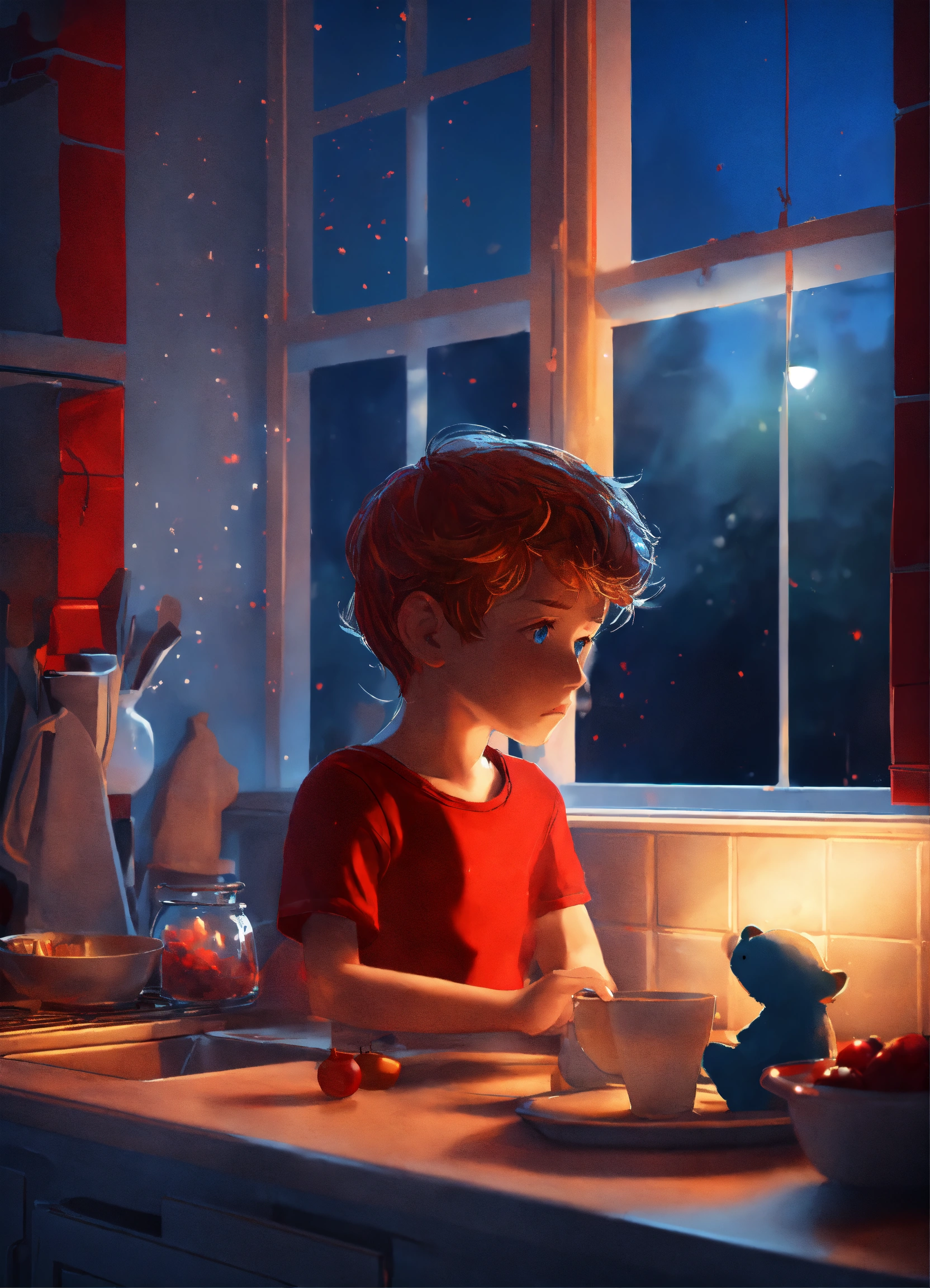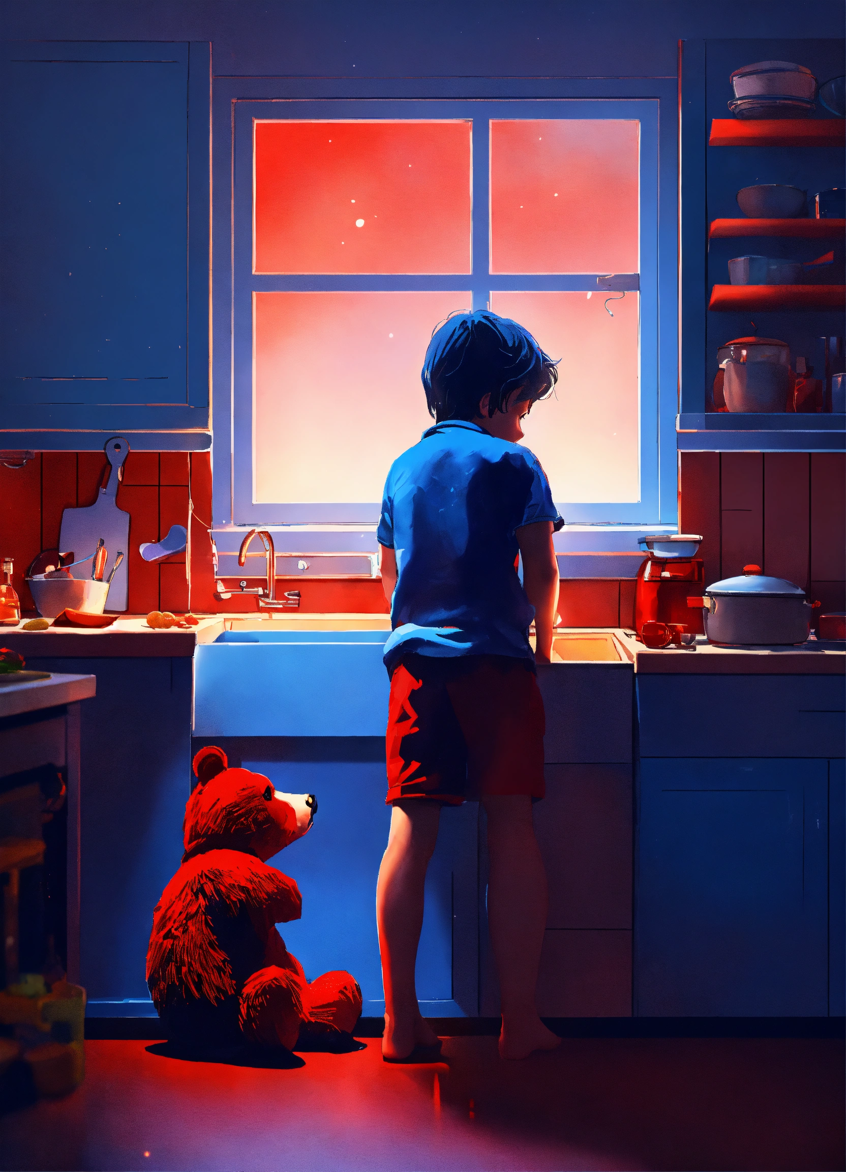 Style of gretel lusky, blue, red, white lighting of a sad boy with a broken bear on the kitchen counter at night, volumetric lighting from the open kitchchen window with the boy back lit