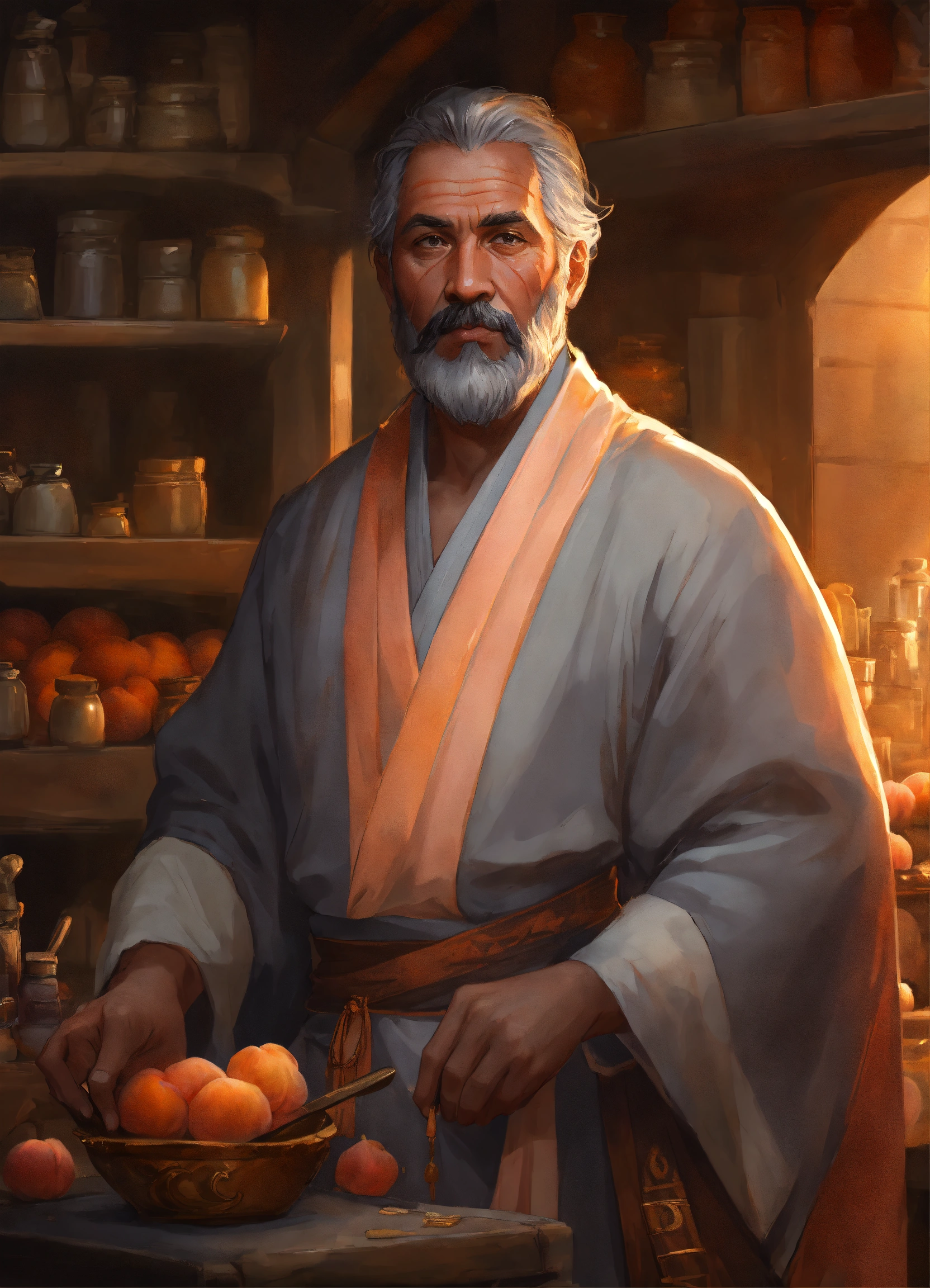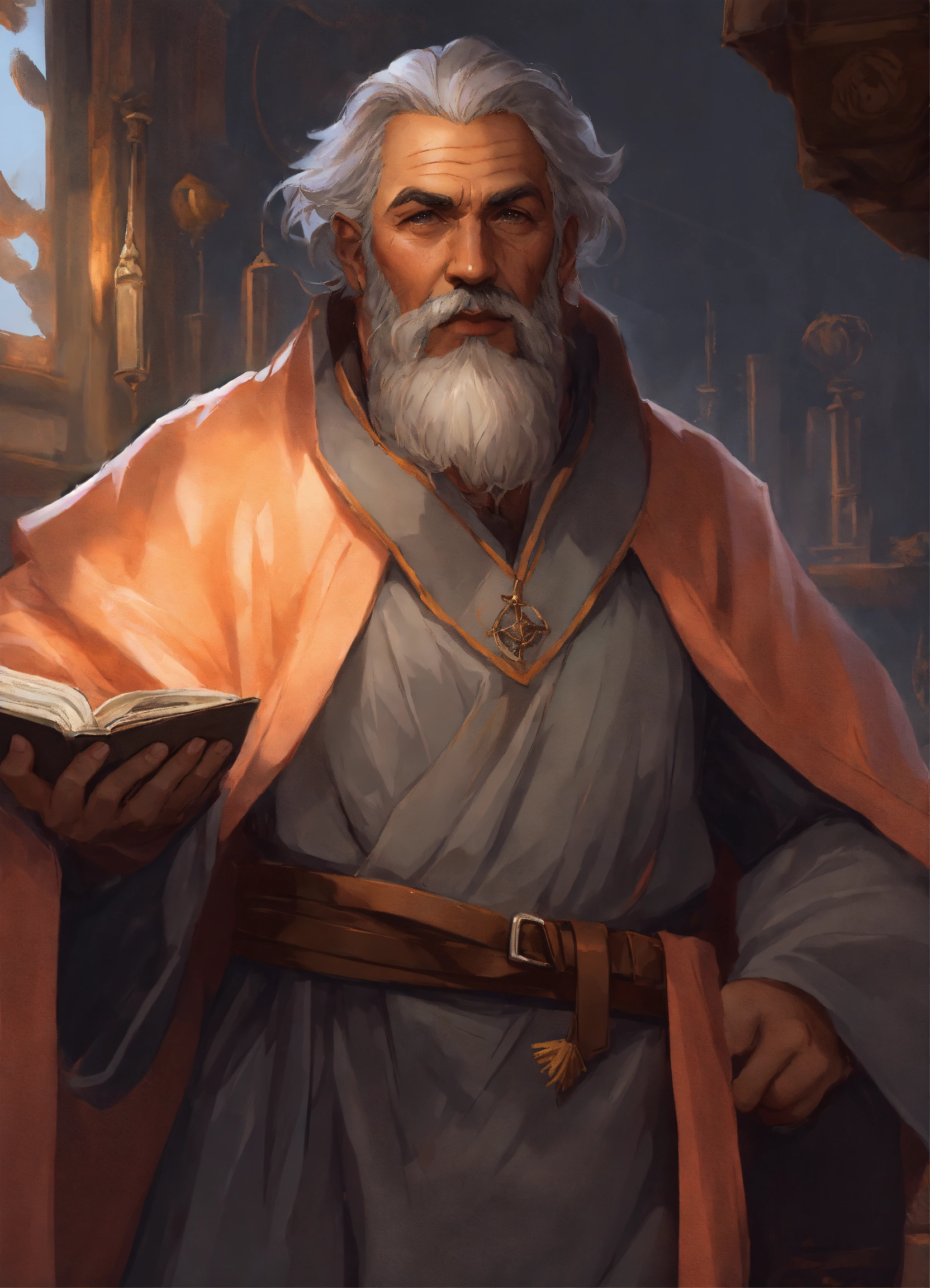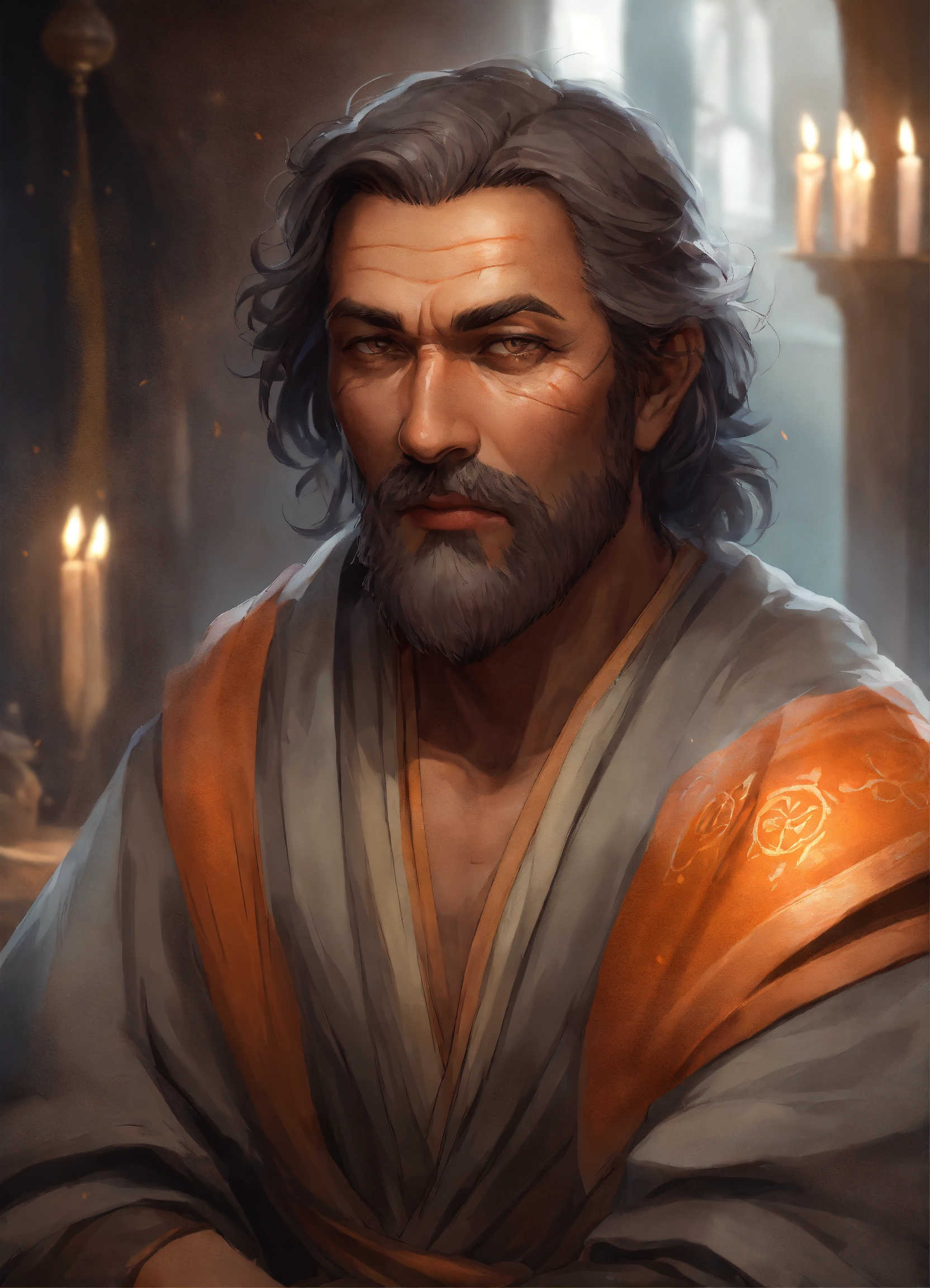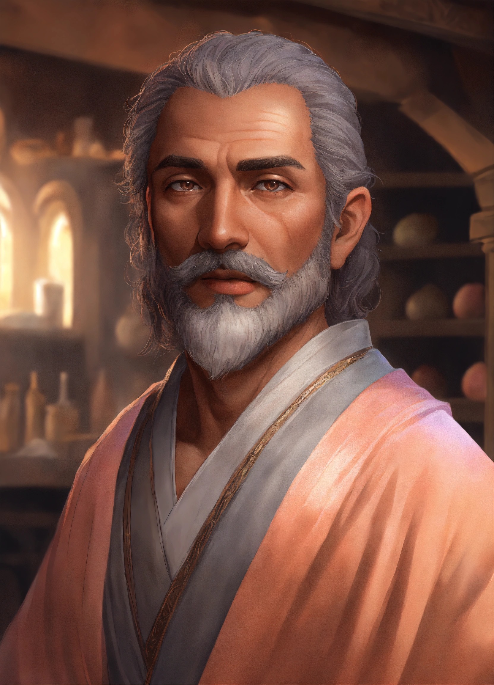 Mid aged male human shop keeper with a scar on his left lip. he wears grey silk robes with peach coloured trim. d&d, fantasy