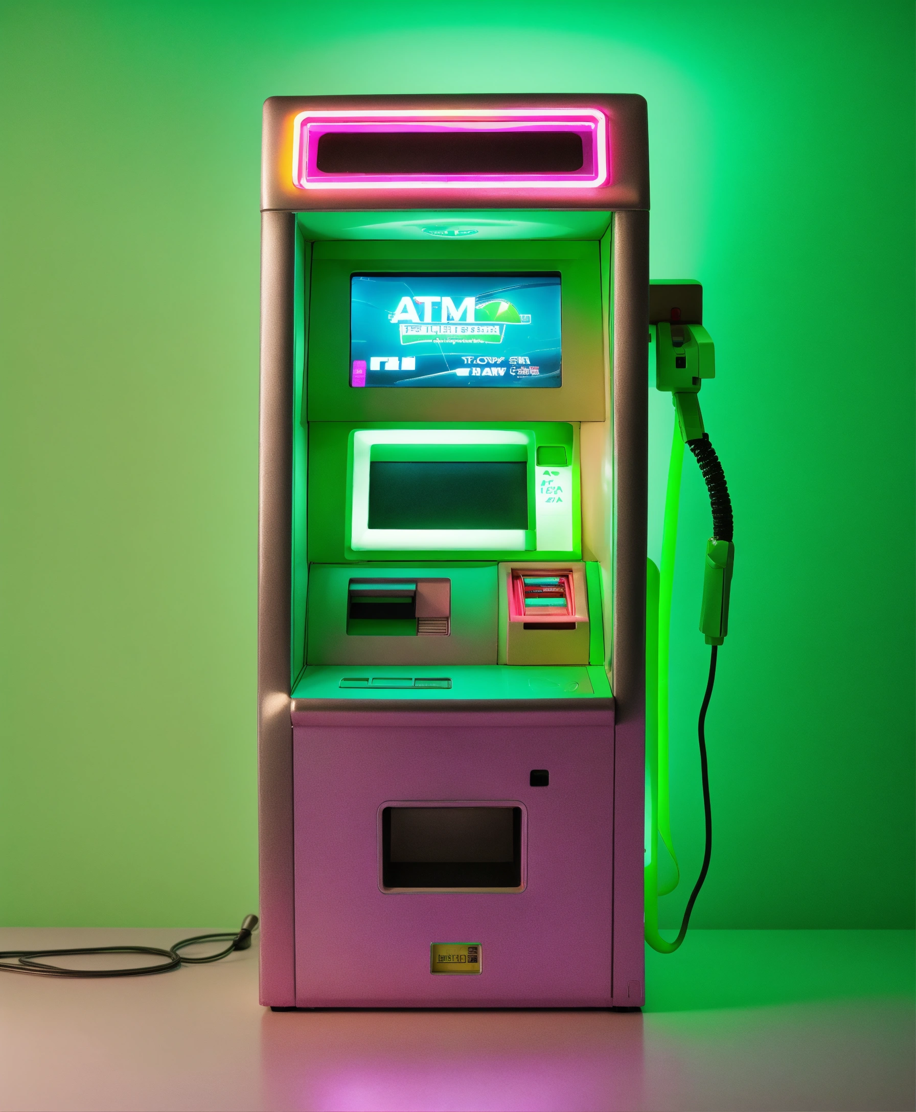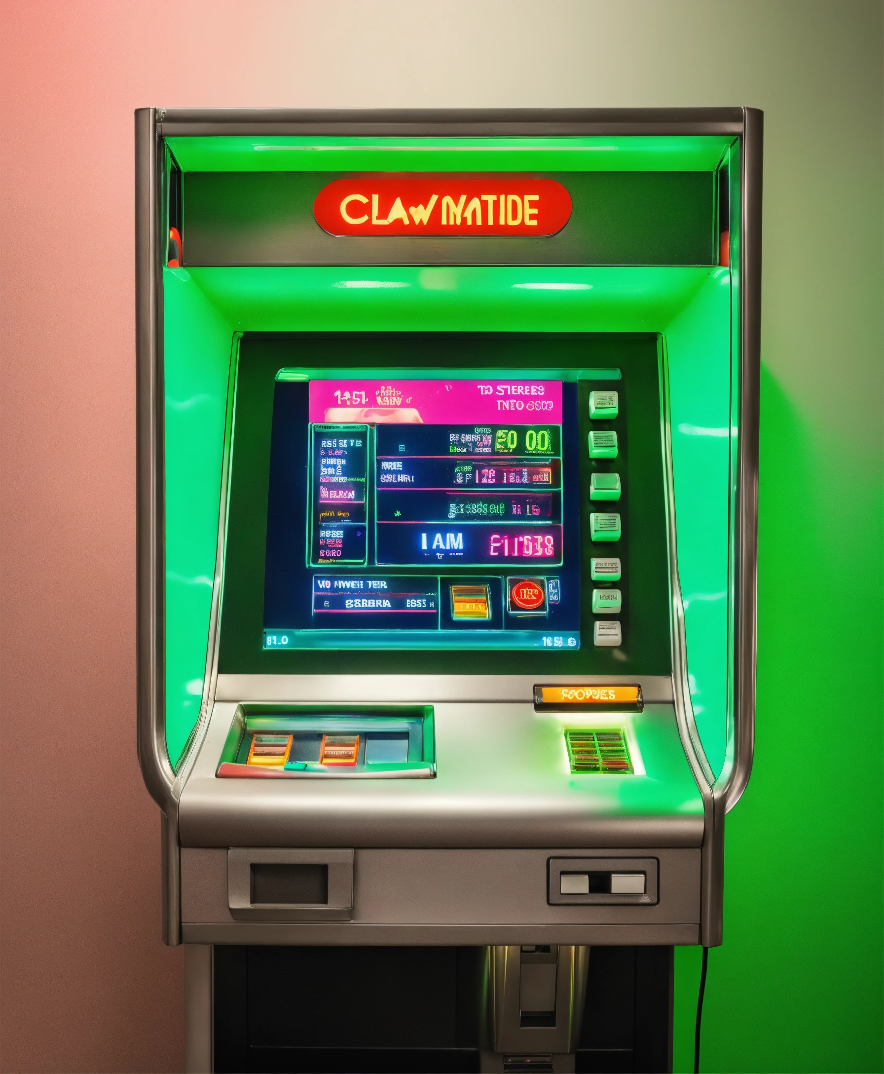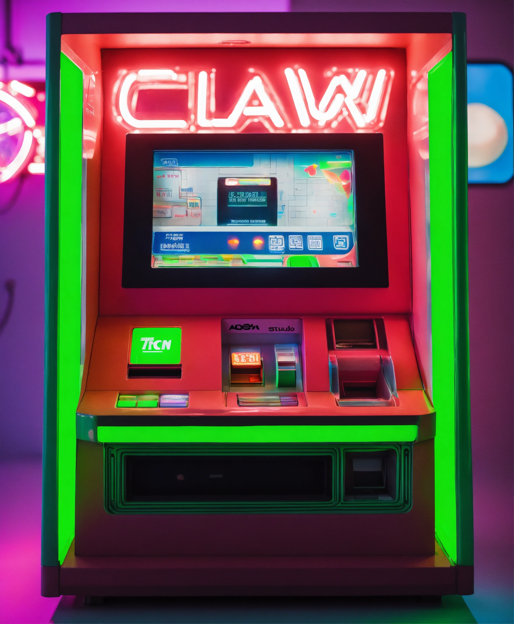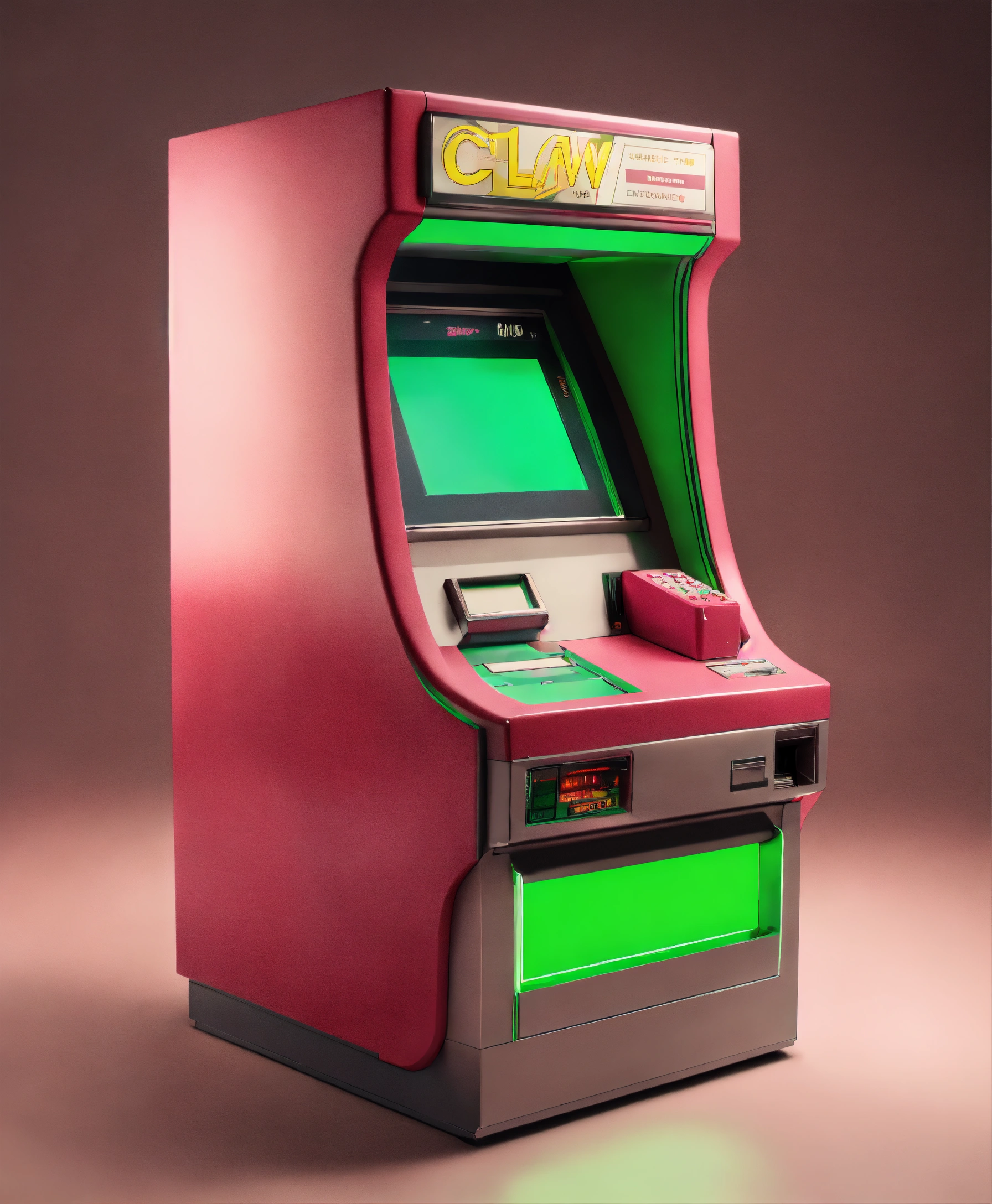 Claw machine grabbing a retro futuristic very simple minimal atm device that shows a digital screen that takes up the majority of the front, realistic, studio photography, neutral background, small pops of neon green