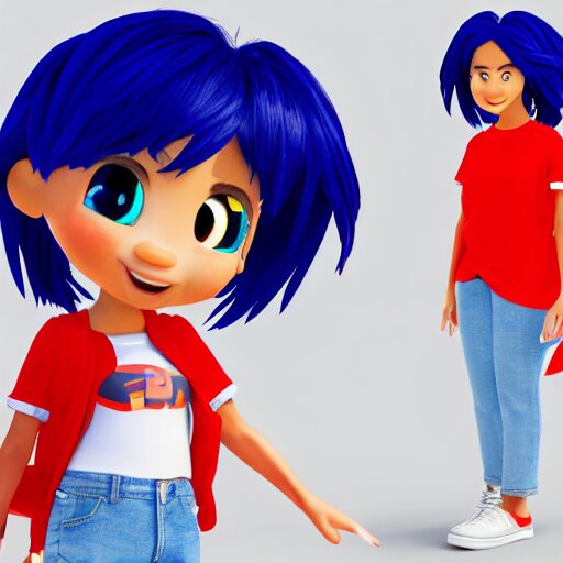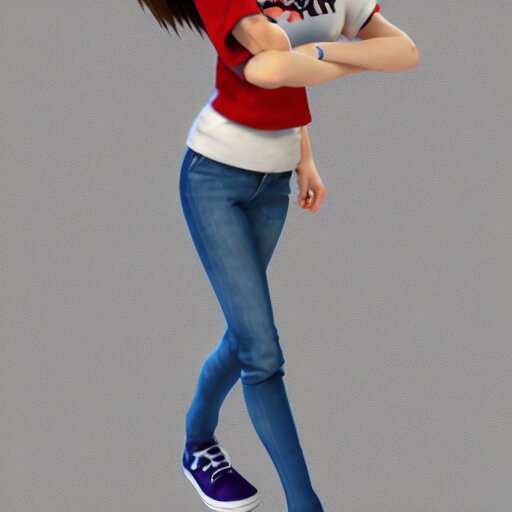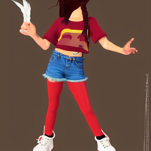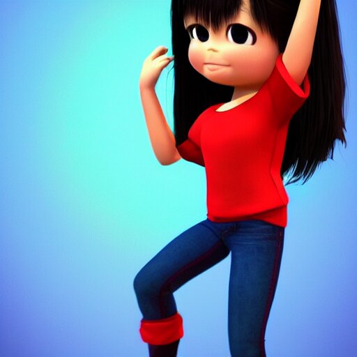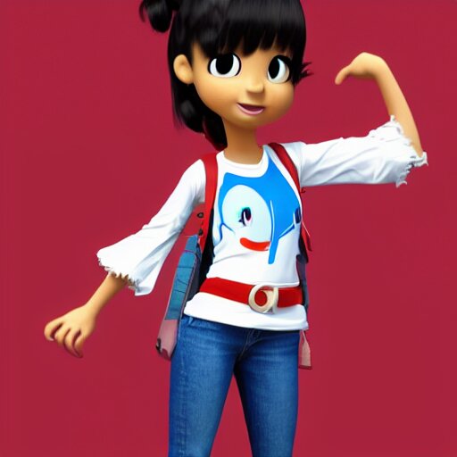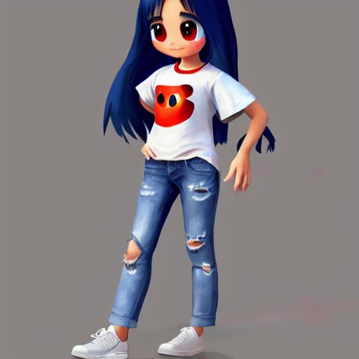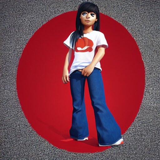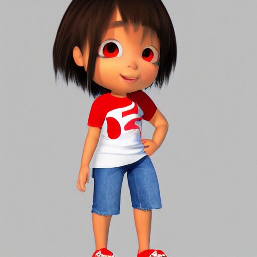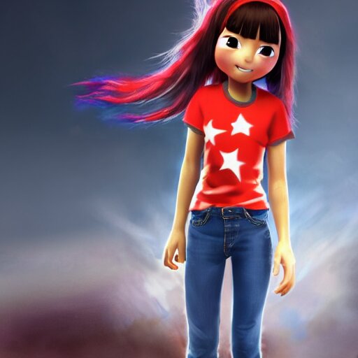 Splash art, full body, semi-realistic, latina indigenous little anime girl 3d pixar-style with a white t-shirt, red sleeves and regular blue jeans with cool shoes, her hair is made out of fire, trending on artstation