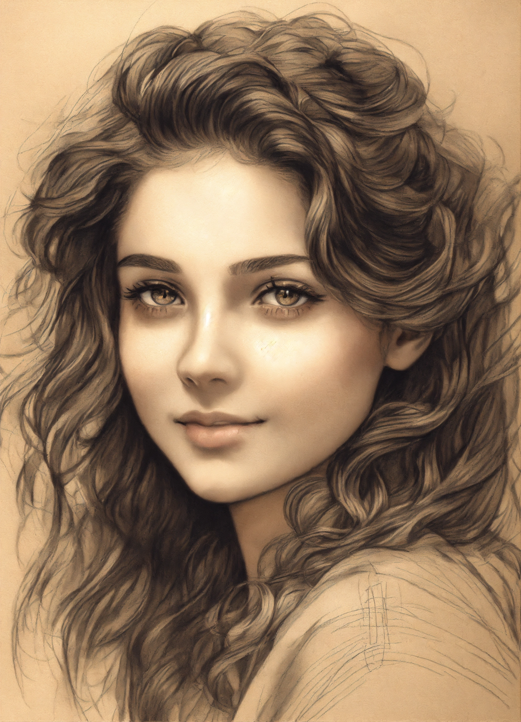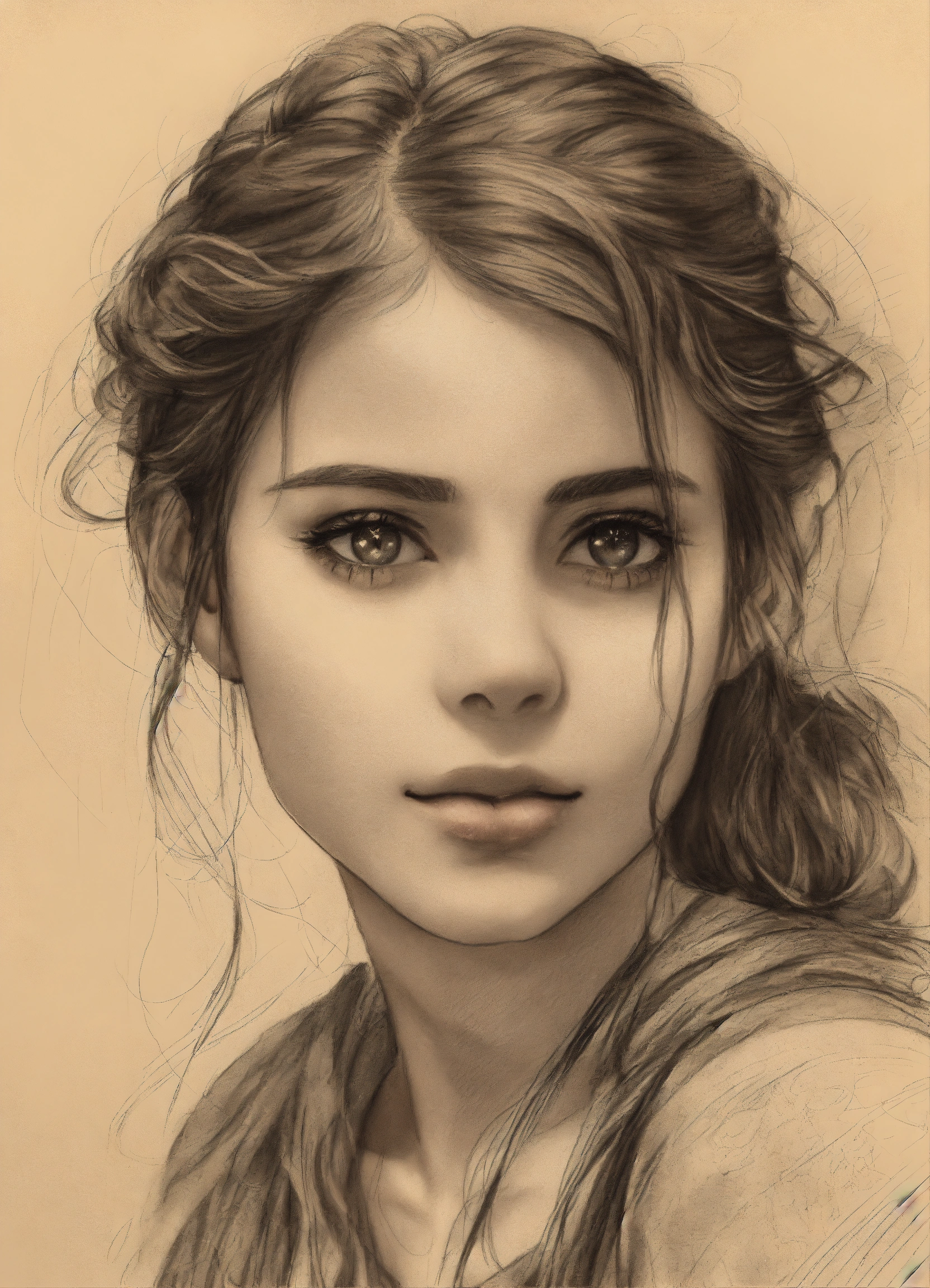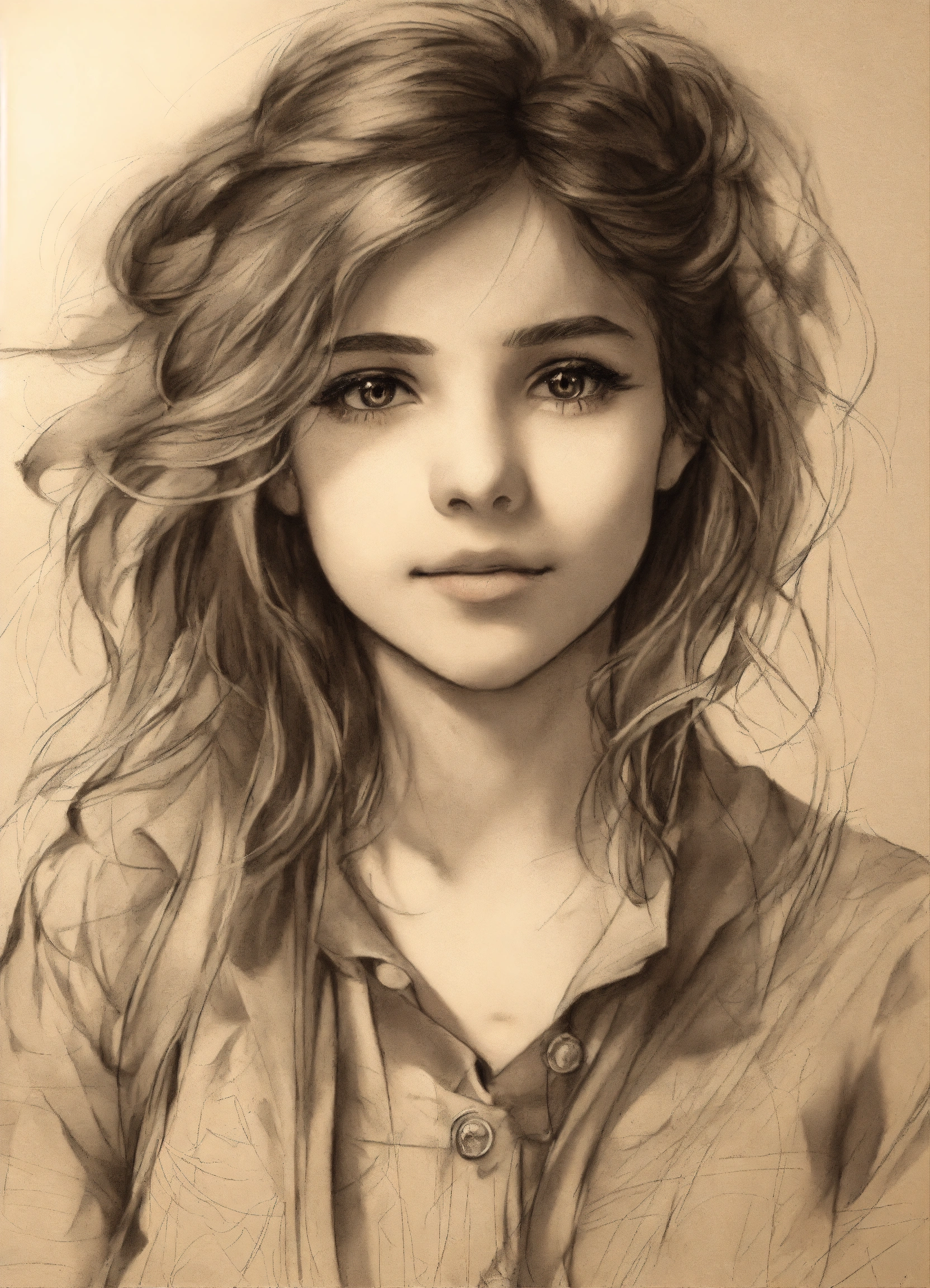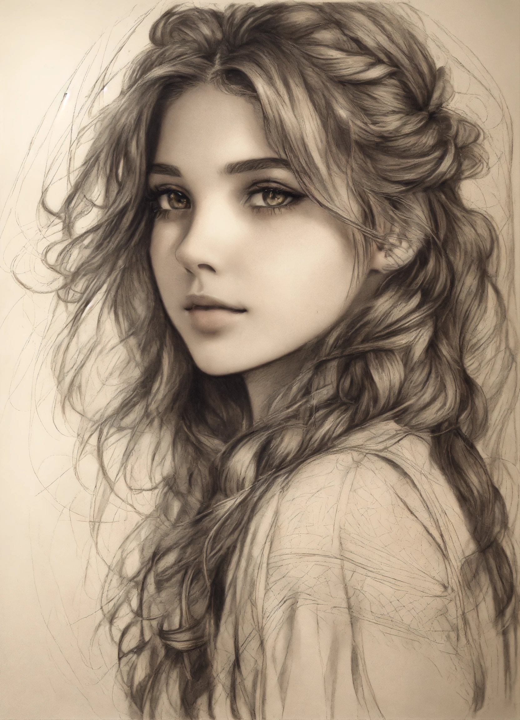 A pencil and charcoal line sketch portrait, beautiful face of a young france girl, big brown sparkling eyes, slight smile, fantasy clothes, messy hairstyle, intricate details and precisely drawn cross-hatching lines throughout the drawing, bold lines
