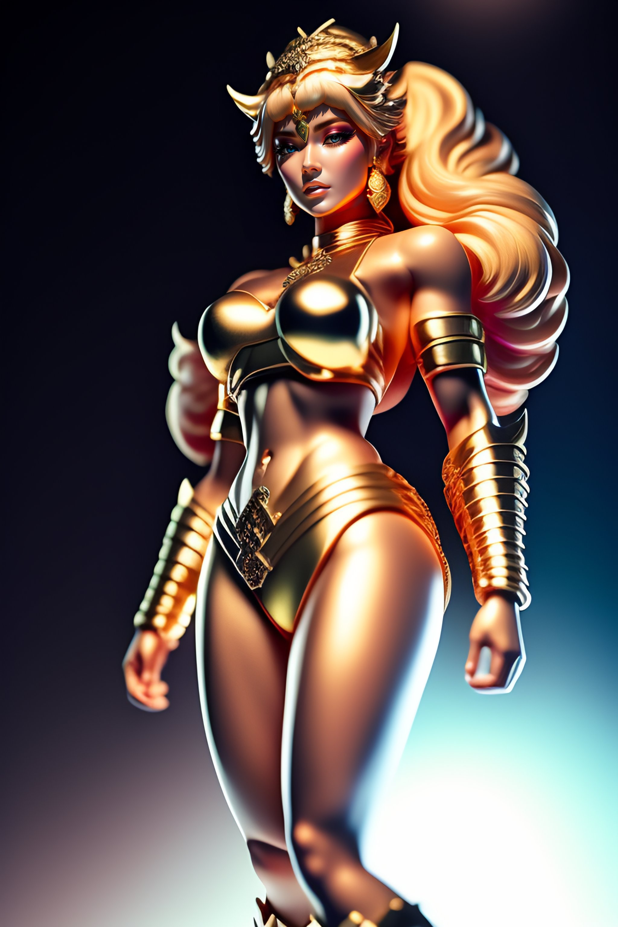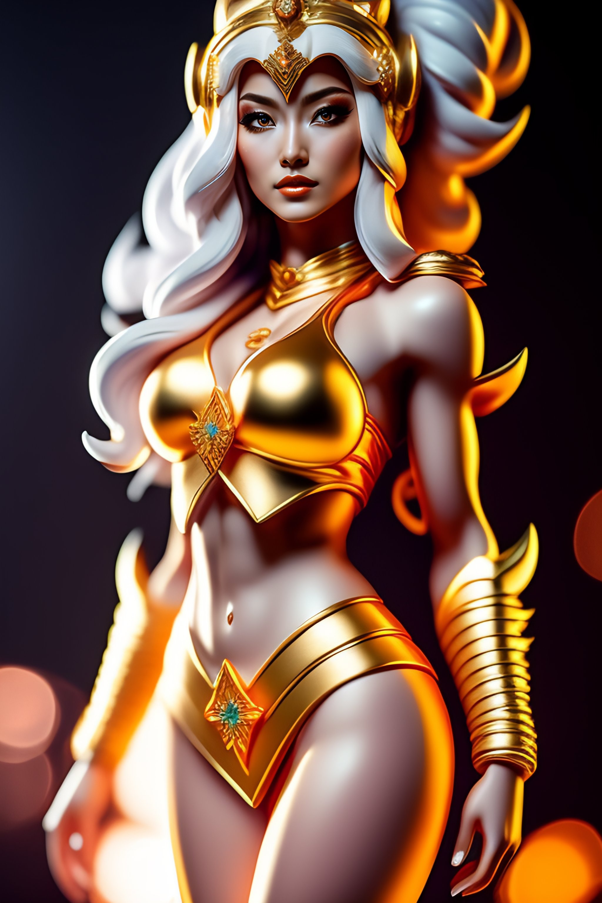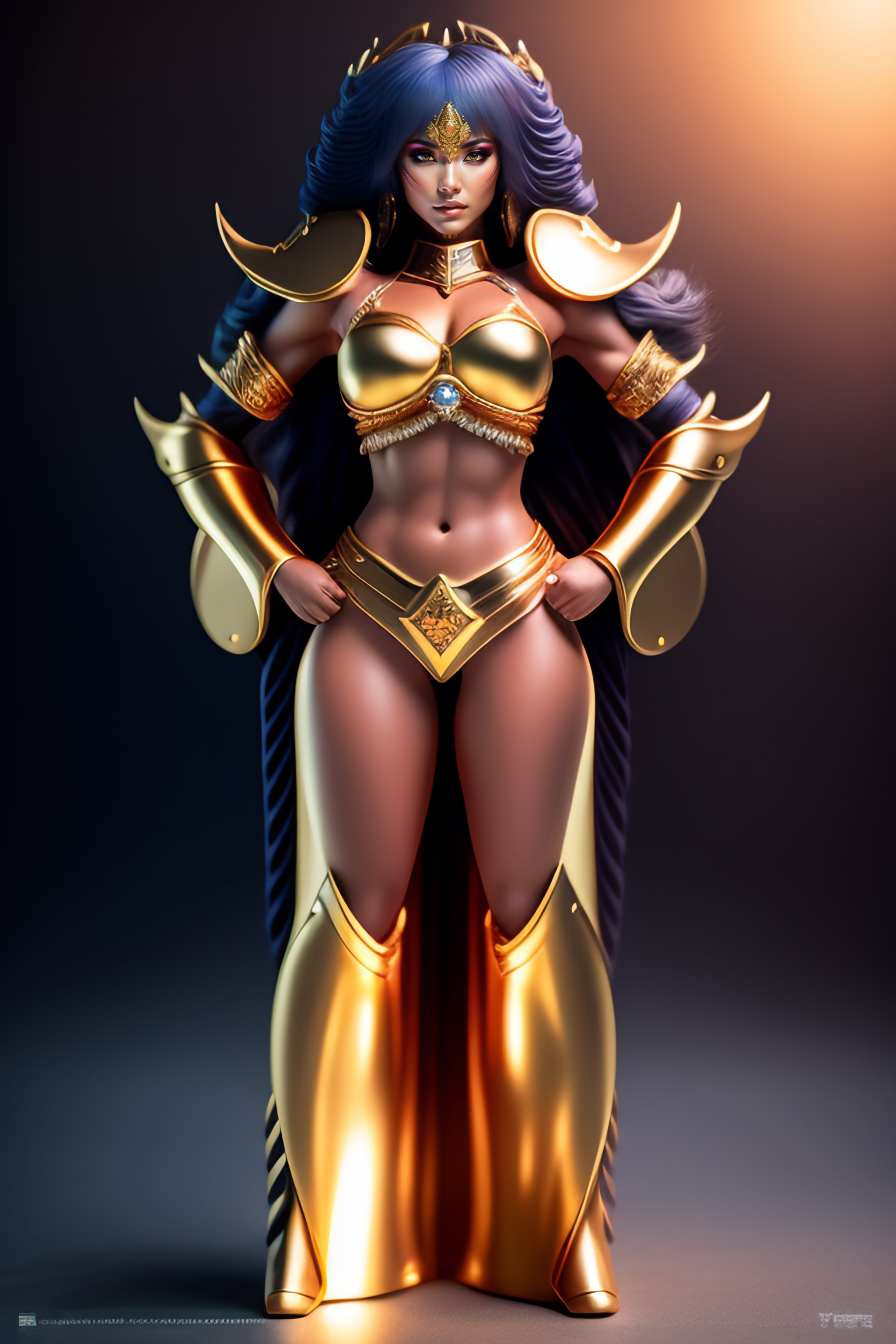 Portrait of a female saint seiya, full body view, cute, metal bikini, thin proportions, highly detailed, studio lighting, award photograph