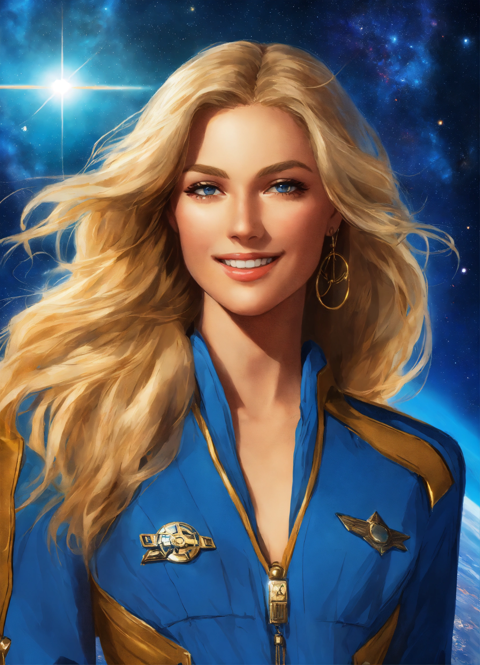 Very pretty woman, with long blond naturel hair, smiling, glamour and captain of galactic ships, very realisting hd, in blue and star sky+gold jumpsuit + combinaison de pilote + ceinture et épaulettes dorées