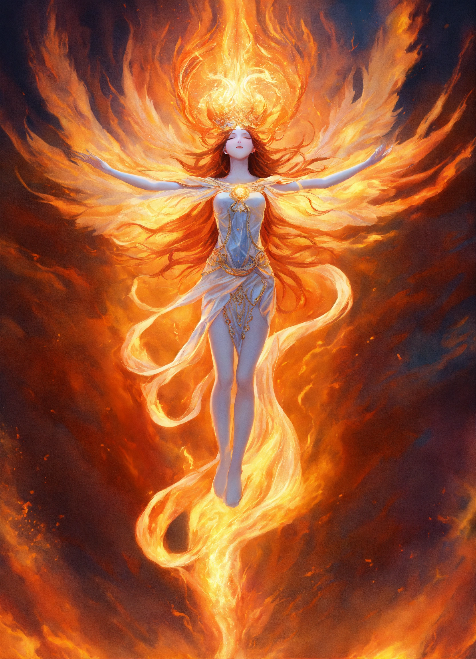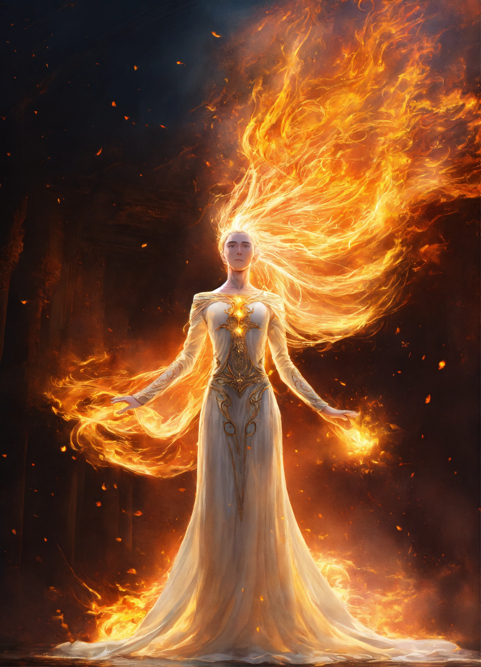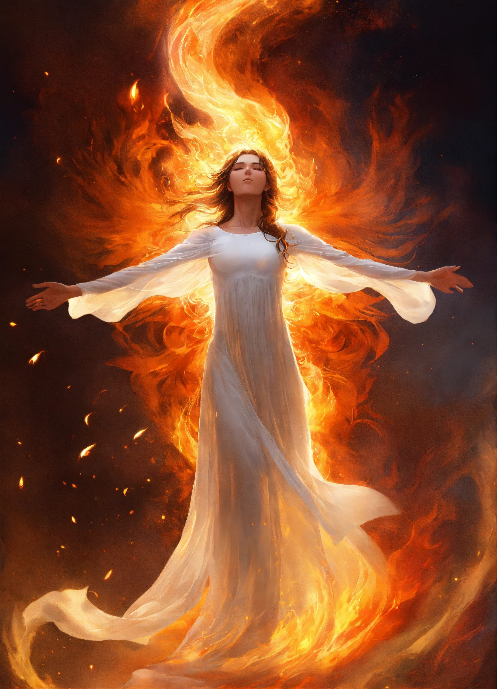 Captivating design, spirit man ascend, the spirit being's arms are spread out, white body, beaming light on her body, at the end of each arm, there are flames of fire