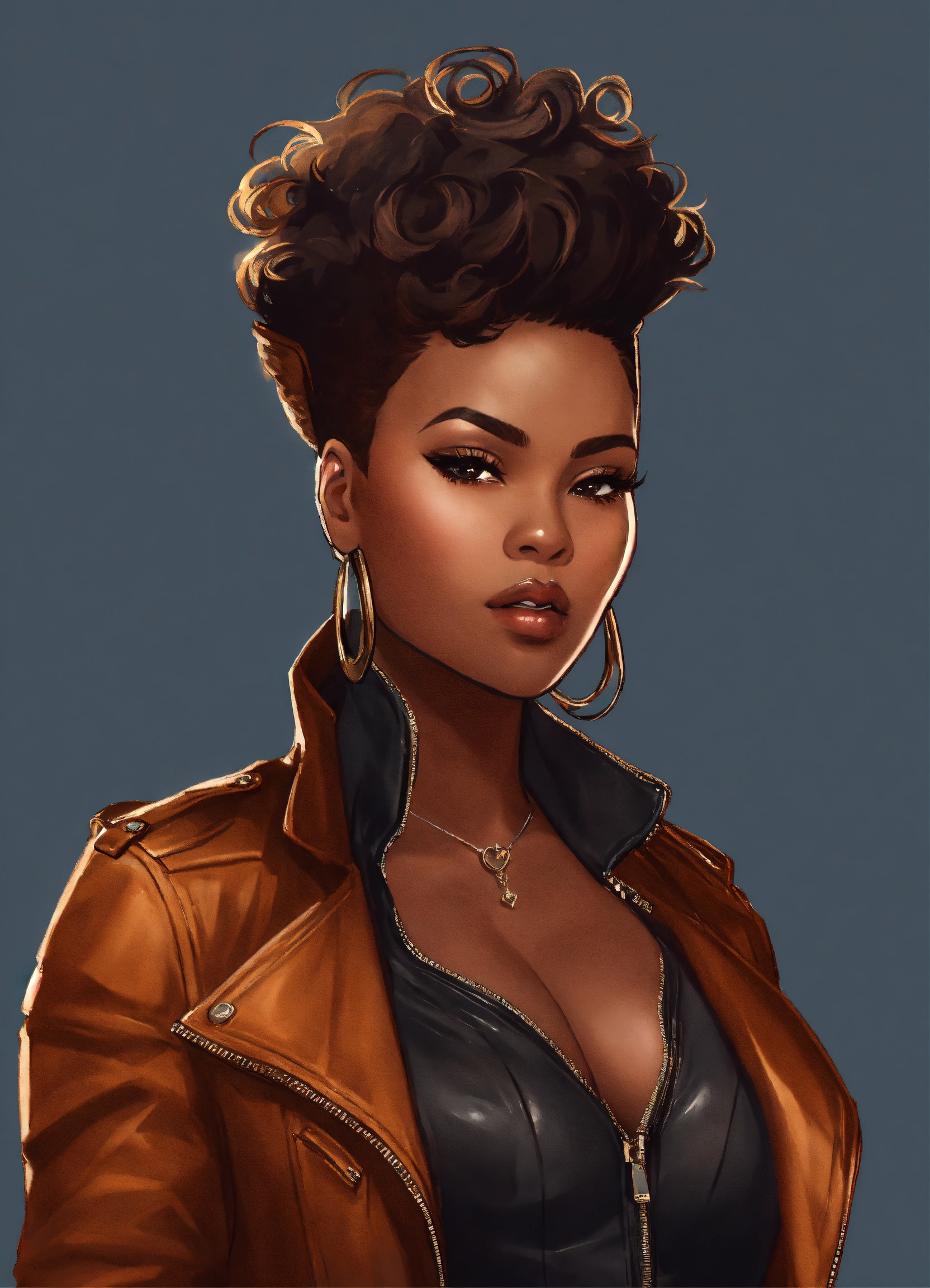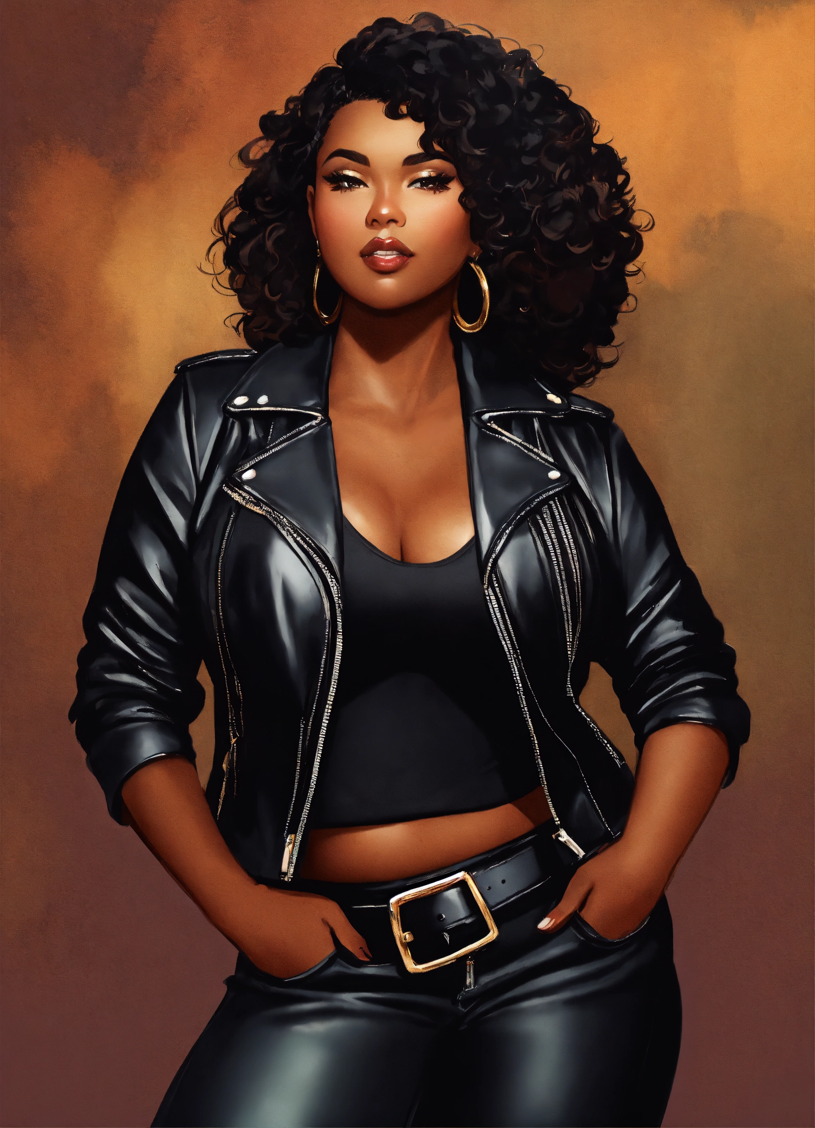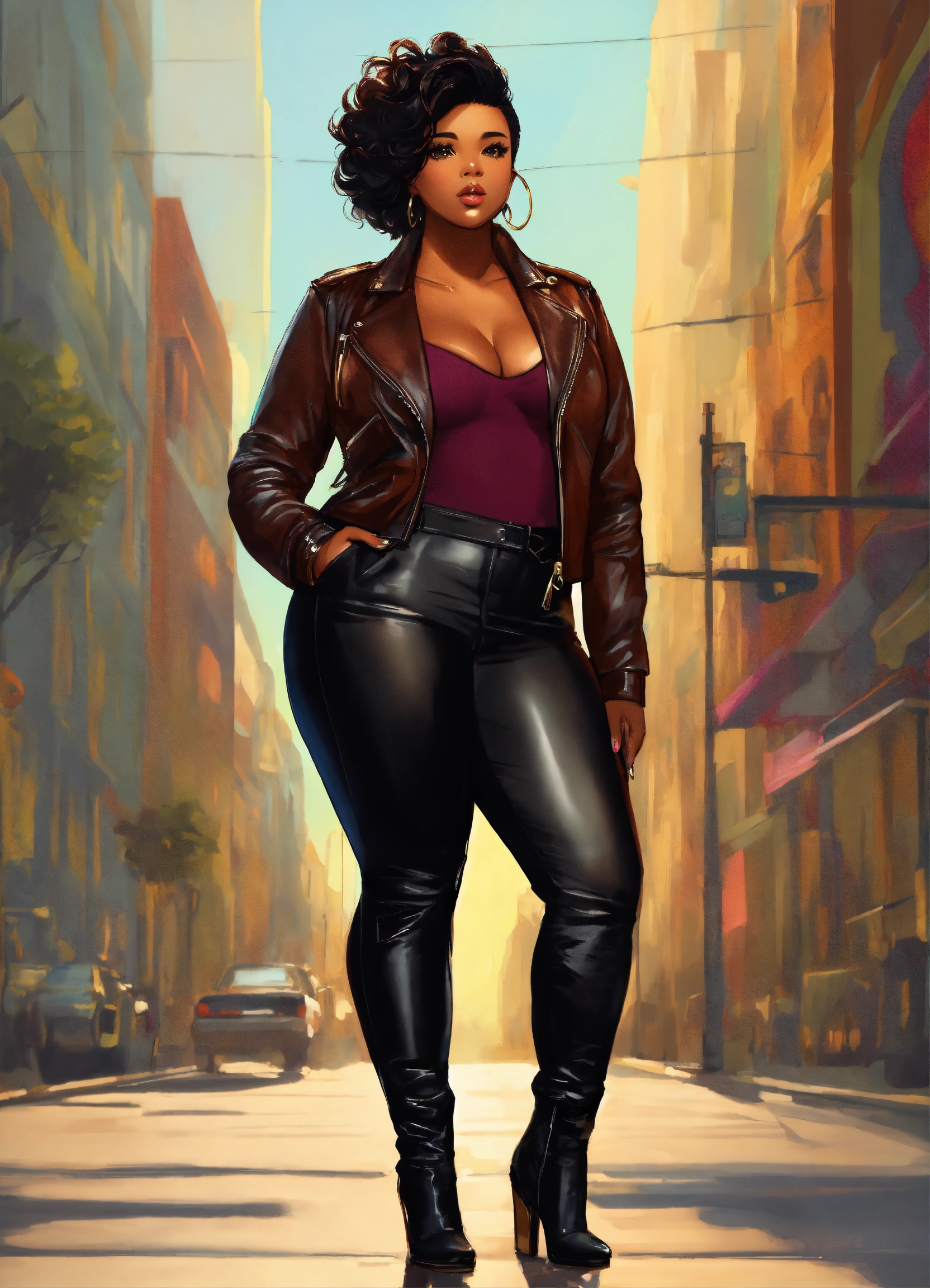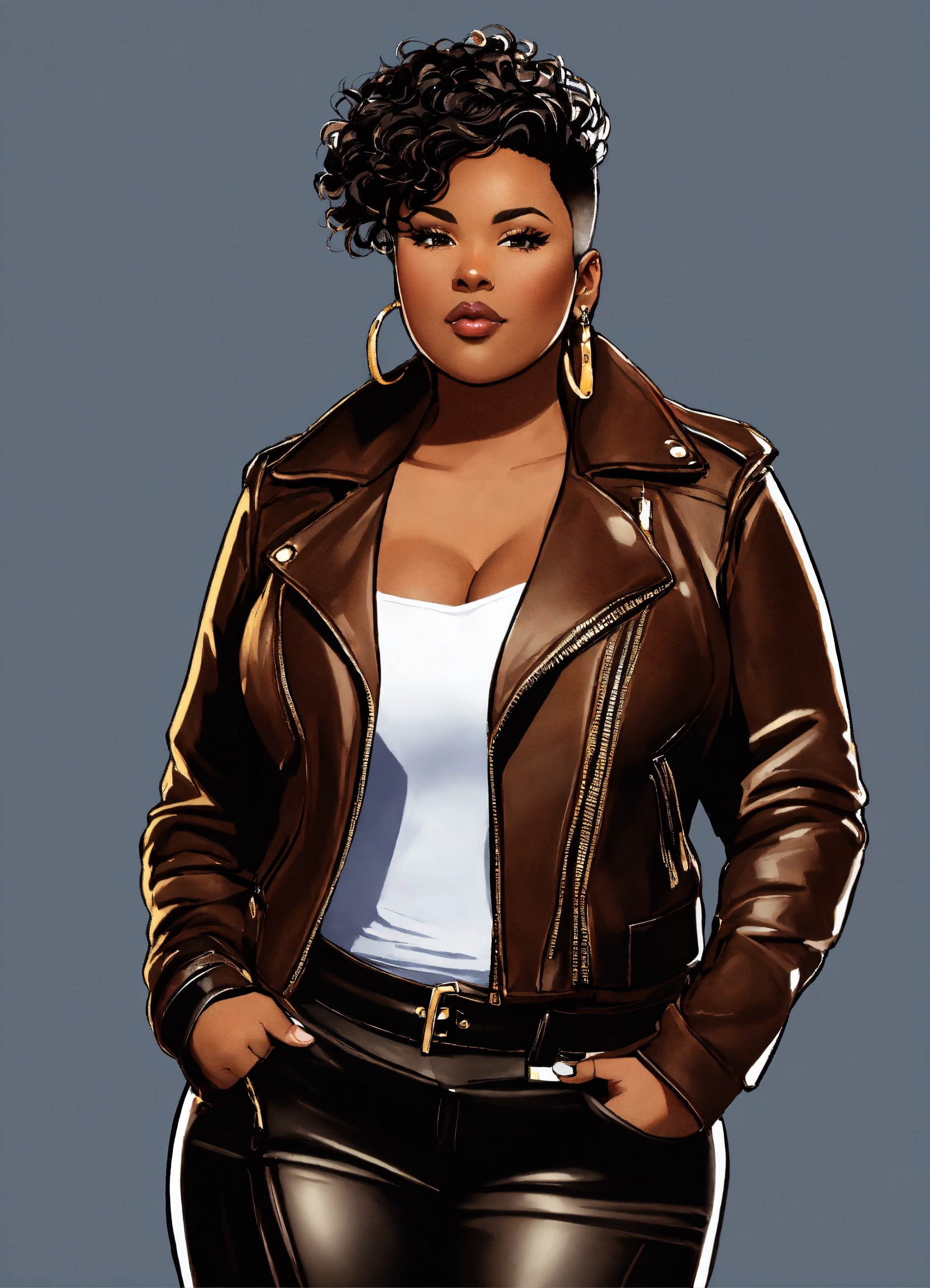 Illustration of an exquisite full figured black woman with high cheekbones. she's attired in leather pants and a biker jacket. her luscious dark brown hair is styled in a pixie haircut with shaved sides, creating a stunning visual. the full-body image accentuates her poised stance and the harmonious blend of her outfit's colors.