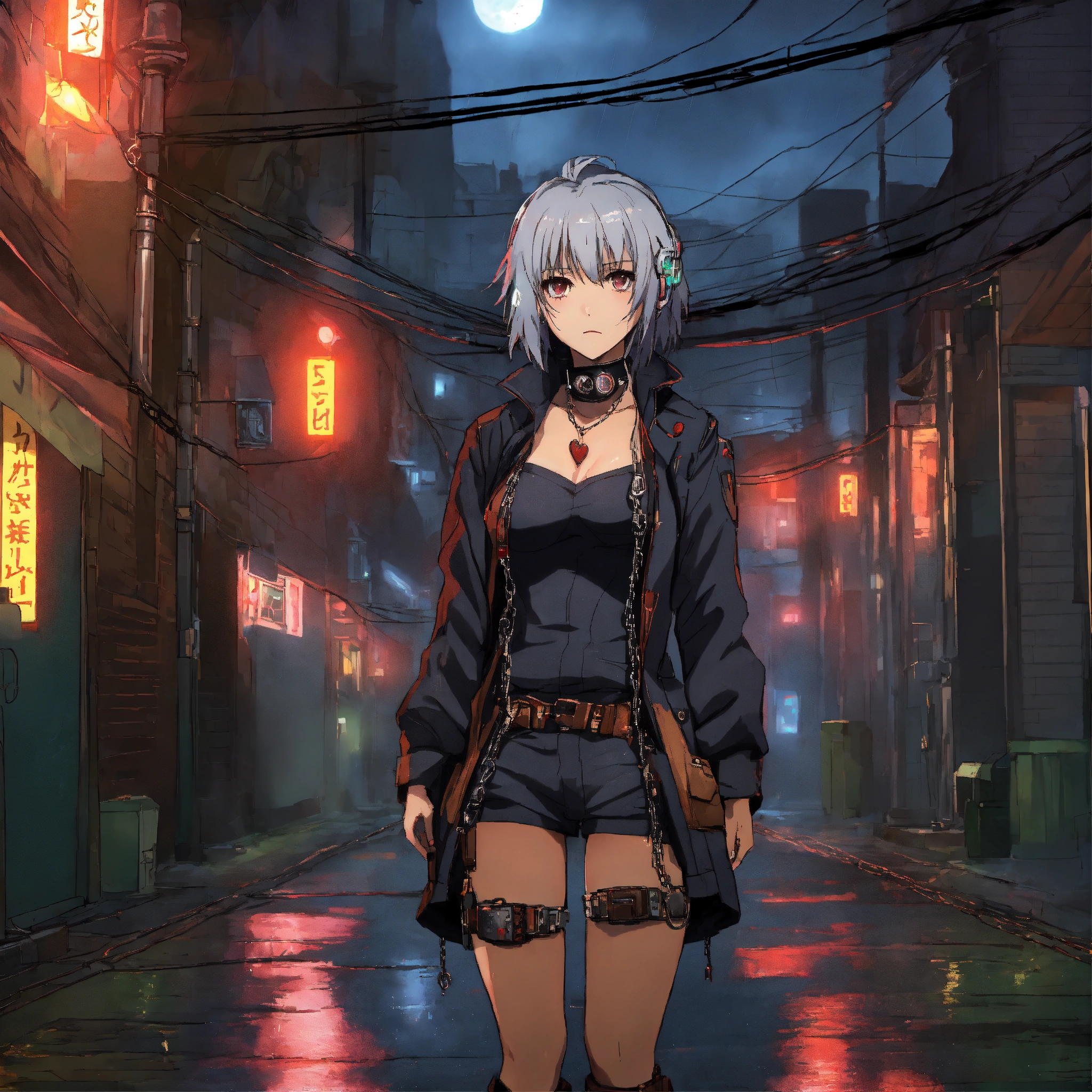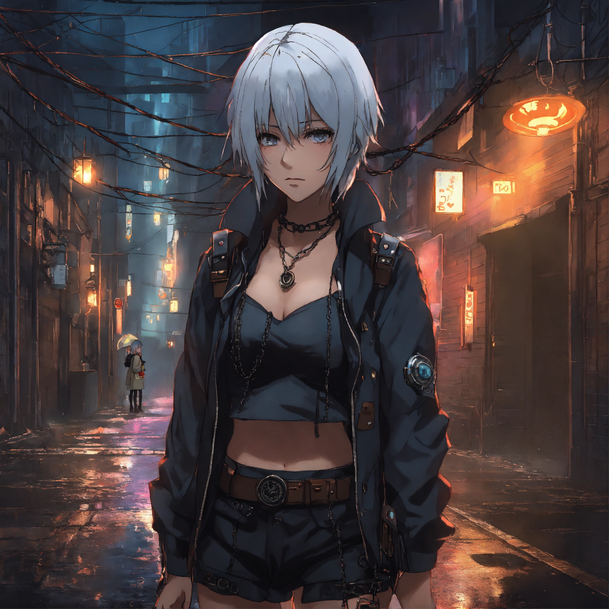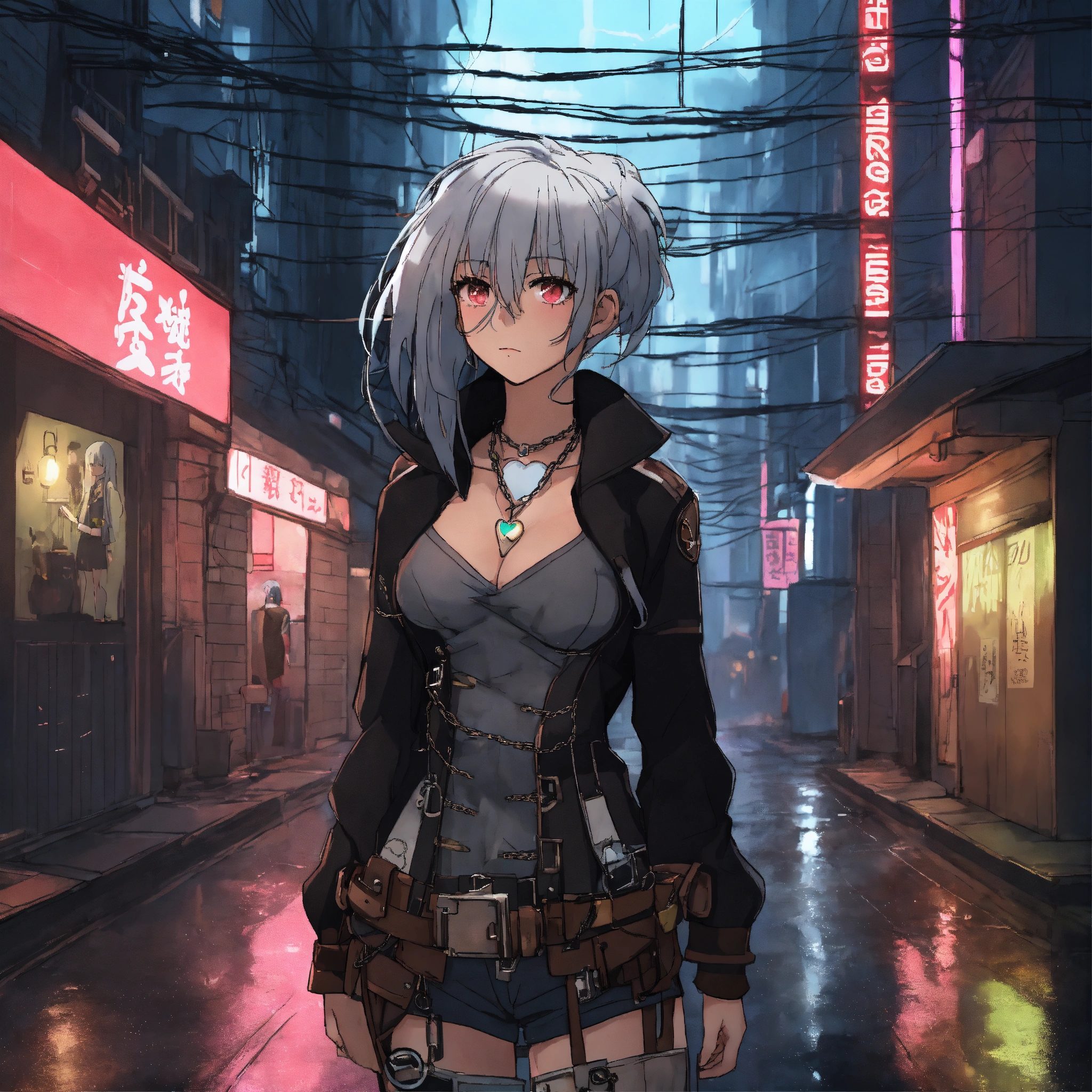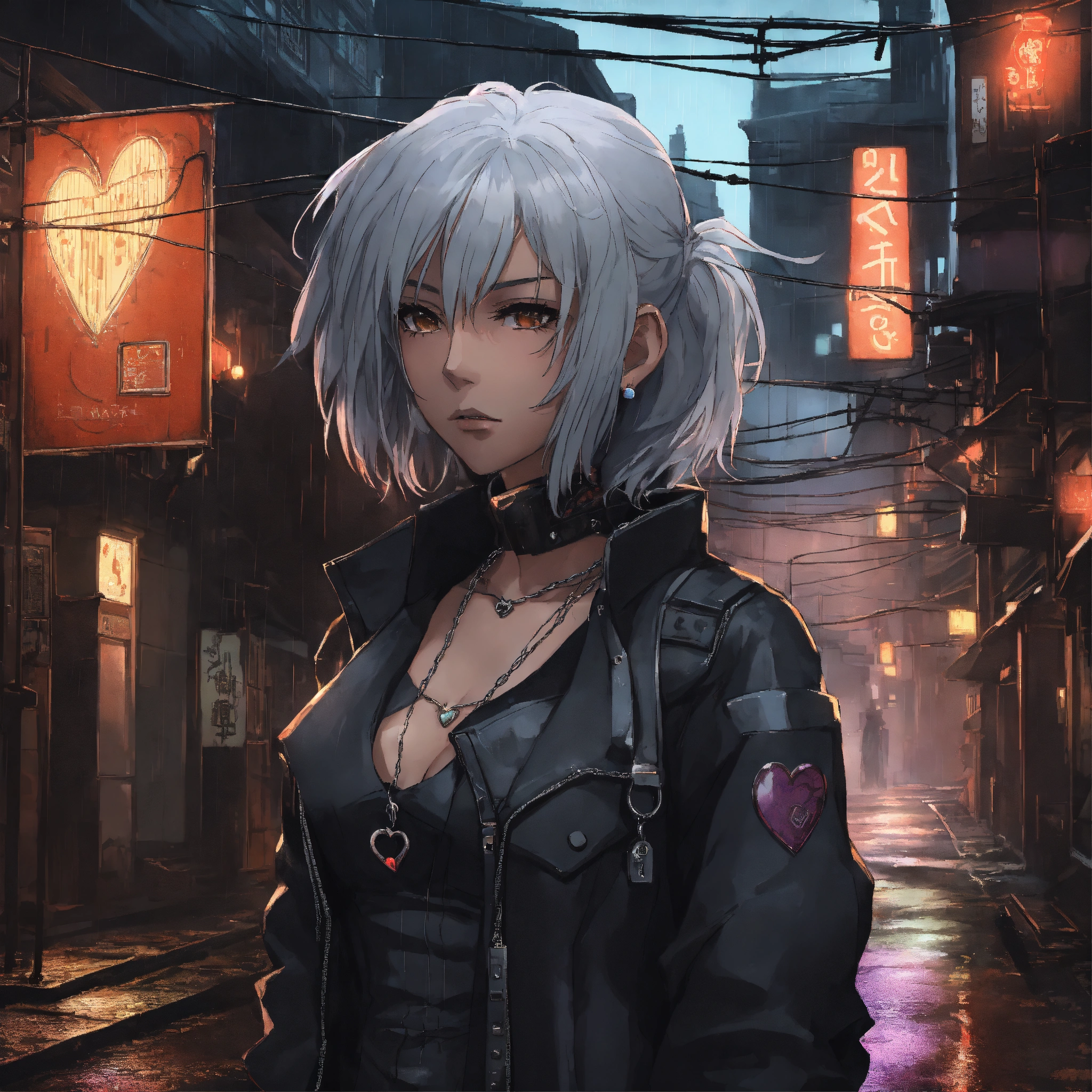 Cyberpunk city heart broken steampunk girl with silver hair standing in the middle of the alleyway while it is a rainy dark night anime style studio ghibli, looking away from the camera emo girl wearing chains and showing skin the girl is wearing a heart necklace anime style
