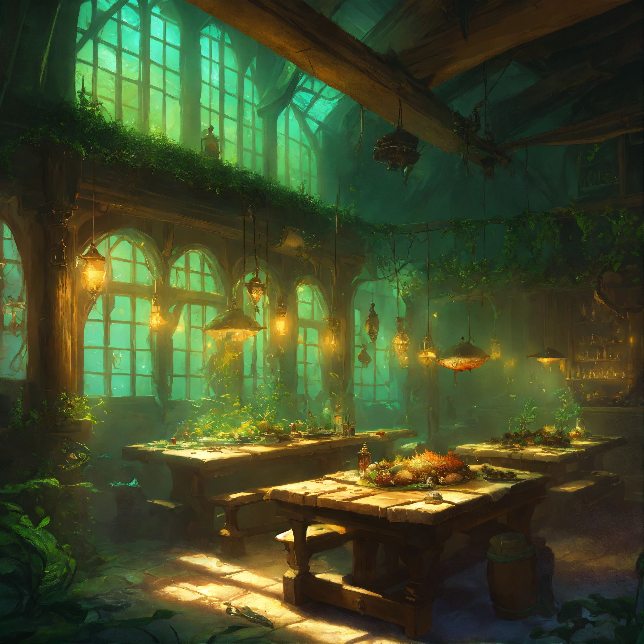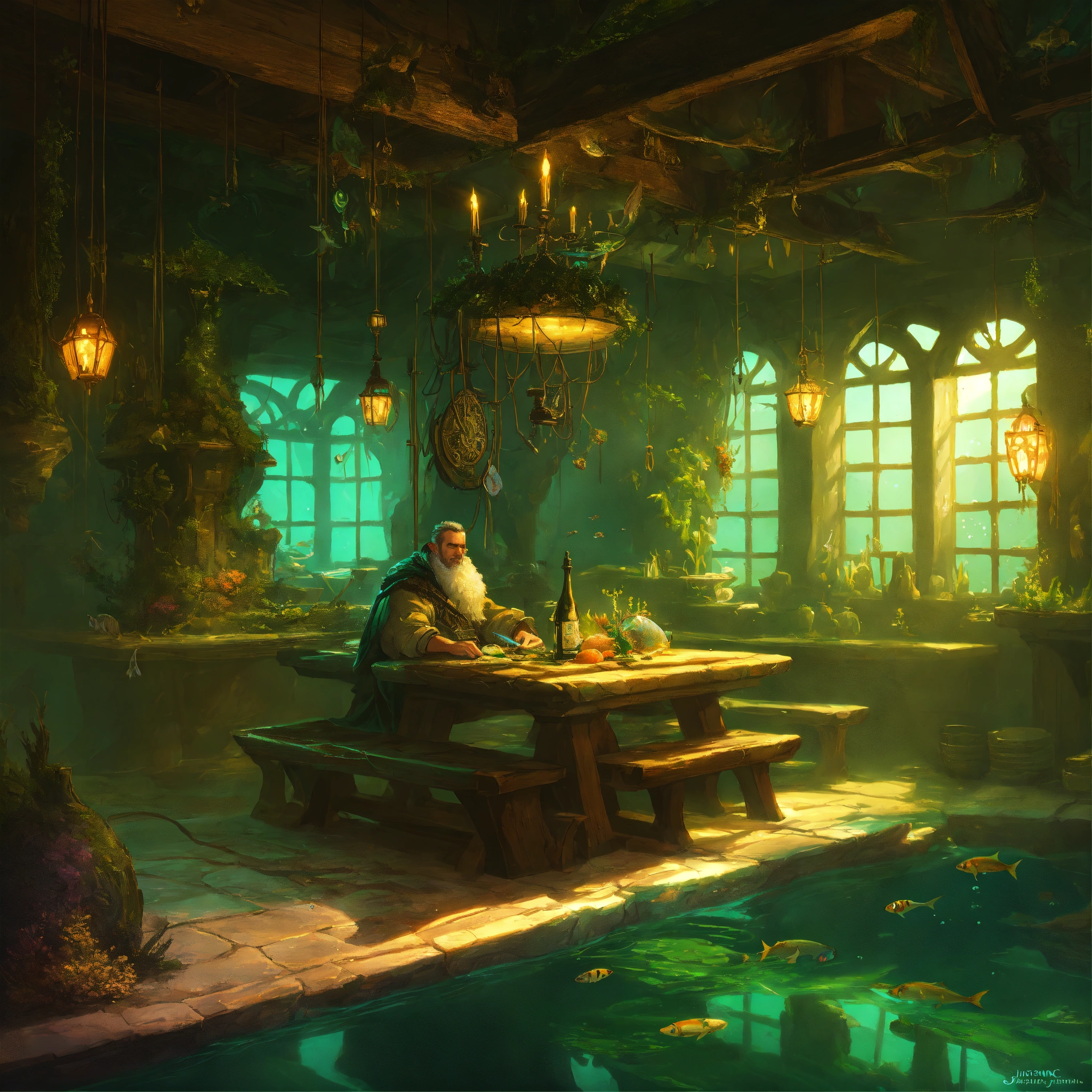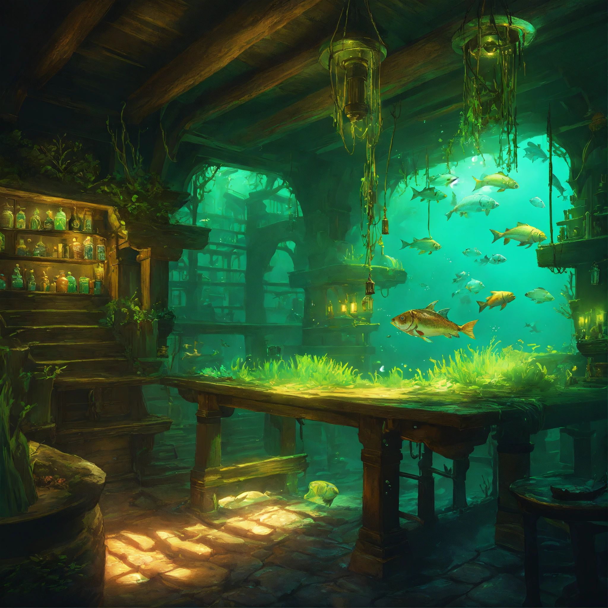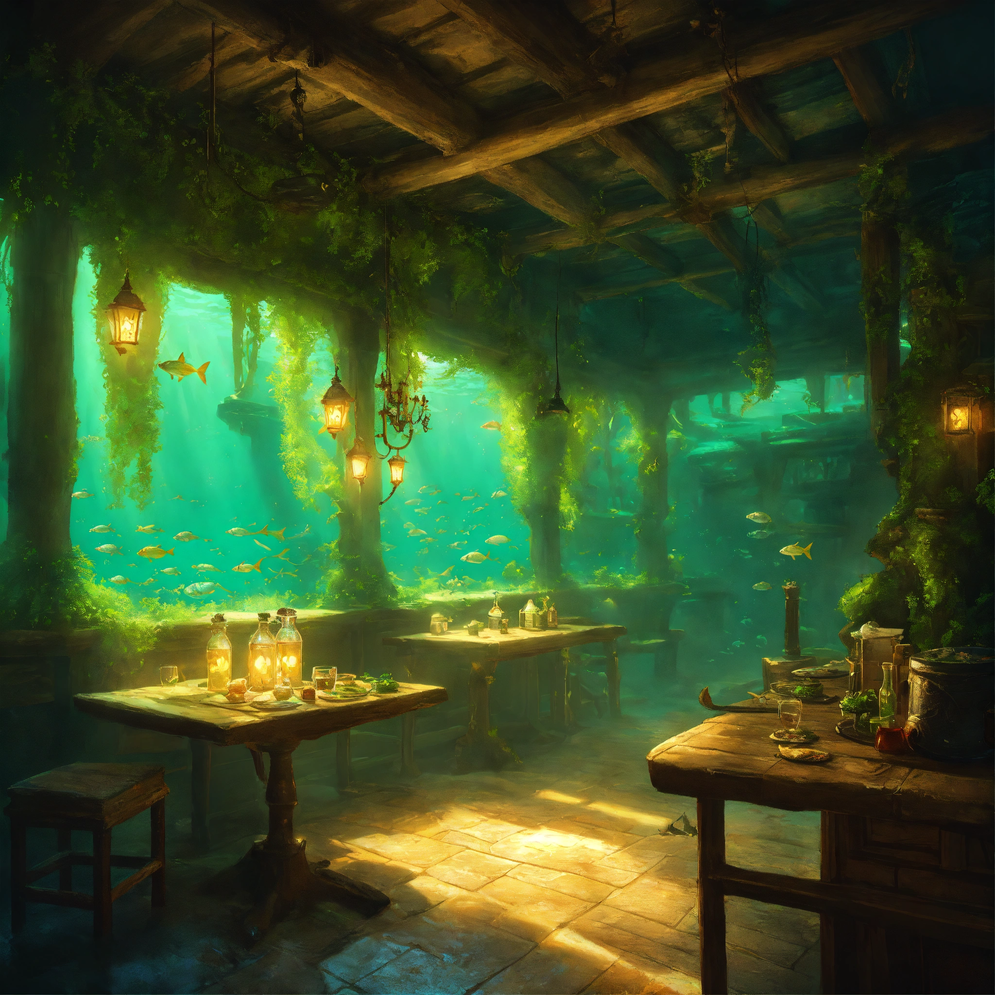 Underwater old tavern with a lot of fish inside by justin gerard and greg rutkowski, digital art, realistic painting, fantasy, dnd, character design, trending on artstation. green ambient light