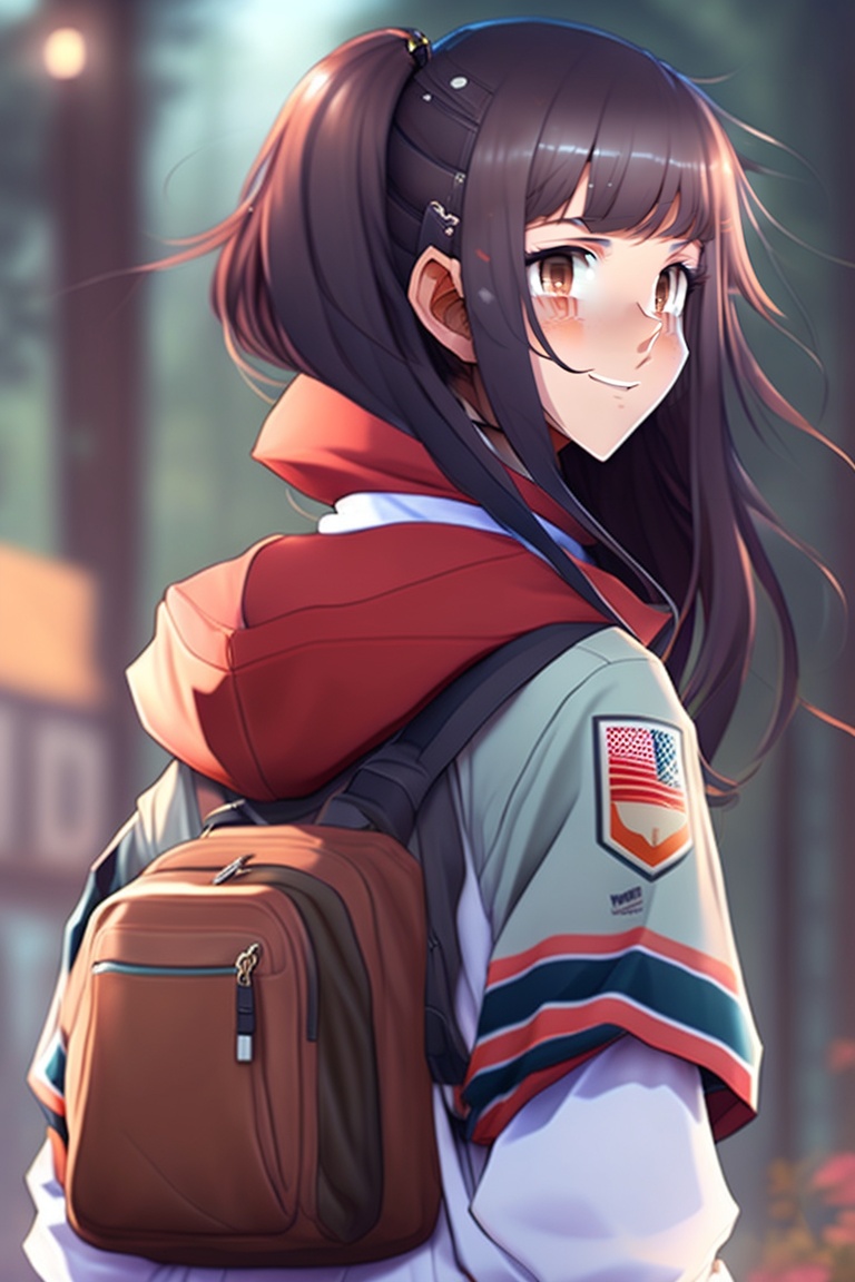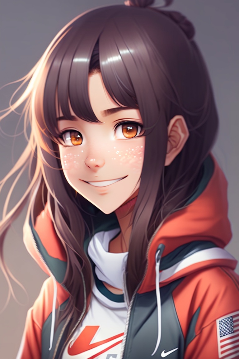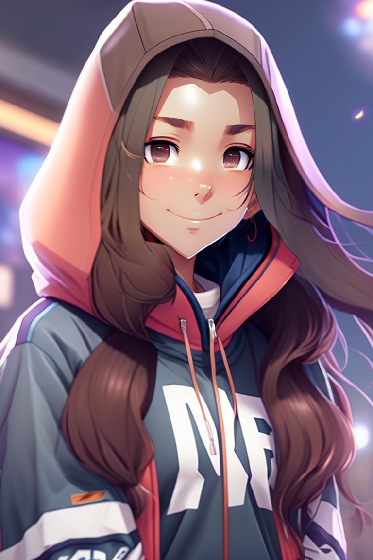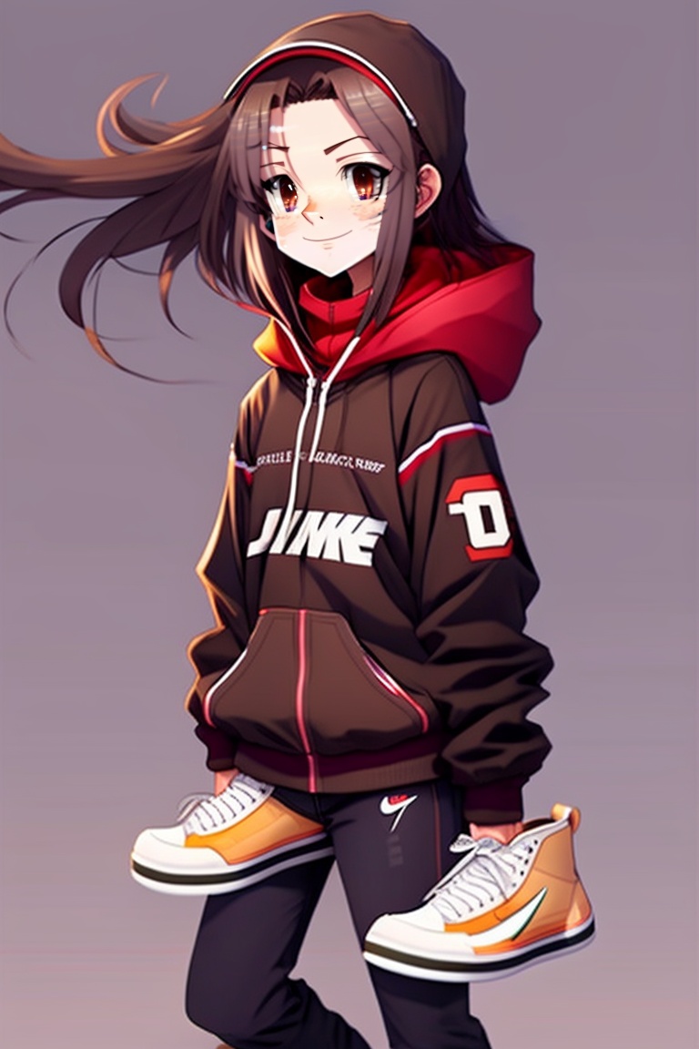 A cute anime girl with long dark brown hair, dark eyes, brown skin, wearing a nike hoodie and jordans with cute smile