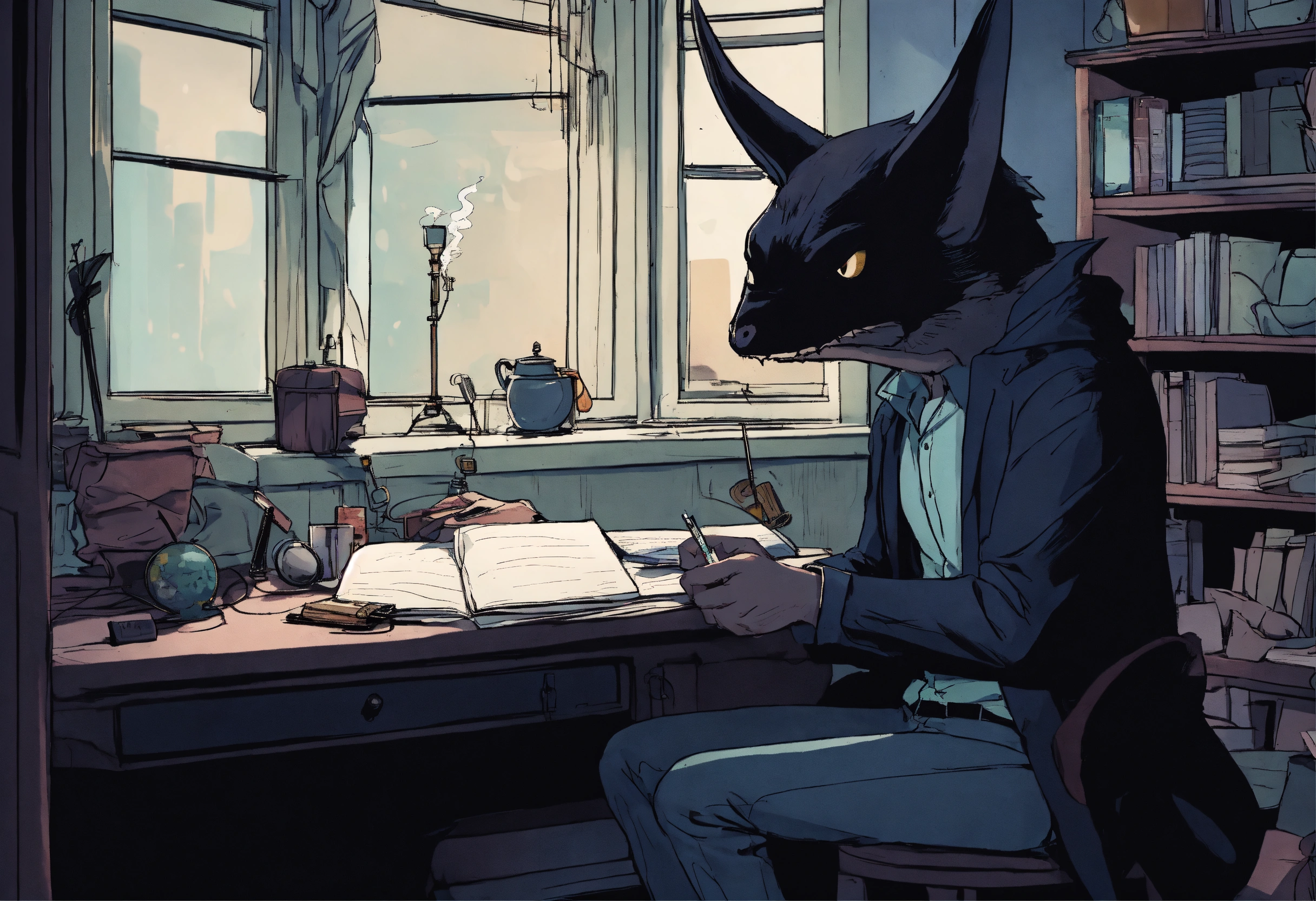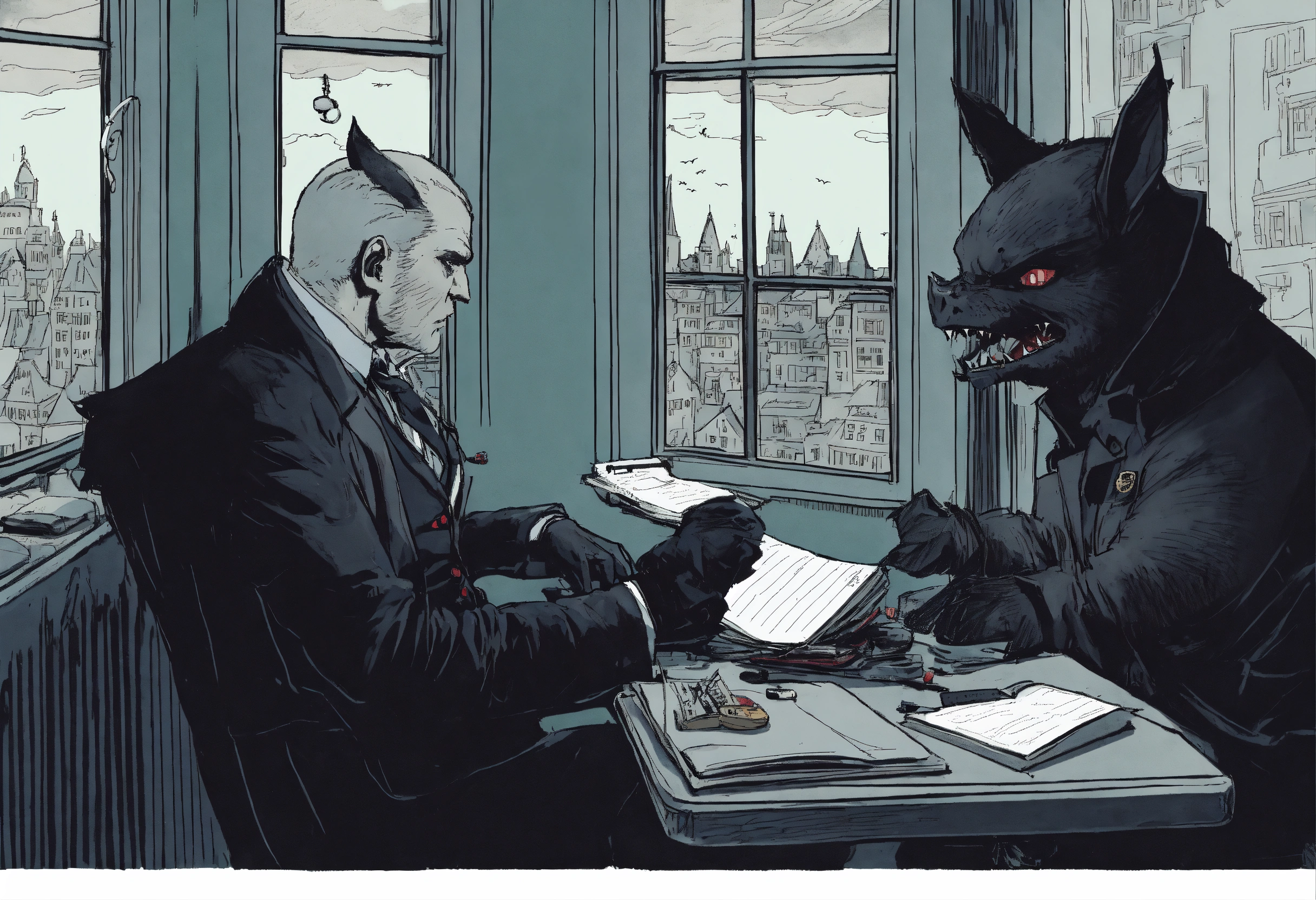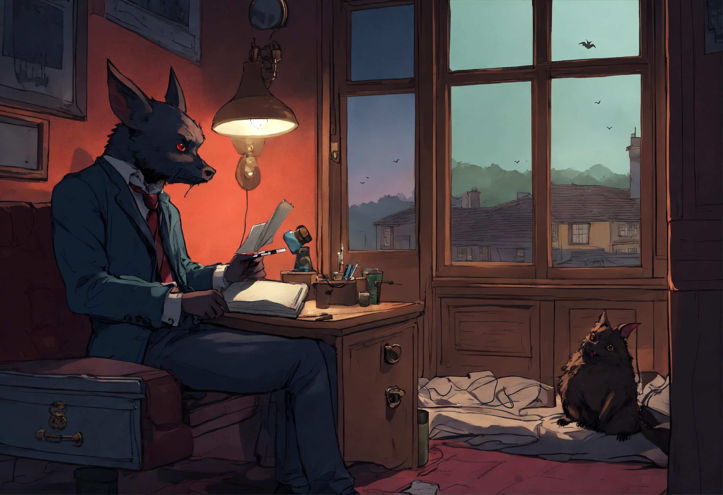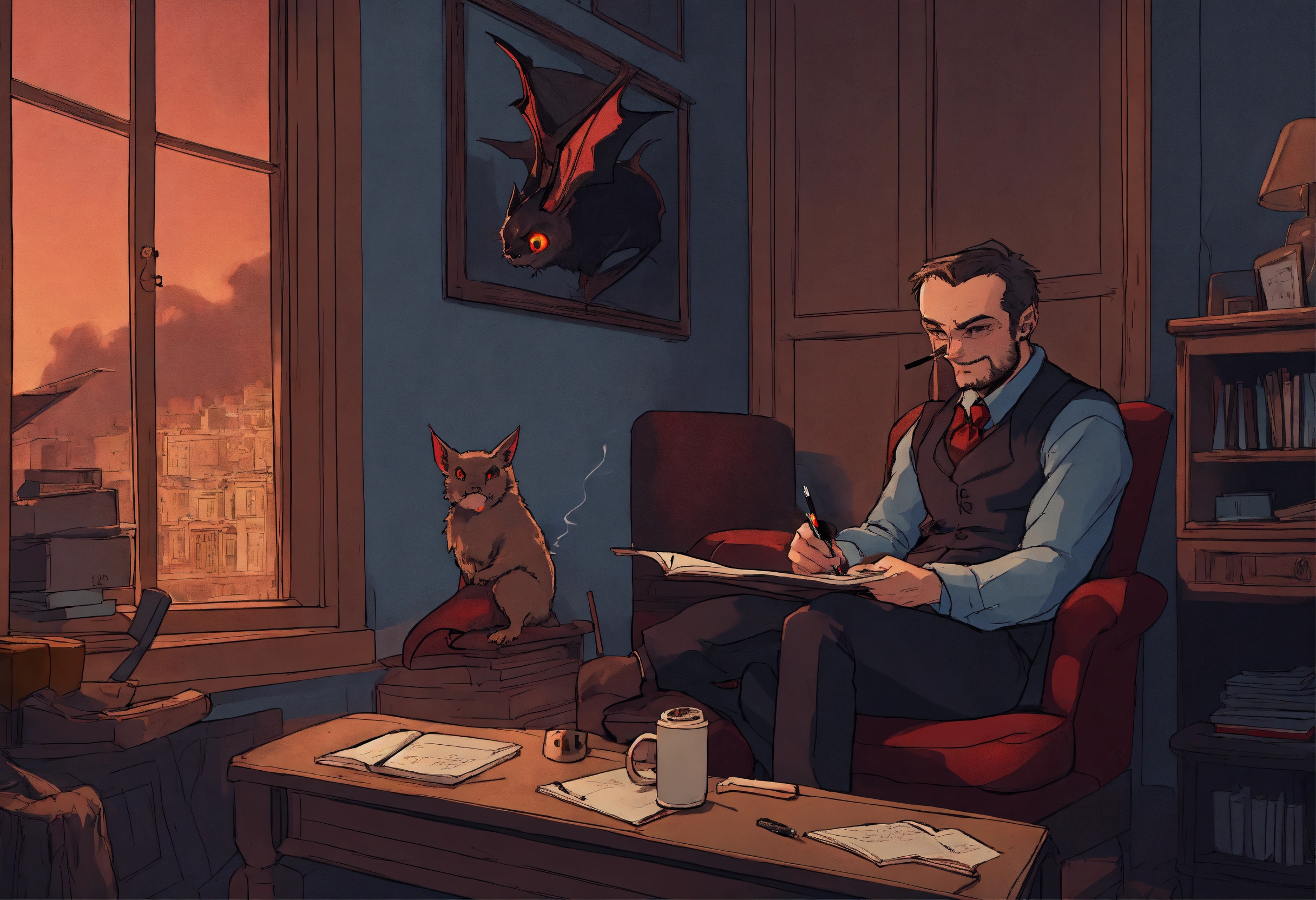 An investigative journalist sits in a dingy hotel room, smoking a cigarette as he scribbles furiously on a notepad. he is speaking with a vampire bat who stants at a nearby window, looking forlornly down at ths street below as it tells its story to the journalist, who is listening intently to the vampire bat. make sure to show both the investigative journalist and the human-sized anthropomorphic vampire bat together in the same image, having a conversation with each other.
