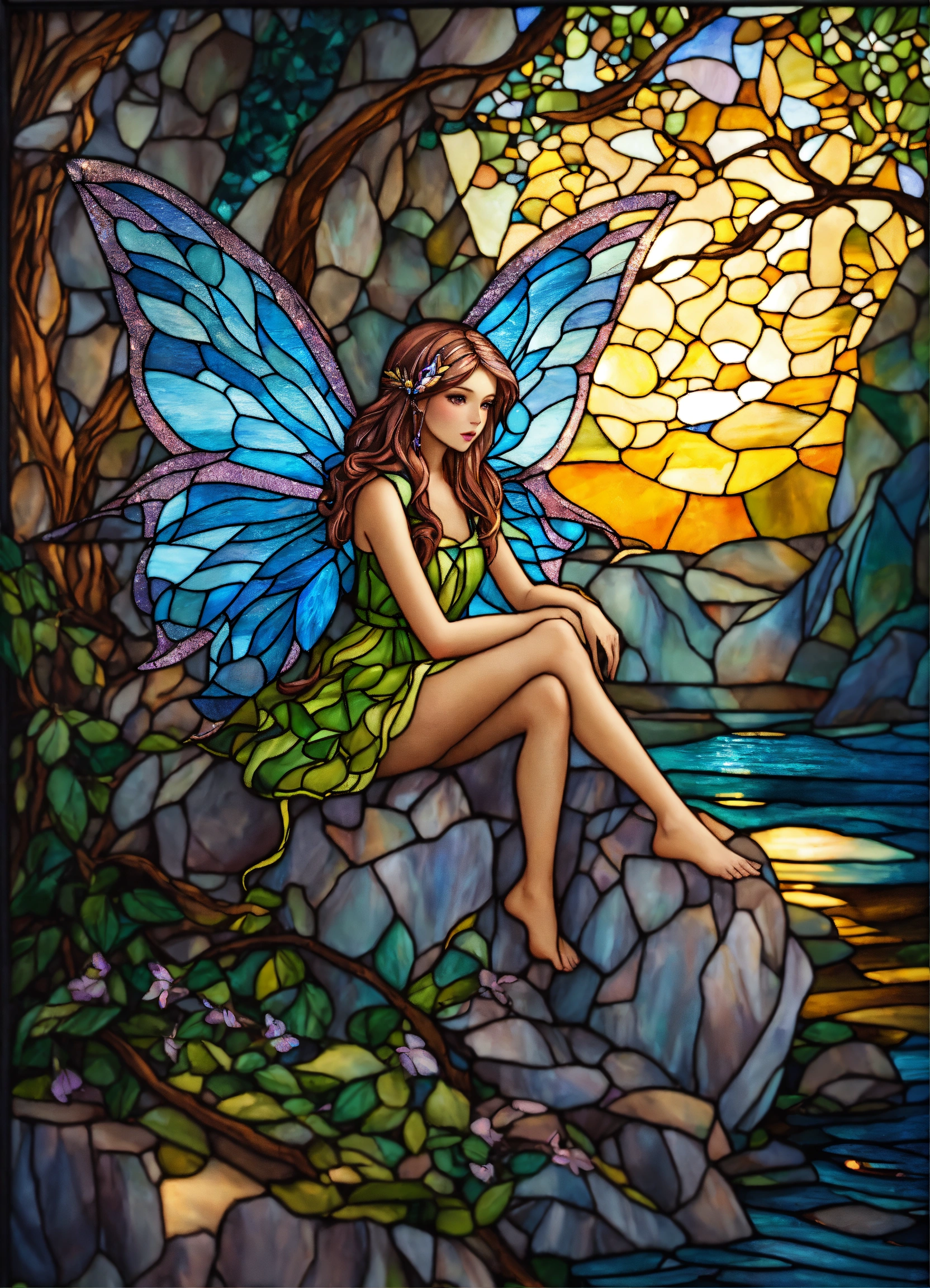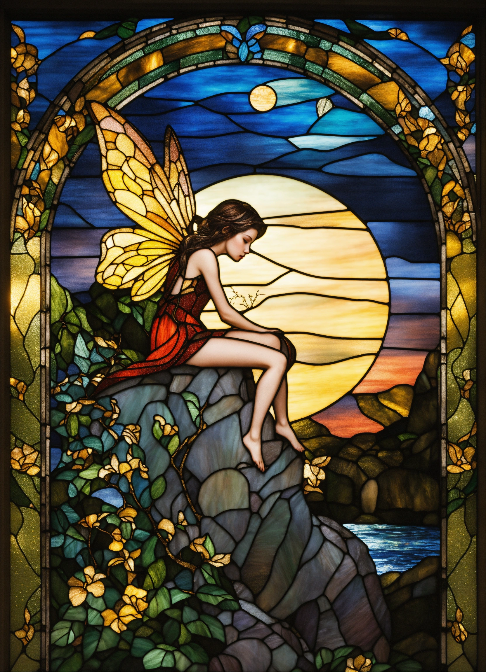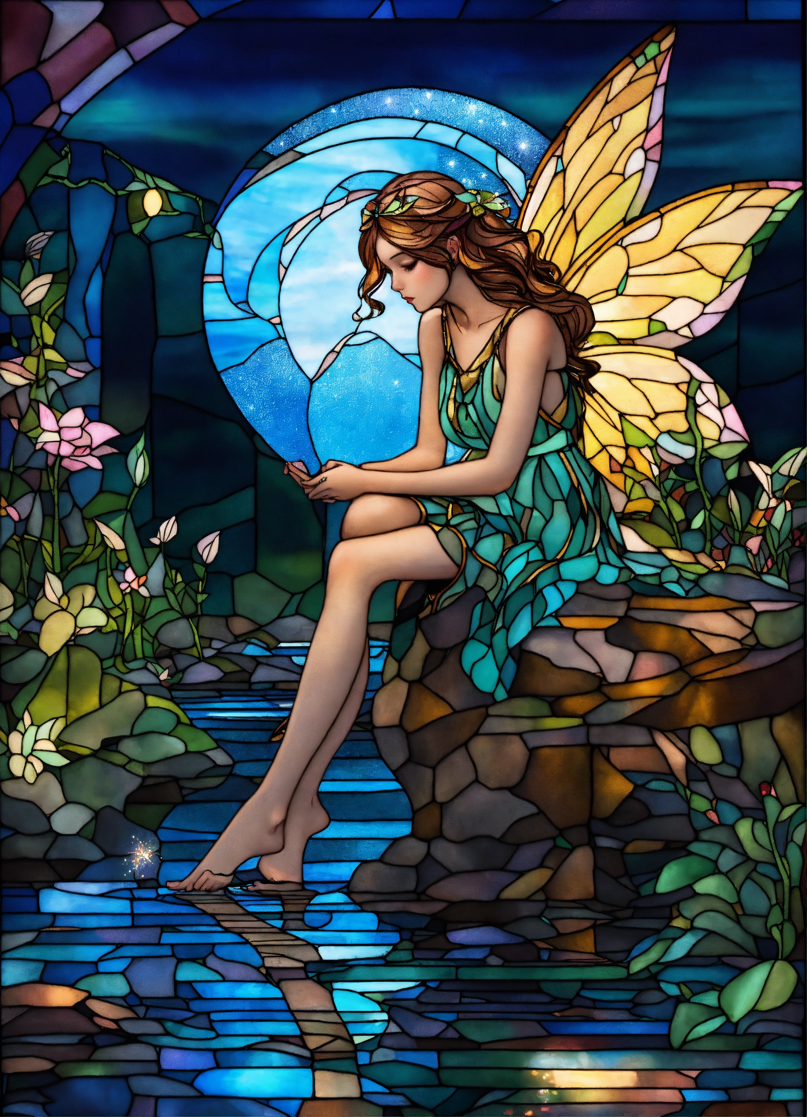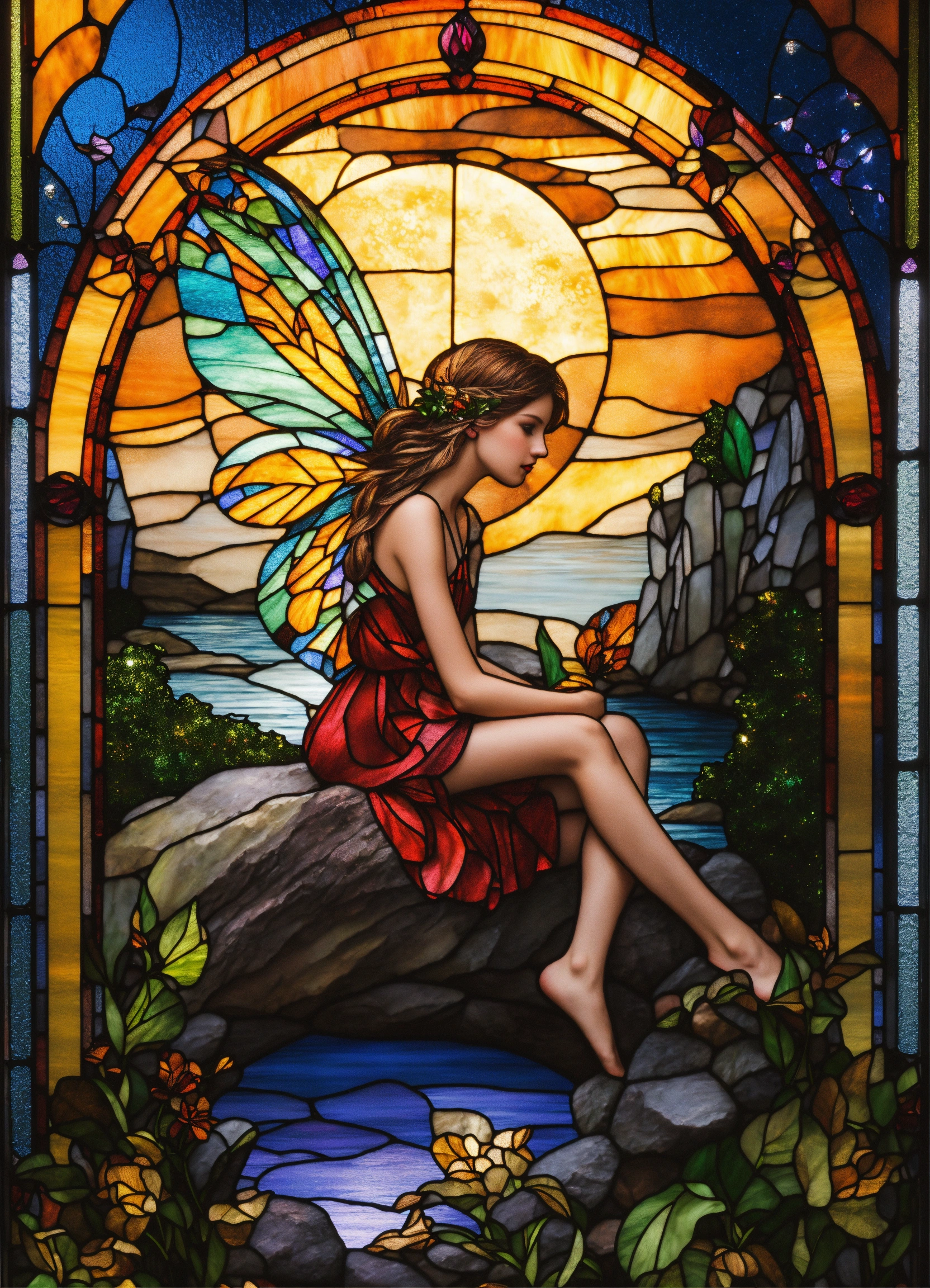 Stained glass window of a fairy in the moonlight, sitting on a rock hyper detailed, hyper realistic image, vibrant colors, with glitter