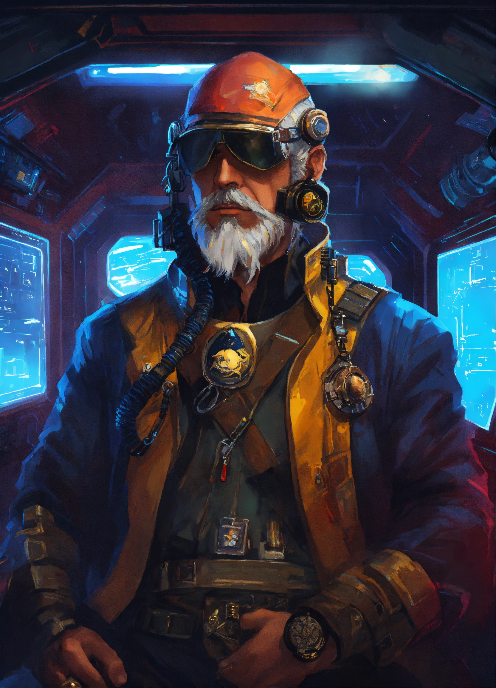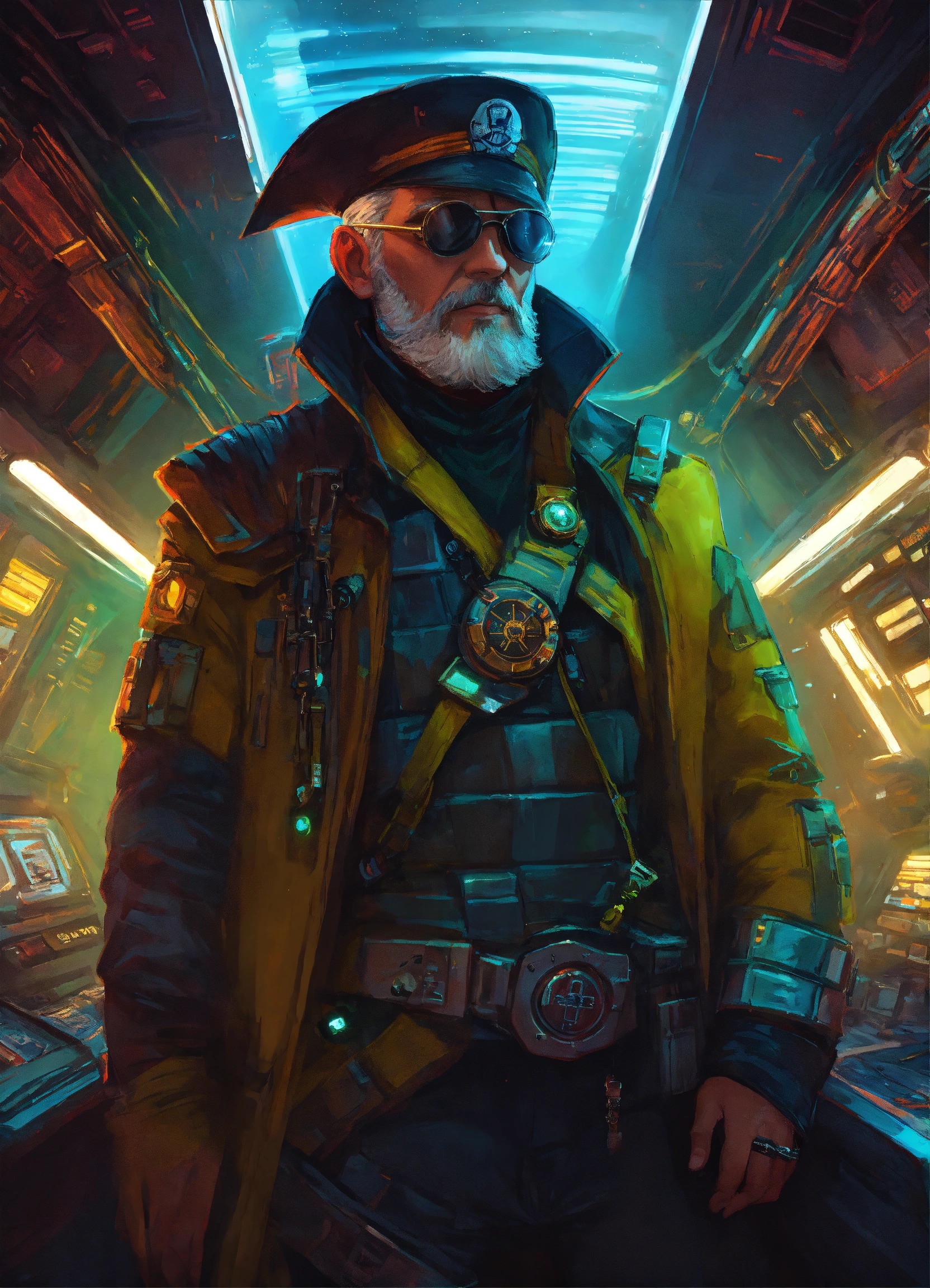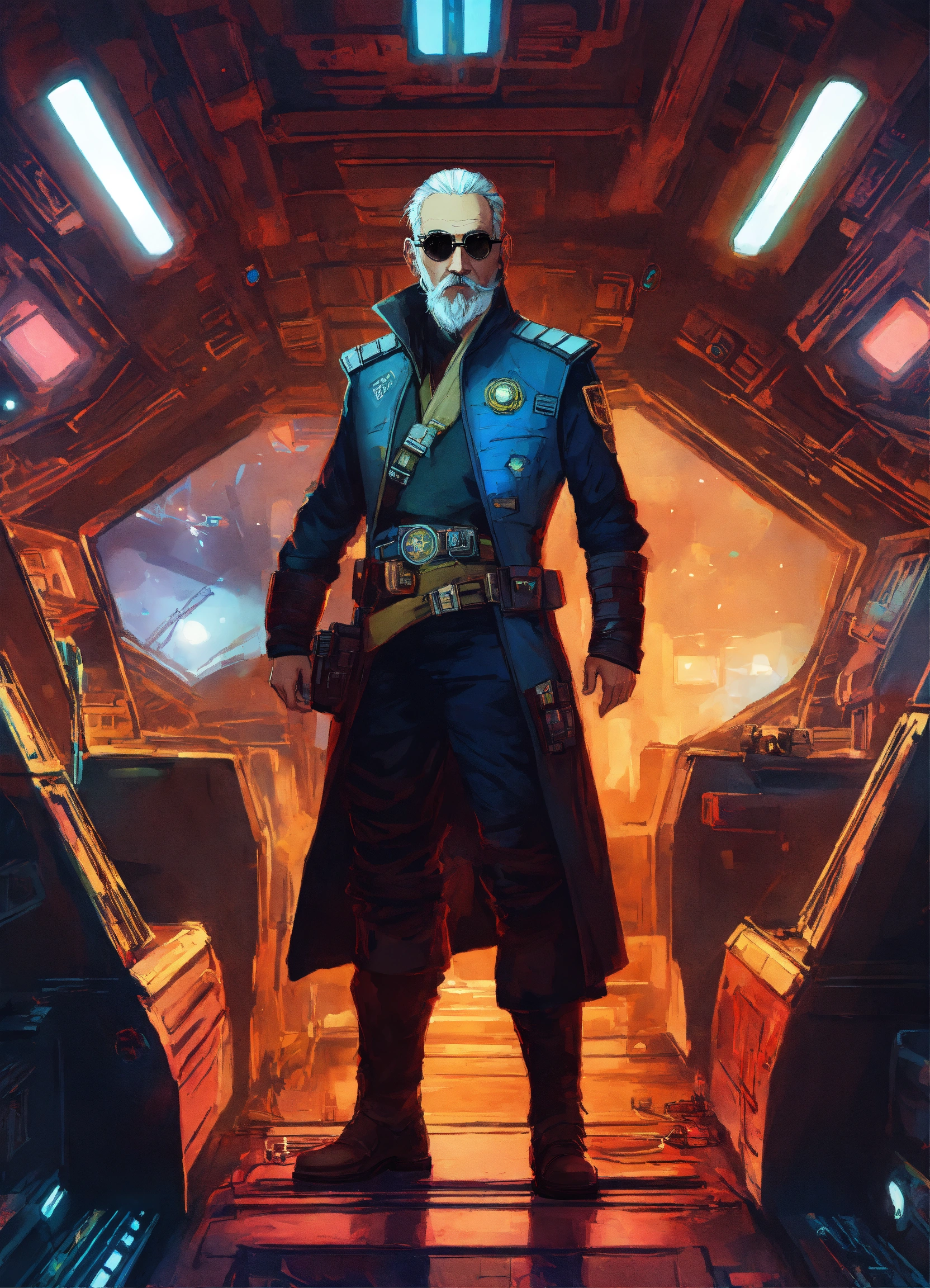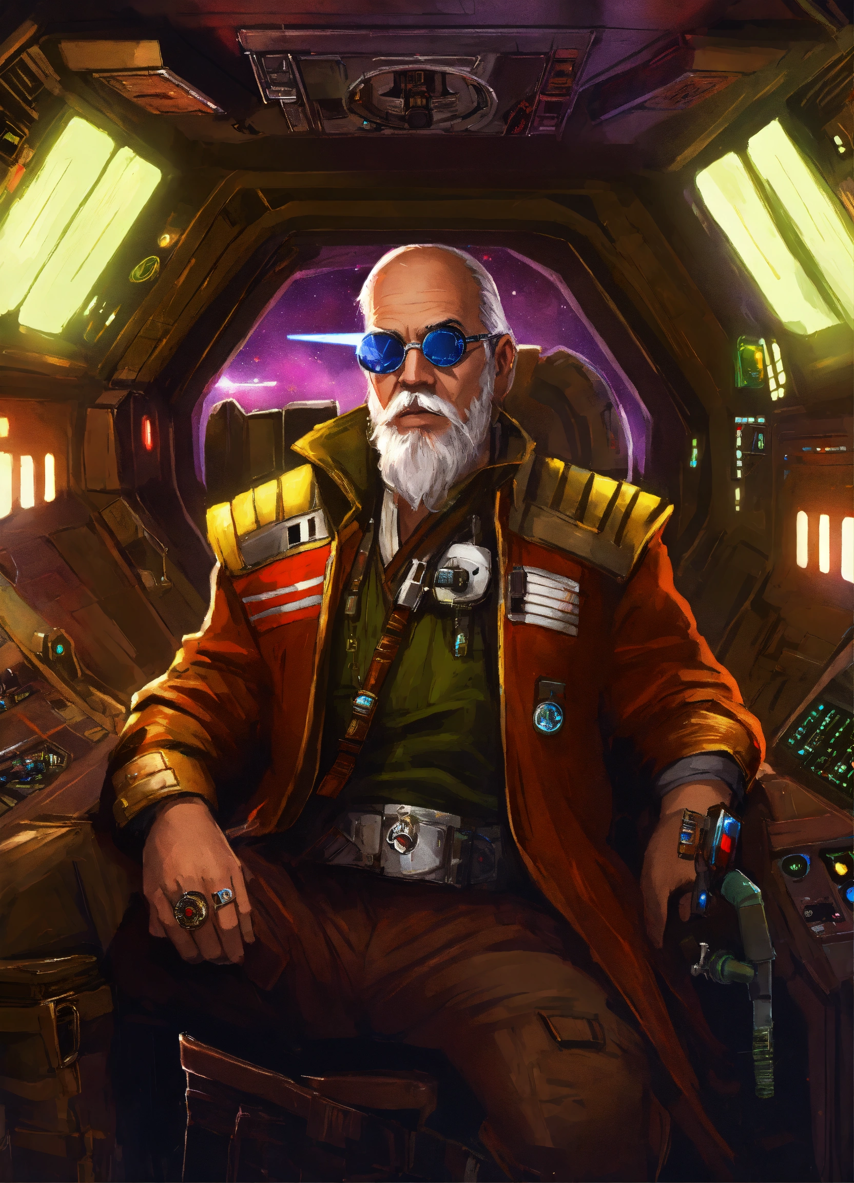 Digital art of an old cyberpunk pirate captain in a star wars spaceship