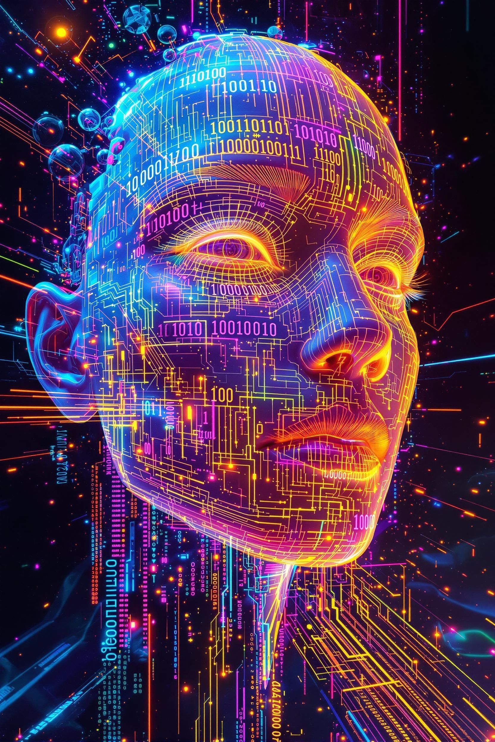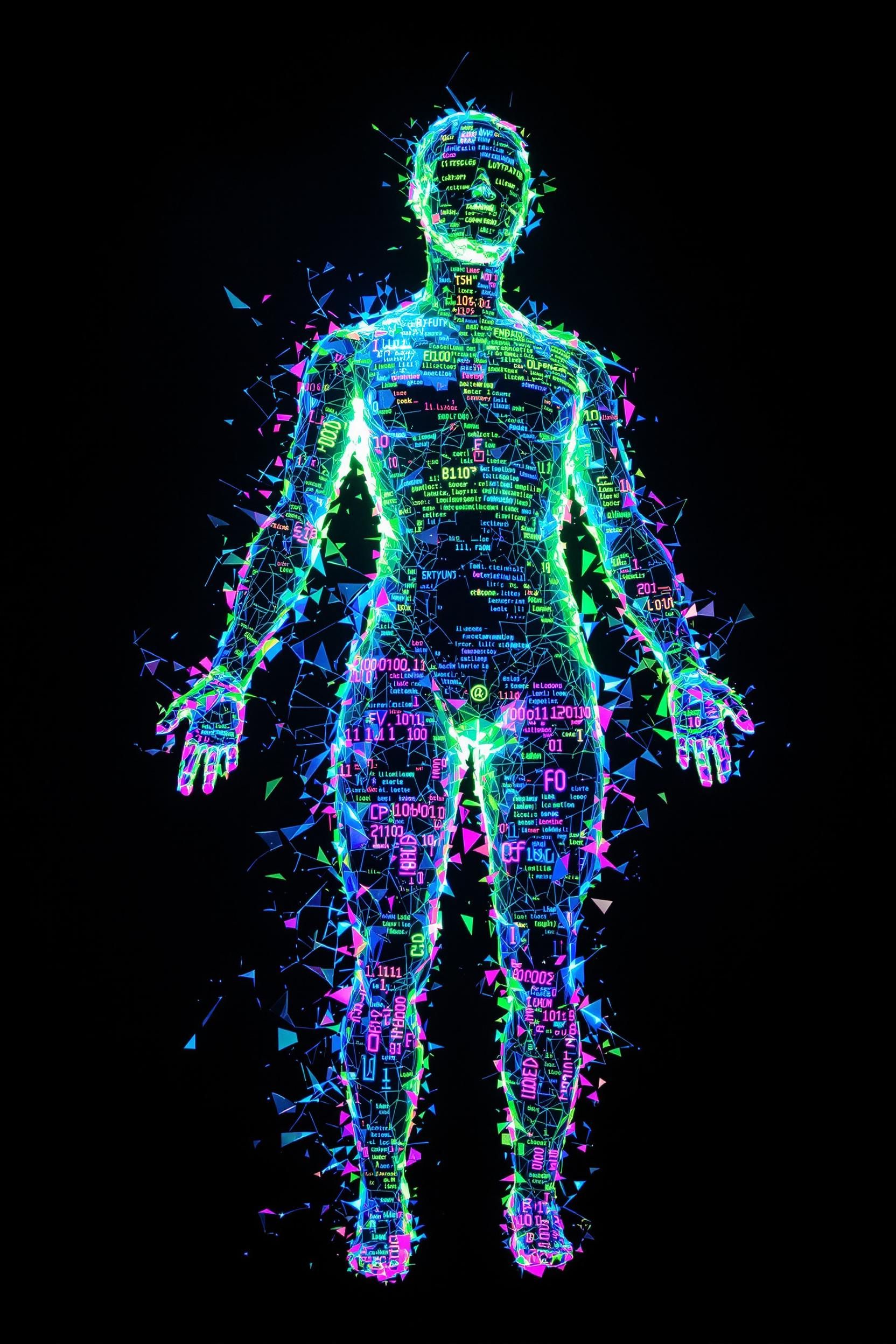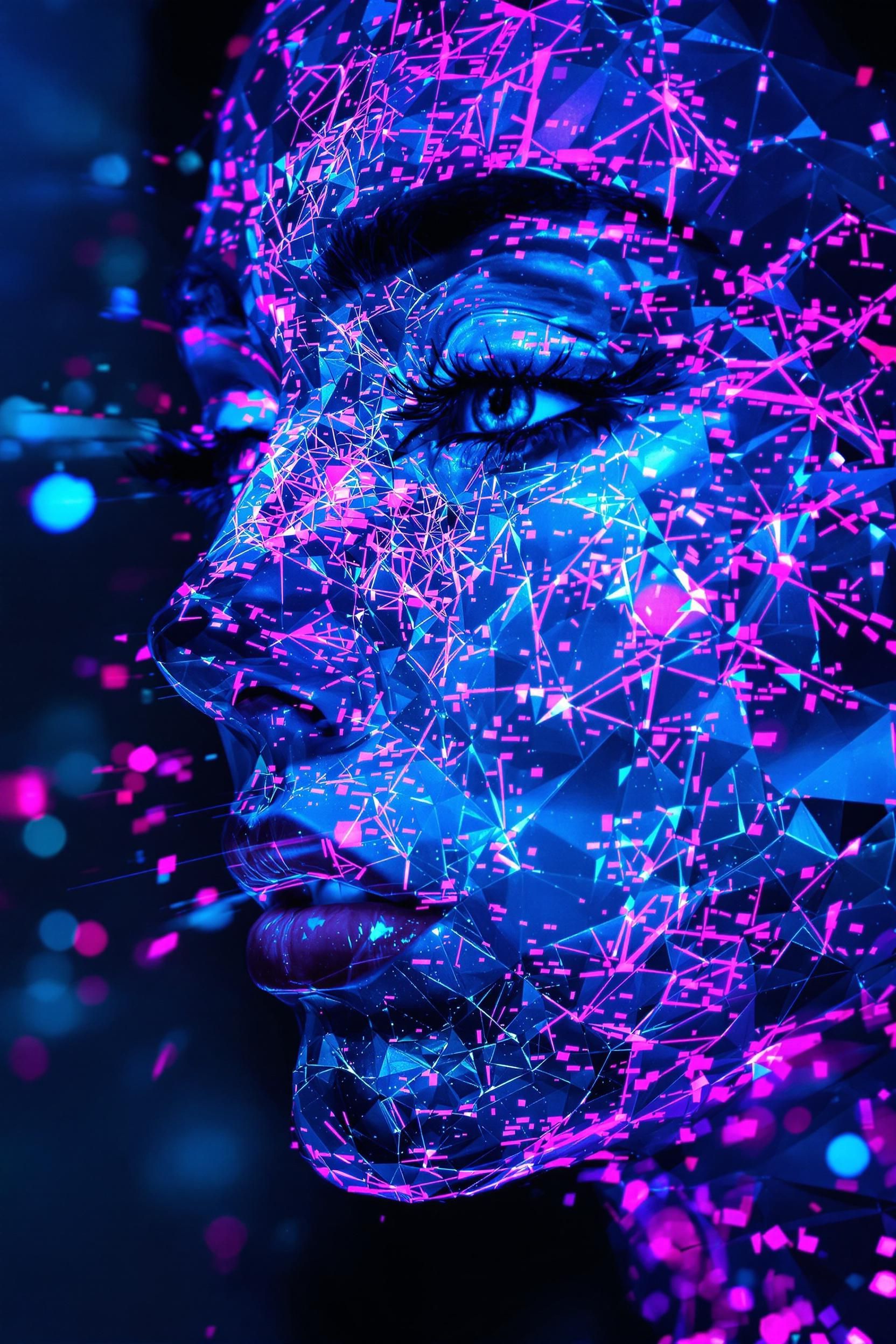 Ethereal glitchcore avatar, ghostly neon lights, transparent digital face, colorful broken static, futuristic spectral energy, vibrant holographic mist