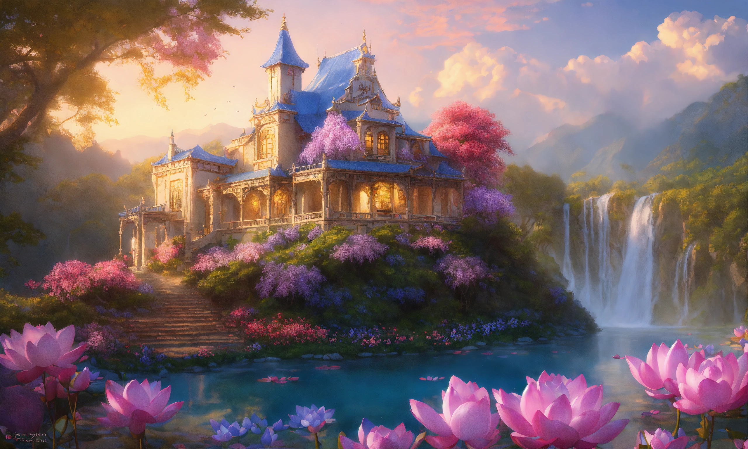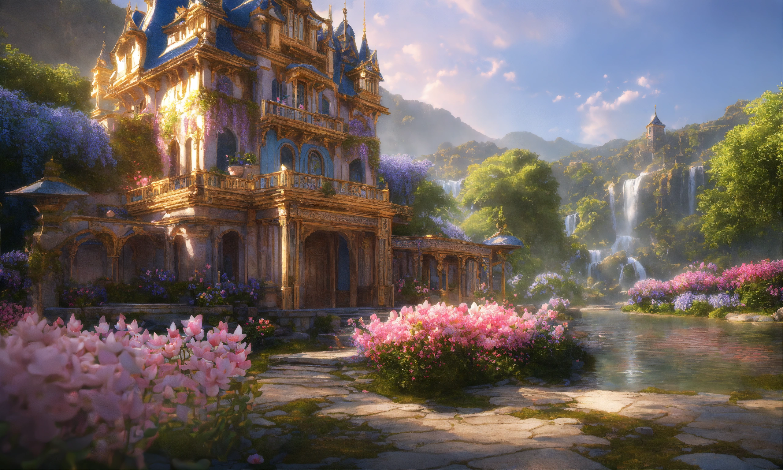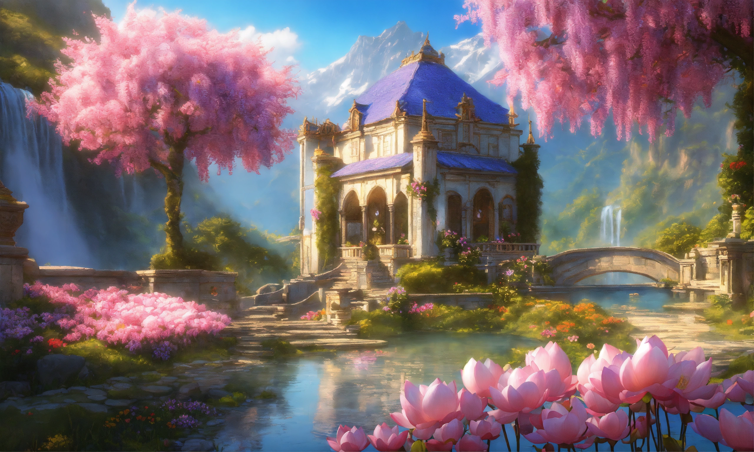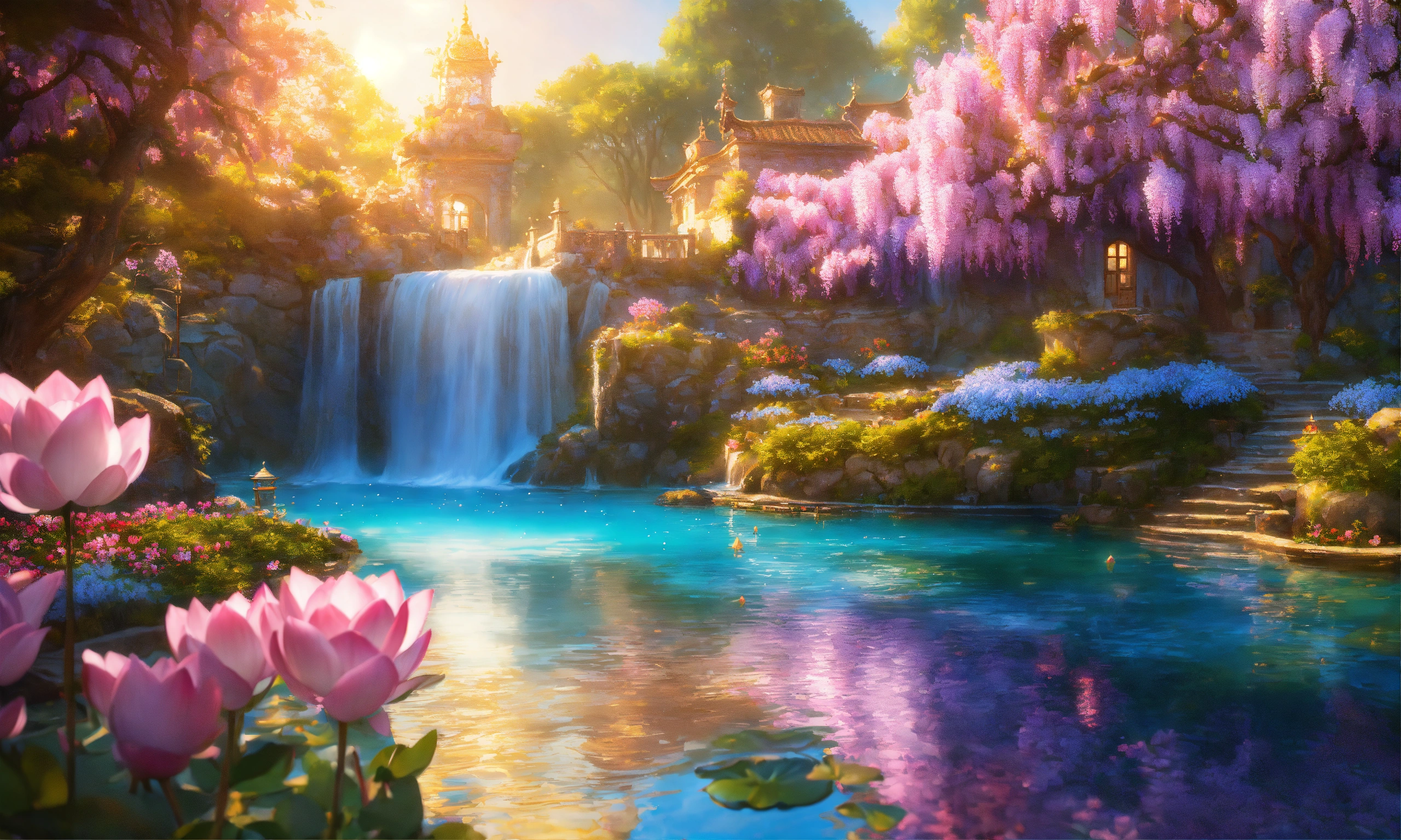 White castle fantasy flowers, eastern ogives gold flowered rose and gold, blue, parma, waterfal, very fine chiseled with basins covered with beautiful pink lotus and paths colored with bright reflections, create a heavenly world with pastel landscapes covered with flowers and trees covered with realistic pink wisteria, photorealists colorful vintage pastel, sunlight by candlelight natural light, oriental, ogive, flowery, wisteria, complex sharp image fine octane details unreal engine ultra realistic 16k cinema